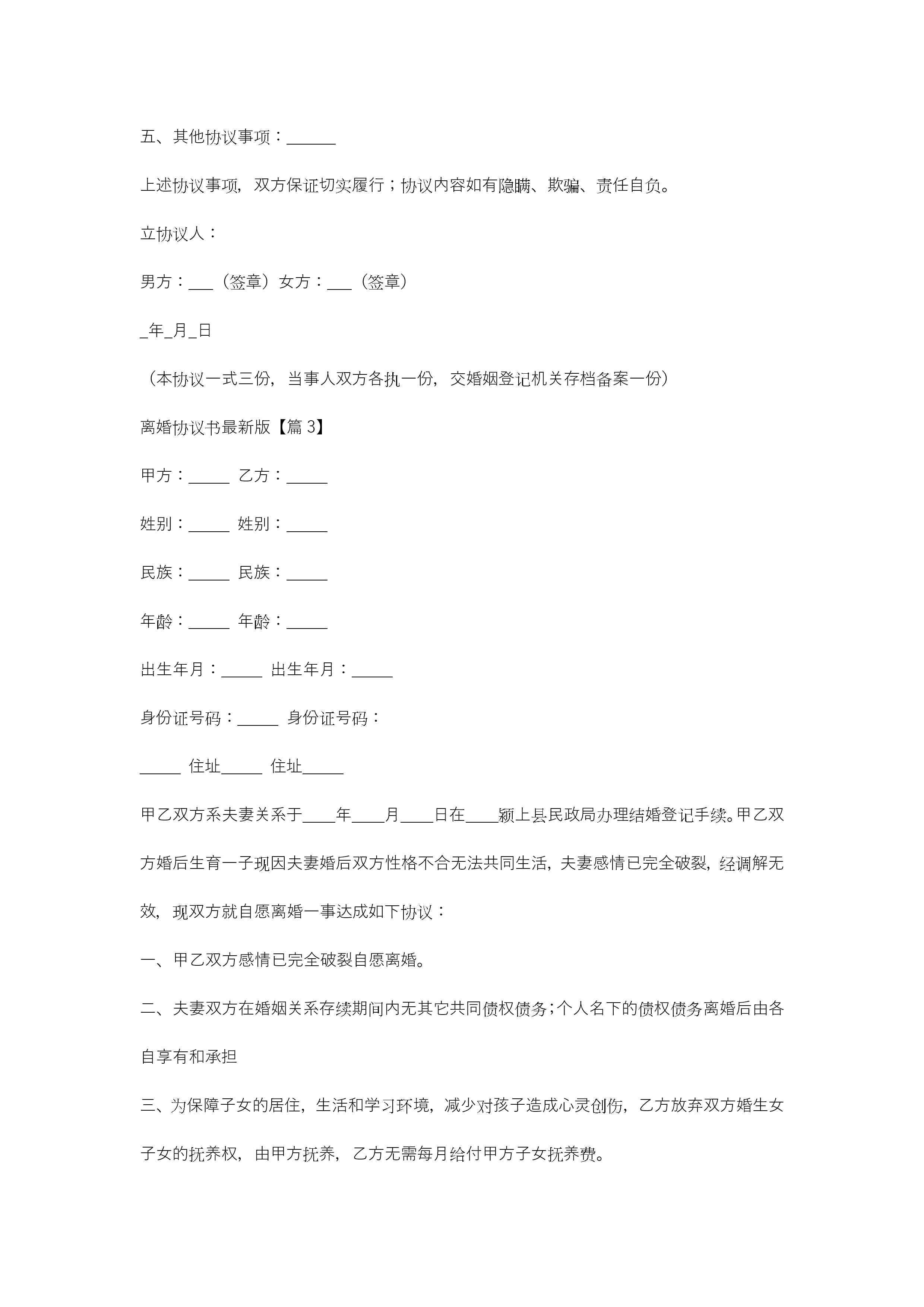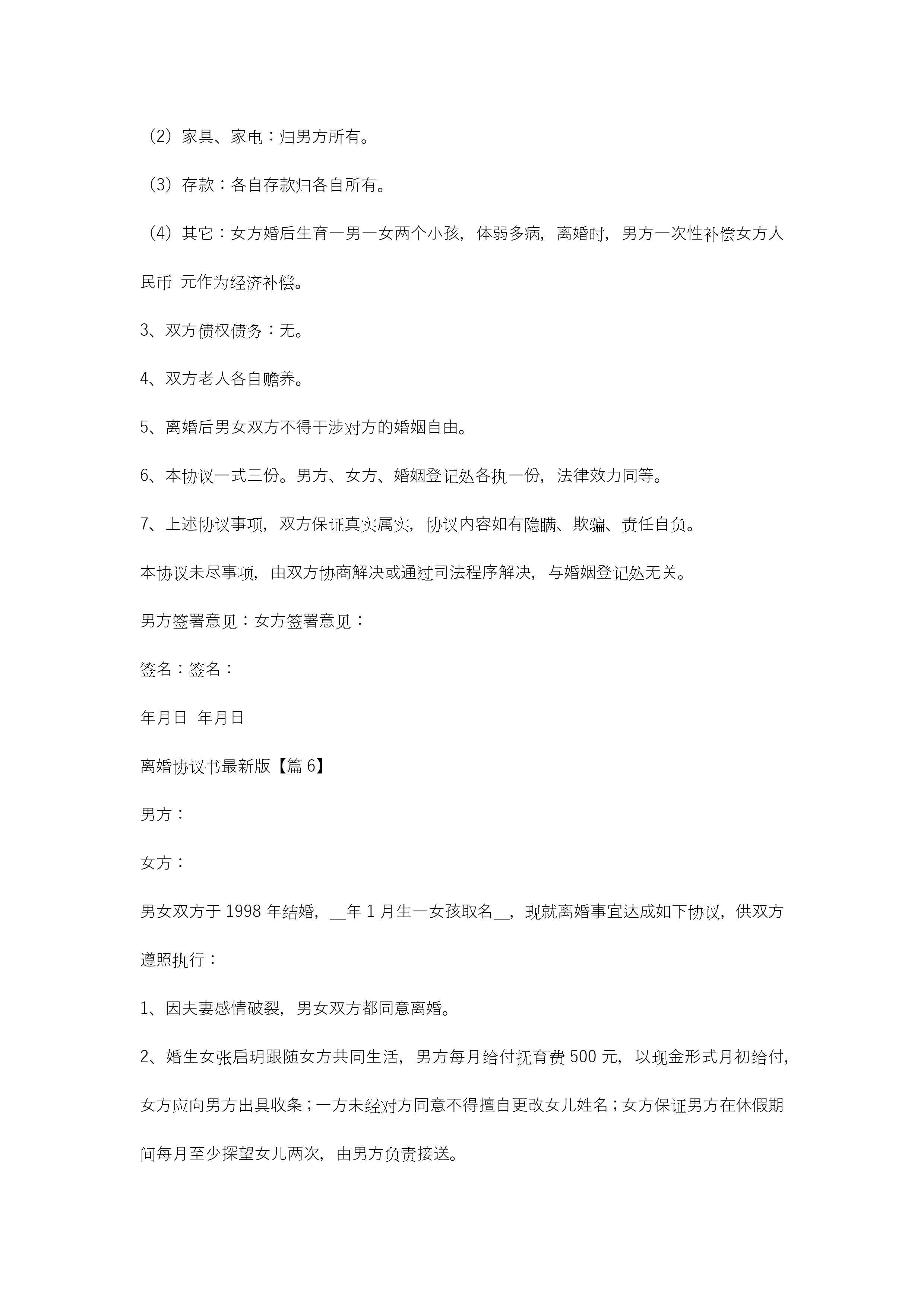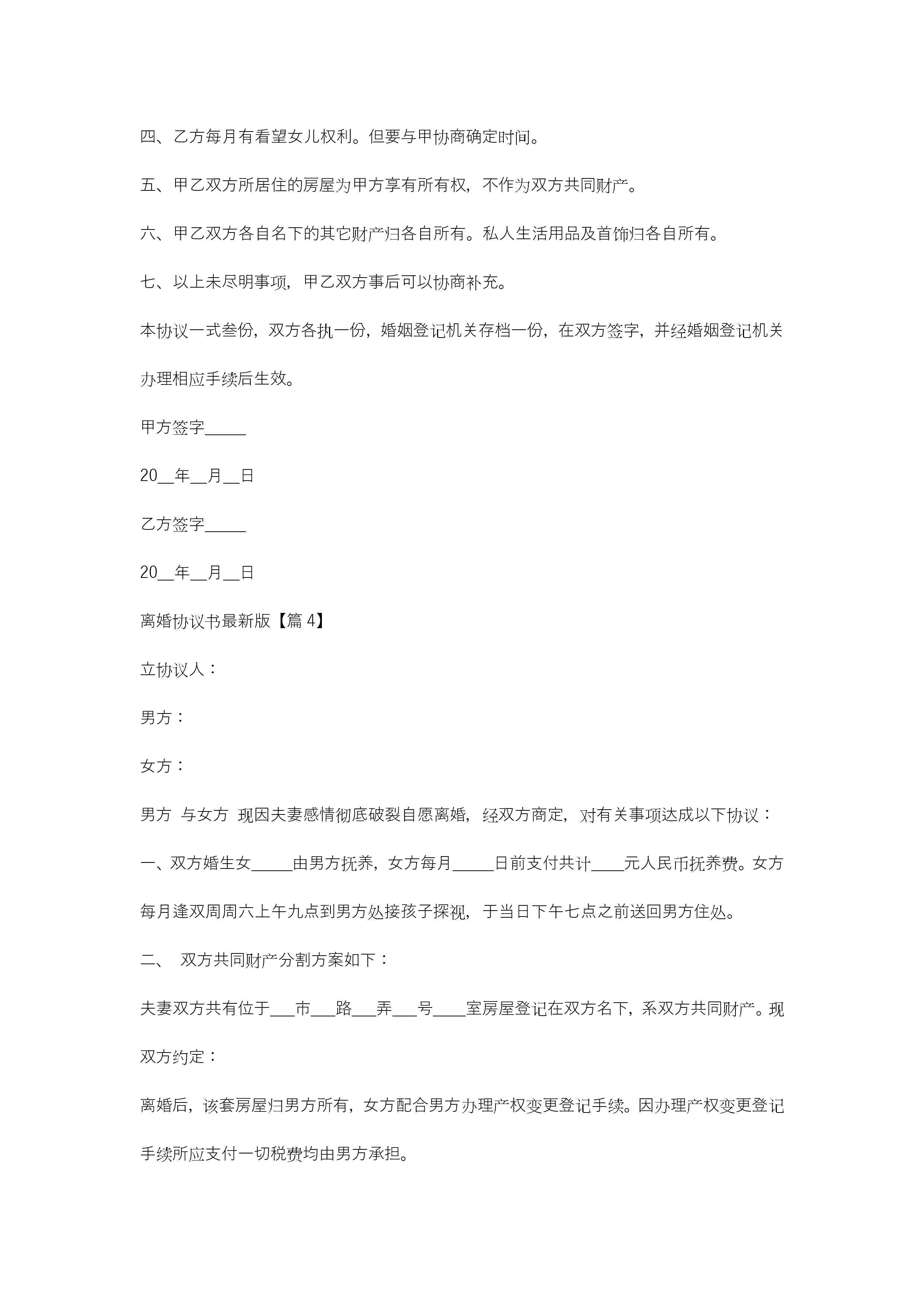 离婚协议书最新版(12篇)jugei3月21日 19:46更新关注266 离婚协议书最新版(12篇)此内容为付费资源,请付费后查看¥10.9 单篇文档限时特惠¥15个人会员开通企业会员开通立即下载无需登陆!可直接快捷下载单个模板付费资源© 版权声明THE ENDWord模板# 实用文档# 实用模板# 合同模板# 合同范本 如有问题,可点击最底部“联系我们”联系客服 分享QQ空间微博QQ好友海报分享复制链接收藏