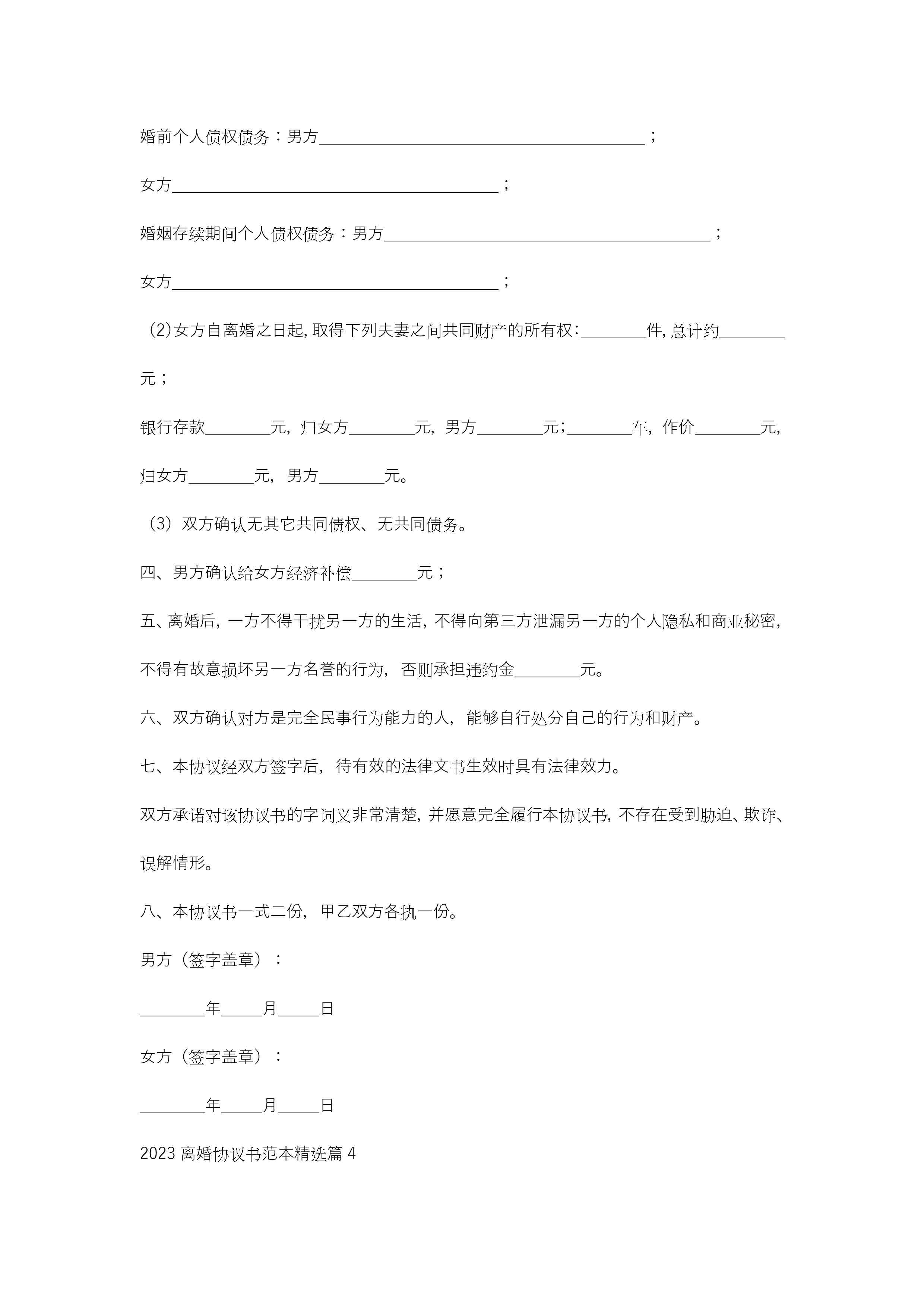 2023离婚协议书范本(11篇)jugei3月21日 19:46更新关注324 2023离婚协议书范本(11篇)此内容为付费资源,请付费后查看¥10.9 单篇文档限时特惠¥15个人会员开通企业会员开通立即下载无需登陆!可直接快捷下载单个模板付费资源© 版权声明THE ENDWord模板# 实用文档# 实用模板# 合同模板# 合同范本 如有问题,可点击最底部“联系我们”联系客服 分享QQ空间微博QQ好友海报分享复制链接收藏