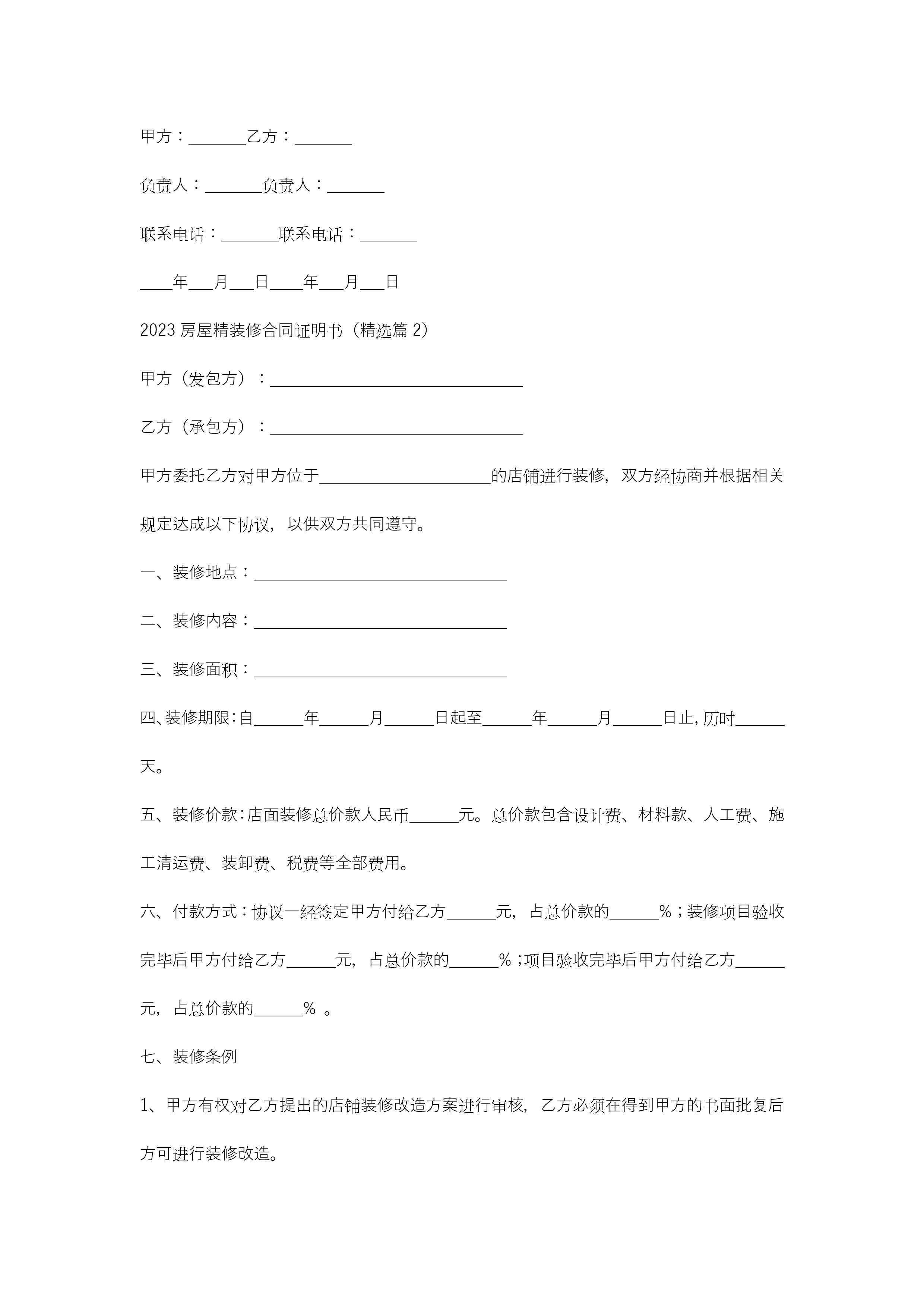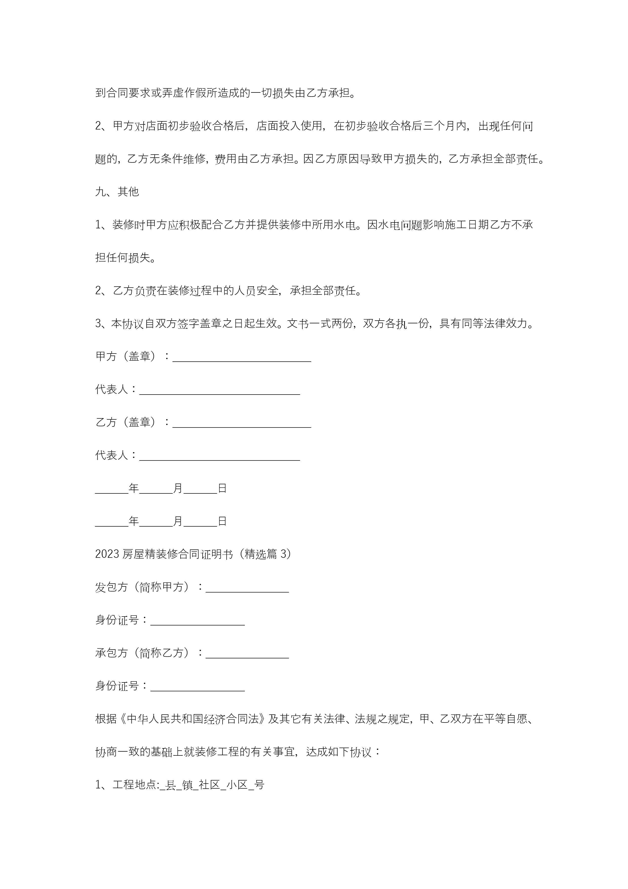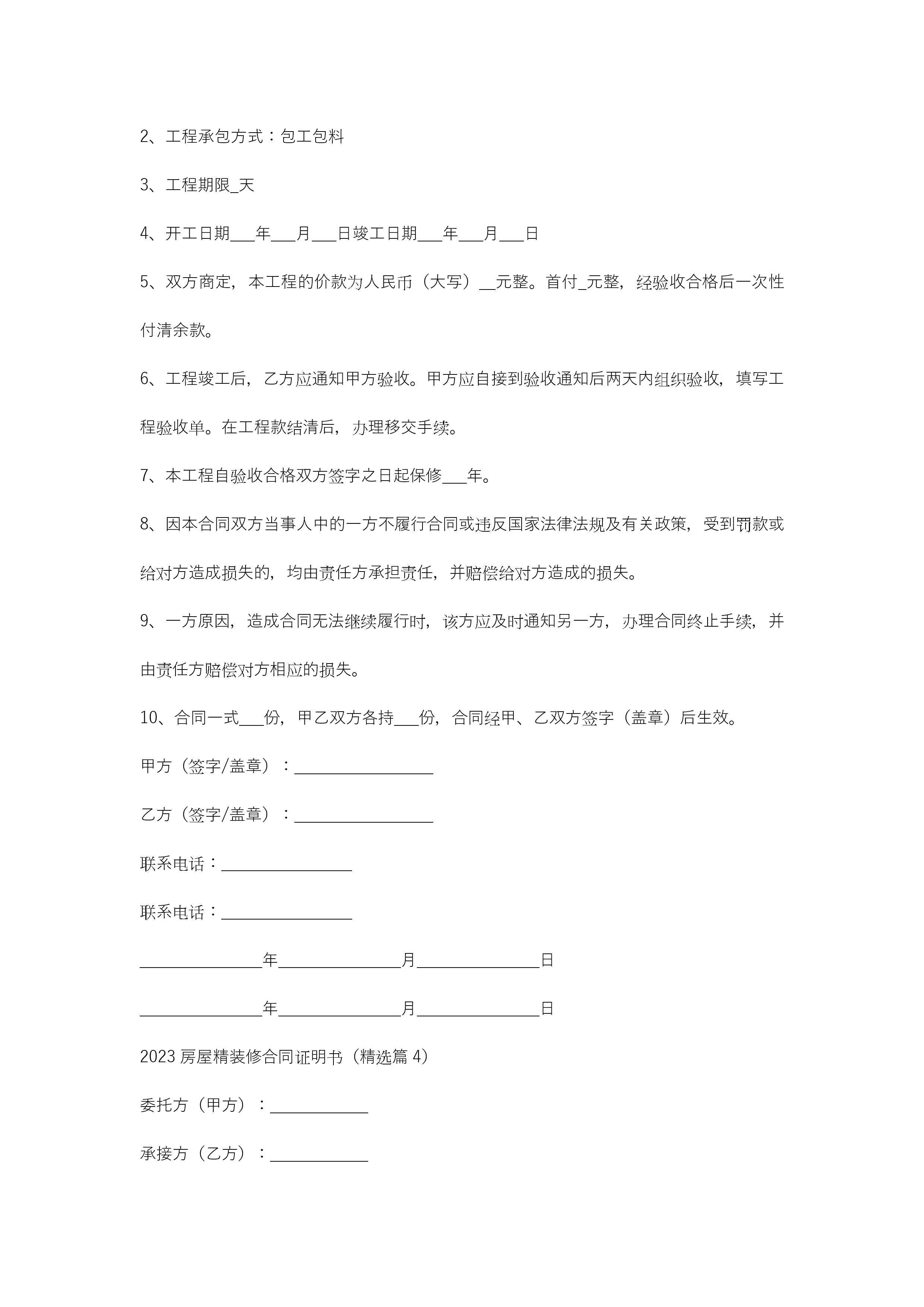 2023房屋精装修合同证明书(精选7篇)jugei3月21日 19:47更新关注292 2023房屋精装修合同证明书(精选7篇)此内容为付费资源,请付费后查看¥10.9 单篇文档限时特惠¥15个人会员开通企业会员开通立即下载无需登陆!可直接快捷下载单个模板付费资源© 版权声明THE ENDWord模板# 实用文档# 实用模板# 合同模板# 合同范本 如有问题,可点击最底部“联系我们”联系客服 分享QQ空间微博QQ好友海报分享复制链接收藏