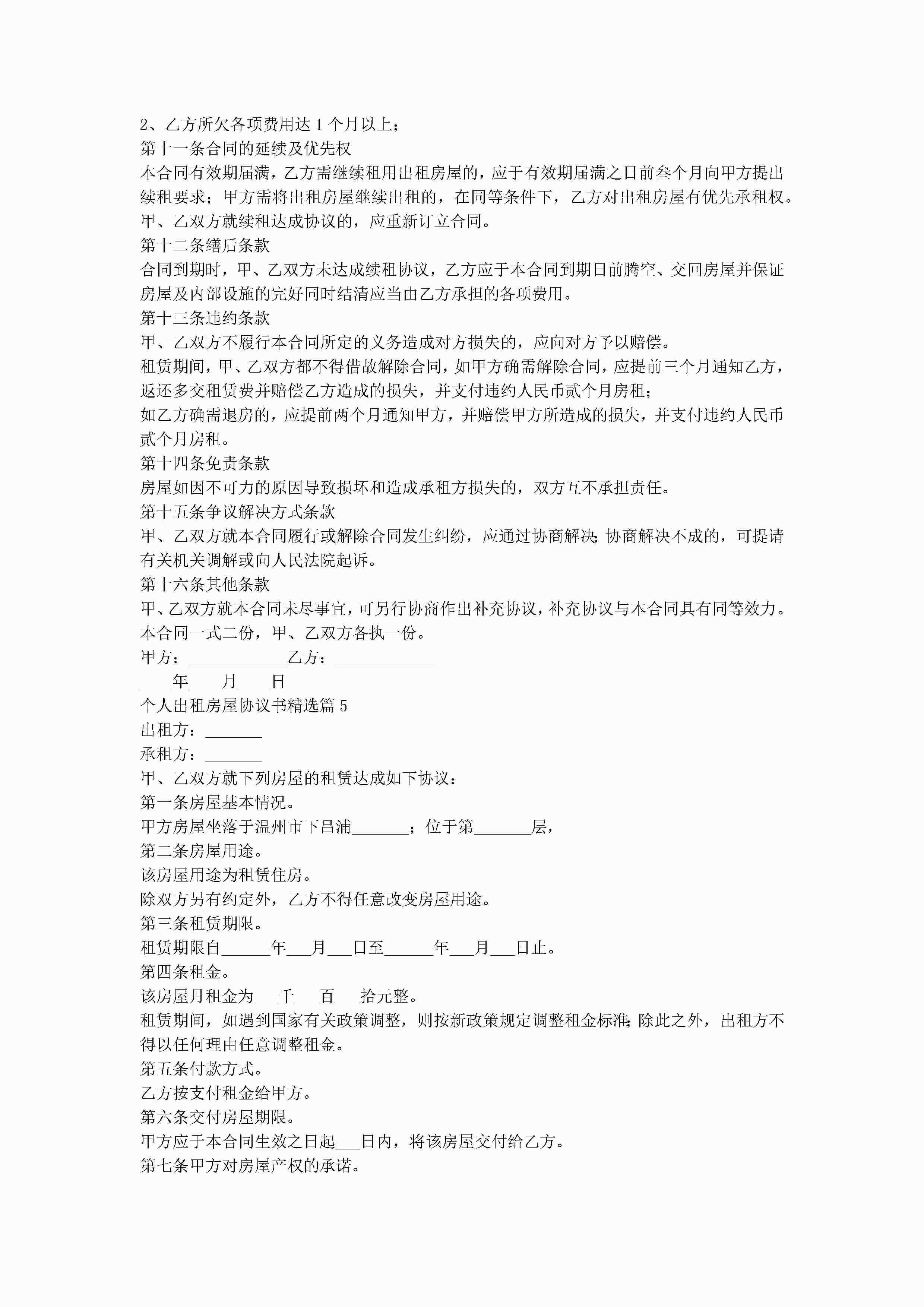 个人出租房屋协议书(10篇)jugei3月22日 00:34更新关注261 个人出租房屋协议书(10篇)此内容为付费资源,请付费后查看¥10.9 单篇文档限时特惠¥15个人会员开通企业会员开通立即下载无需登陆!可直接快捷下载单个模板付费资源© 版权声明THE ENDWord模板# 实用文档# 实用模板# 合同模板# 合同范本 如有问题,可点击最底部“联系我们”联系客服 分享QQ空间微博QQ好友海报分享复制链接收藏