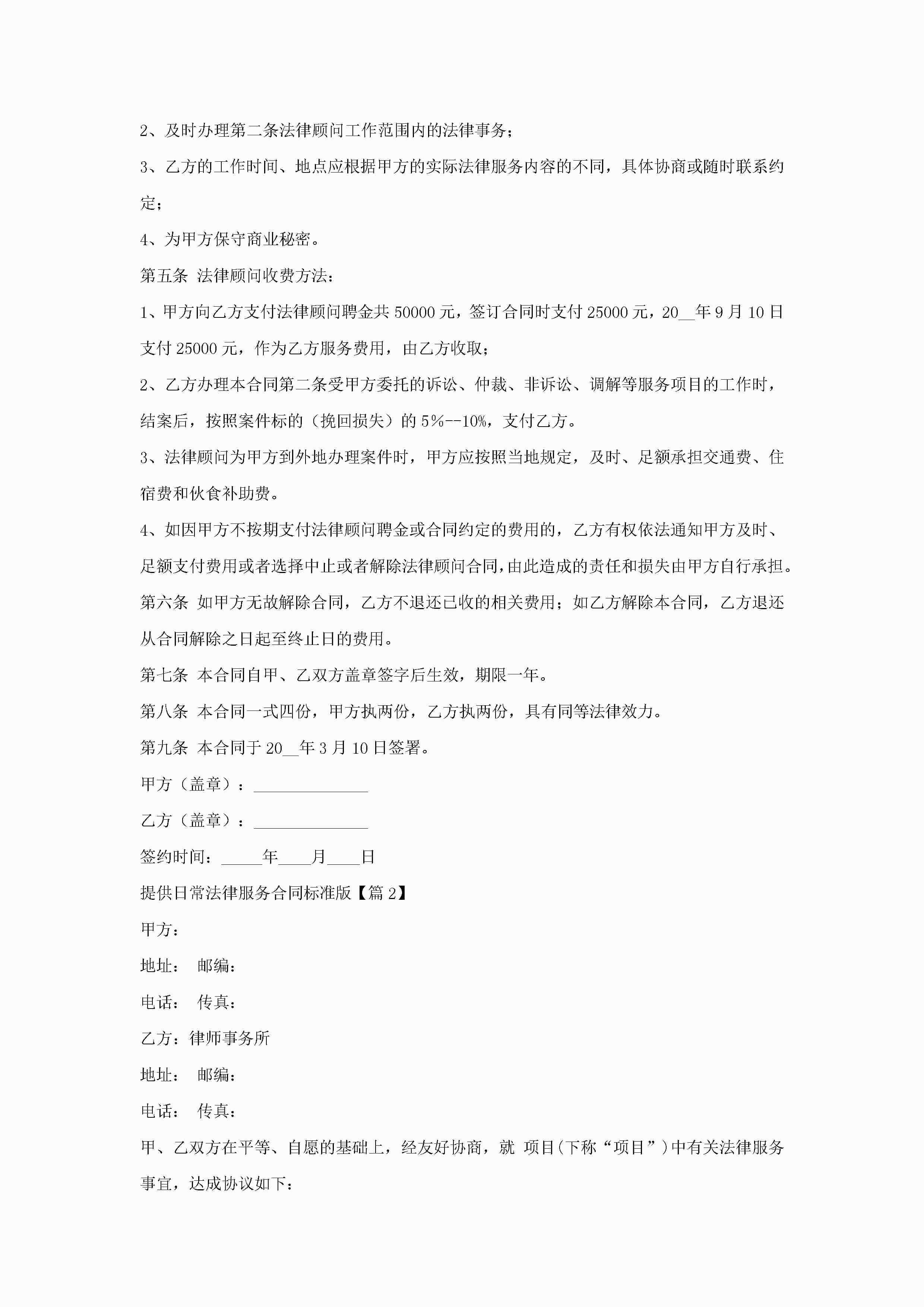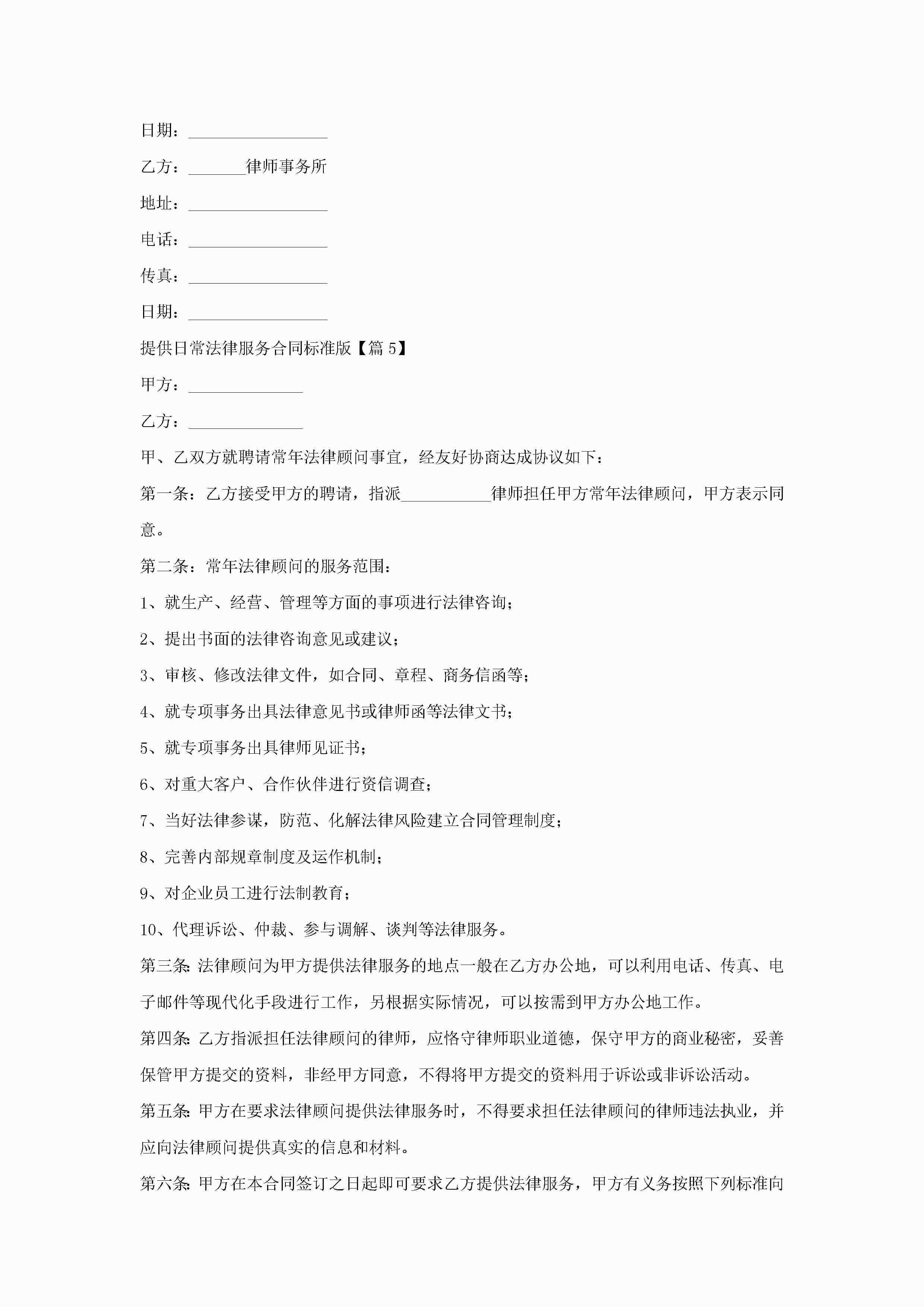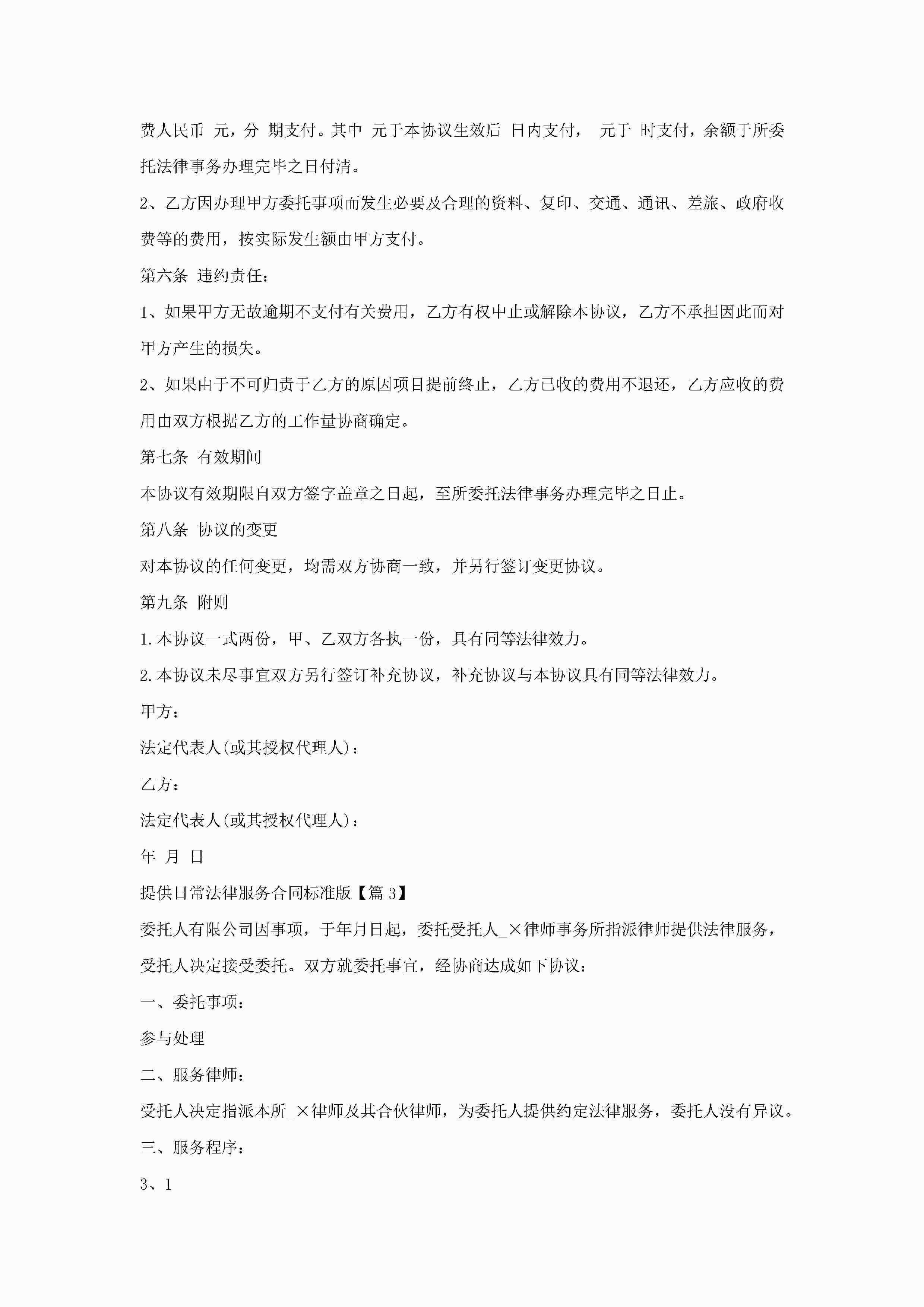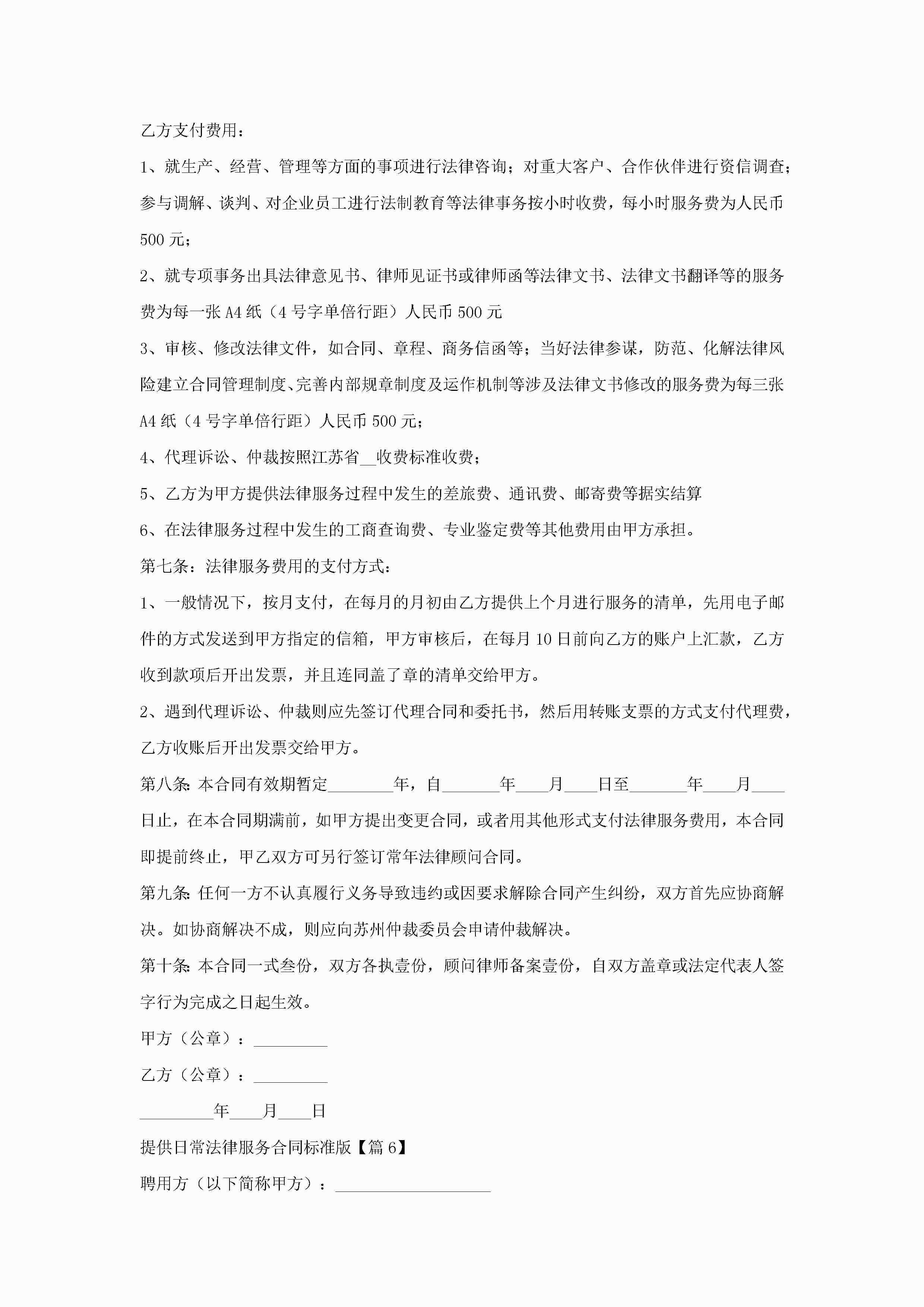 提供日常法律服务合同标准版(精选7篇)jugei3月22日 00:54更新关注258 提供日常法律服务合同标准版(精选7篇)此内容为付费资源,请付费后查看¥10.9 单篇文档限时特惠¥15个人会员开通企业会员开通立即下载无需登陆!可直接快捷下载单个模板付费资源© 版权声明THE ENDWord模板# 实用文档# 实用模板# 合同模板# 合同范本 如有问题,可点击最底部“联系我们”联系客服 分享QQ空间微博QQ好友海报分享复制链接收藏