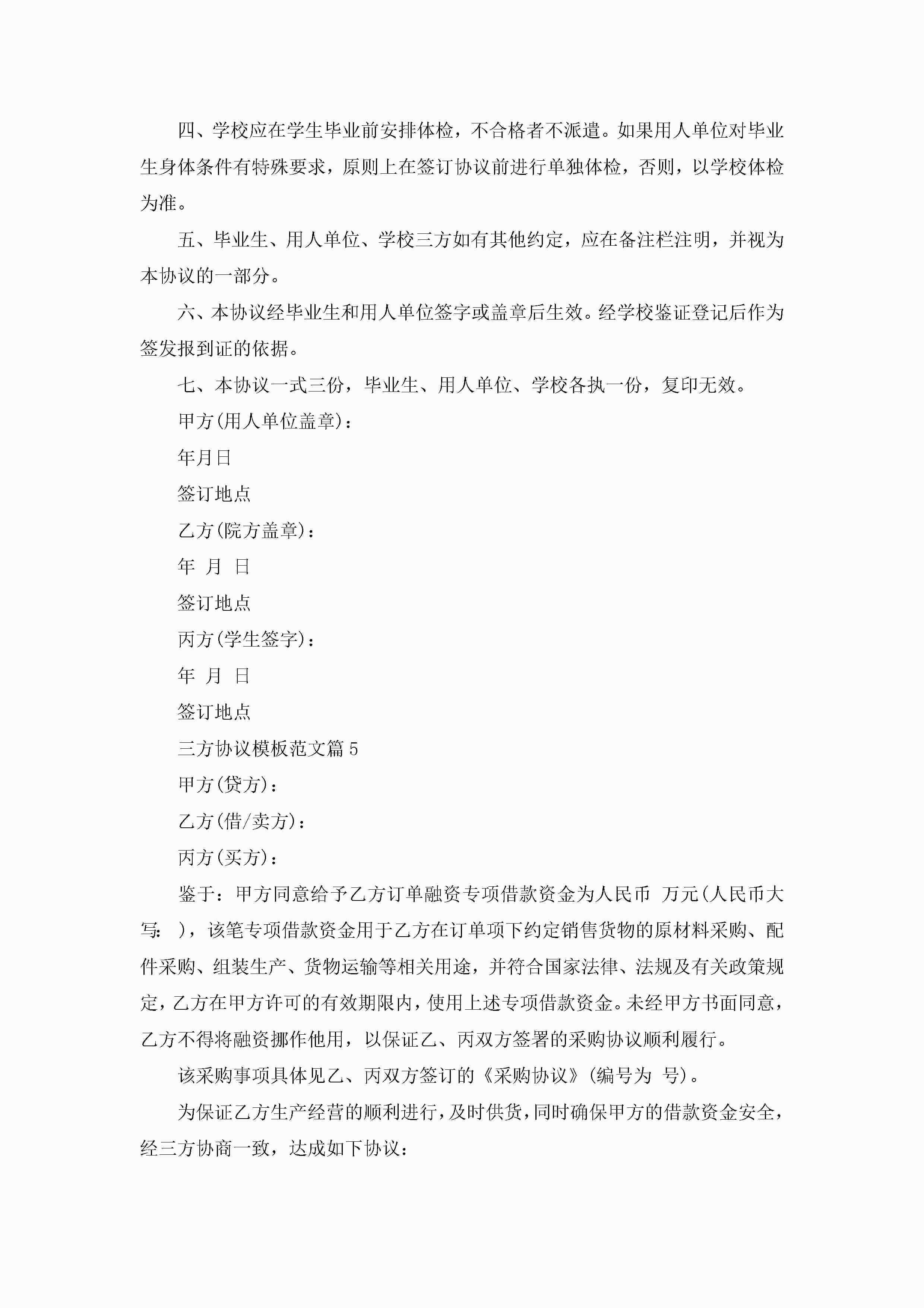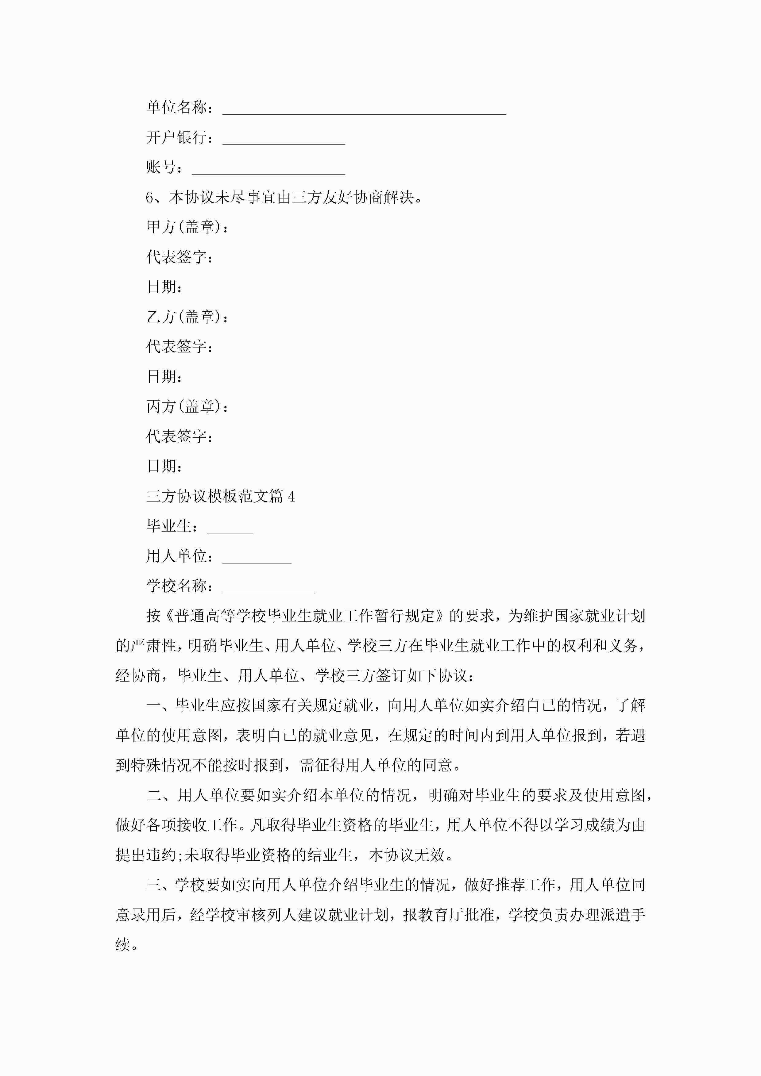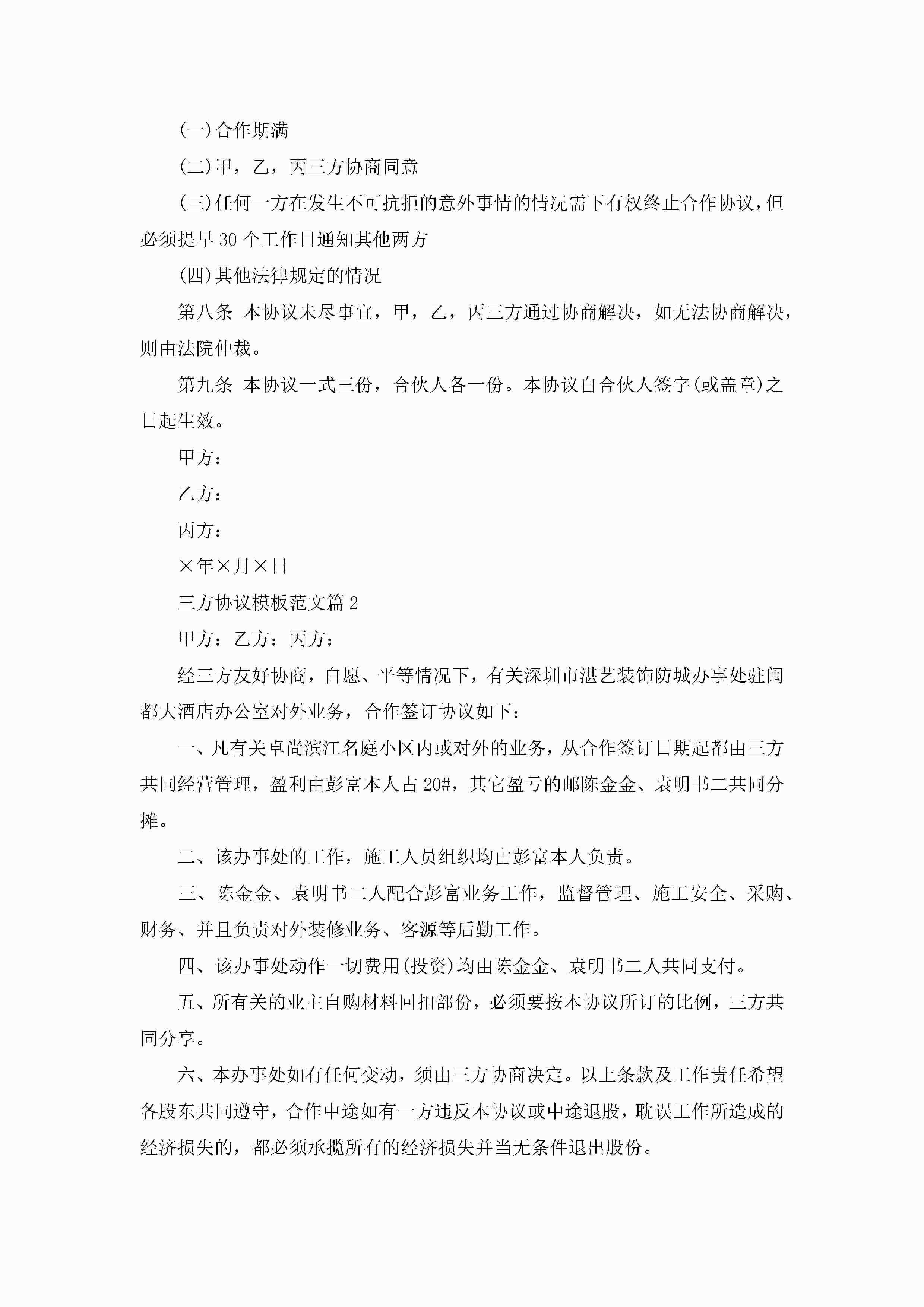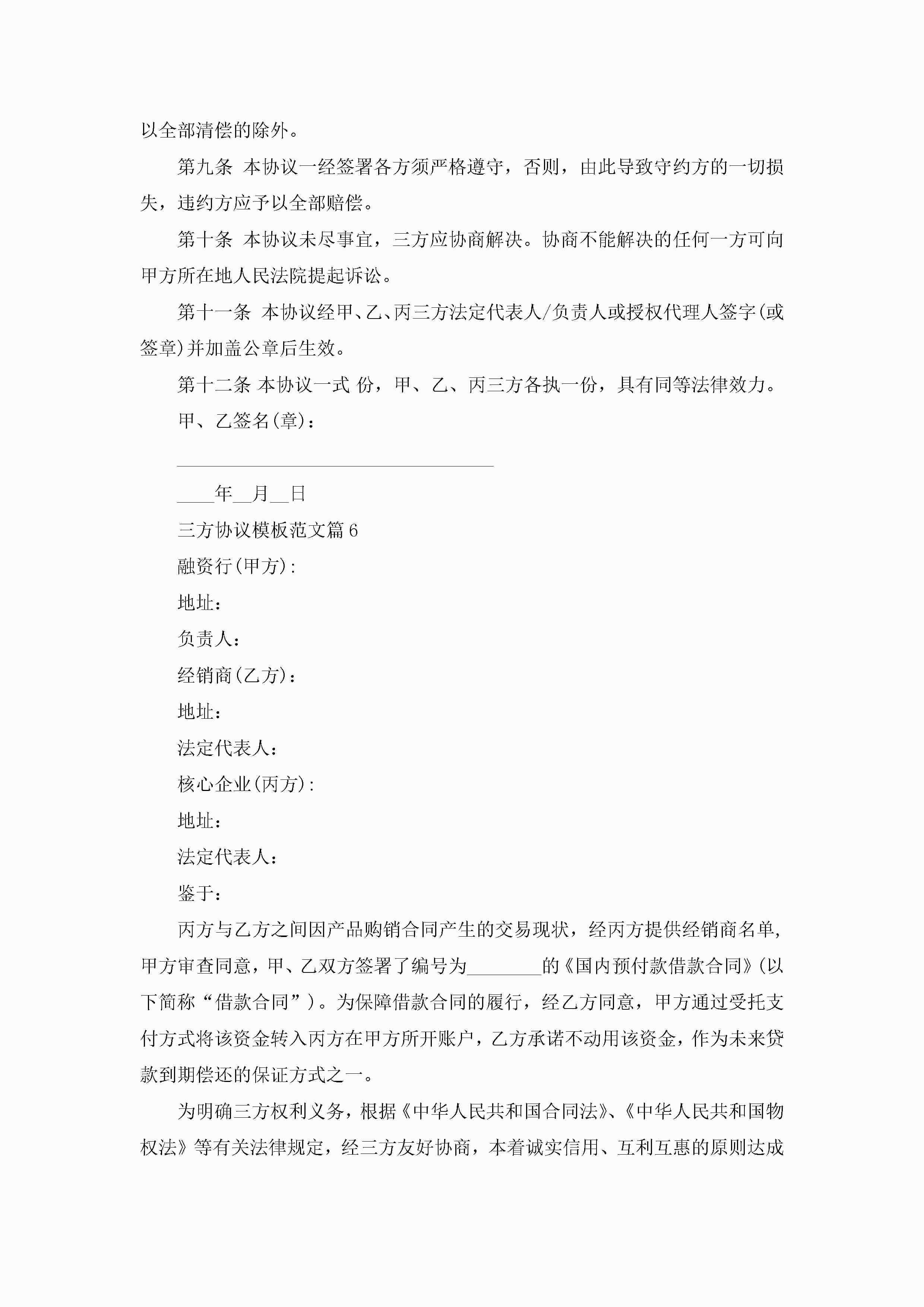 三方协议模板范文10篇精选jugei3月22日 12:38更新关注204 三方协议模板范文10篇精选此内容为付费资源,请付费后查看¥10.9 单篇文档限时特惠¥15个人会员开通企业会员开通立即下载无需登陆!可直接快捷下载单个模板付费资源© 版权声明THE ENDWord模板# 实用文档# 实用模板# 信函模板# 协议书 如有问题,可点击最底部“联系我们”联系客服 分享QQ空间微博QQ好友海报分享复制链接收藏