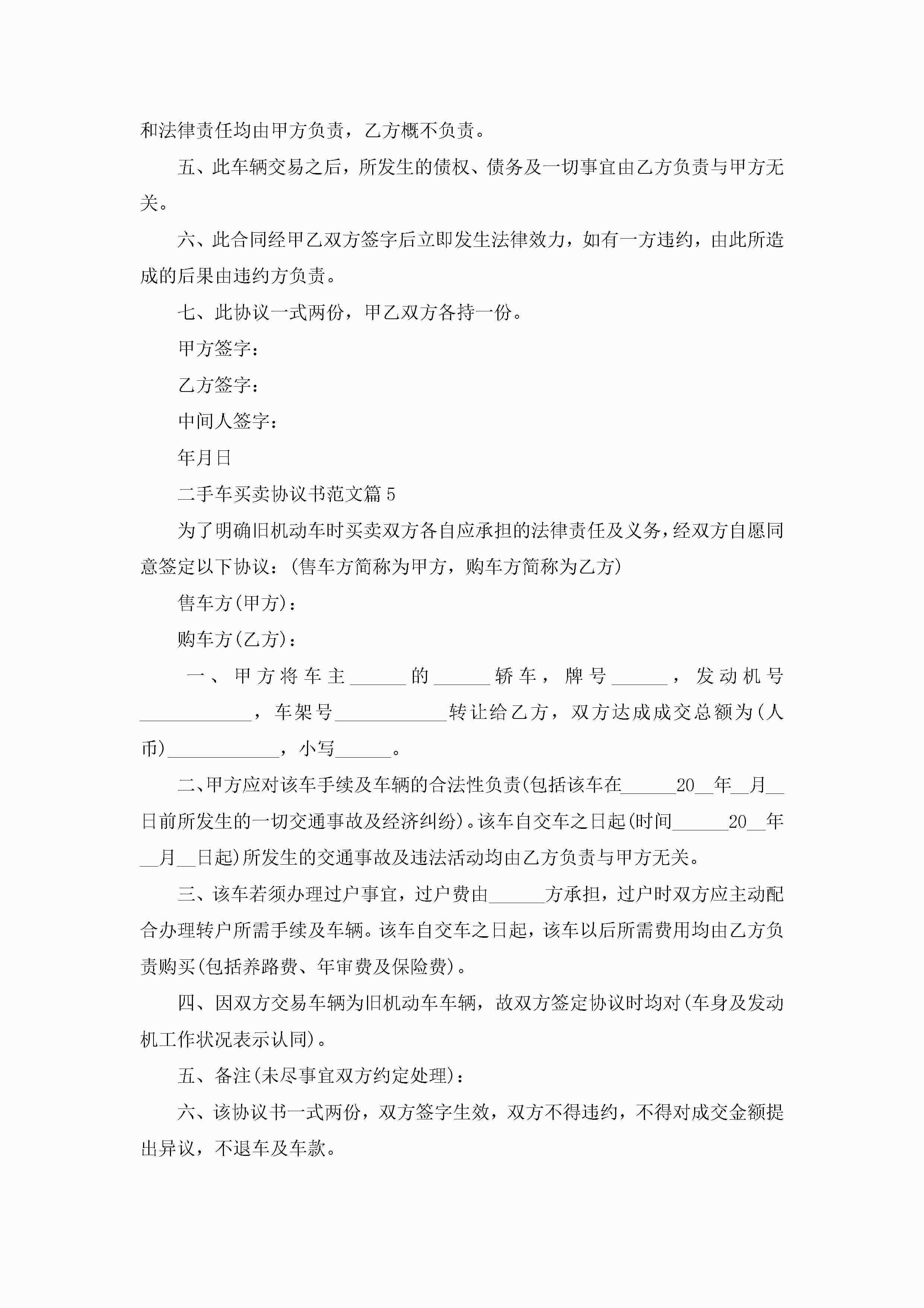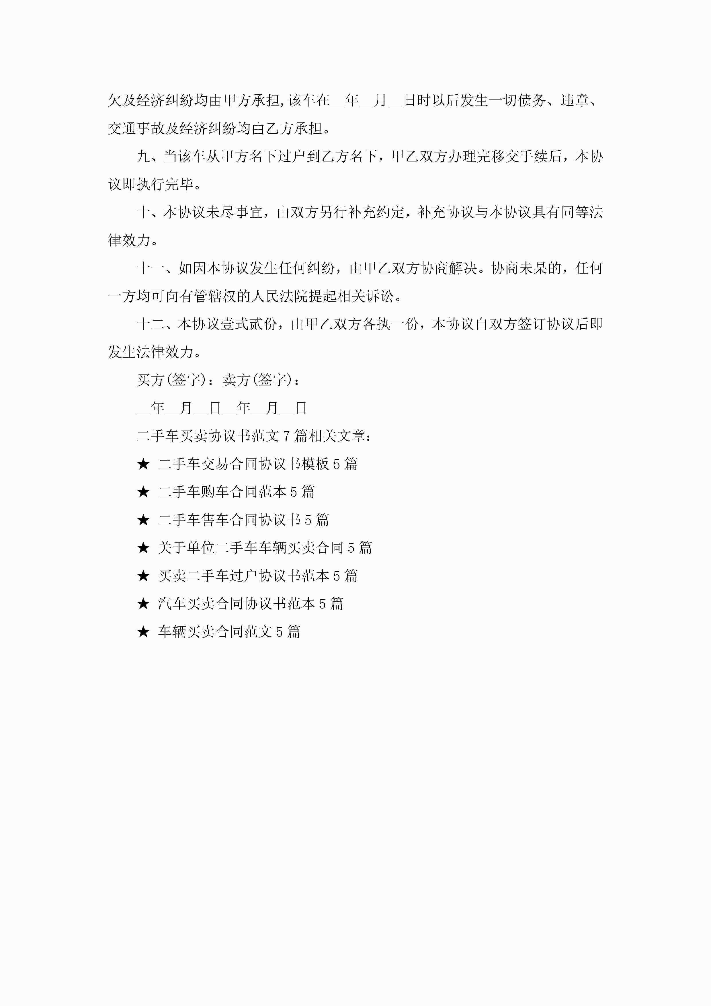二手车买卖协议书范文大全7篇jugei3月22日 12:38更新关注193 二手车买卖协议书范文大全7篇此内容为付费资源,请付费后查看¥10.9 单篇文档限时特惠¥15个人会员开通企业会员开通立即下载无需登陆!可直接快捷下载单个模板付费资源© 版权声明THE ENDWord模板# 实用文档# 信函模板# 协议书# 二手车买卖协议书范文7篇 如有问题,可点击最底部“联系我们”联系客服 分享QQ空间微博QQ好友海报分享复制链接收藏