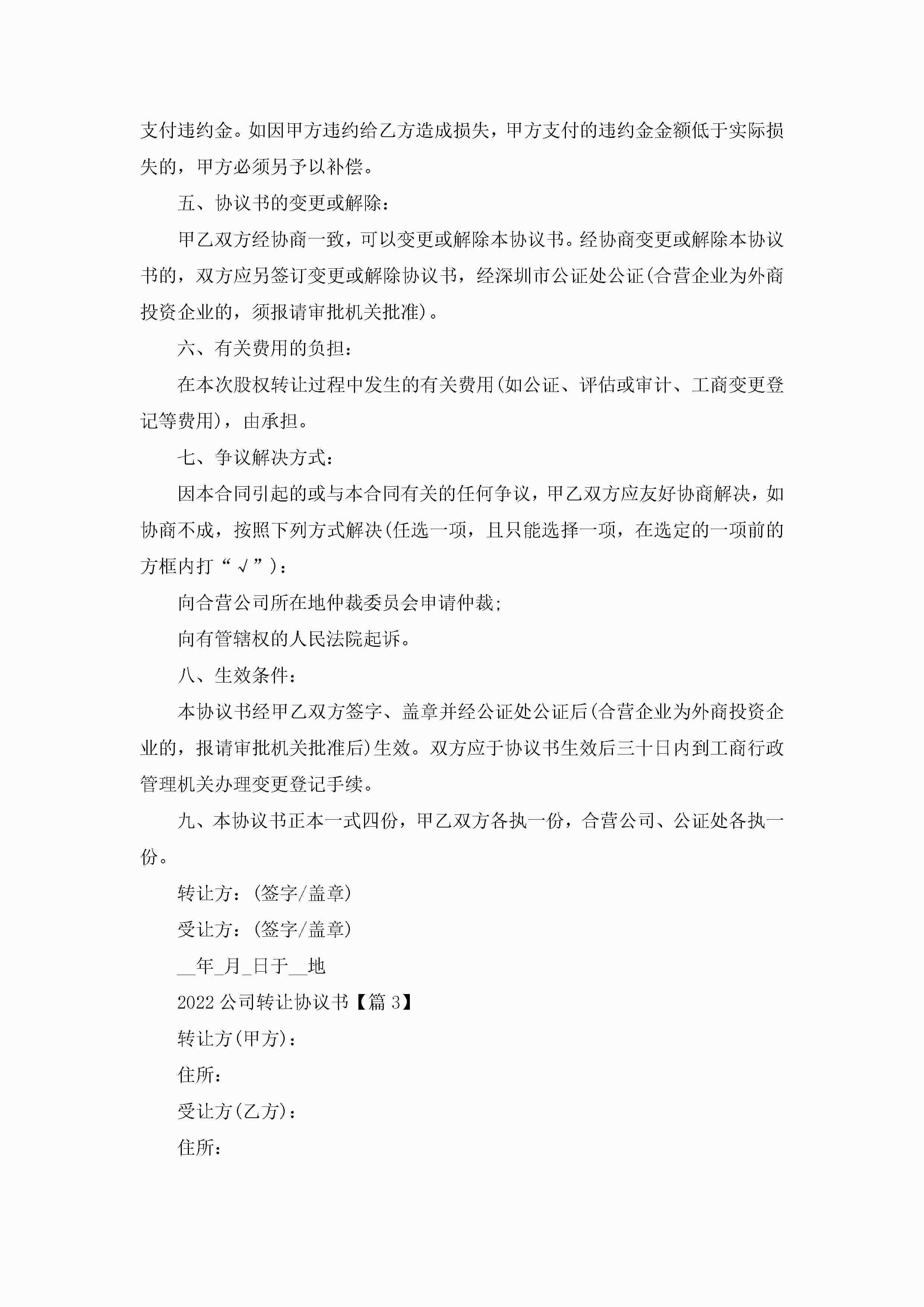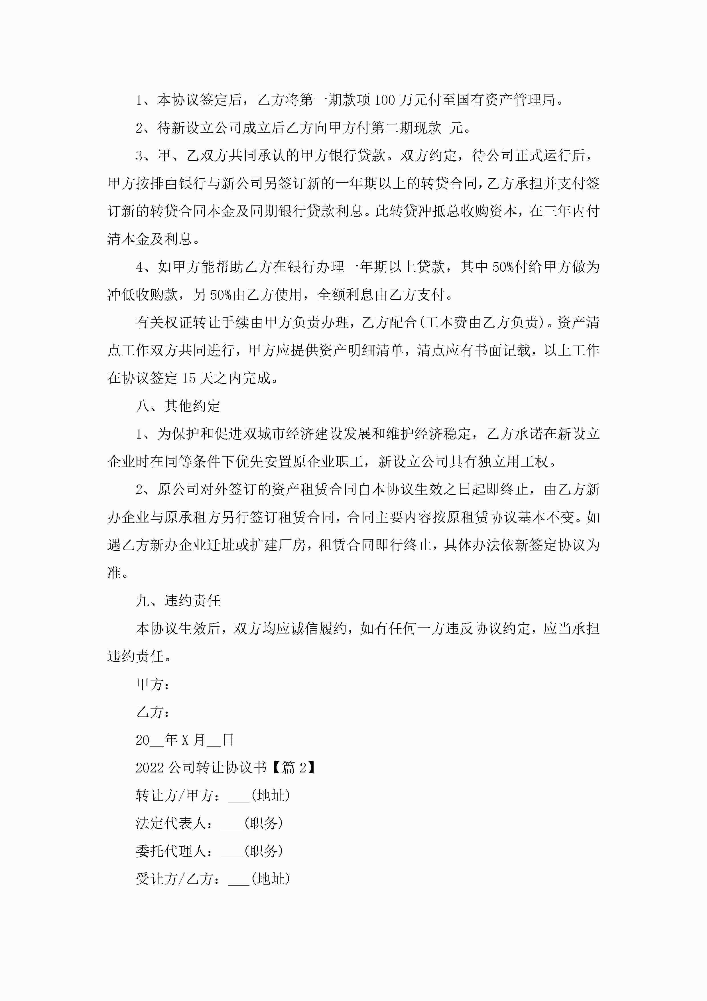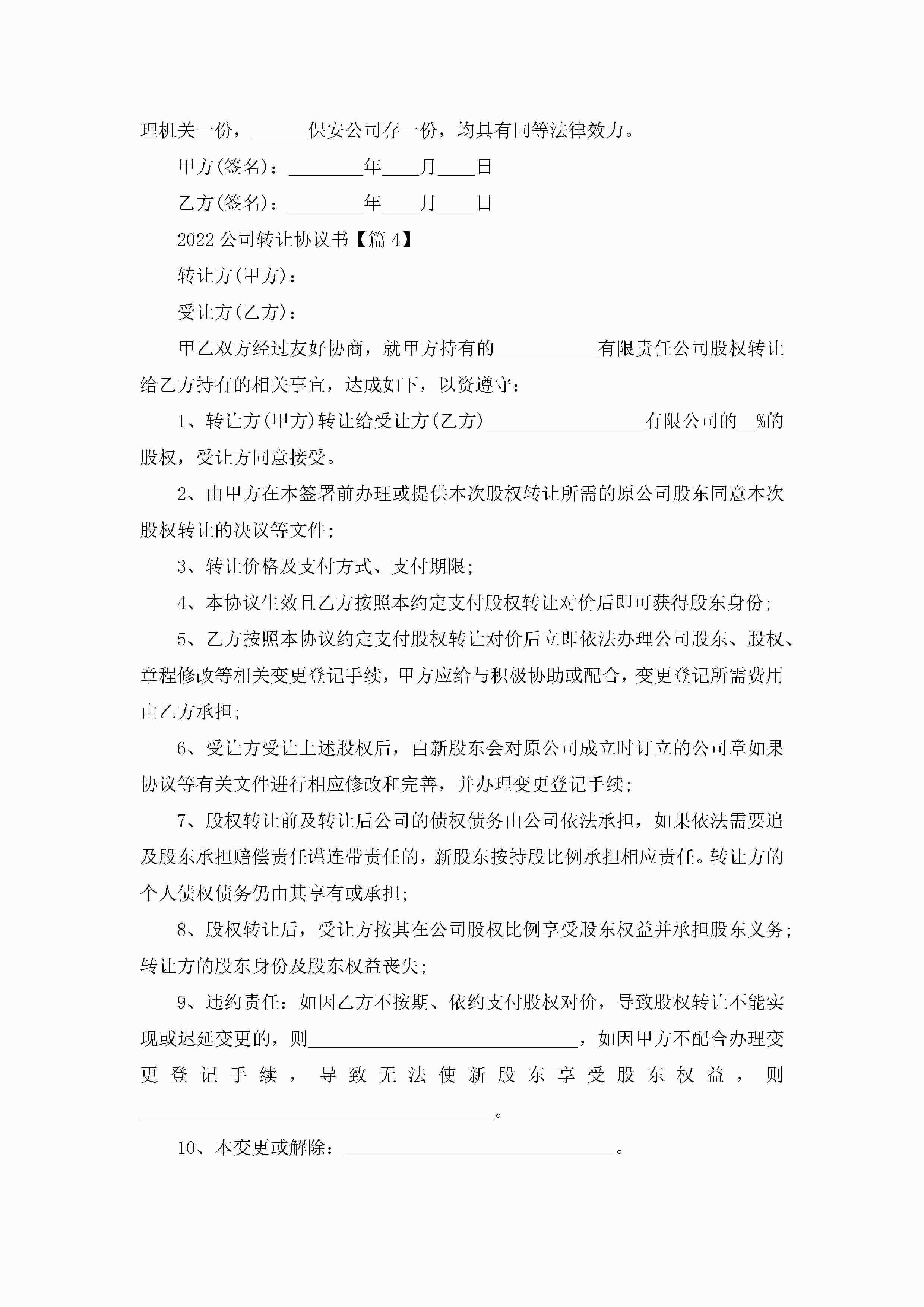 2022公司转让协议书精选5篇jugei3月22日 12:38更新关注233 2022公司转让协议书精选5篇此内容为付费资源,请付费后查看¥10.9 单篇文档限时特惠¥15个人会员开通企业会员开通立即下载无需登陆!可直接快捷下载单个模板付费资源© 版权声明THE ENDWord模板# 实用文档# 实用模板# 信函模板# 协议书 如有问题,可点击最底部“联系我们”联系客服 分享QQ空间微博QQ好友海报分享复制链接收藏