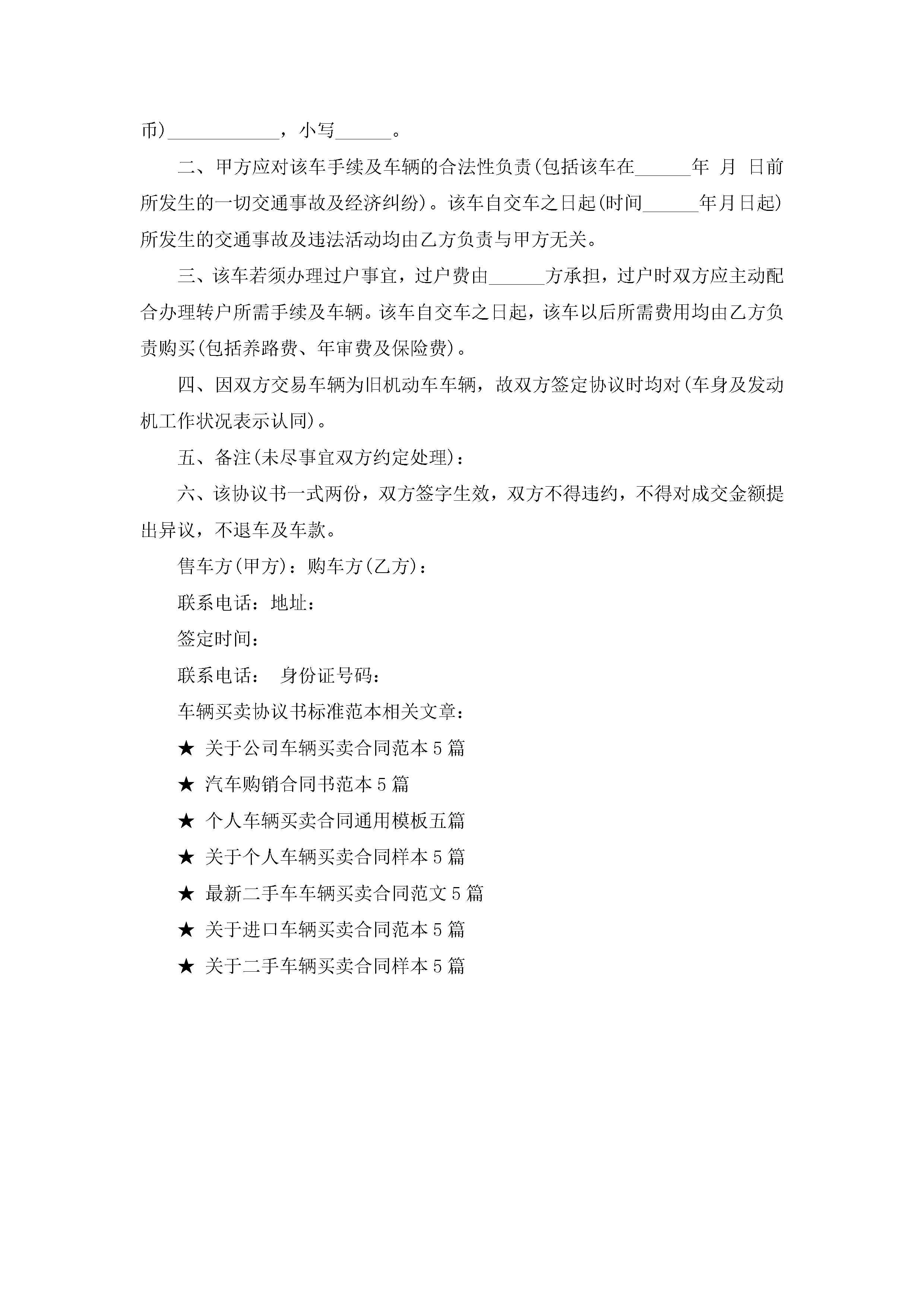 车辆买卖协议书标准范本大全7篇jugei3月22日 12:38更新关注229 车辆买卖协议书标准范本大全7篇此内容为付费资源,请付费后查看¥10.9 单篇文档限时特惠¥15个人会员开通企业会员开通立即下载无需登陆!可直接快捷下载单个模板付费资源© 版权声明THE ENDWord模板# 实用文档# 信函模板# 协议书# 车辆买卖协议书标准范本7篇 如有问题,可点击最底部“联系我们”联系客服 分享QQ空间微博QQ好友海报分享复制链接收藏