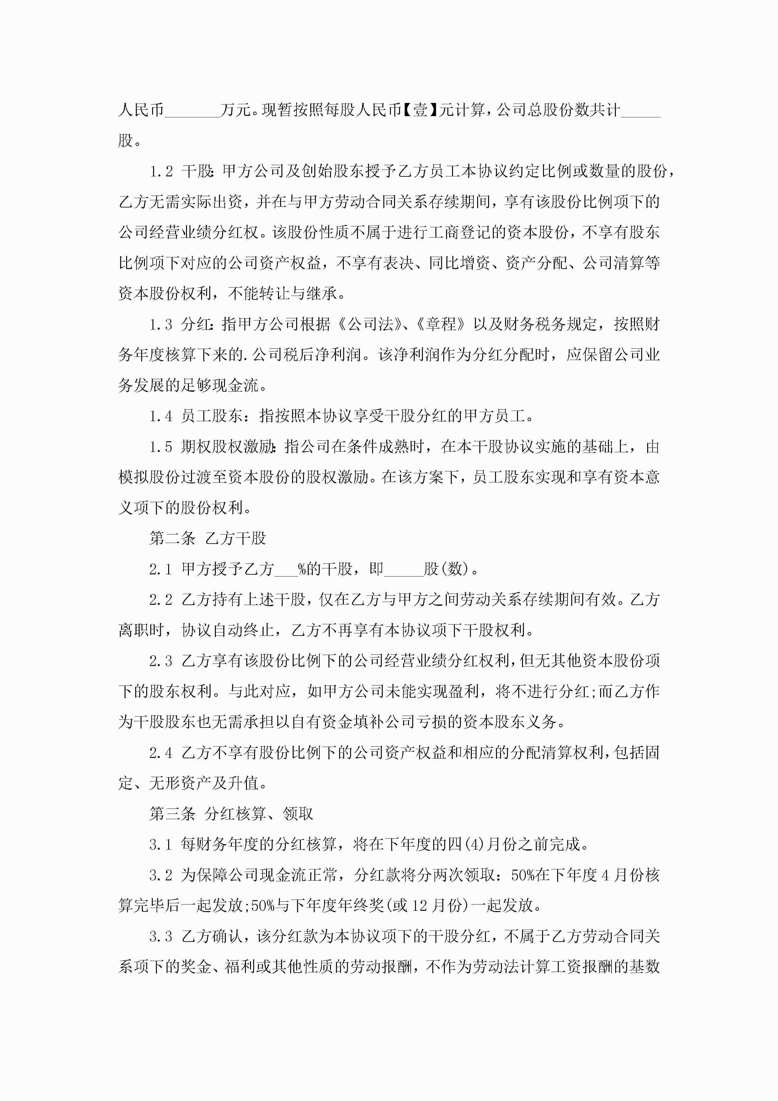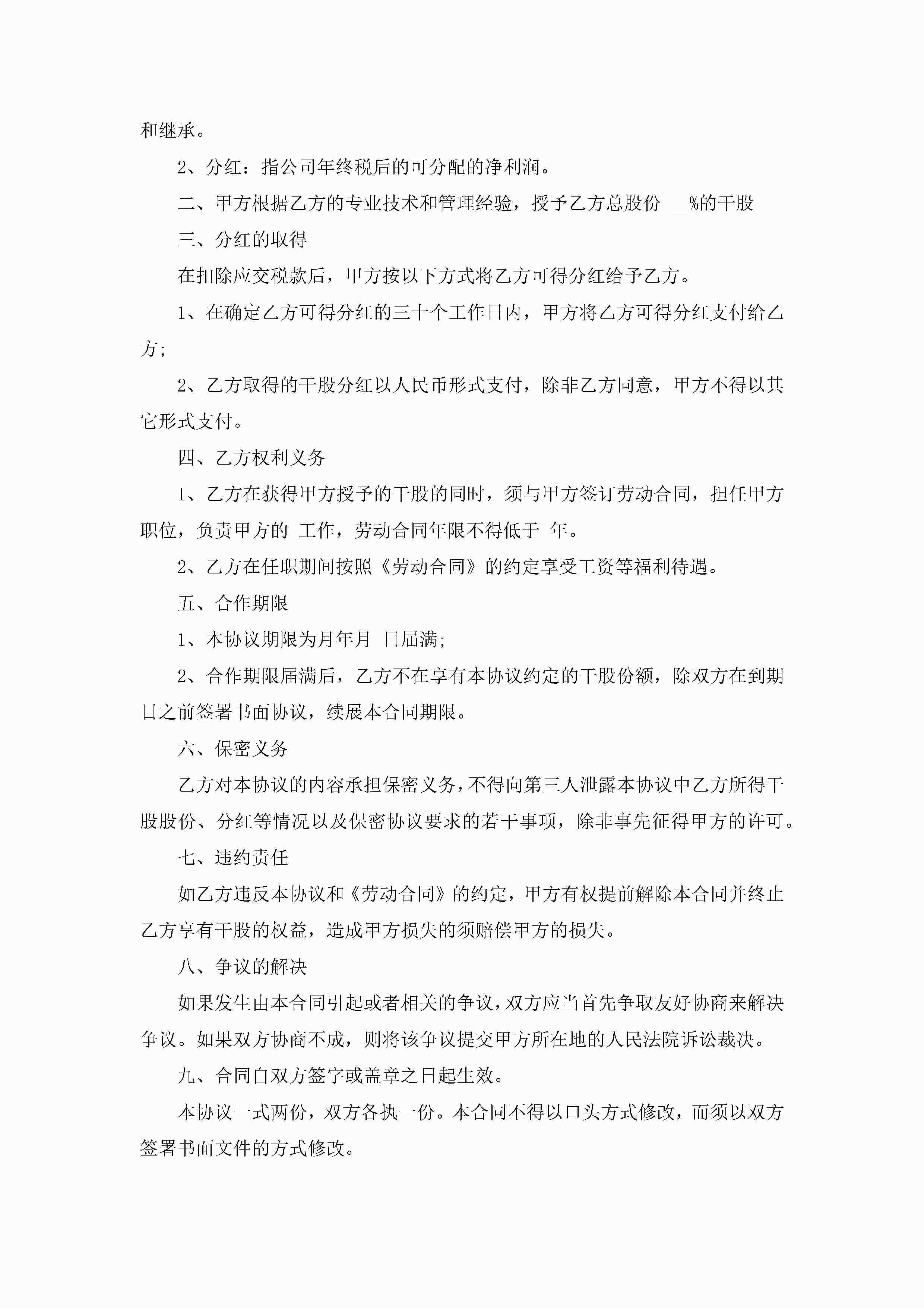 干股合作协议书标准模板大全5篇jugei3月22日 12:38更新关注202 干股合作协议书标准模板大全5篇此内容为付费资源,请付费后查看¥10.9 单篇文档限时特惠¥15个人会员开通企业会员开通立即下载无需登陆!可直接快捷下载单个模板付费资源© 版权声明THE ENDWord模板# 实用文档# 信函模板# 协议书# 干股合作协议书标准模板5篇 如有问题,可点击最底部“联系我们”联系客服 分享QQ空间微博QQ好友海报分享复制链接收藏