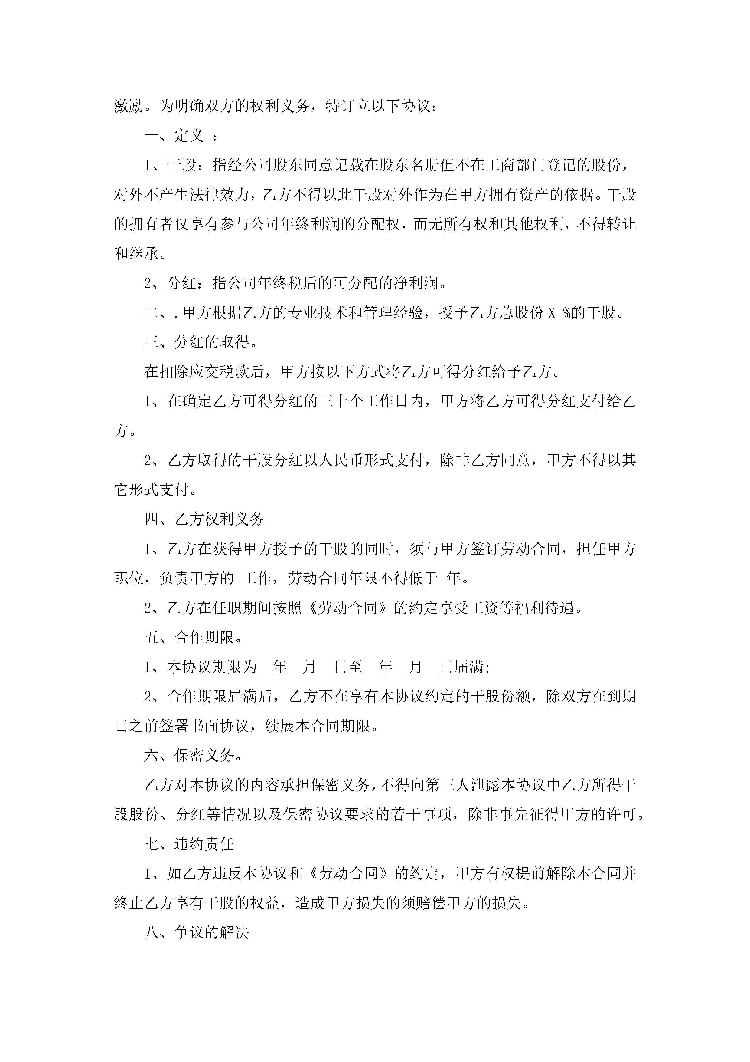 干股入股分红协议书范本5篇jugei3月22日 12:38更新关注286 干股入股分红协议书范本5篇此内容为付费资源,请付费后查看¥10.9 单篇文档限时特惠¥15个人会员开通企业会员开通立即下载无需登陆!可直接快捷下载单个模板付费资源© 版权声明THE ENDWord模板# 实用文档# 信函模板# 协议书# 干股入股分红协议书范本 如有问题,可点击最底部“联系我们”联系客服 分享QQ空间微博QQ好友海报分享复制链接收藏