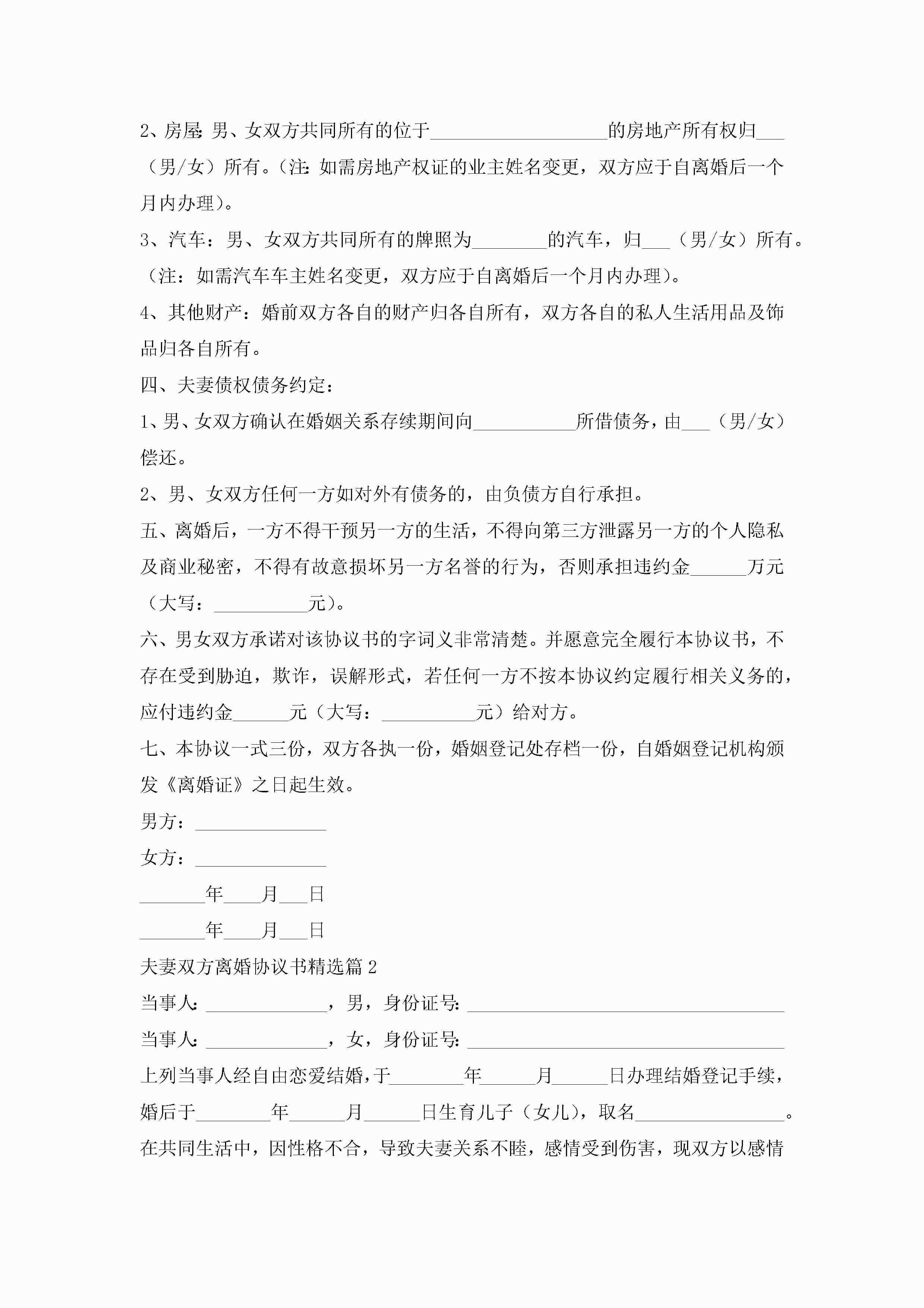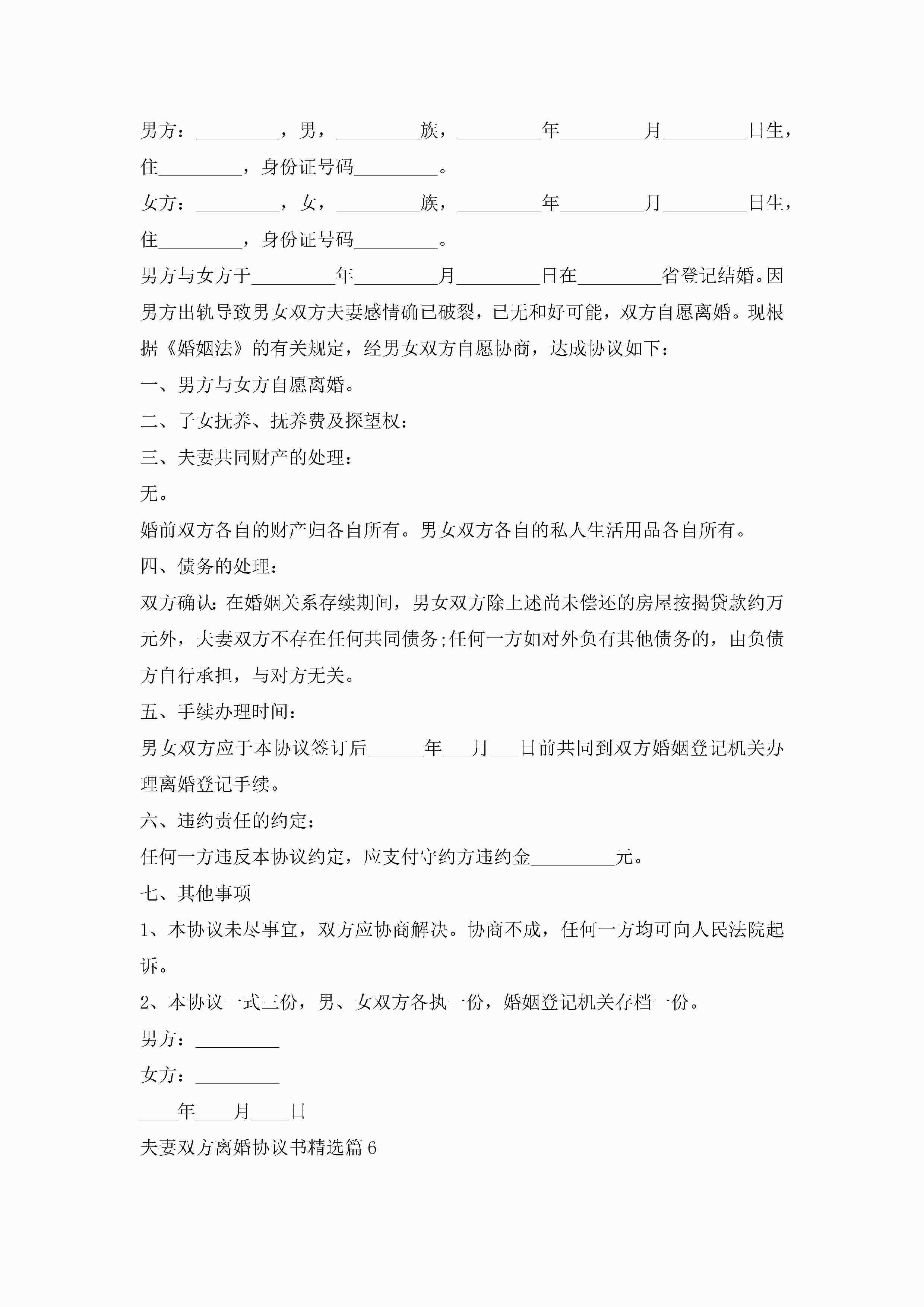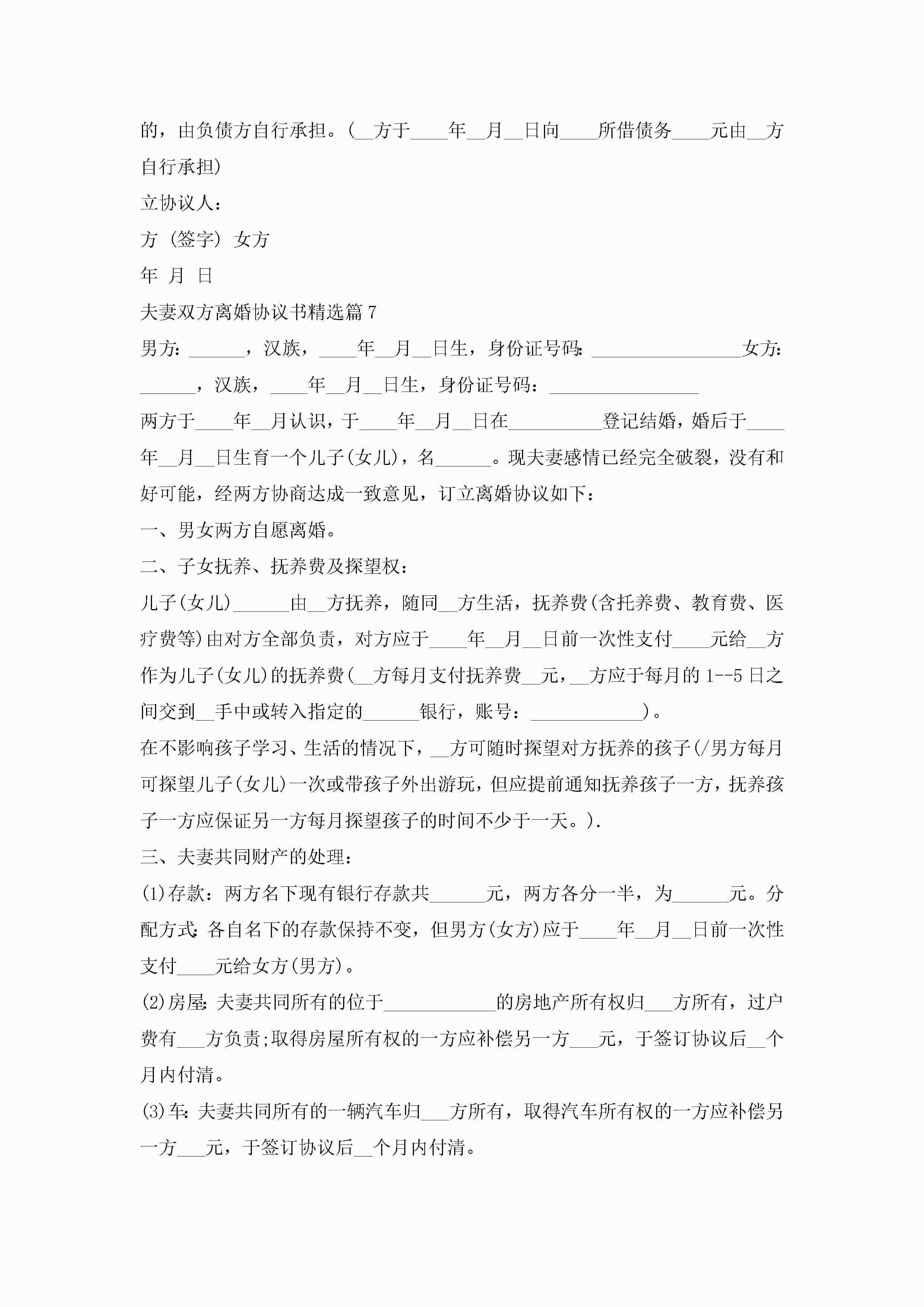 夫妻双方离婚协议书2023标准版【15篇】jugei3月22日 12:38更新关注220 夫妻双方离婚协议书2023标准版【15篇】此内容为付费资源,请付费后查看¥10.9 单篇文档限时特惠¥15个人会员开通企业会员开通立即下载无需登陆!可直接快捷下载单个模板付费资源© 版权声明THE ENDWord模板# 实用文档# 实用模板# 信函模板# 协议书# 夫妻双方离婚协议书15篇 如有问题,可点击最底部“联系我们”联系客服 分享QQ空间微博QQ好友海报分享复制链接收藏