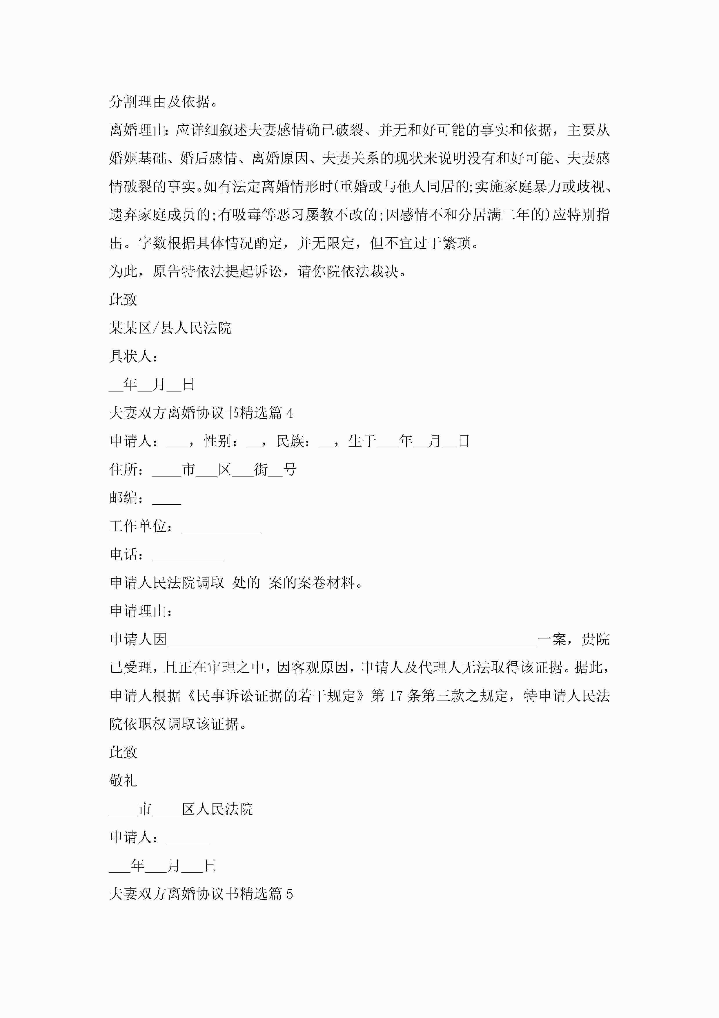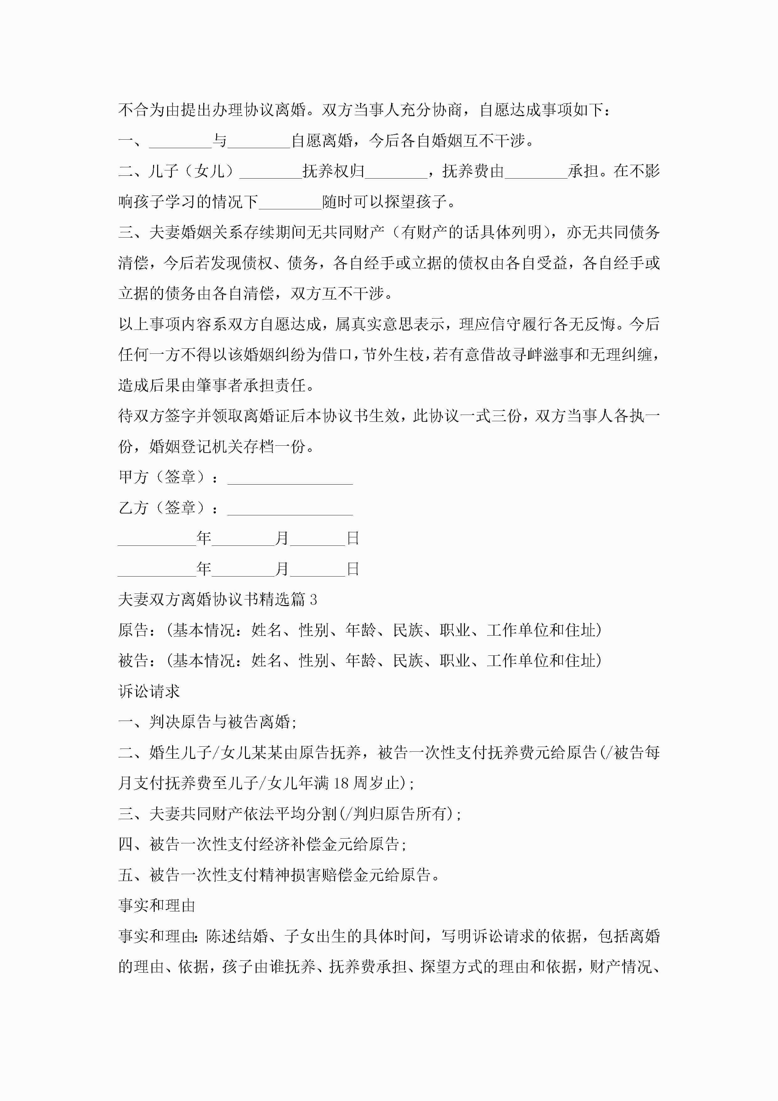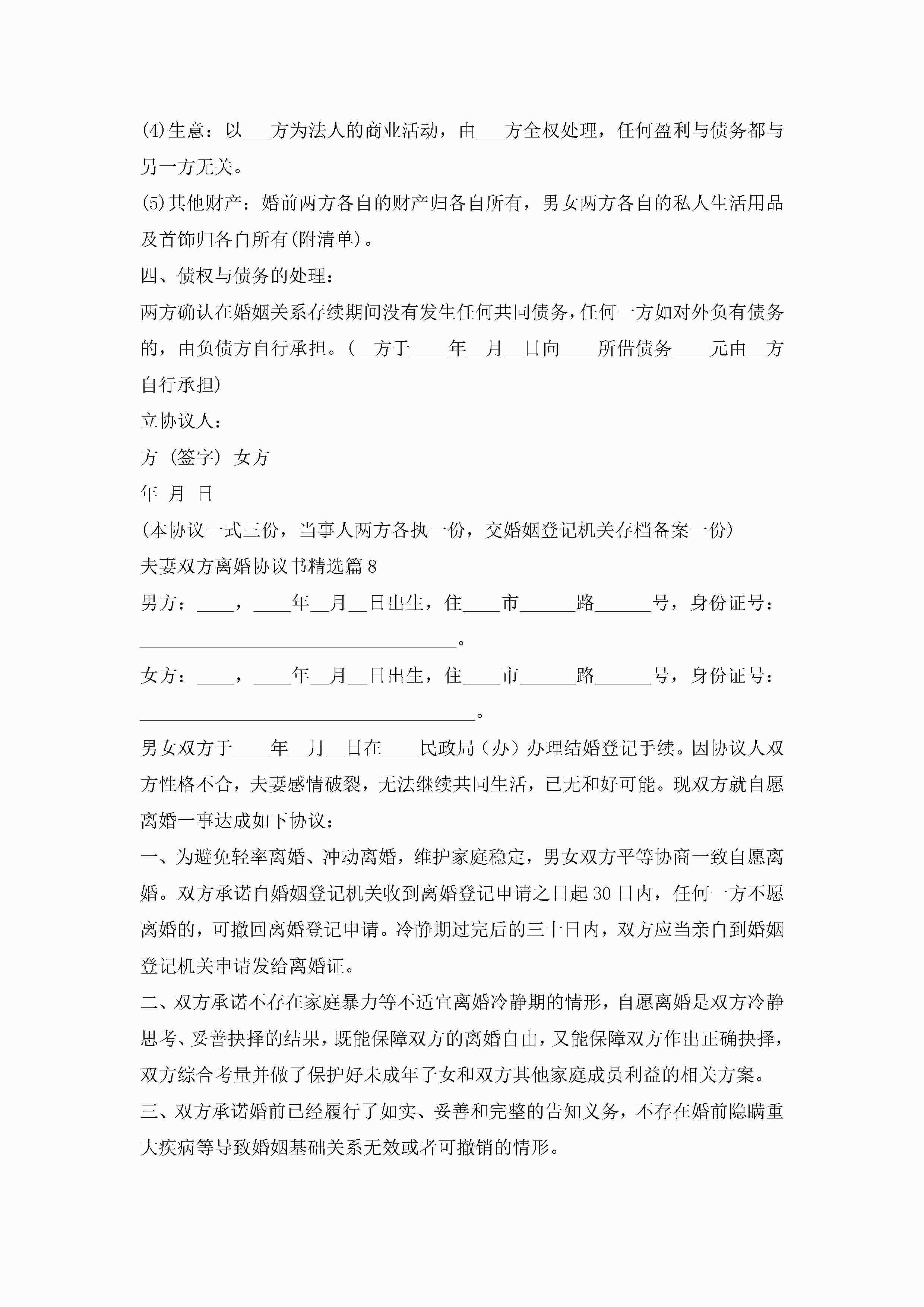 夫妻双方离婚协议书2023标准版【15篇】jugei3月22日 12:38更新关注220 夫妻双方离婚协议书2023标准版【15篇】此内容为付费资源,请付费后查看¥10.9 单篇文档限时特惠¥15个人会员开通企业会员开通立即下载无需登陆!可直接快捷下载单个模板付费资源© 版权声明THE ENDWord模板# 实用文档# 实用模板# 信函模板# 协议书# 夫妻双方离婚协议书15篇 如有问题,可点击最底部“联系我们”联系客服 分享QQ空间微博QQ好友海报分享复制链接收藏