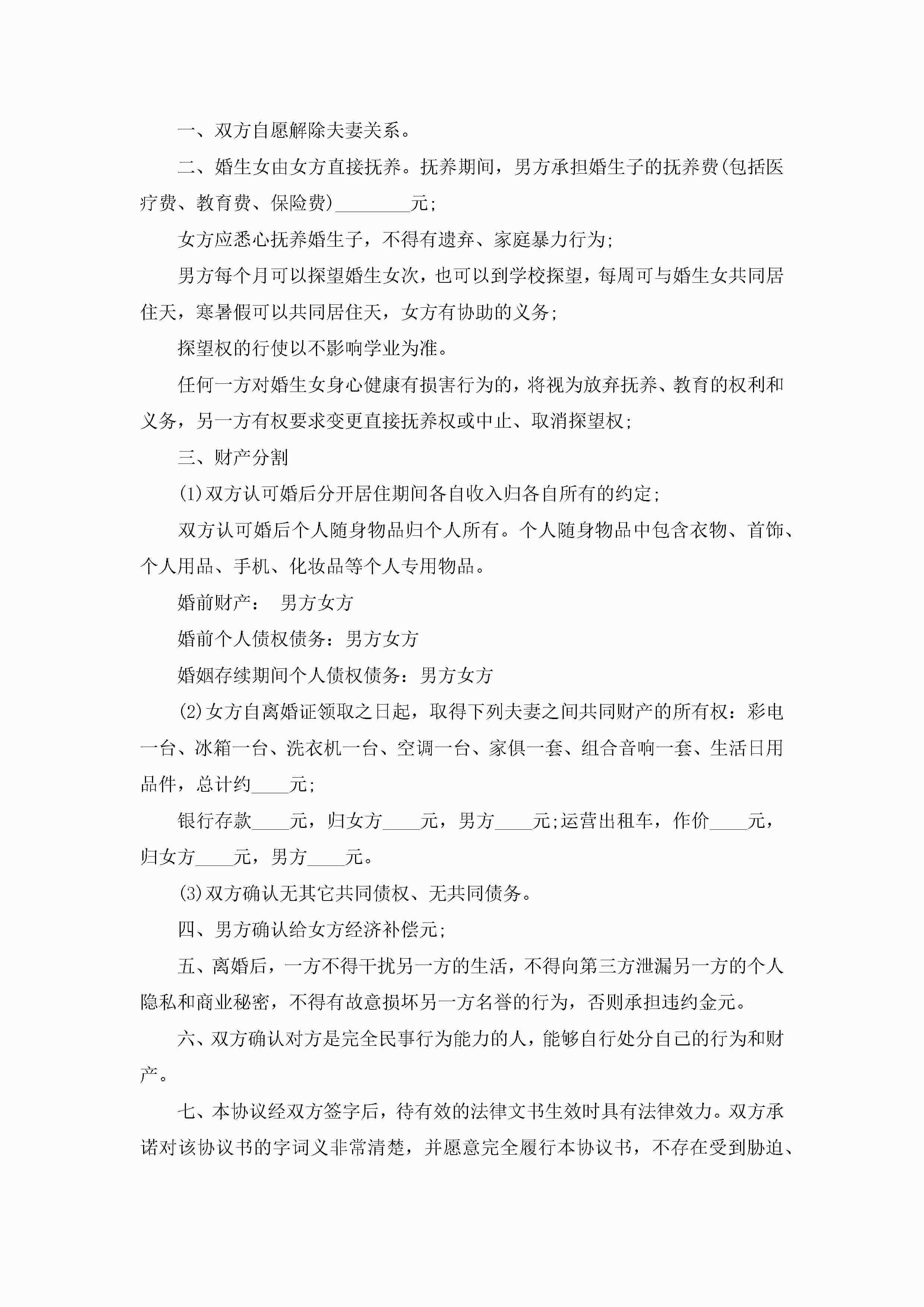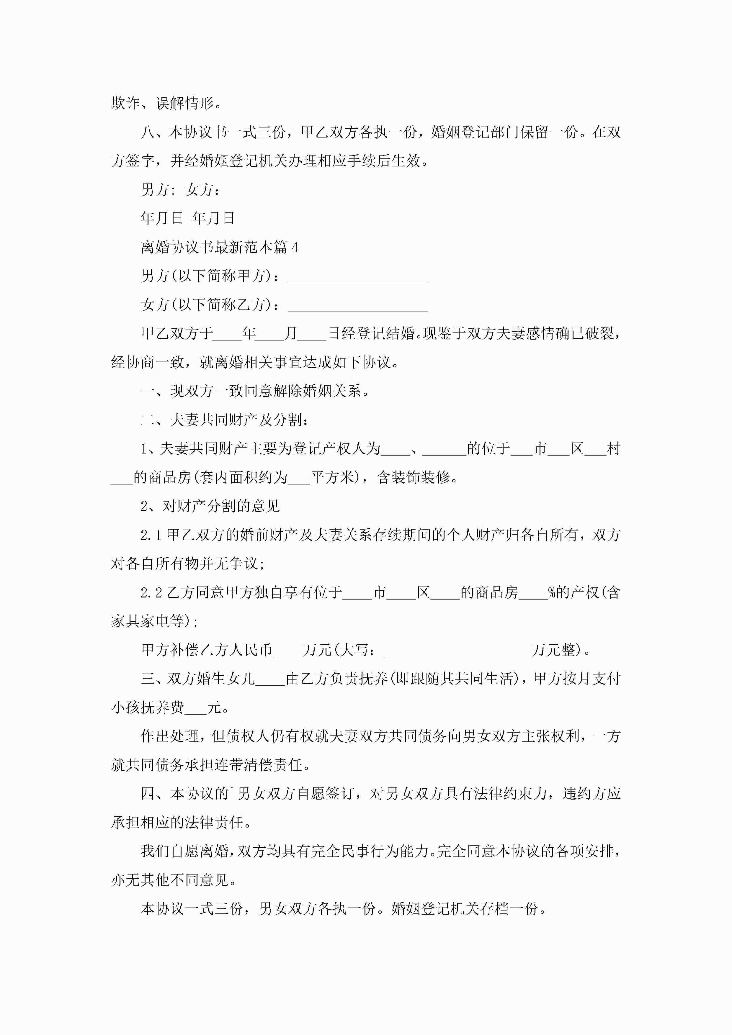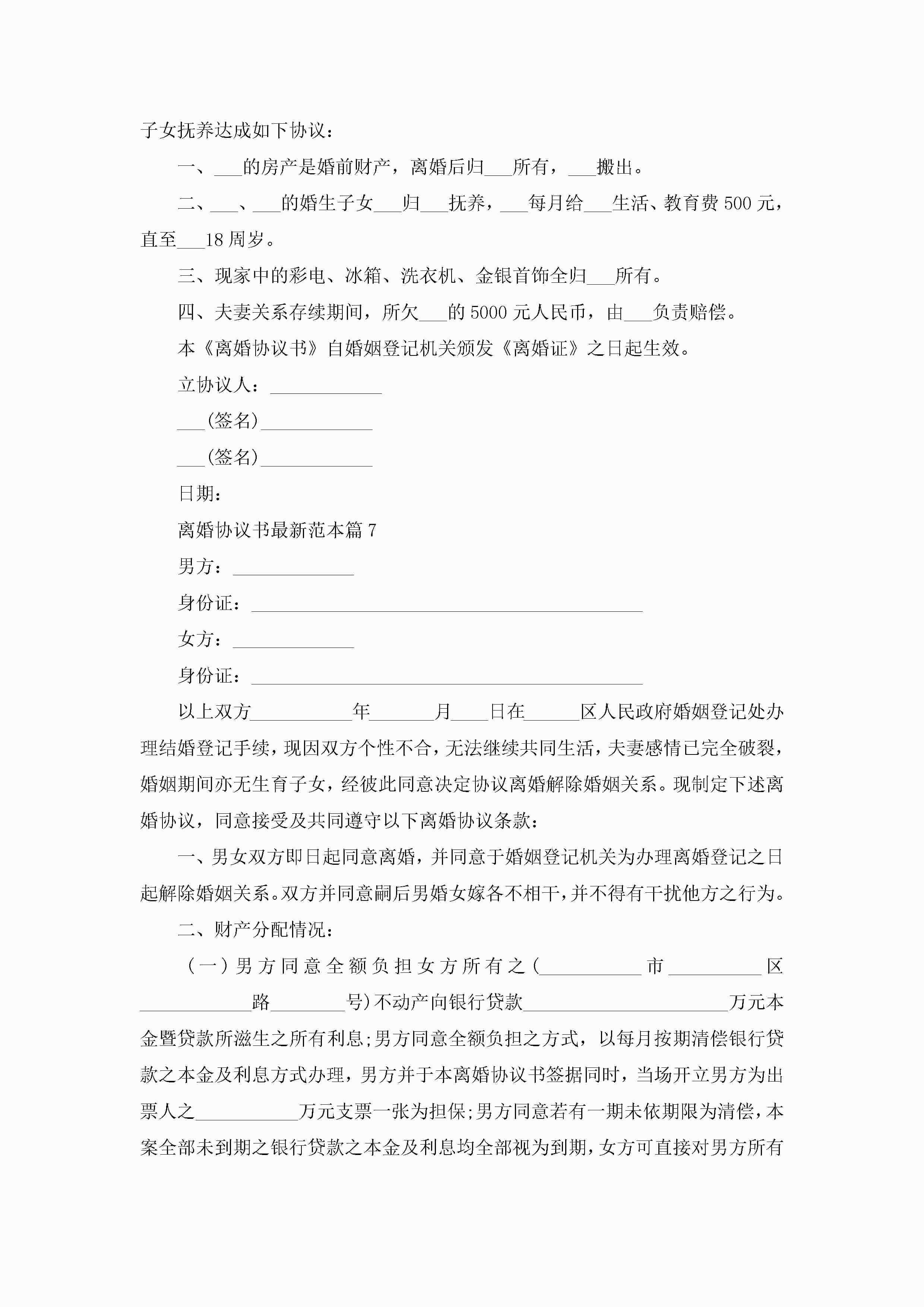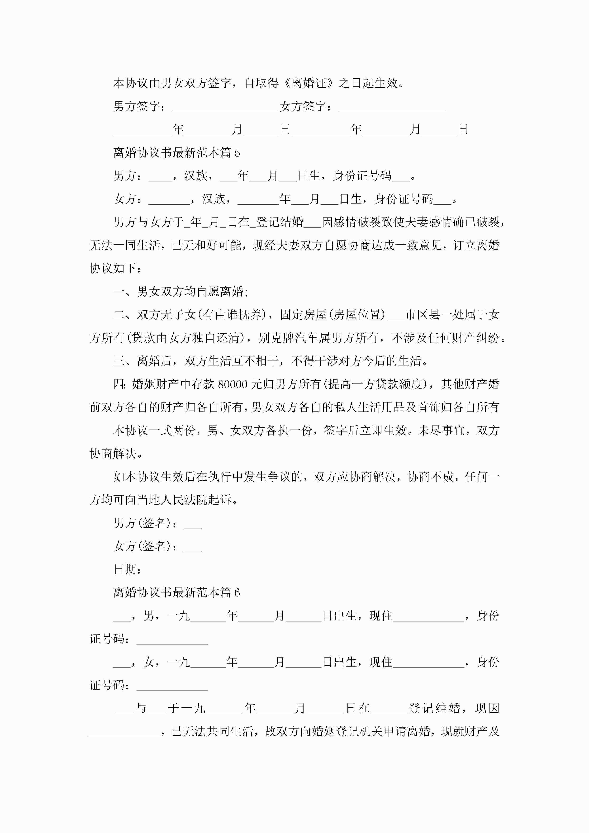 离婚协议书最新范本(精选10篇)jugei3月22日 12:39更新关注190 离婚协议书最新范本(精选10篇)此内容为付费资源,请付费后查看¥10.9 单篇文档限时特惠¥15个人会员开通企业会员开通立即下载无需登陆!可直接快捷下载单个模板付费资源© 版权声明THE ENDWord模板# 实用文档# 实用模板# 信函模板# 协议书 如有问题,可点击最底部“联系我们”联系客服 分享QQ空间微博QQ好友海报分享复制链接收藏