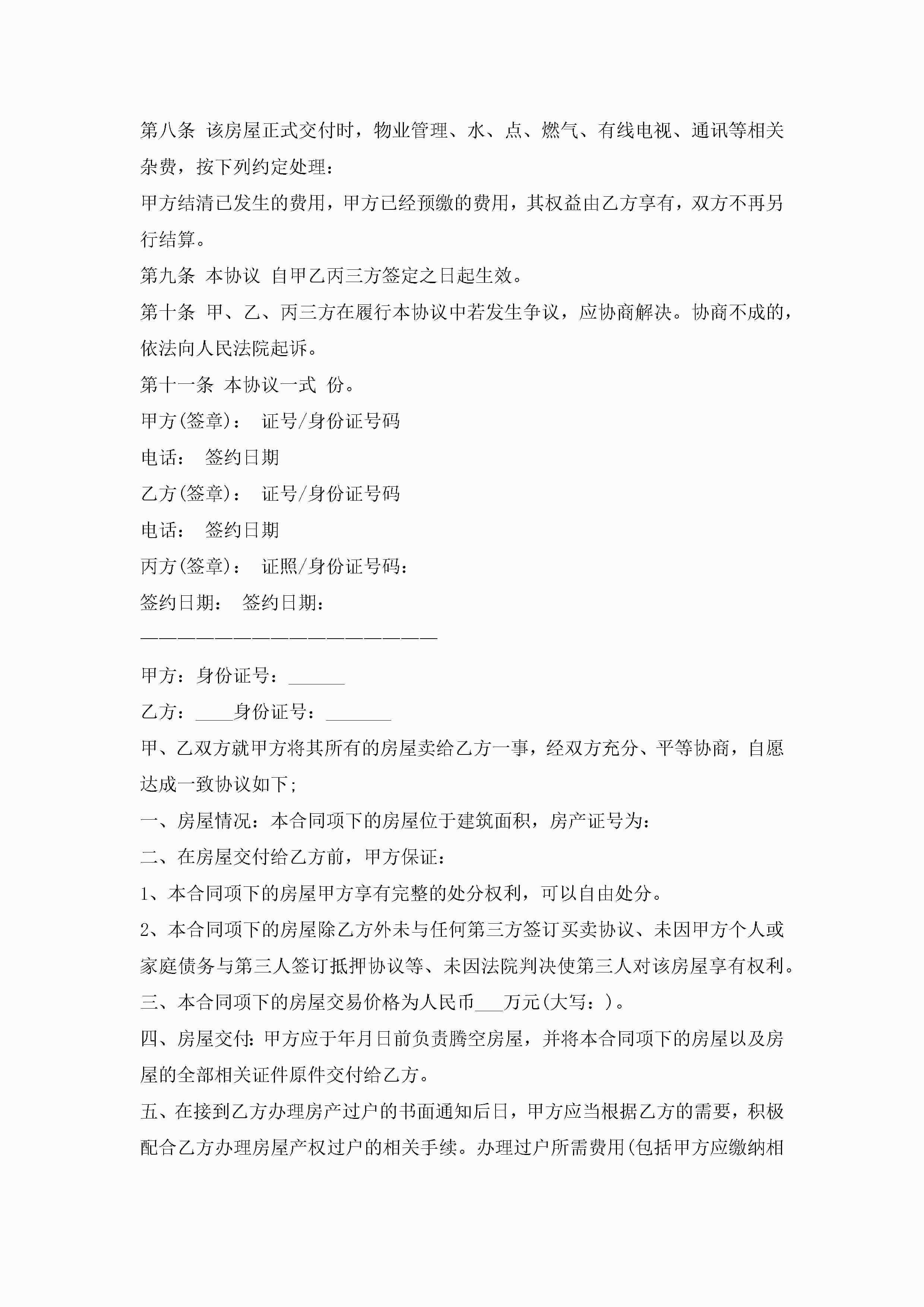 房屋出售协议范文怎么写10篇精选jugei3月22日 12:39更新关注244 房屋出售协议范文怎么写10篇精选此内容为付费资源,请付费后查看¥10.9 单篇文档限时特惠¥15个人会员开通企业会员开通立即下载无需登陆!可直接快捷下载单个模板付费资源© 版权声明THE ENDWord模板# 实用文档# 实用模板# 信函模板# 协议书 如有问题,可点击最底部“联系我们”联系客服 分享QQ空间微博QQ好友海报分享复制链接收藏