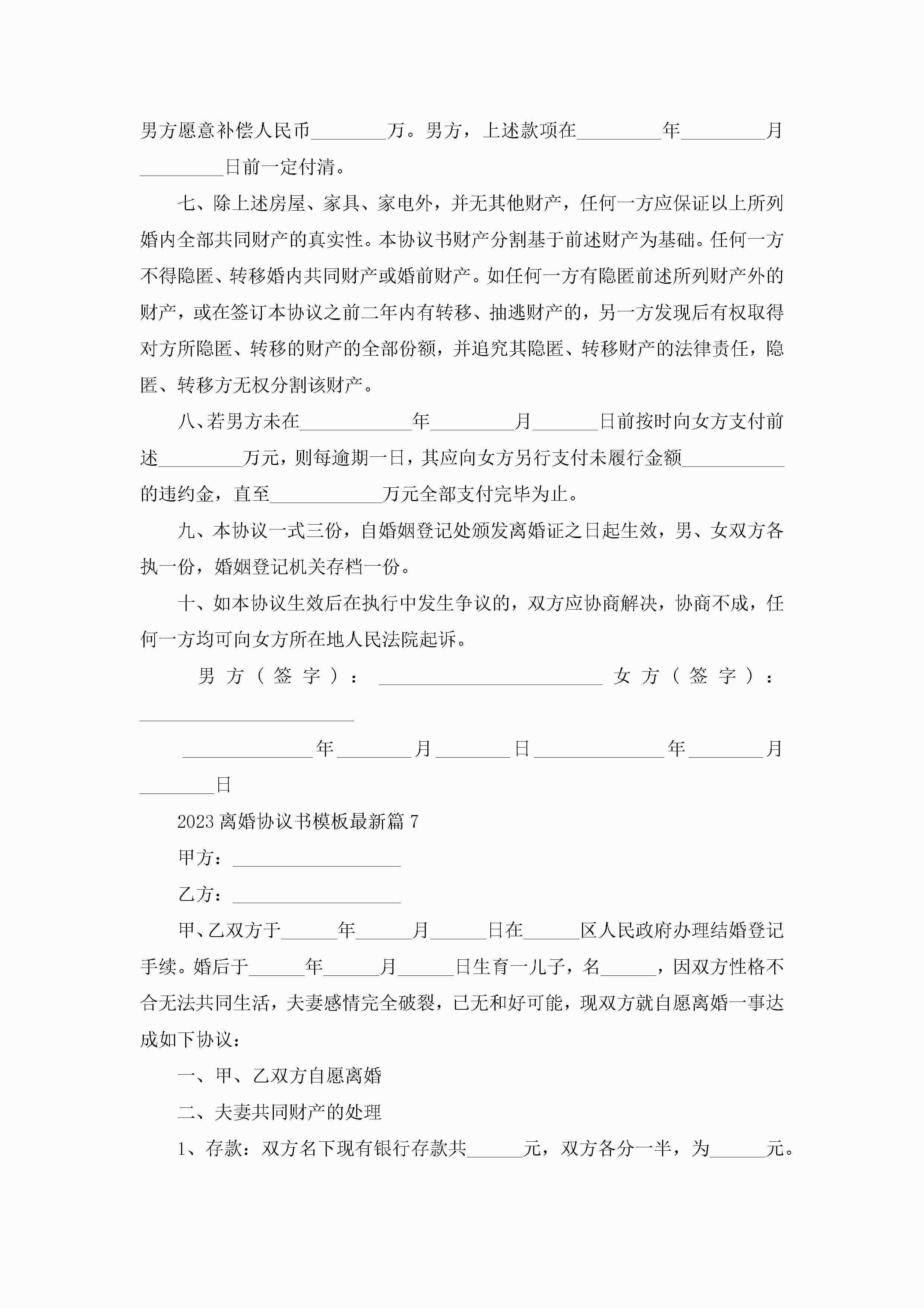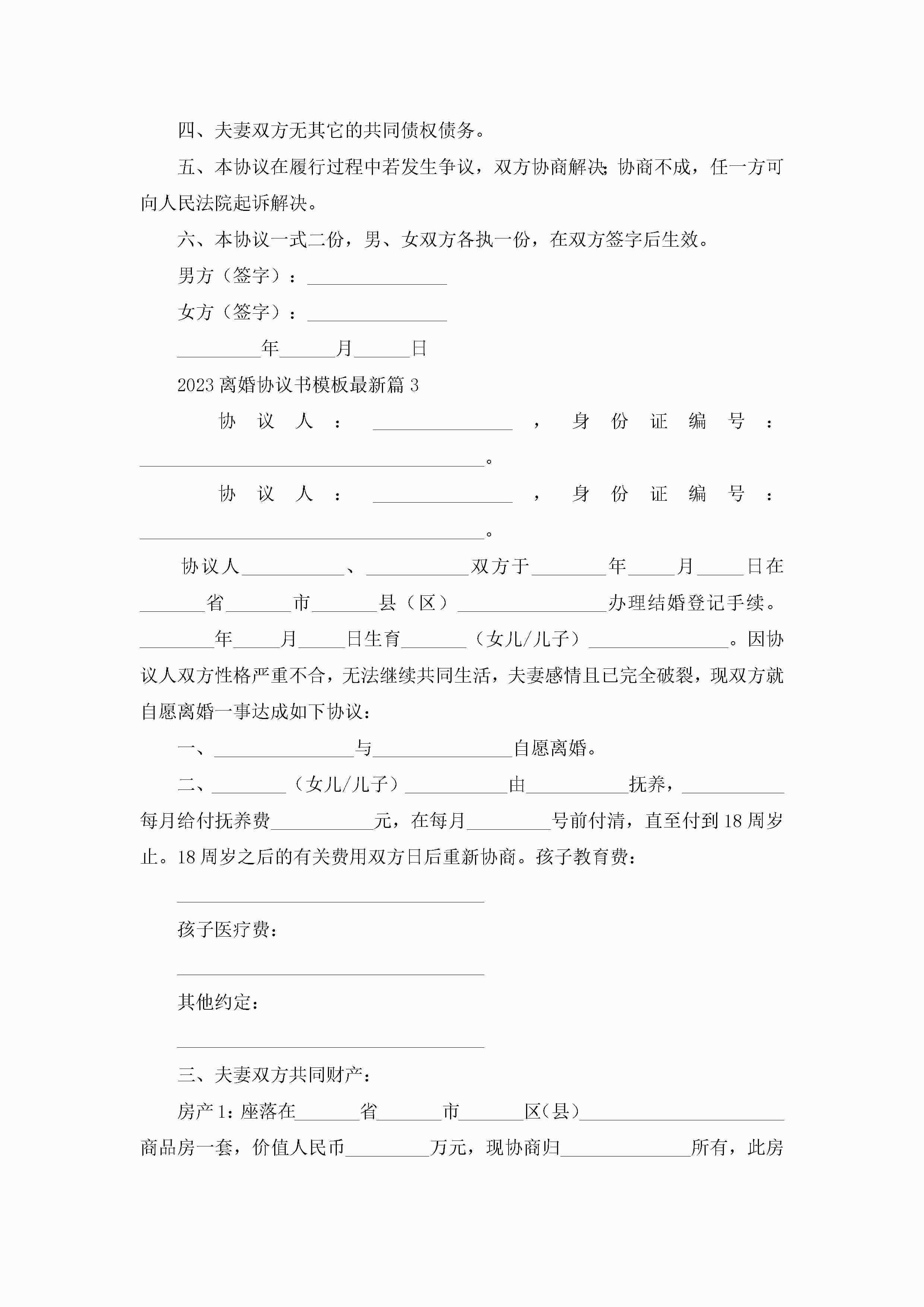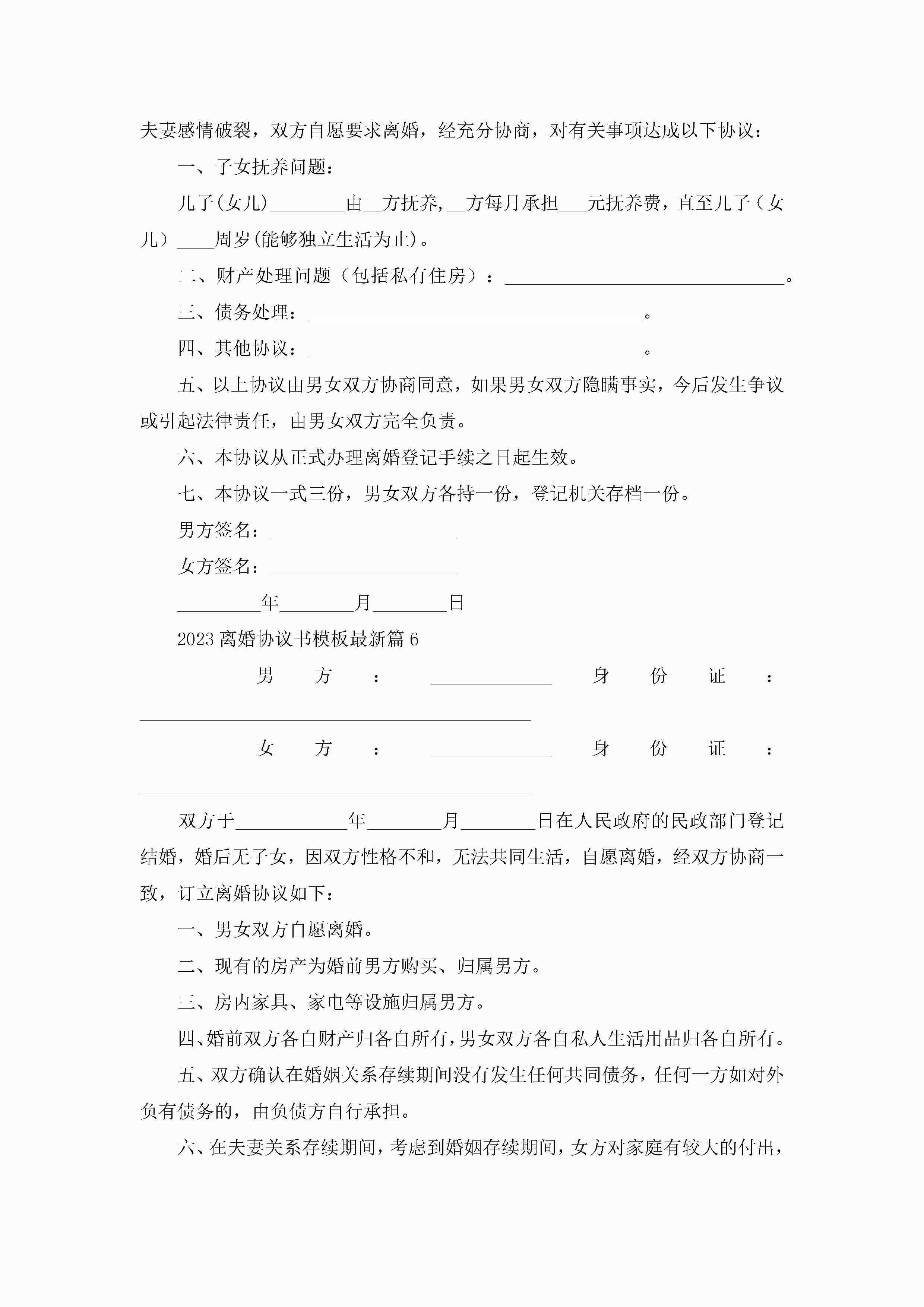 离婚协议书模板最新(10篇)jugei3月22日 12:39更新关注193 离婚协议书模板最新(10篇)此内容为付费资源,请付费后查看¥10.9 单篇文档限时特惠¥15个人会员开通企业会员开通立即下载无需登陆!可直接快捷下载单个模板付费资源© 版权声明THE ENDWord模板# 实用文档# 实用模板# 信函模板# 协议书# 2023离婚协议书模板最新10篇 如有问题,可点击最底部“联系我们”联系客服 分享QQ空间微博QQ好友海报分享复制链接收藏