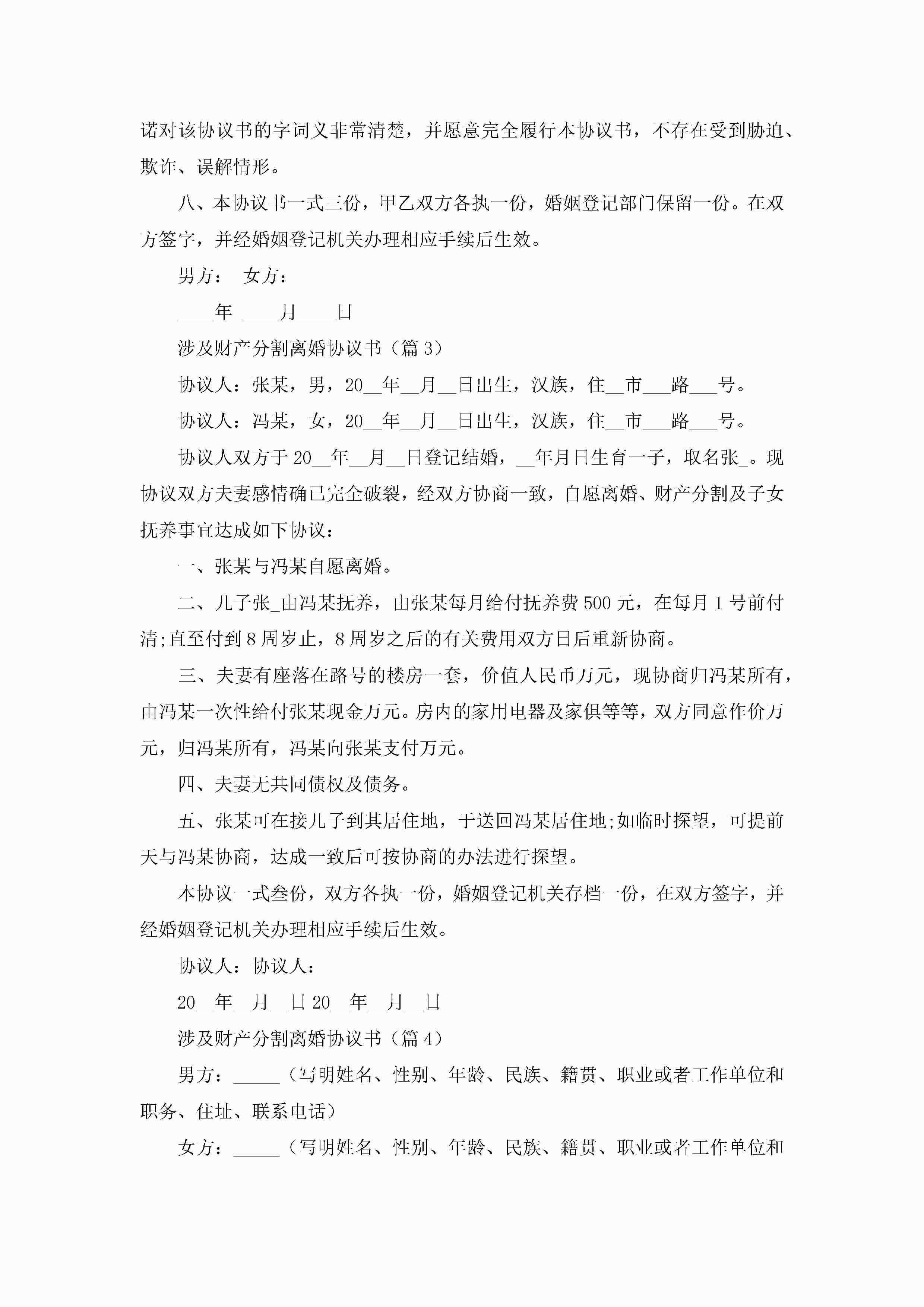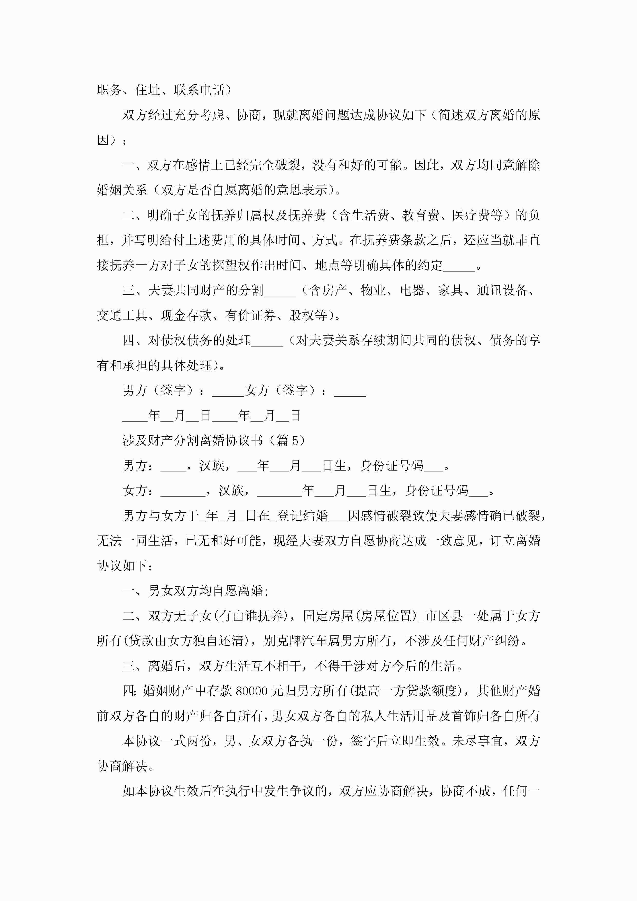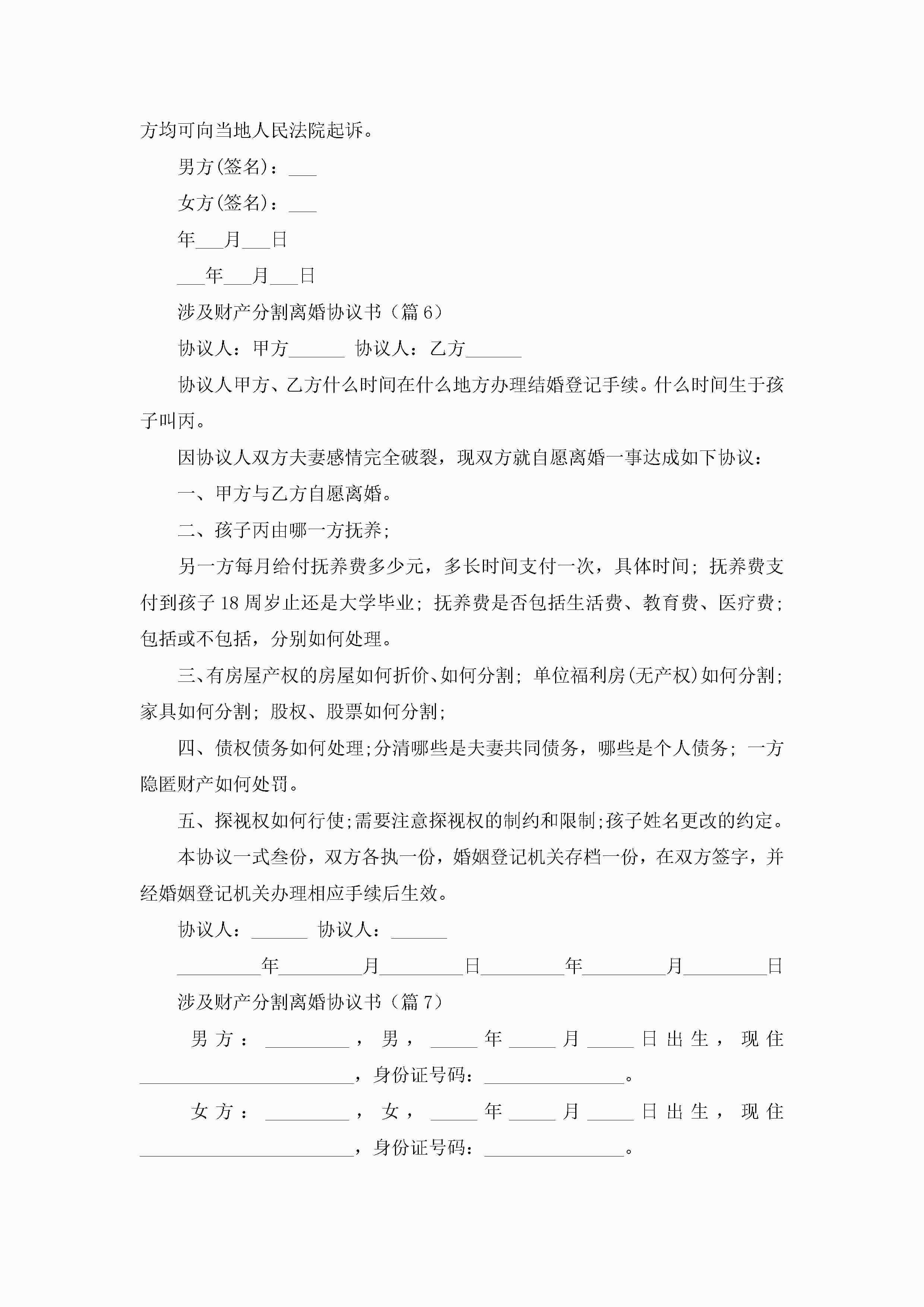 涉及财产分割离婚协议书(优秀7篇)jugei3月22日 12:39更新关注198 涉及财产分割离婚协议书(优秀7篇)此内容为付费资源,请付费后查看¥10.9 单篇文档限时特惠¥15个人会员开通企业会员开通立即下载无需登陆!可直接快捷下载单个模板付费资源© 版权声明THE ENDWord模板# 实用文档# 实用模板# 信函模板# 协议书 如有问题,可点击最底部“联系我们”联系客服 分享QQ空间微博QQ好友海报分享复制链接收藏