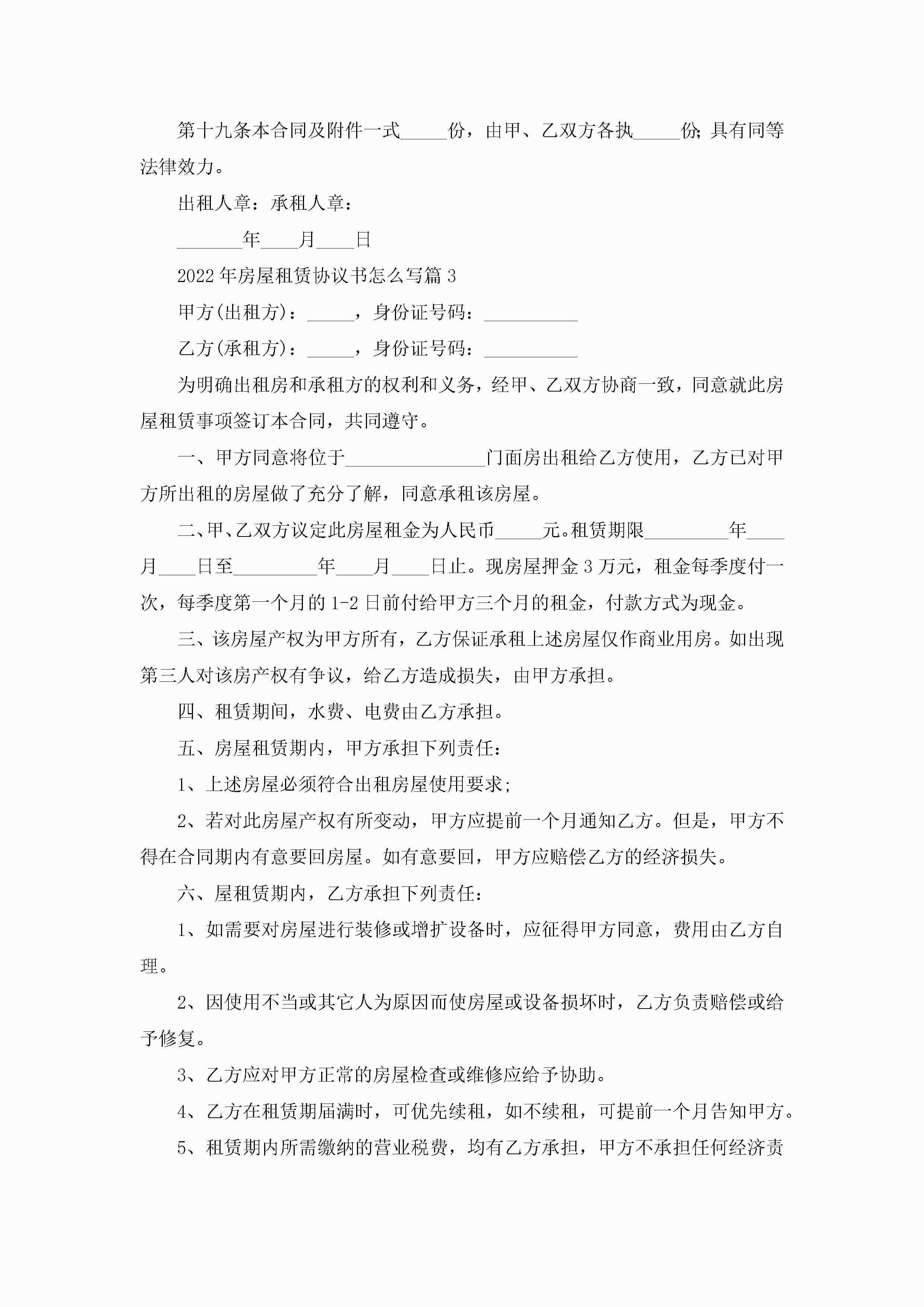 2022年房屋租赁协议书怎么写(精选10篇)jugei3月22日 12:41更新关注189 2022年房屋租赁协议书怎么写(精选10篇)此内容为付费资源,请付费后查看¥10.9 单篇文档限时特惠¥15个人会员开通企业会员开通立即下载无需登陆!可直接快捷下载单个模板付费资源© 版权声明THE ENDWord模板# 实用文档# 实用模板# 信函模板# 协议书 如有问题,可点击最底部“联系我们”联系客服 分享QQ空间微博QQ好友海报分享复制链接收藏