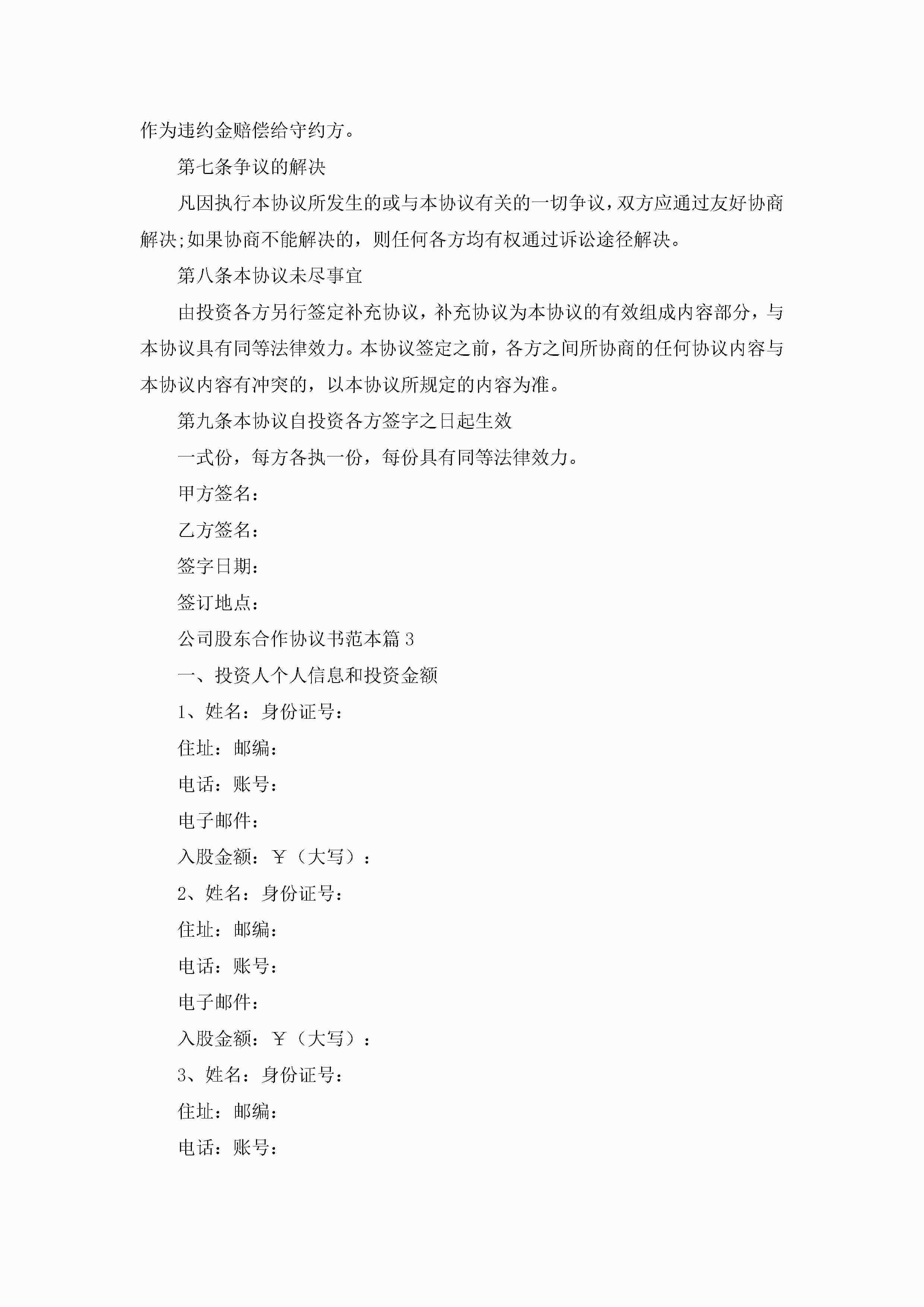 公司股东合作协议书范本(精选7篇)jugei3月22日 12:41更新关注201 公司股东合作协议书范本(精选7篇)此内容为付费资源,请付费后查看¥10.9 单篇文档限时特惠¥15个人会员开通企业会员开通立即下载无需登陆!可直接快捷下载单个模板付费资源© 版权声明THE ENDWord模板# 实用文档# 实用模板# 信函模板# 协议书 如有问题,可点击最底部“联系我们”联系客服 分享QQ空间微博QQ好友海报分享复制链接收藏