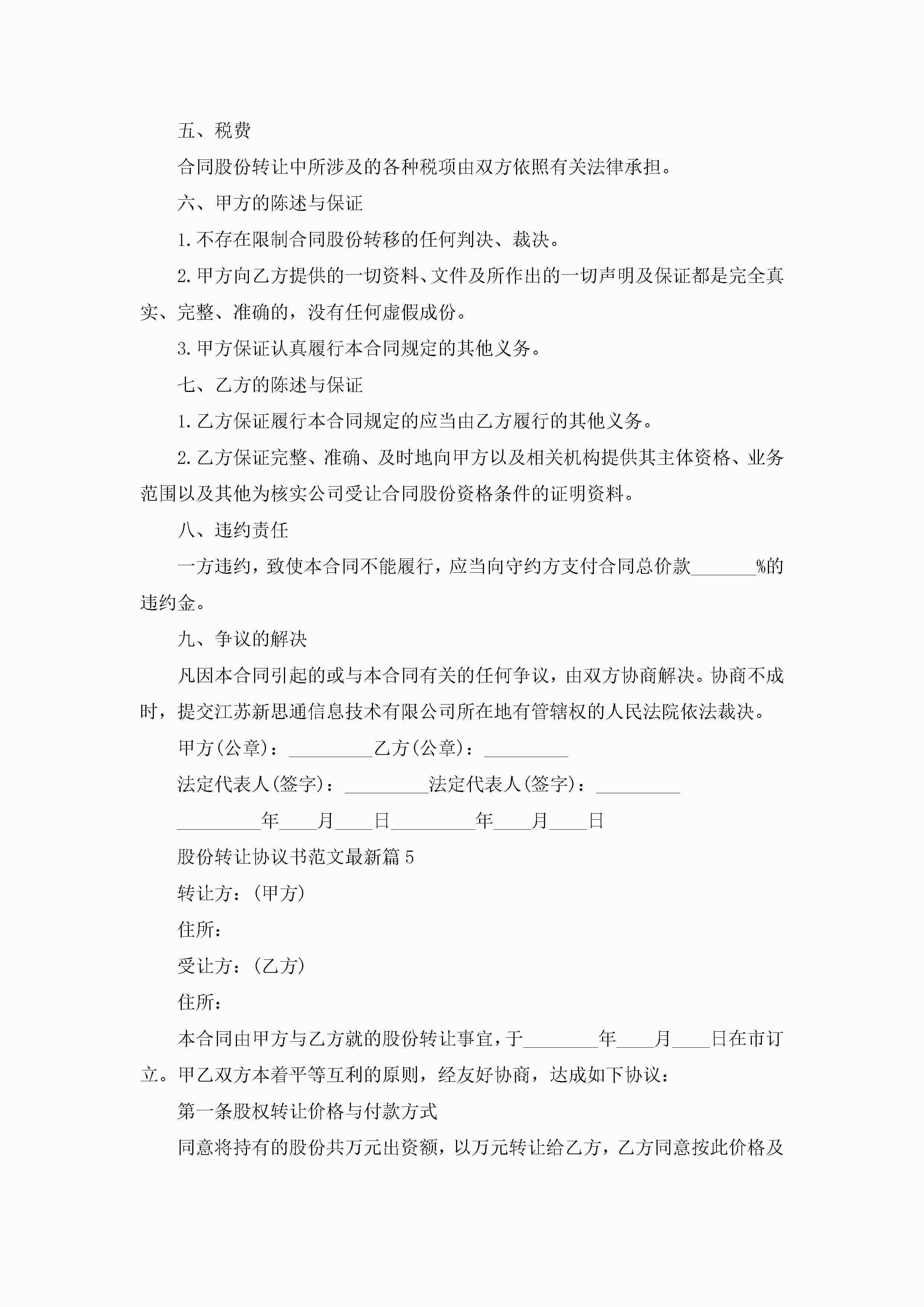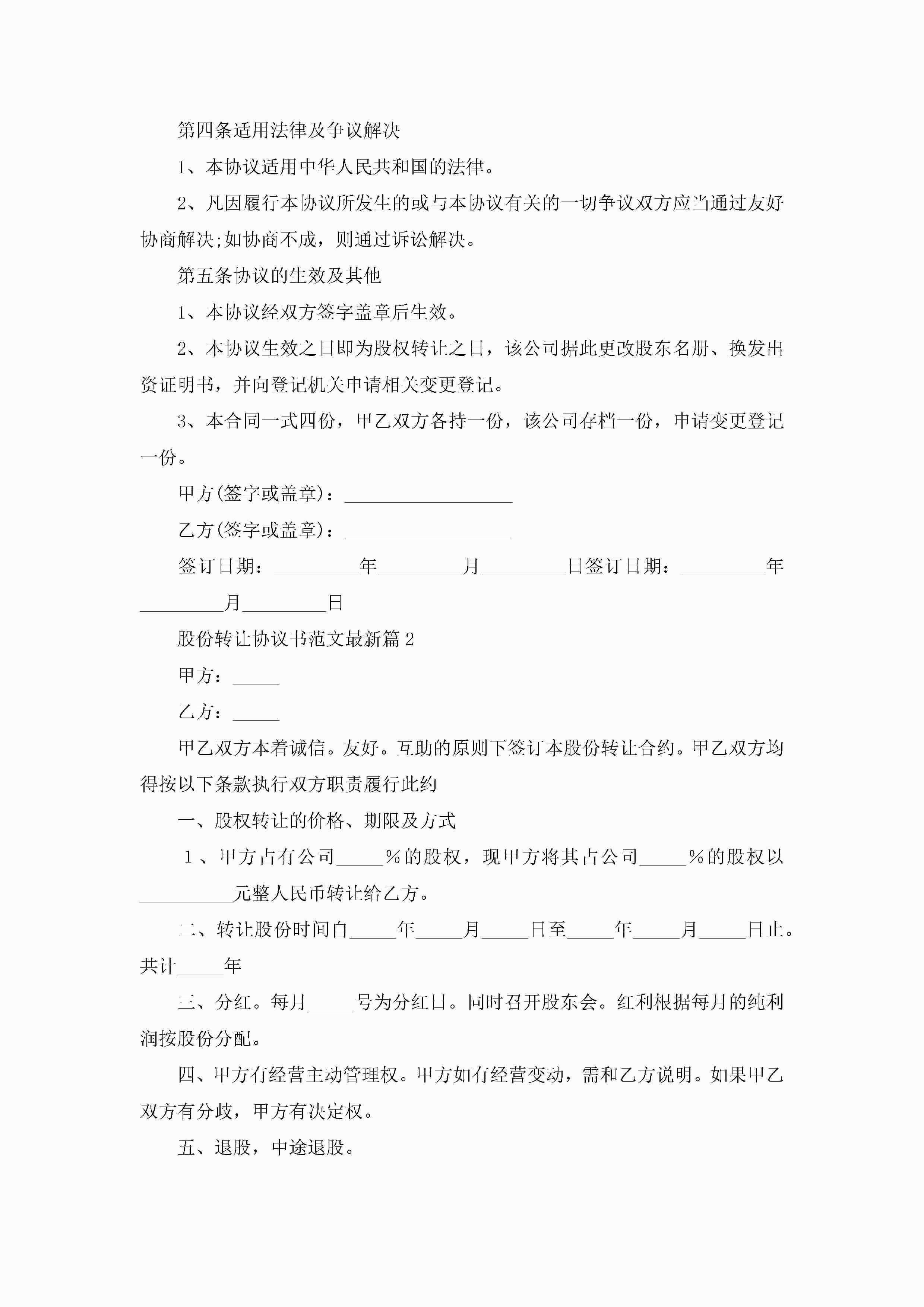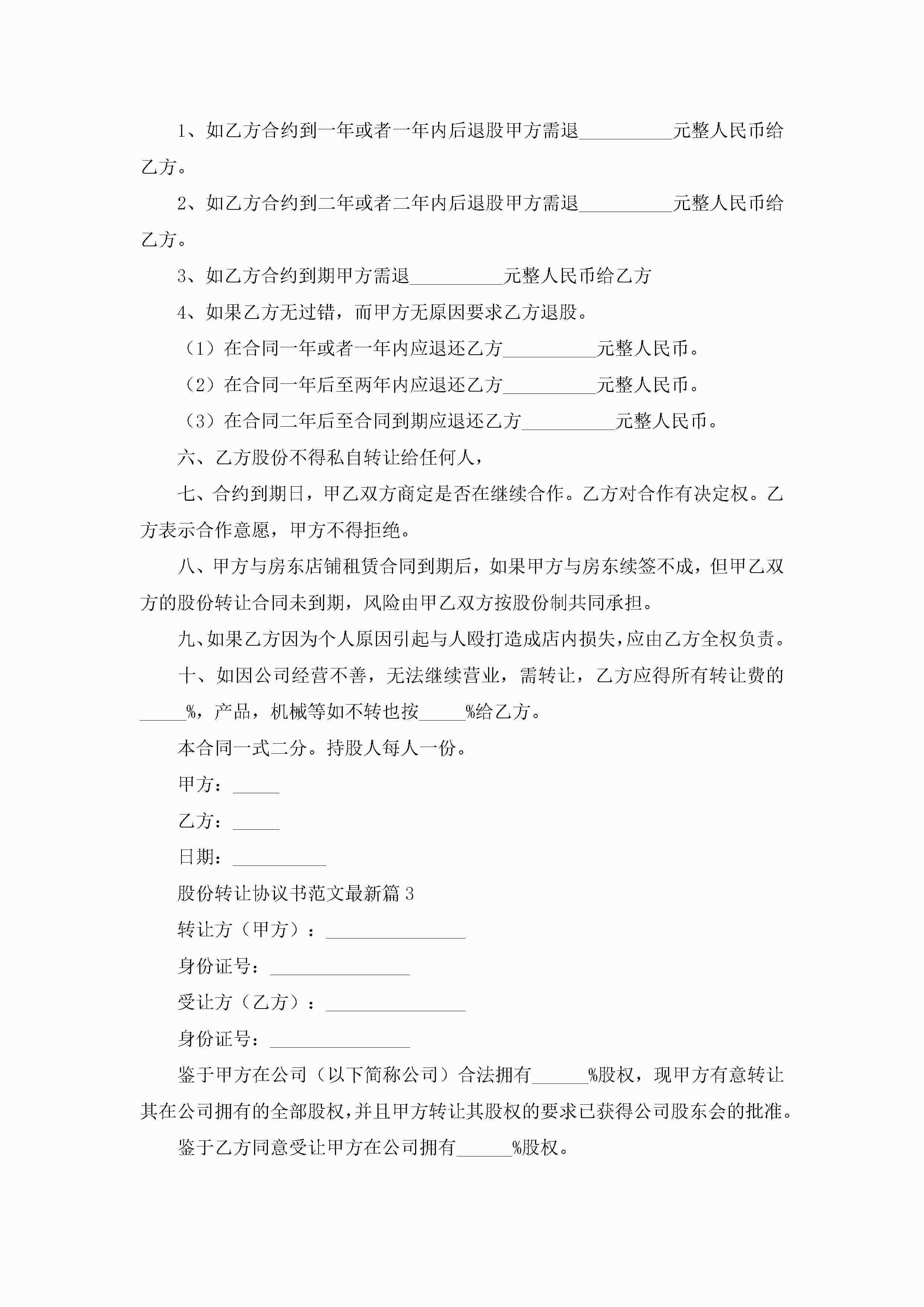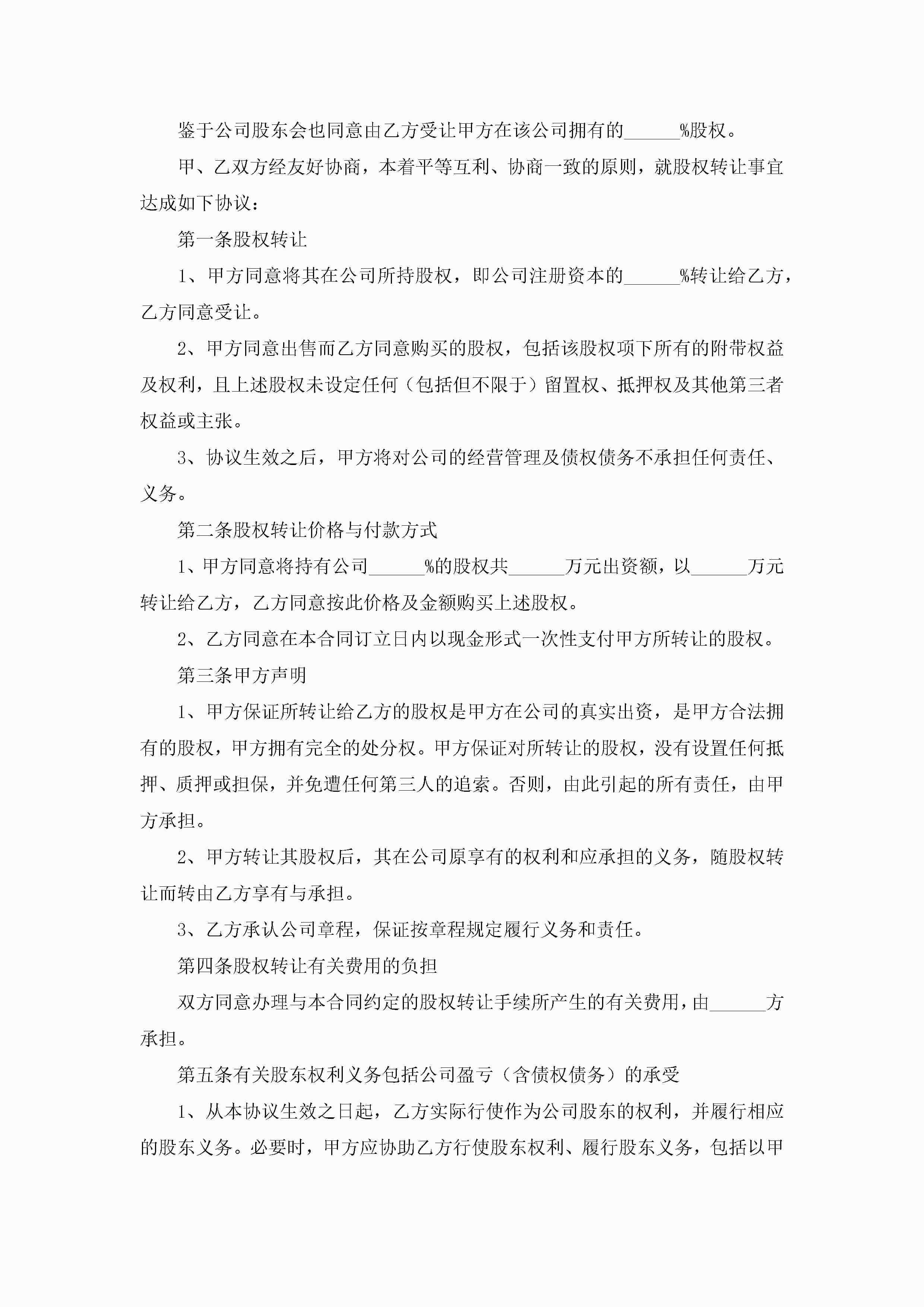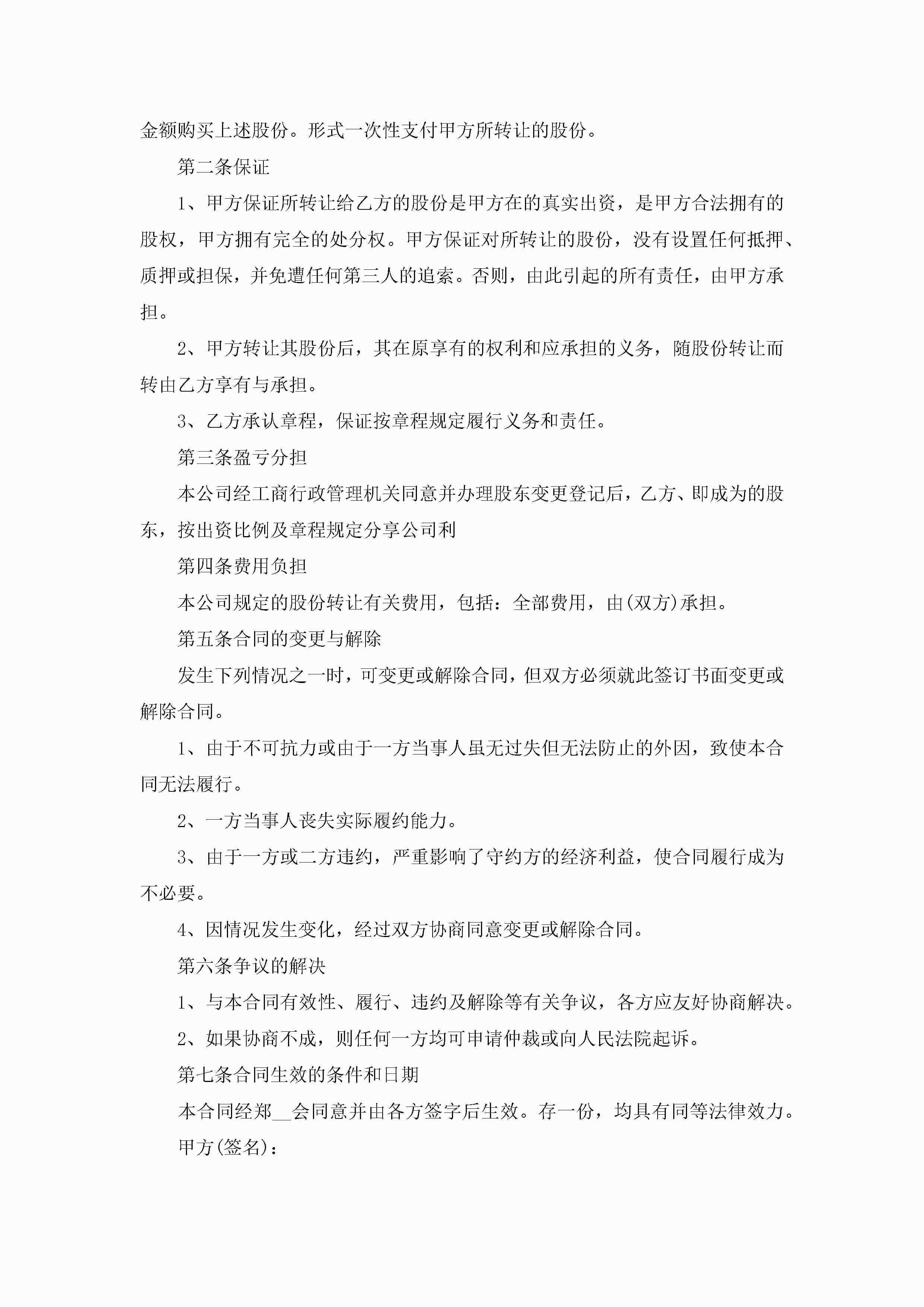 股份转让协议书范文最新(精选10篇)jugei3月22日 12:41更新关注191 股份转让协议书范文最新(精选10篇)此内容为付费资源,请付费后查看¥10.9 单篇文档限时特惠¥15个人会员开通企业会员开通立即下载无需登陆!可直接快捷下载单个模板付费资源© 版权声明THE ENDWord模板# 实用文档# 实用模板# 信函模板# 协议书 如有问题,可点击最底部“联系我们”联系客服 分享QQ空间微博QQ好友海报分享复制链接收藏