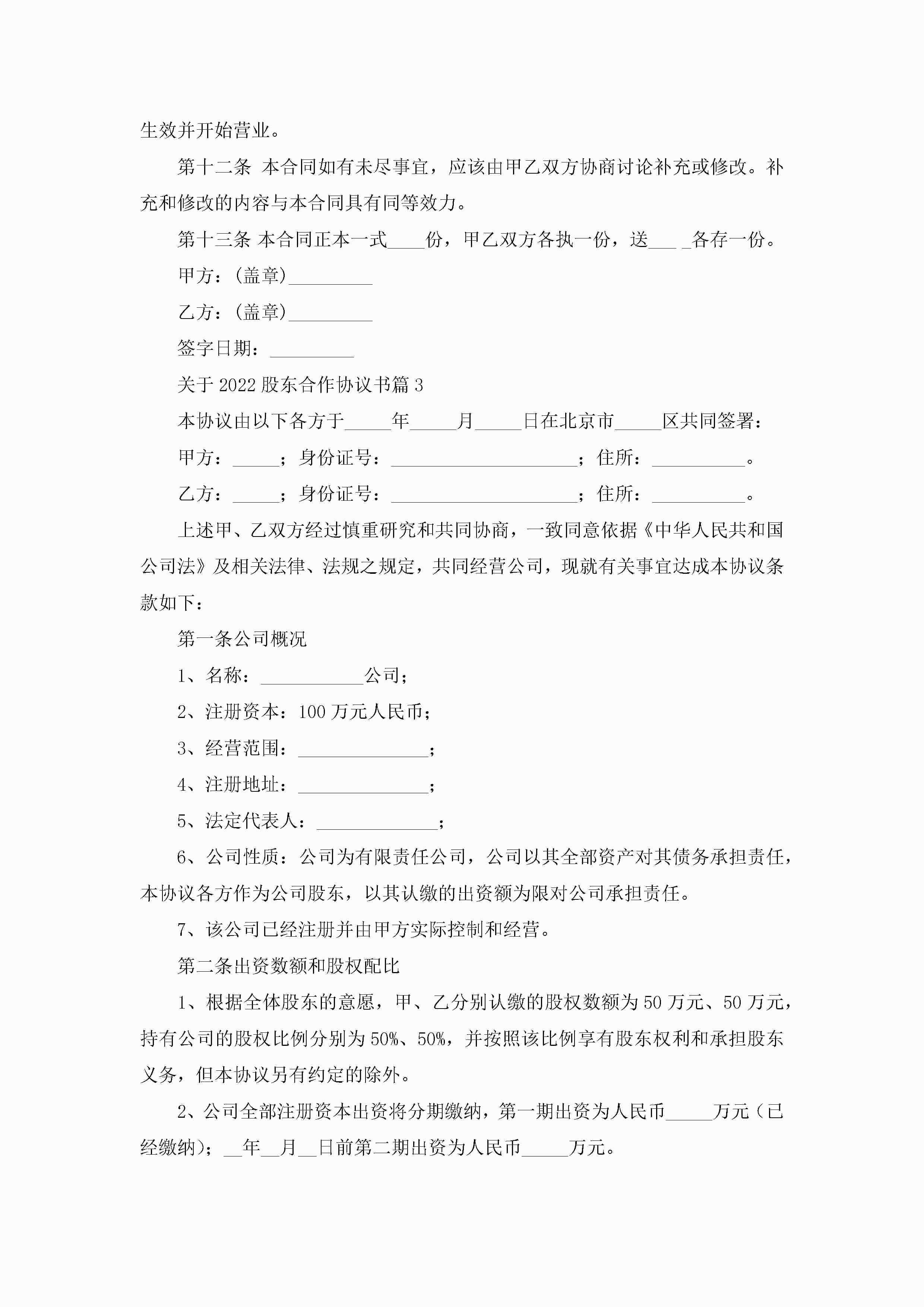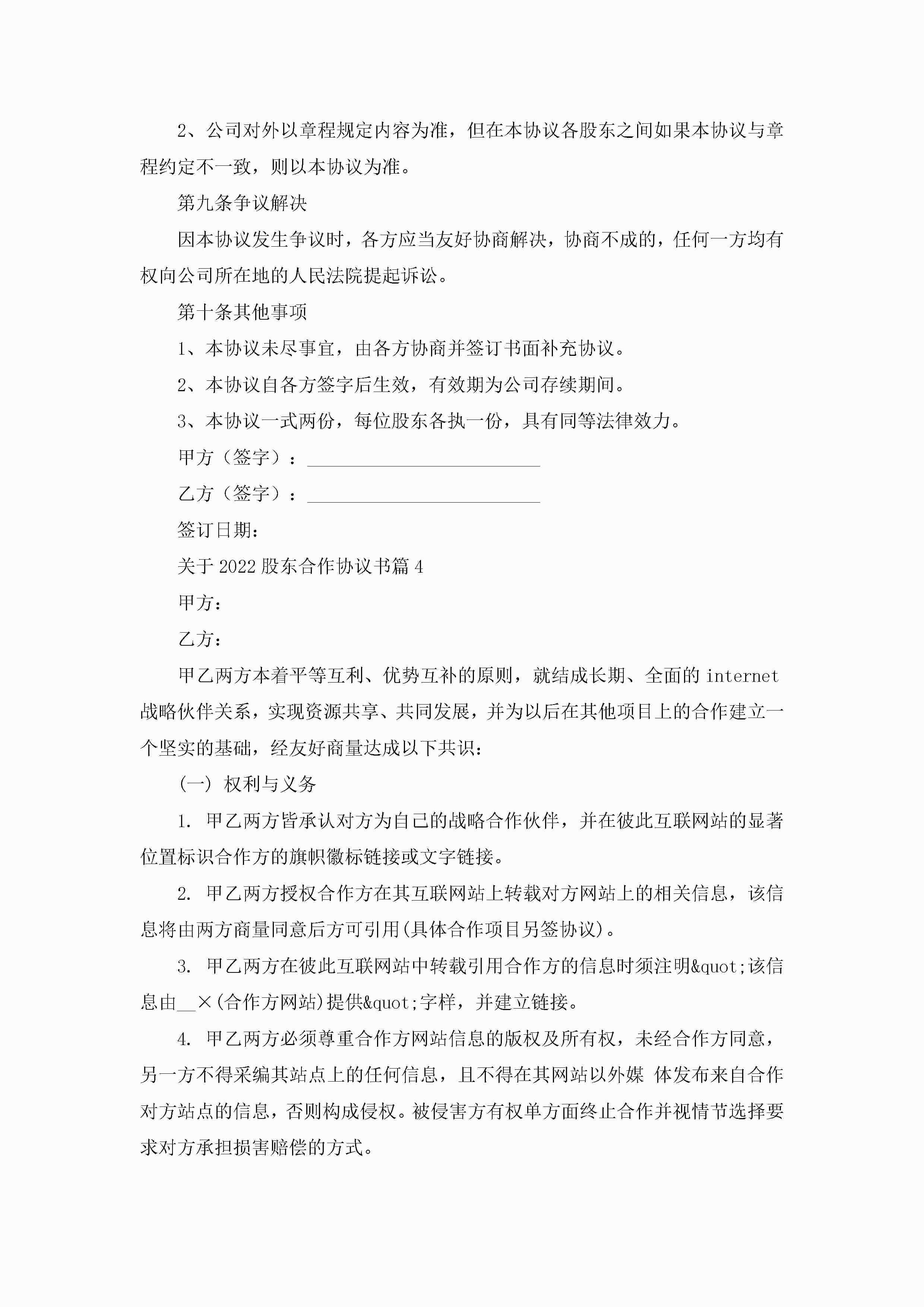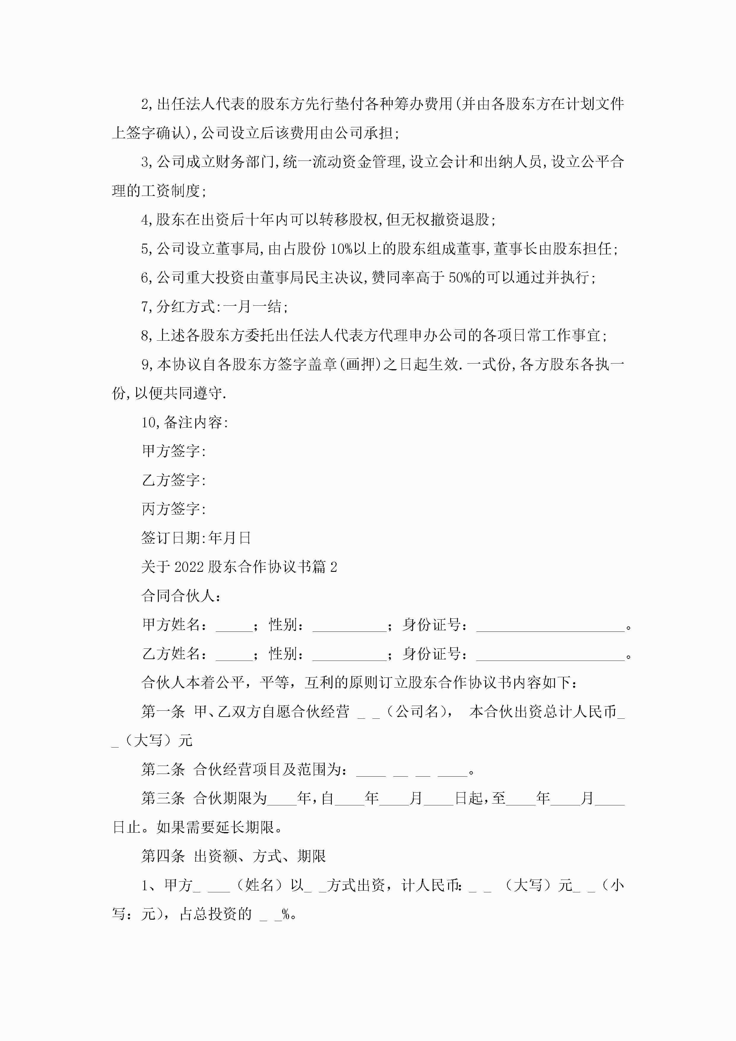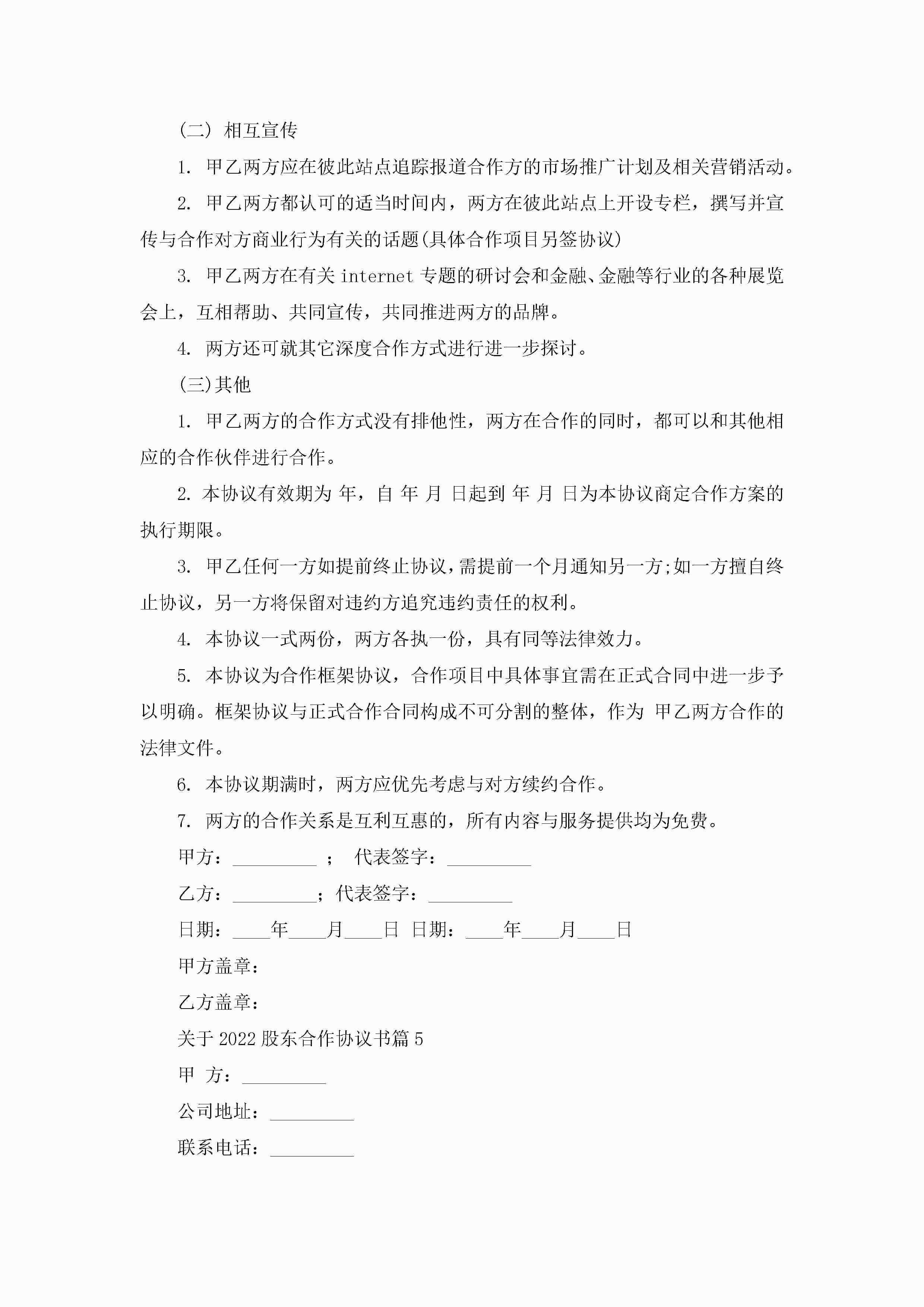 关于2022股东合作协议书(精选7篇)jugei3月22日 12:41更新关注288 关于2022股东合作协议书(精选7篇)此内容为付费资源,请付费后查看¥10.9 单篇文档限时特惠¥15个人会员开通企业会员开通立即下载无需登陆!可直接快捷下载单个模板付费资源© 版权声明THE ENDWord模板# 实用文档# 实用模板# 信函模板# 协议书 如有问题,可点击最底部“联系我们”联系客服 分享QQ空间微博QQ好友海报分享复制链接收藏