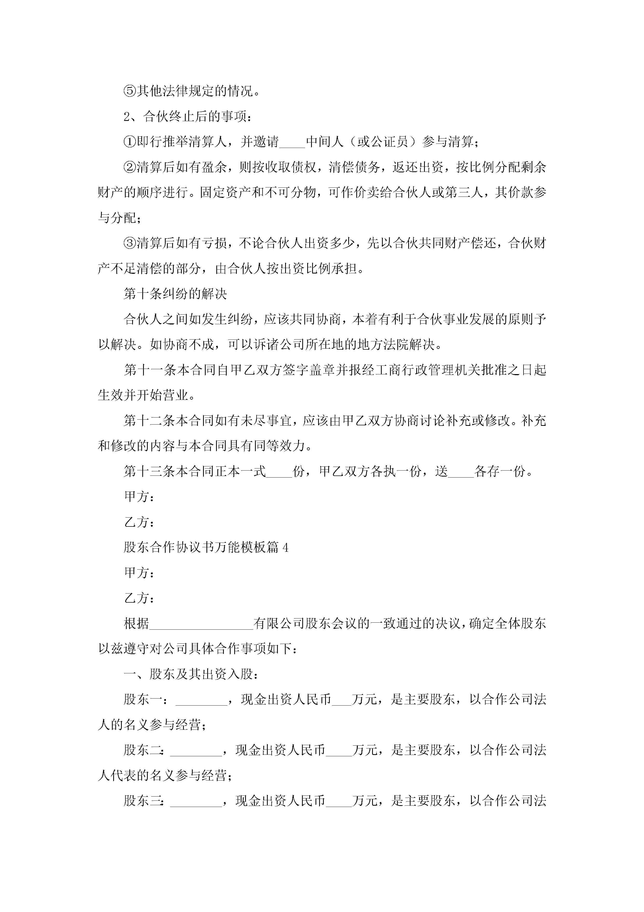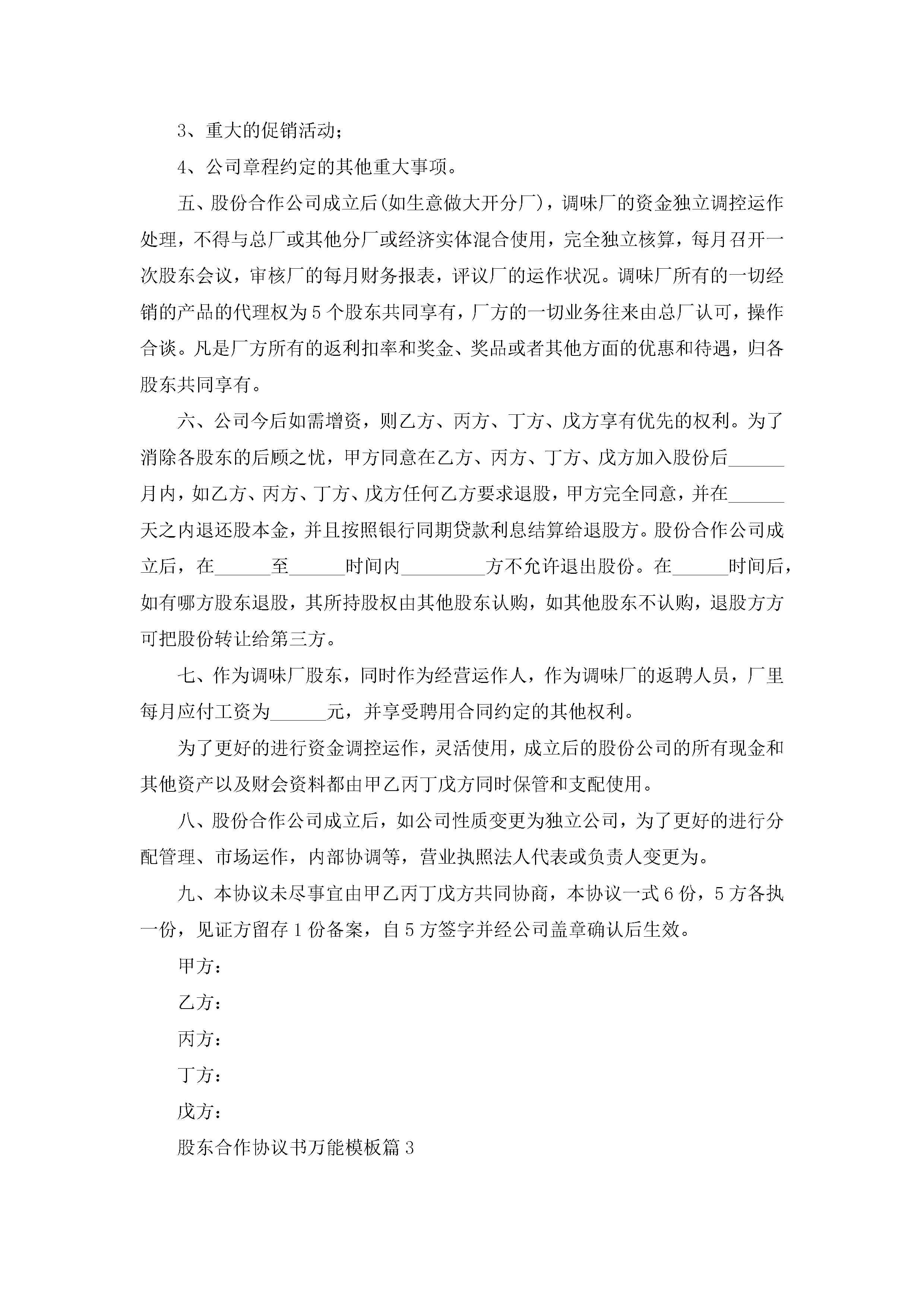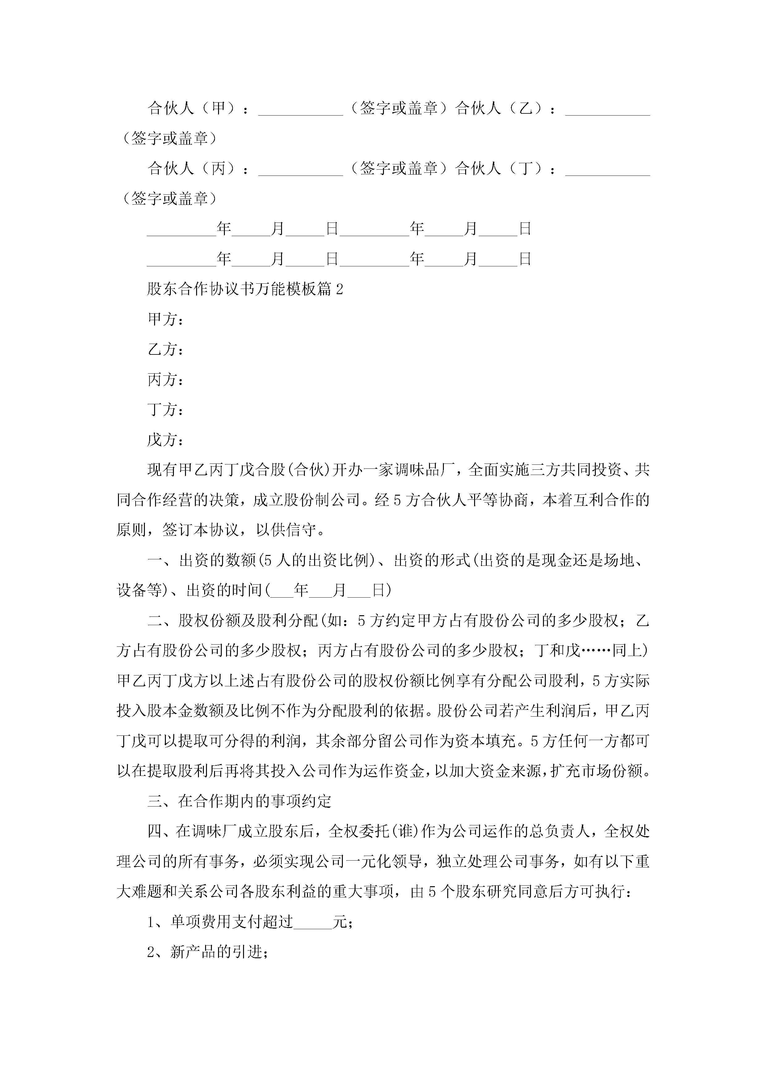 股东合作协议书万能模板7篇(精选)jugei3月22日 12:41更新关注189 股东合作协议书万能模板7篇(精选)此内容为付费资源,请付费后查看¥10.9 单篇文档限时特惠¥15个人会员开通企业会员开通立即下载无需登陆!可直接快捷下载单个模板付费资源© 版权声明THE ENDWord模板# 实用文档# 实用模板# 信函模板# 协议书 如有问题,可点击最底部“联系我们”联系客服 分享QQ空间微博QQ好友海报分享复制链接收藏