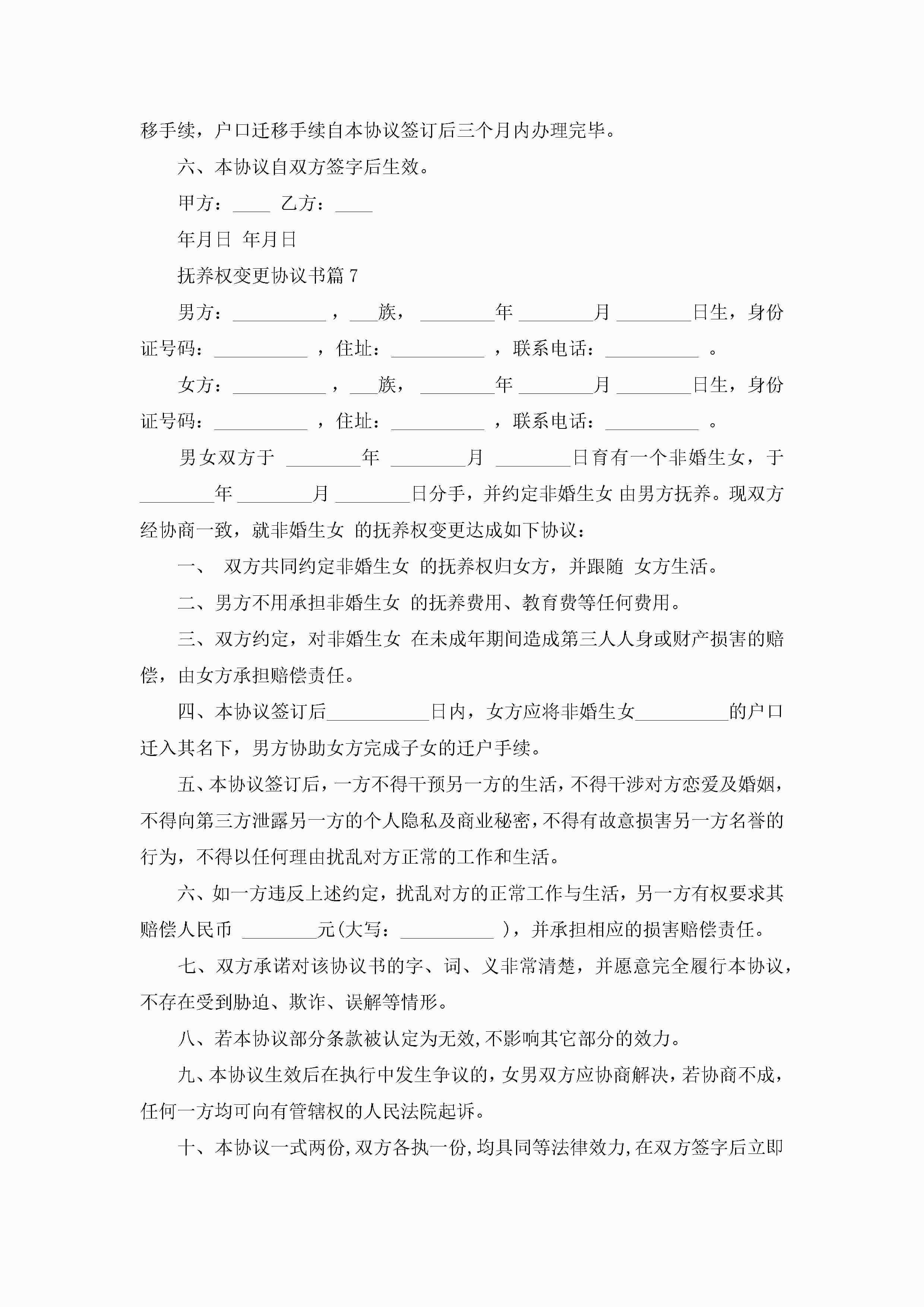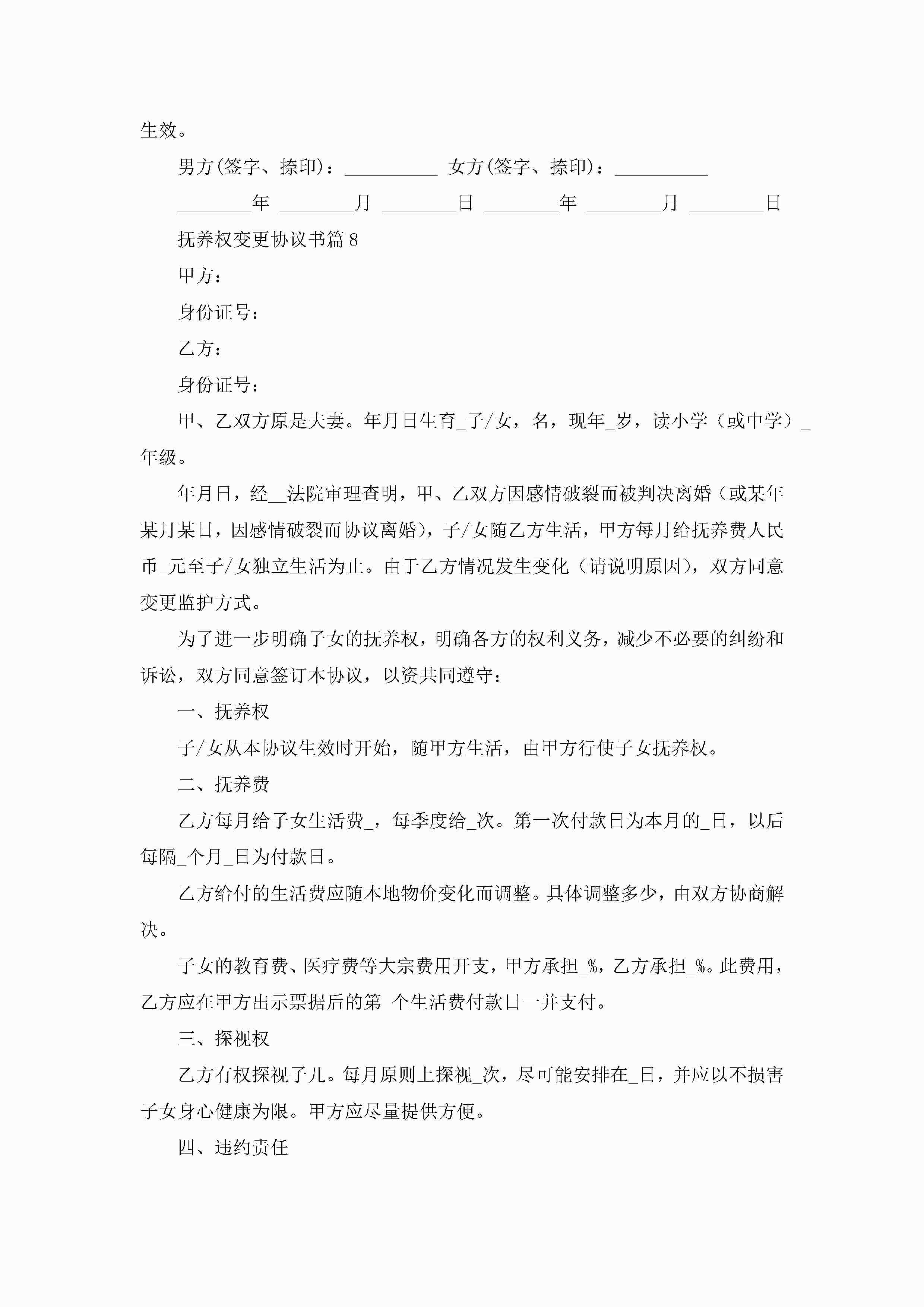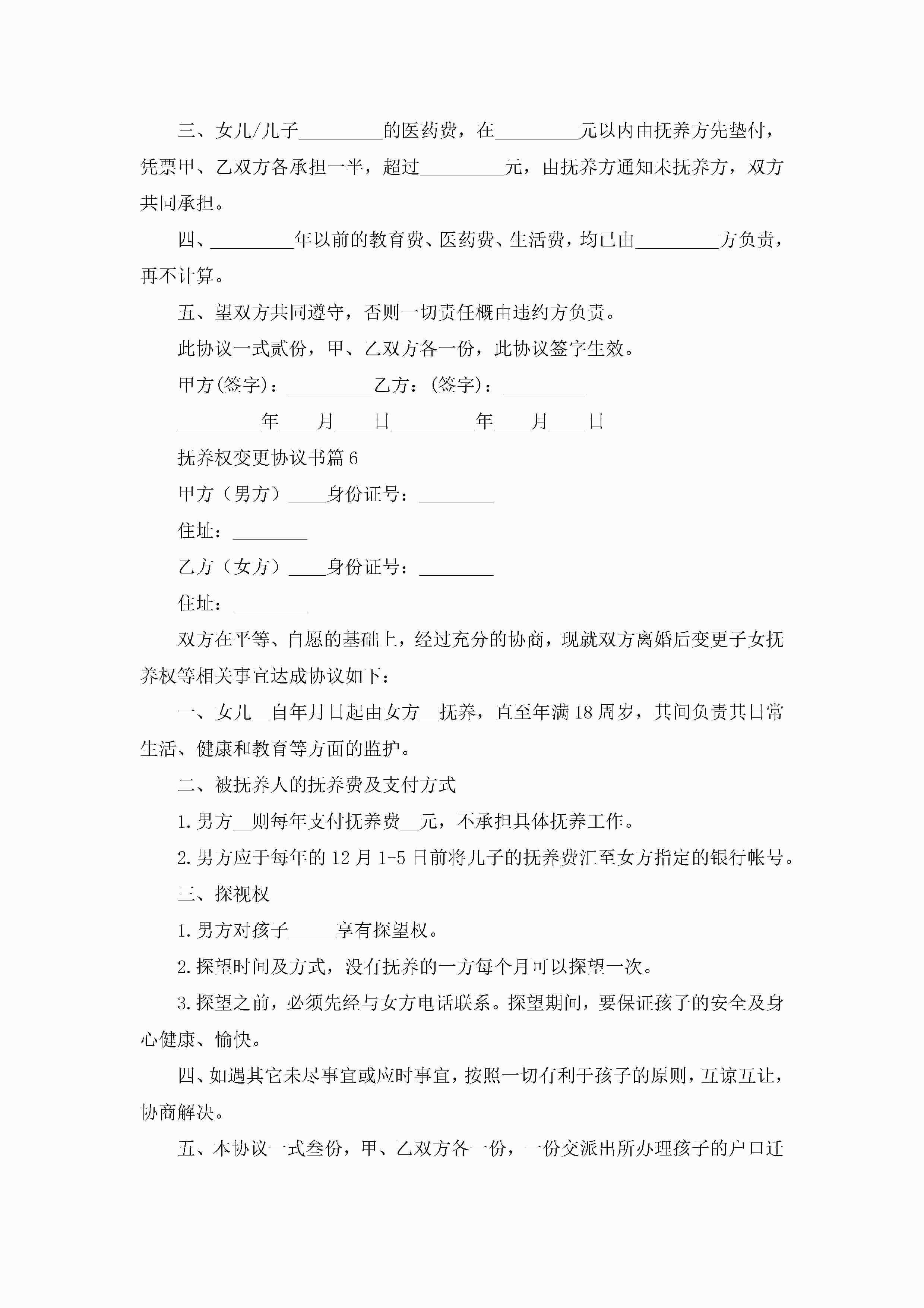 抚养权变更协议书范文(标准8篇)jugei3月22日 12:41更新关注192 抚养权变更协议书范文(标准8篇)此内容为付费资源,请付费后查看¥10.9 单篇文档限时特惠¥15个人会员开通企业会员开通立即下载无需登陆!可直接快捷下载单个模板付费资源© 版权声明THE ENDWord模板# 实用文档# 信函模板# 协议书# 抚养权变更协议书(标准8篇) 如有问题,可点击最底部“联系我们”联系客服 分享QQ空间微博QQ好友海报分享复制链接收藏