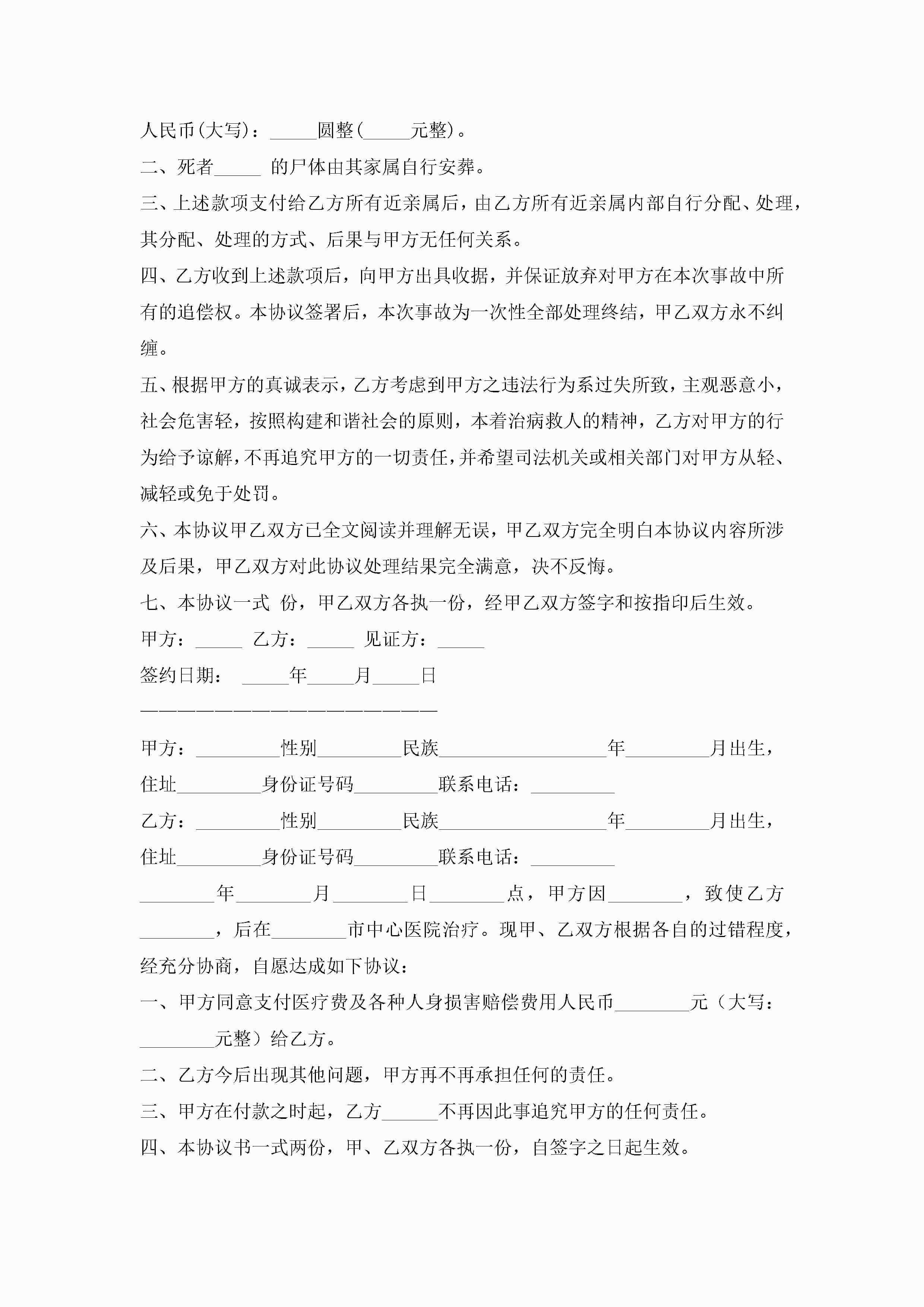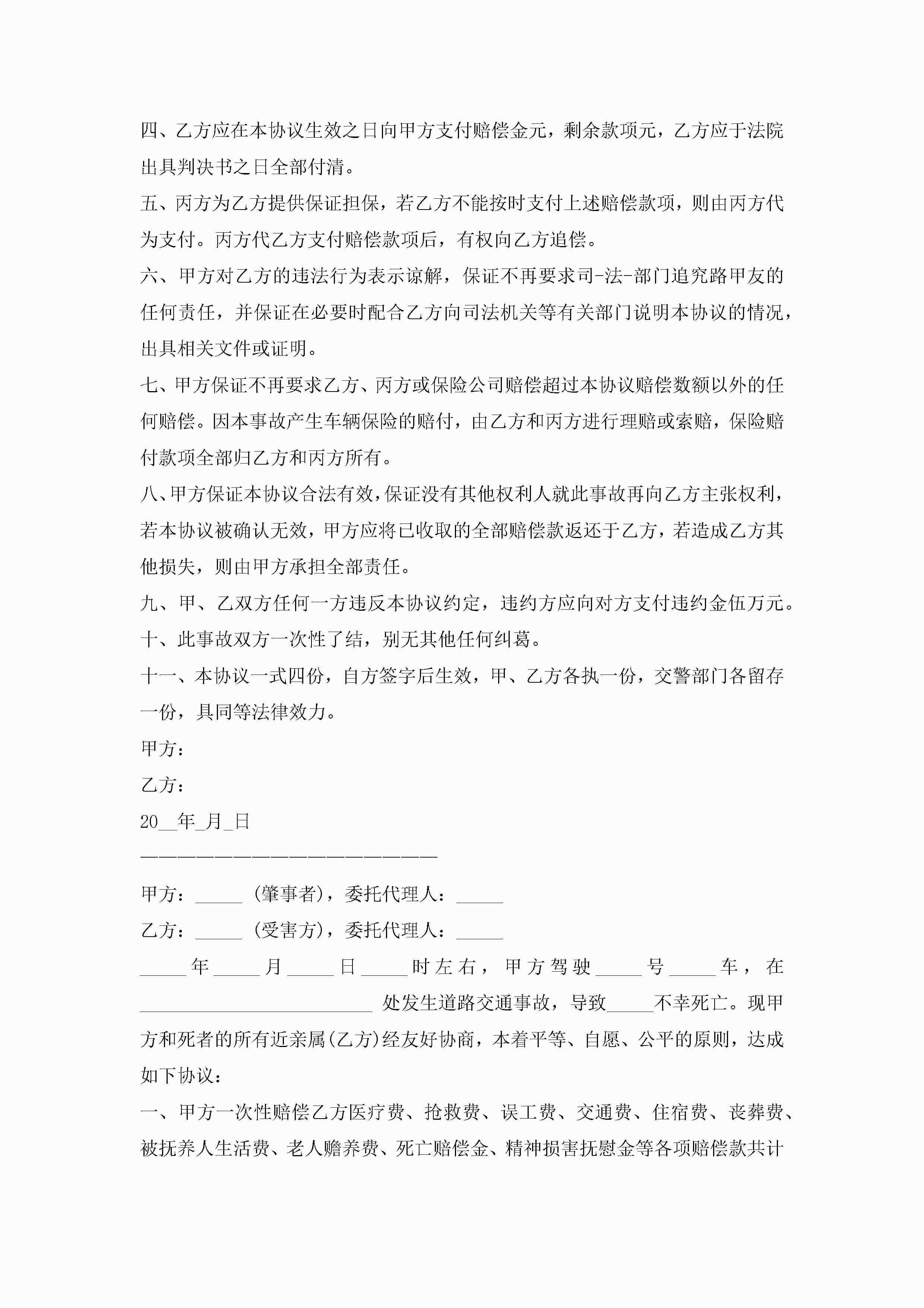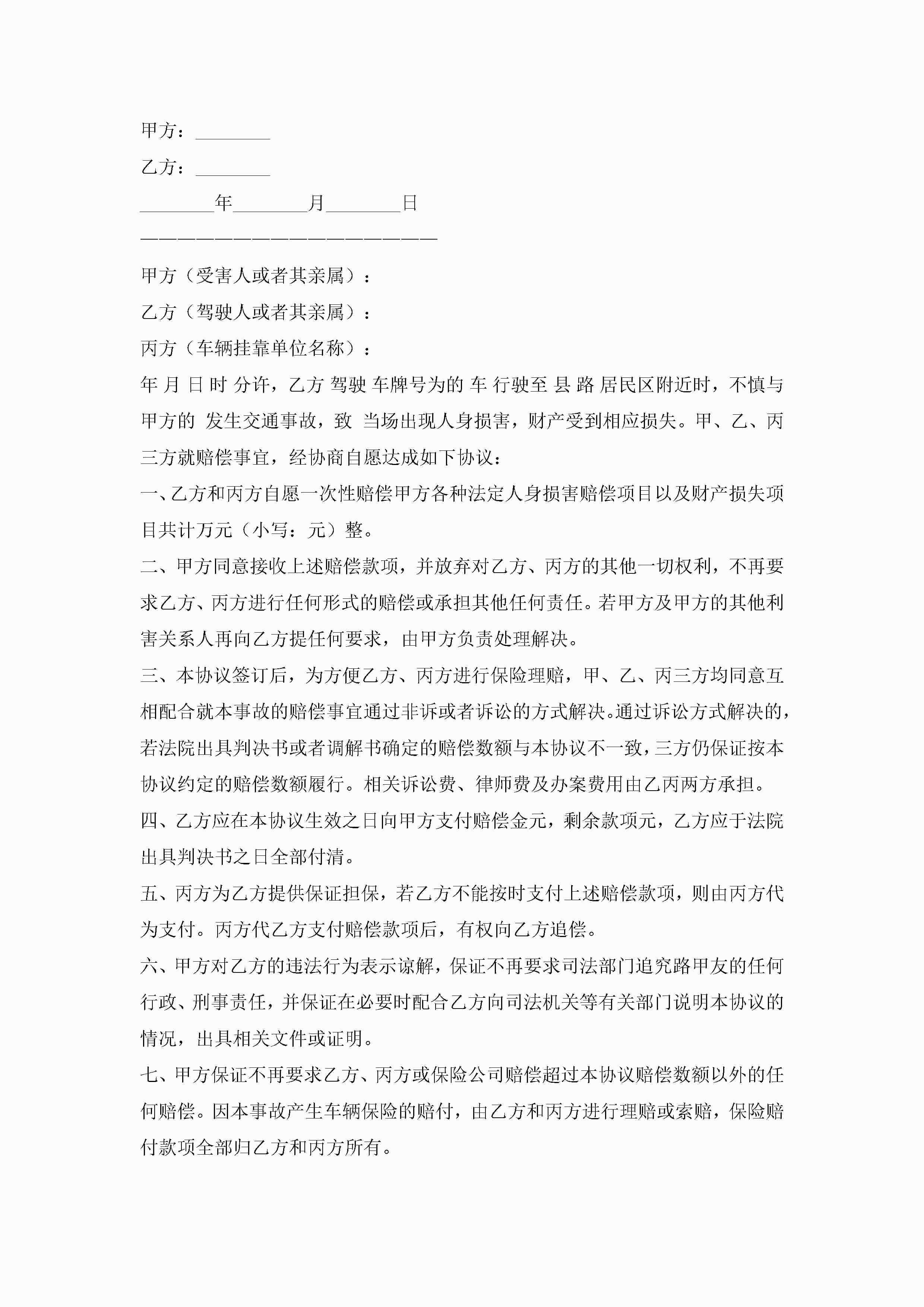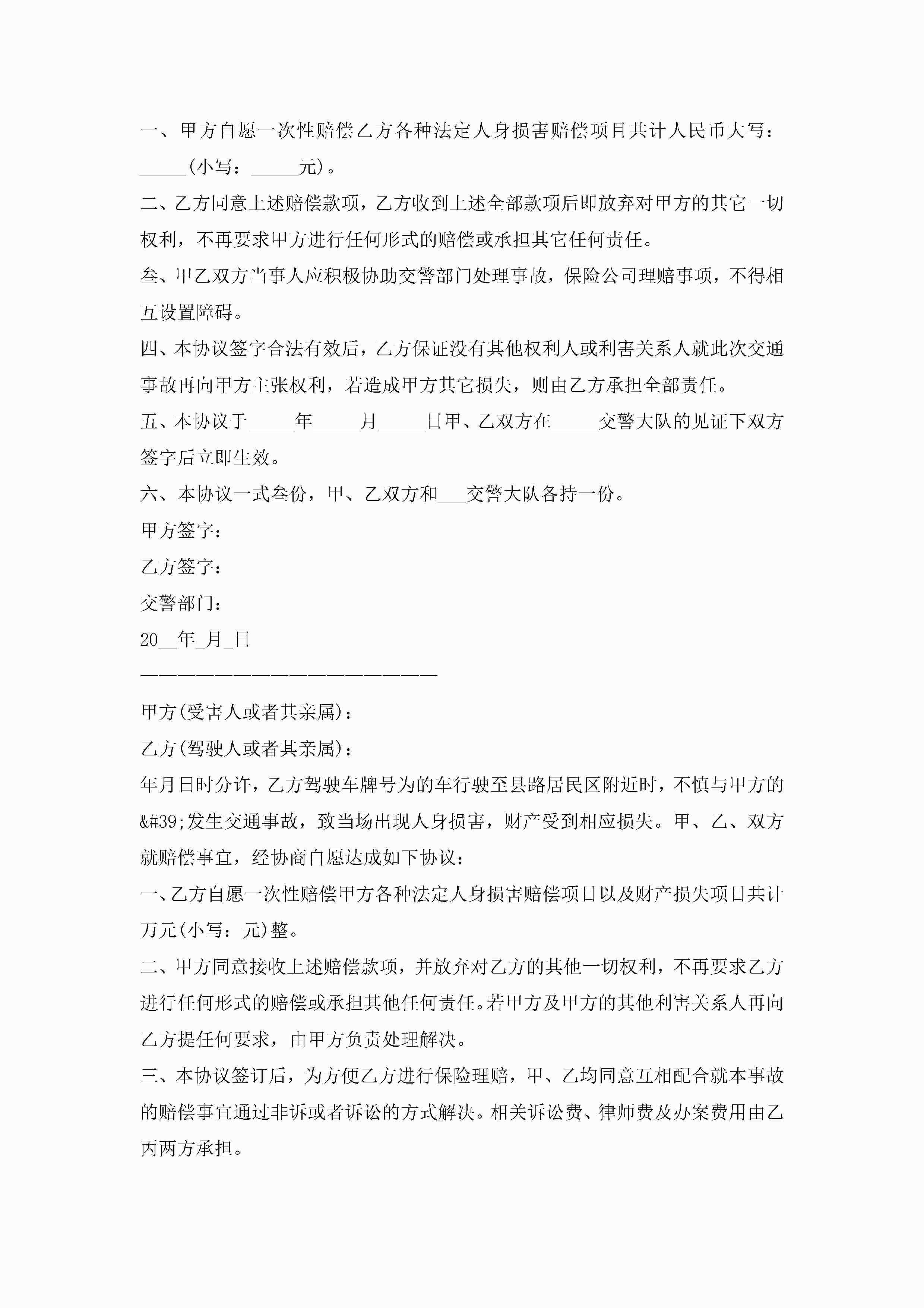 交通事故赔偿协议书(7篇)jugei3月22日 12:41更新关注189 交通事故赔偿协议书(7篇)此内容为付费资源,请付费后查看¥10.9 单篇文档限时特惠¥15个人会员开通企业会员开通立即下载无需登陆!可直接快捷下载单个模板付费资源© 版权声明THE ENDWord模板# 实用文档# 实用模板# 信函模板# 协议书 如有问题,可点击最底部“联系我们”联系客服 分享QQ空间微博QQ好友海报分享复制链接收藏
