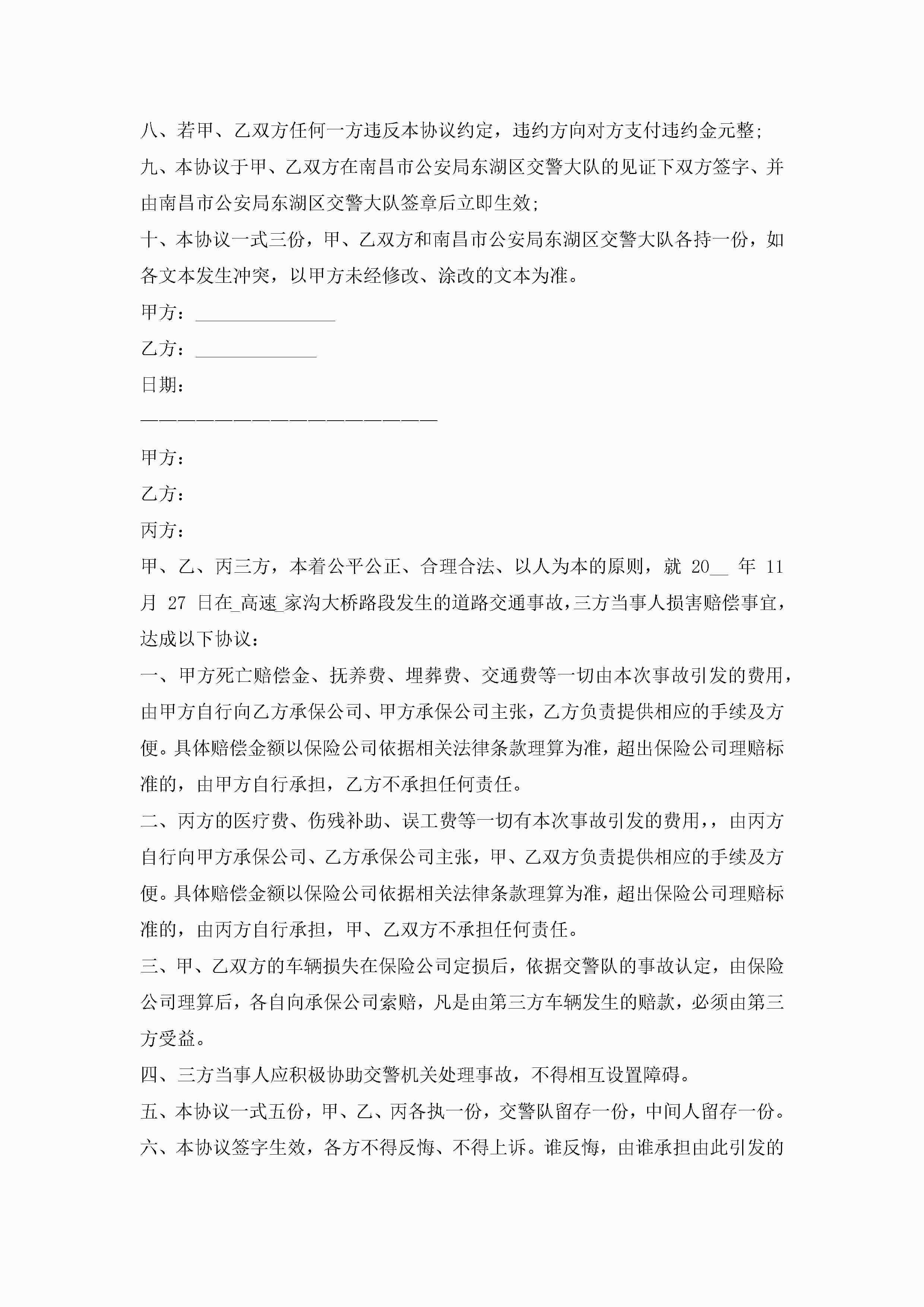 事故赔偿协议范本(7篇)jugei3月22日 12:41更新关注233 事故赔偿协议范本(7篇)此内容为付费资源,请付费后查看¥10.9 单篇文档限时特惠¥15个人会员开通企业会员开通立即下载无需登陆!可直接快捷下载单个模板付费资源© 版权声明THE ENDWord模板# 实用文档# 实用模板# 信函模板# 协议书 如有问题,可点击最底部“联系我们”联系客服 分享QQ空间微博QQ好友海报分享复制链接收藏