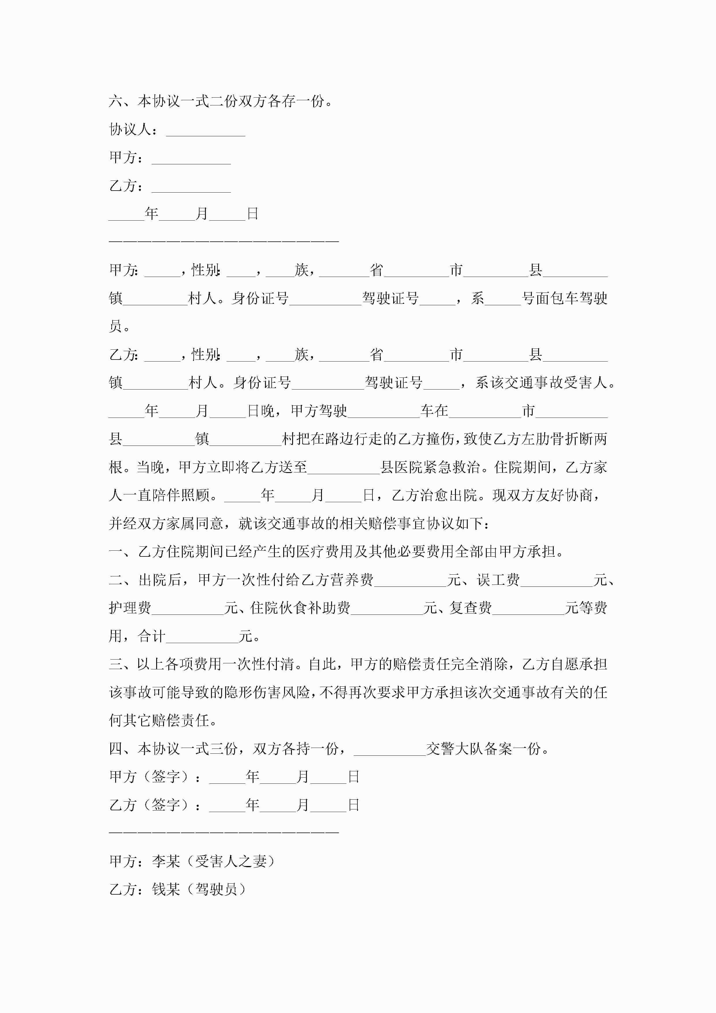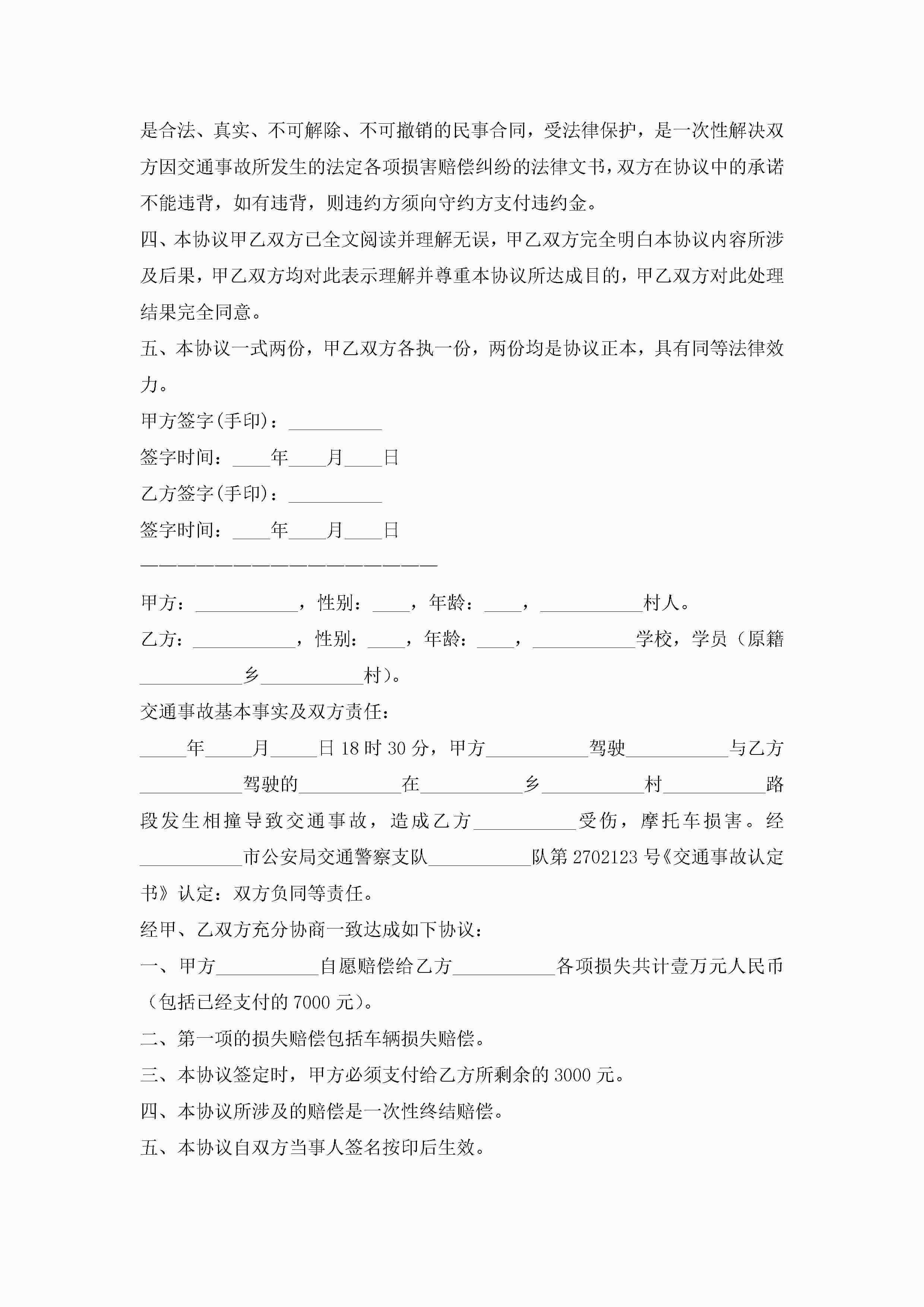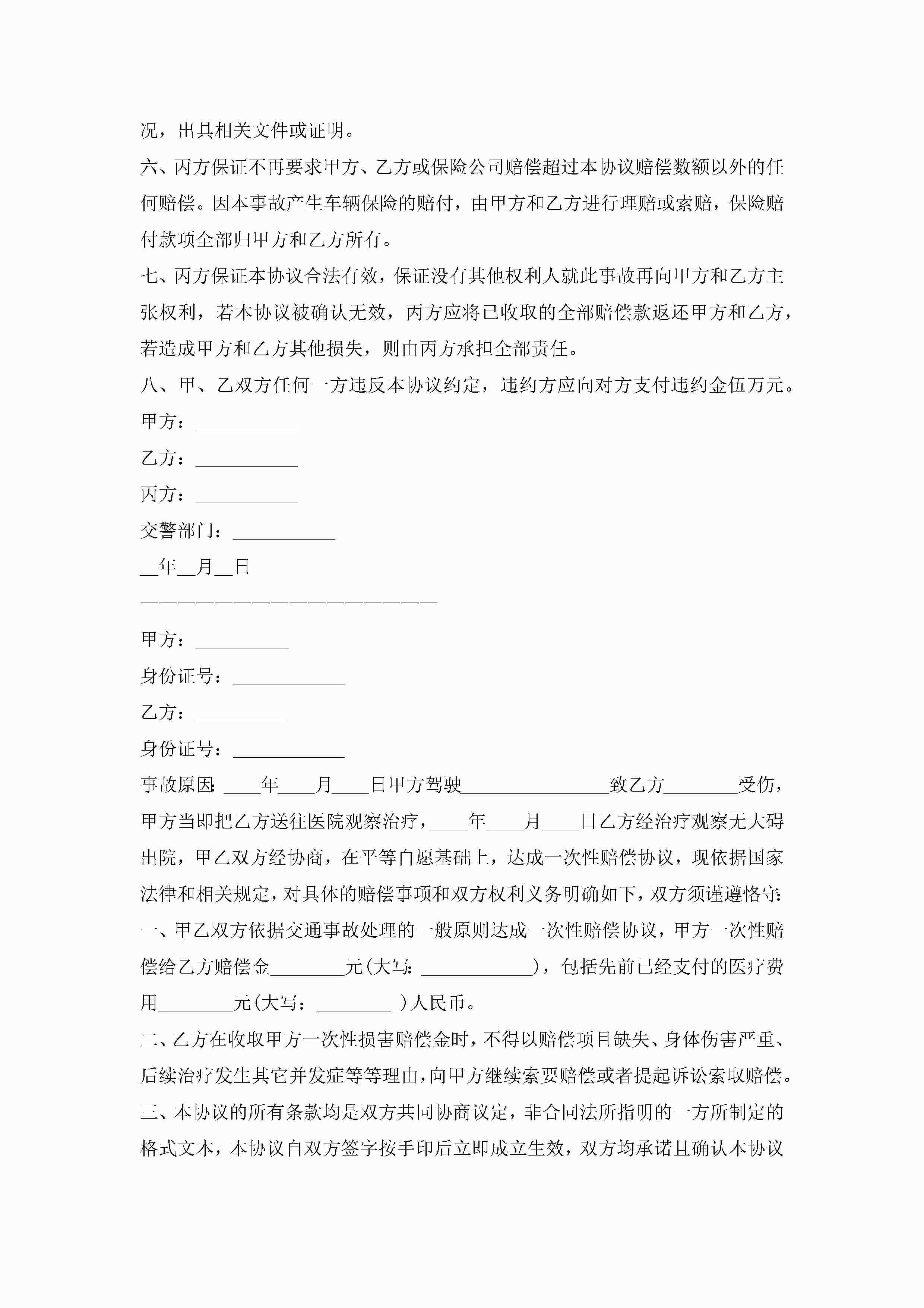 交通意外事故赔偿协议书(7篇)jugei3月22日 12:41更新关注191 交通意外事故赔偿协议书(7篇)此内容为付费资源,请付费后查看¥10.9 单篇文档限时特惠¥15个人会员开通企业会员开通立即下载无需登陆!可直接快捷下载单个模板付费资源© 版权声明THE ENDWord模板# 实用文档# 实用模板# 信函模板# 协议书 如有问题,可点击最底部“联系我们”联系客服 分享QQ空间微博QQ好友海报分享复制链接收藏