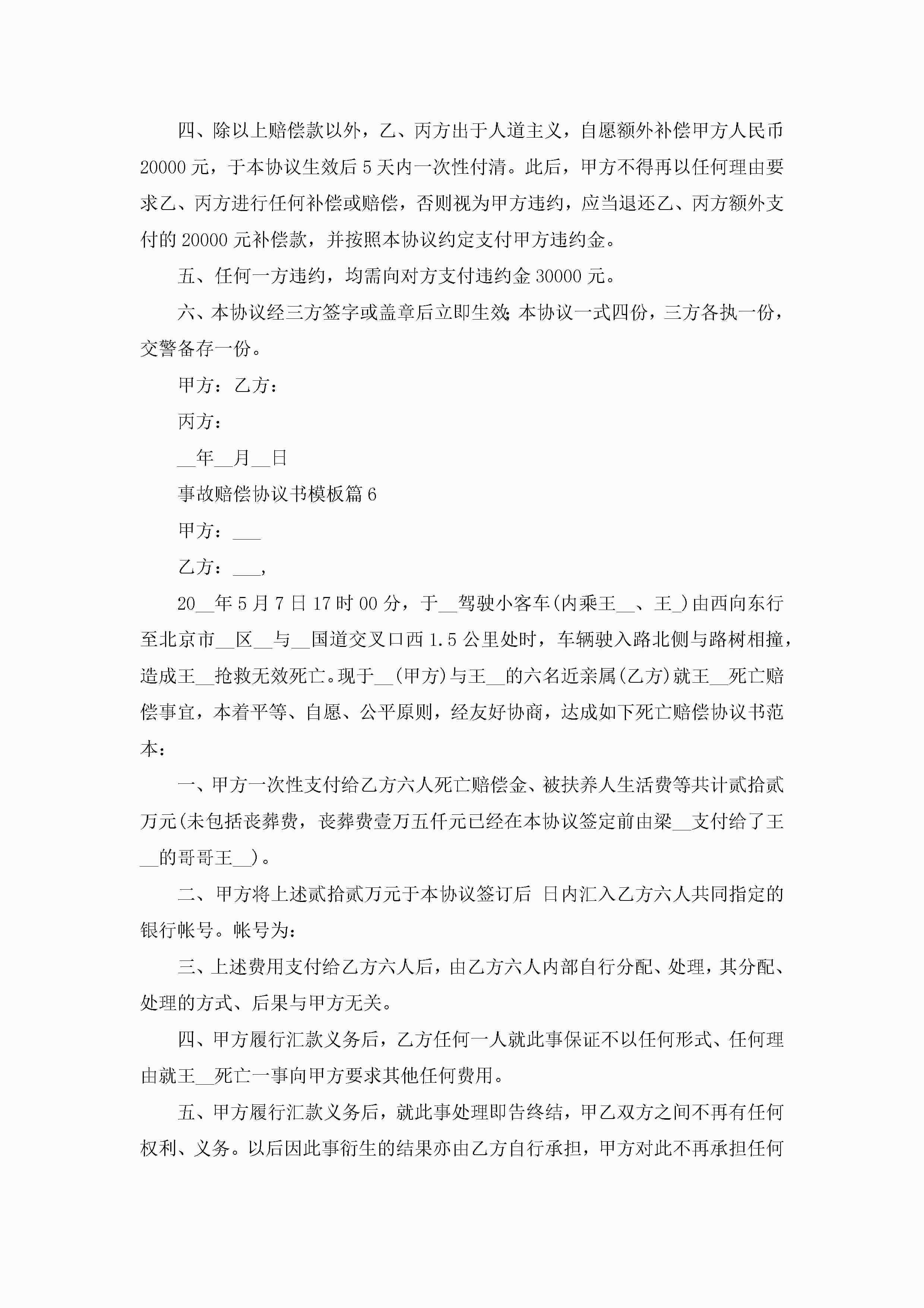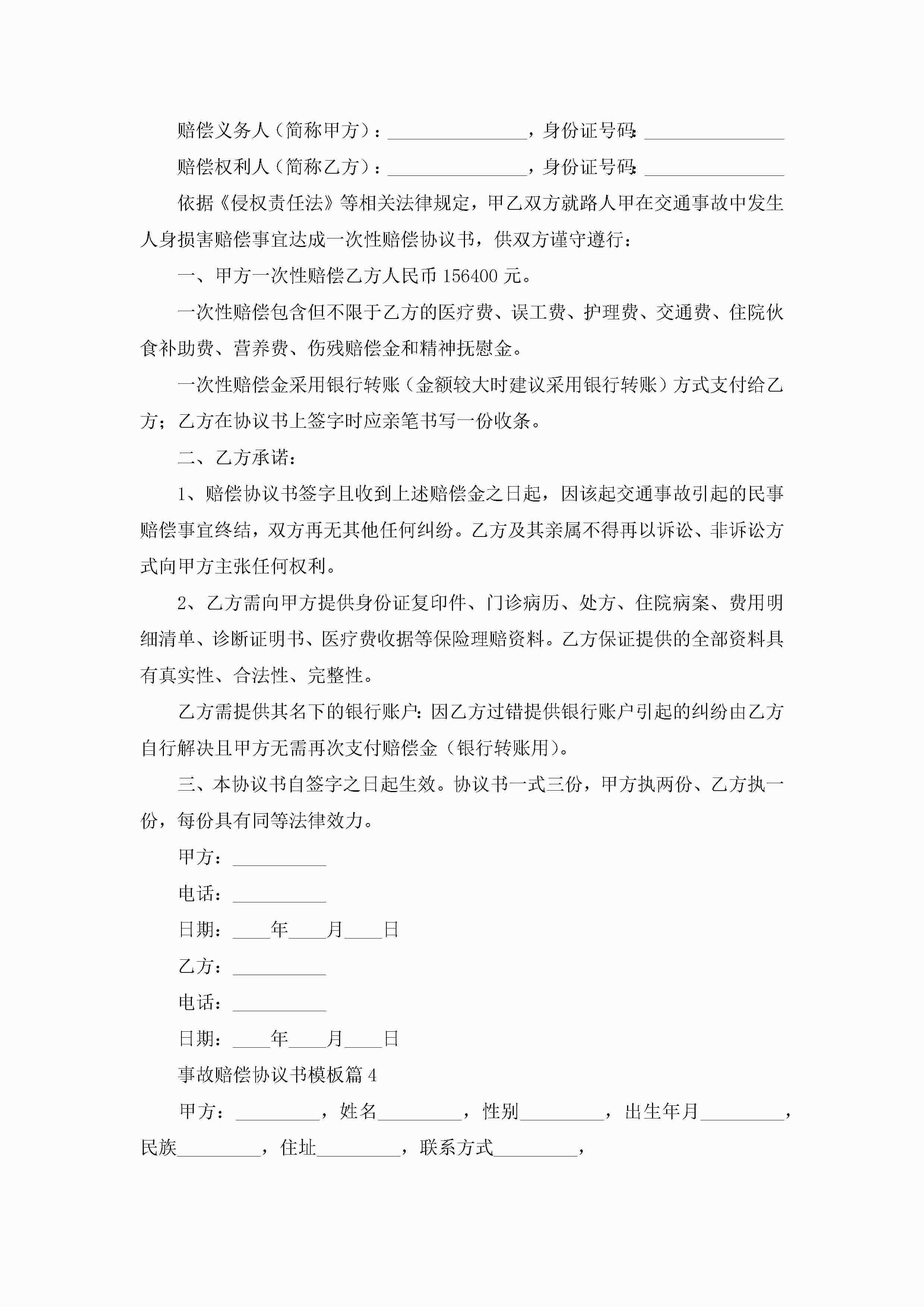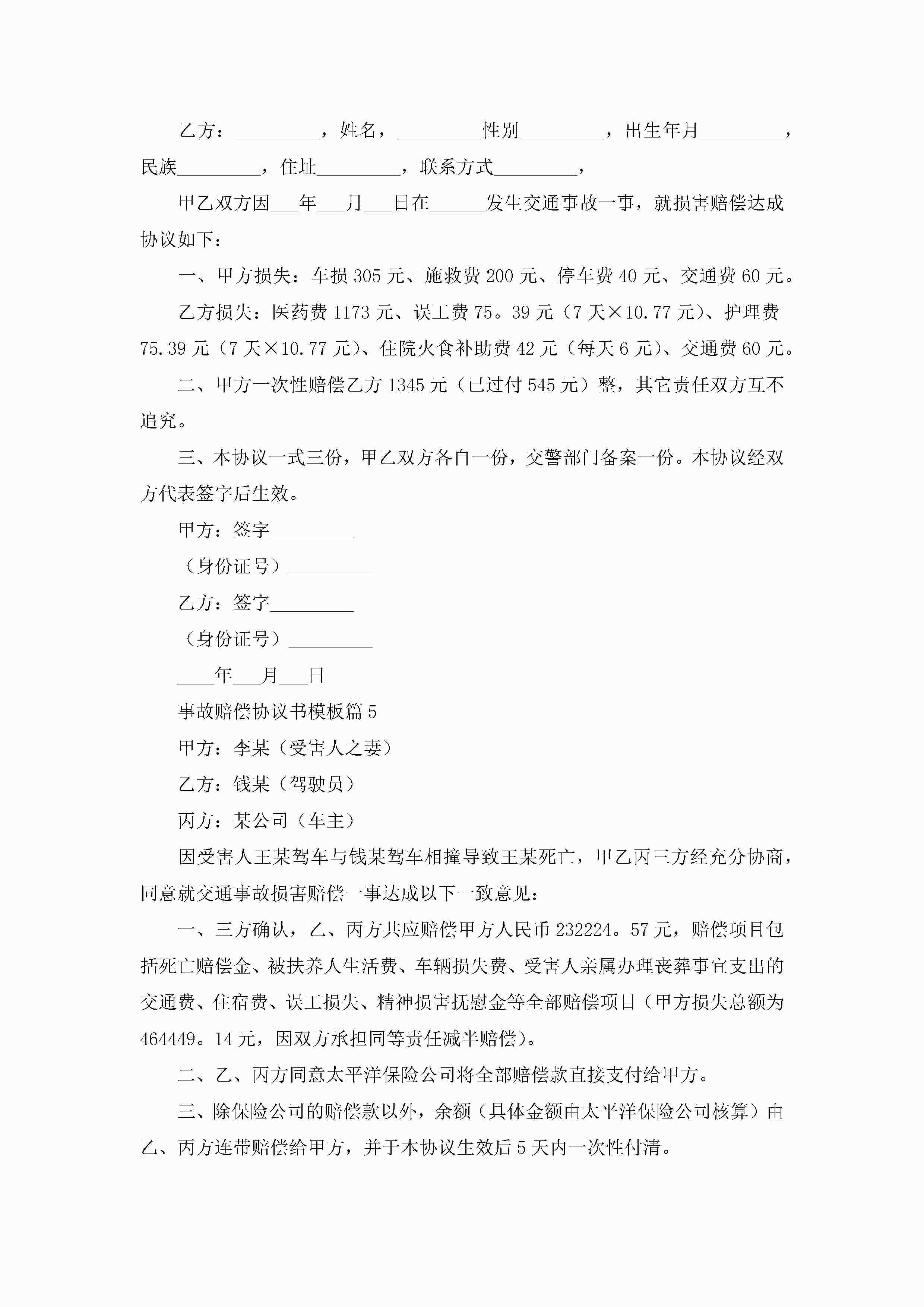事故赔偿协议书模板(7篇)jugei3月22日 12:41更新关注470 事故赔偿协议书模板(7篇)此内容为付费资源,请付费后查看¥10.9 单篇文档限时特惠¥15个人会员开通企业会员开通立即下载无需登陆!可直接快捷下载单个模板付费资源© 版权声明THE ENDWord模板# 实用文档# 实用模板# 信函模板# 协议书 如有问题,可点击最底部“联系我们”联系客服 分享QQ空间微博QQ好友海报分享复制链接收藏