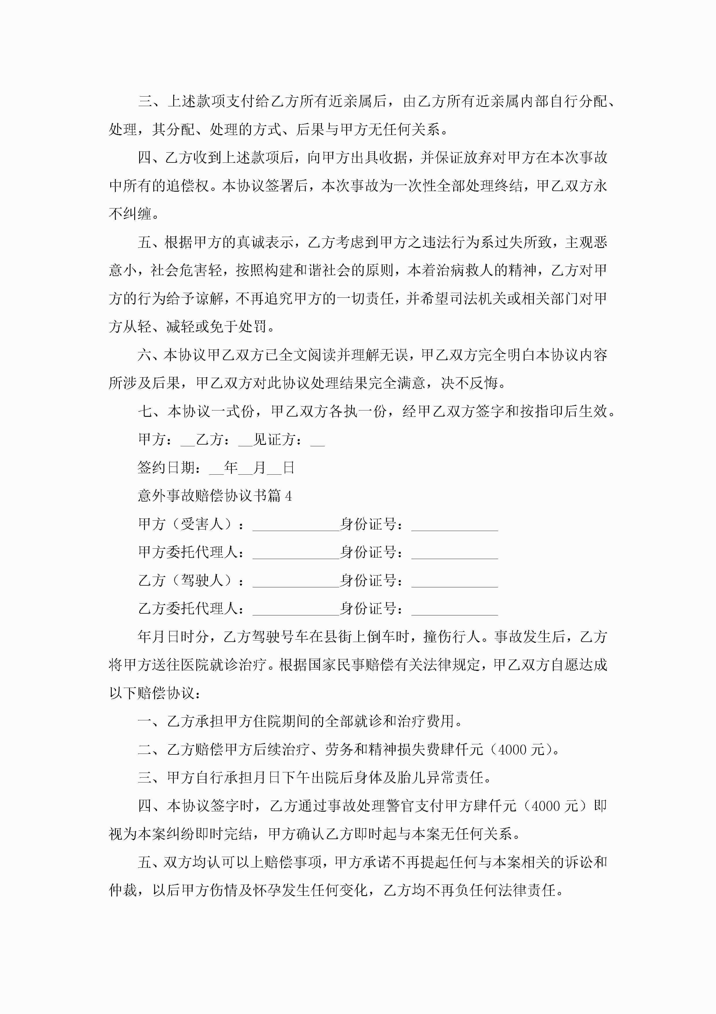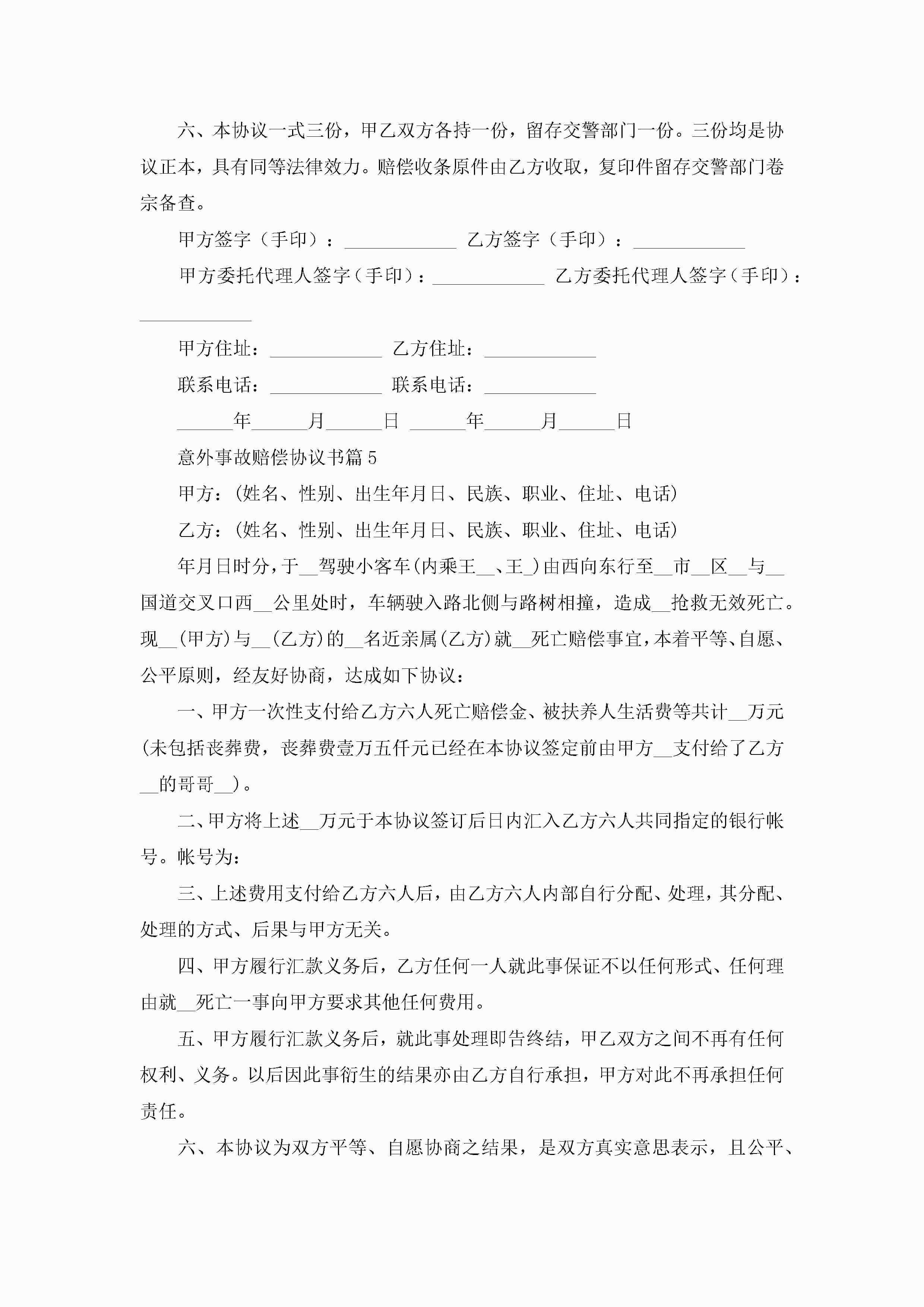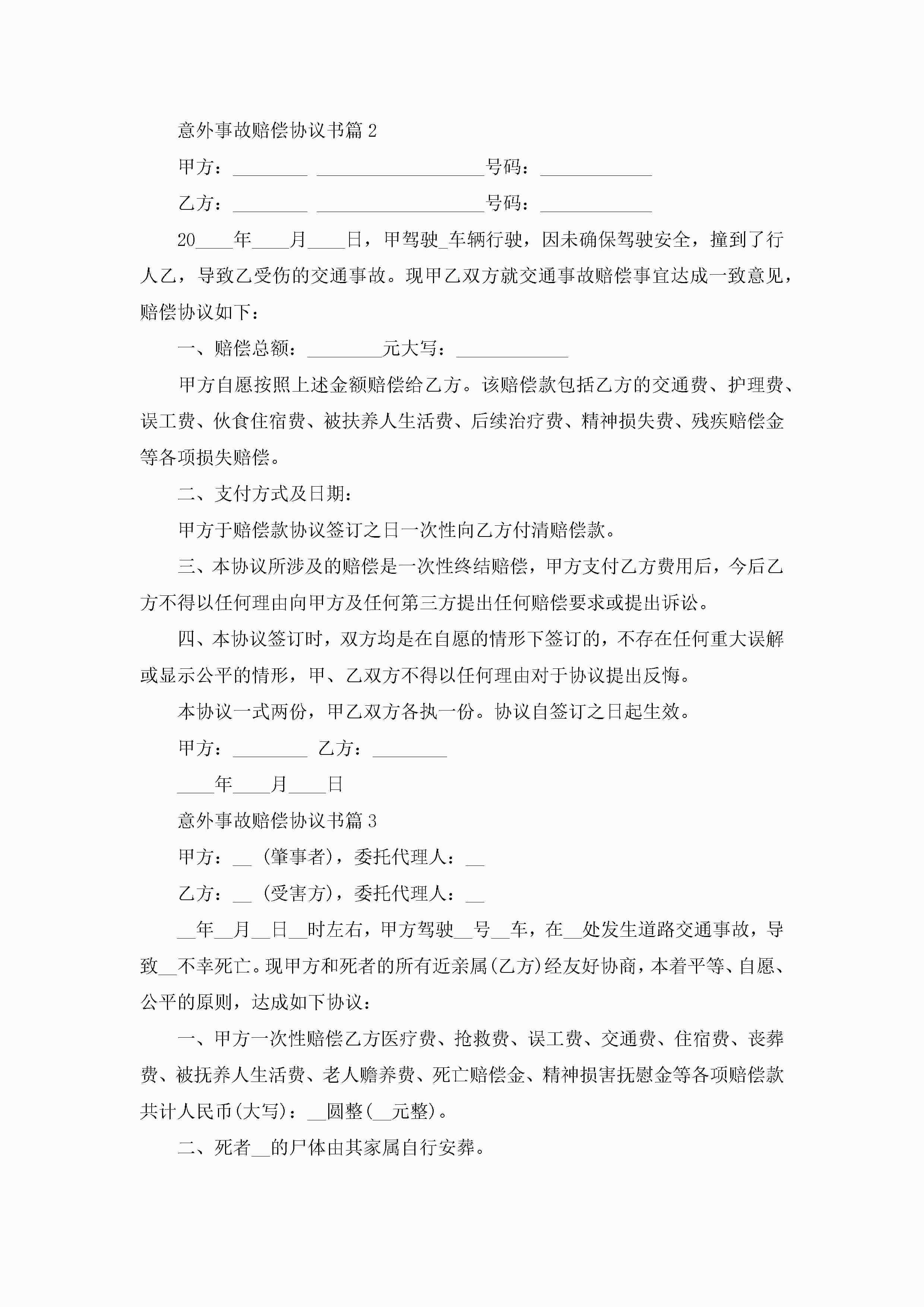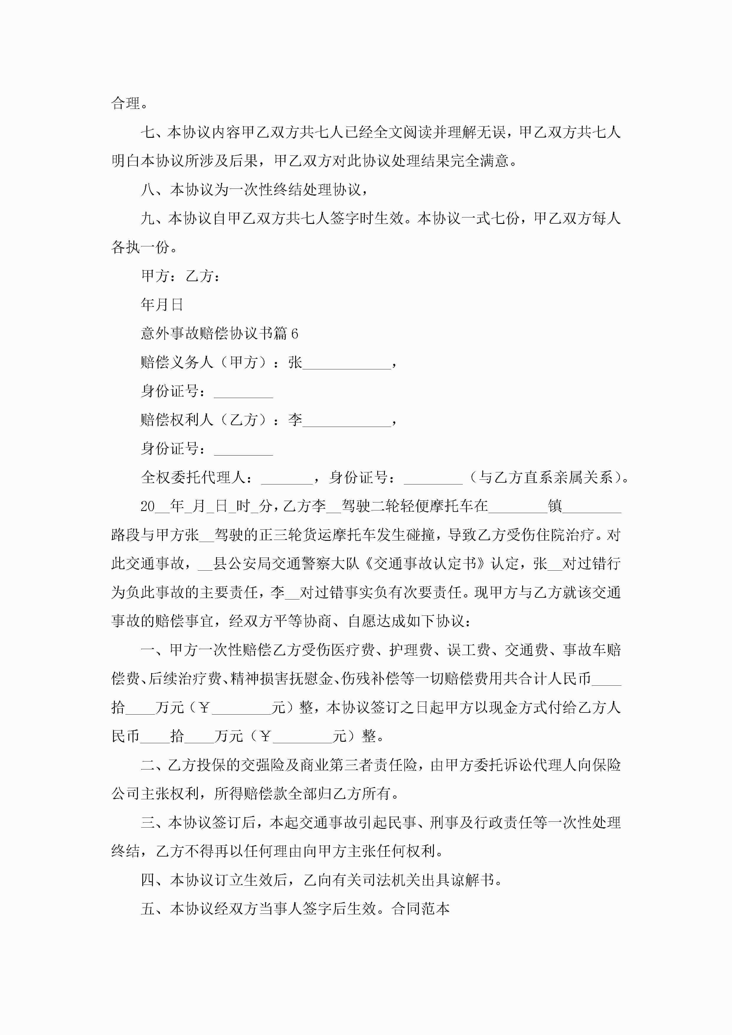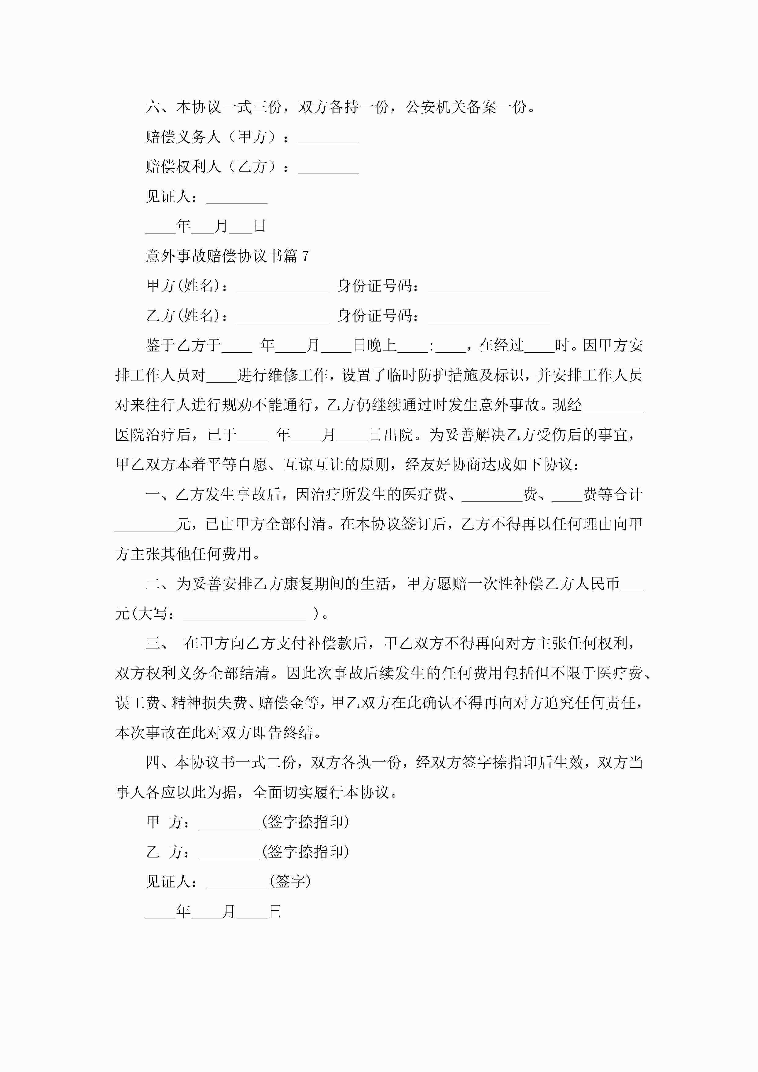 意外事故赔偿协议书(7篇)jugei3月22日 12:41更新关注211 意外事故赔偿协议书(7篇)此内容为付费资源,请付费后查看¥10.9 单篇文档限时特惠¥15个人会员开通企业会员开通立即下载无需登陆!可直接快捷下载单个模板付费资源© 版权声明THE ENDWord模板# 实用文档# 实用模板# 信函模板# 协议书 如有问题,可点击最底部“联系我们”联系客服 分享QQ空间微博QQ好友海报分享复制链接收藏