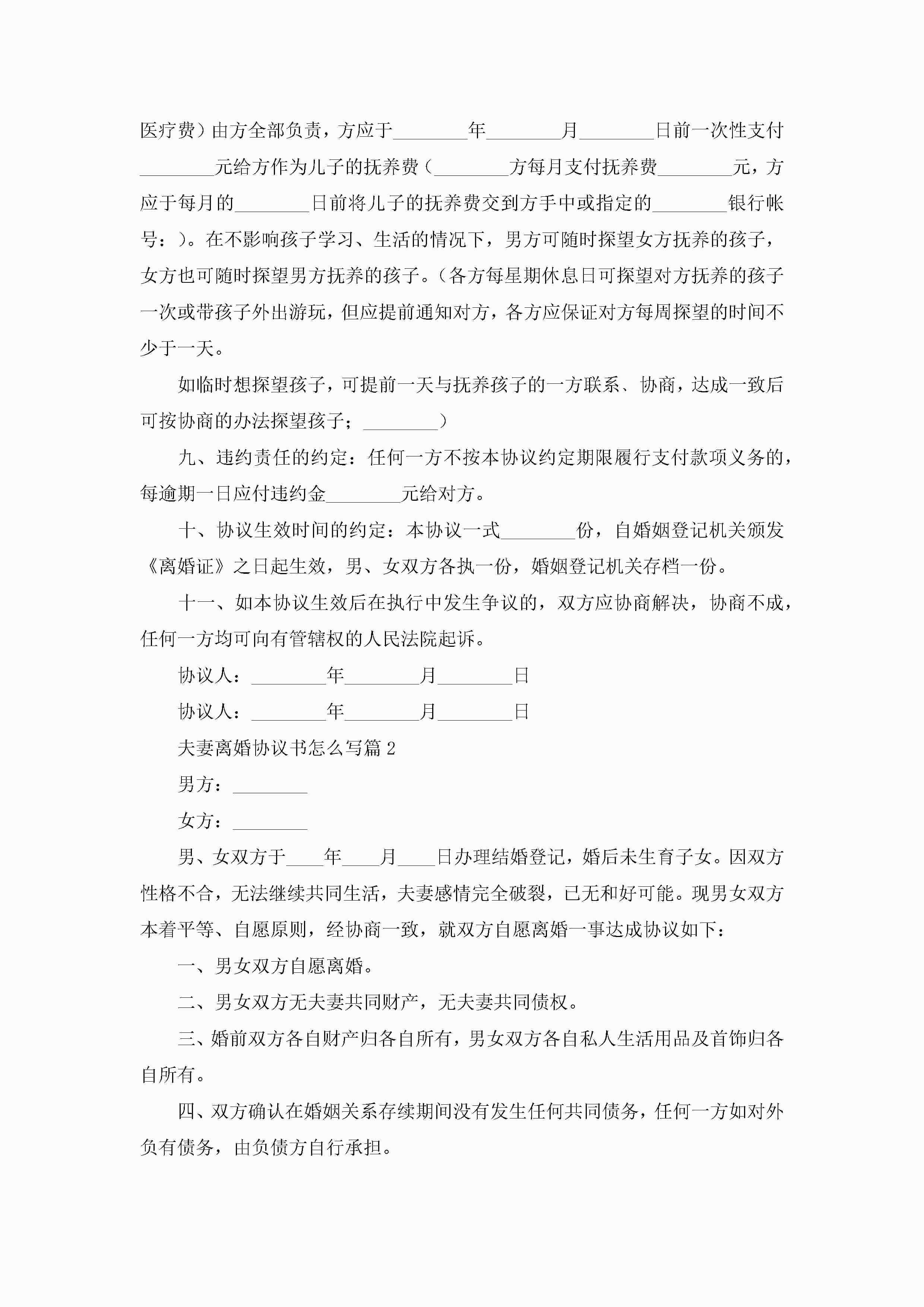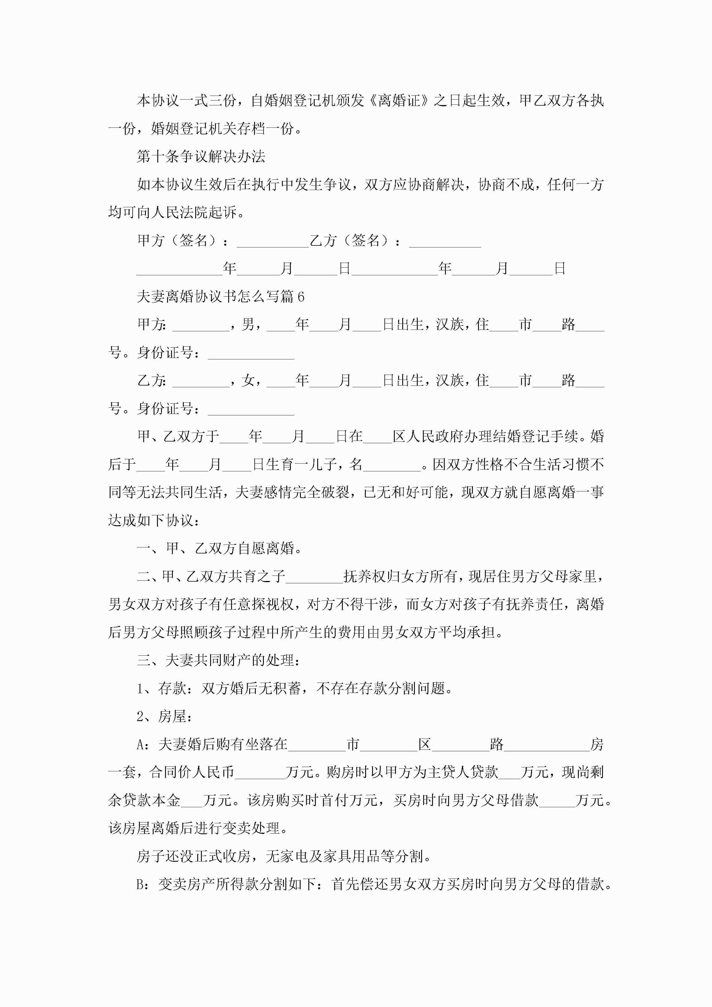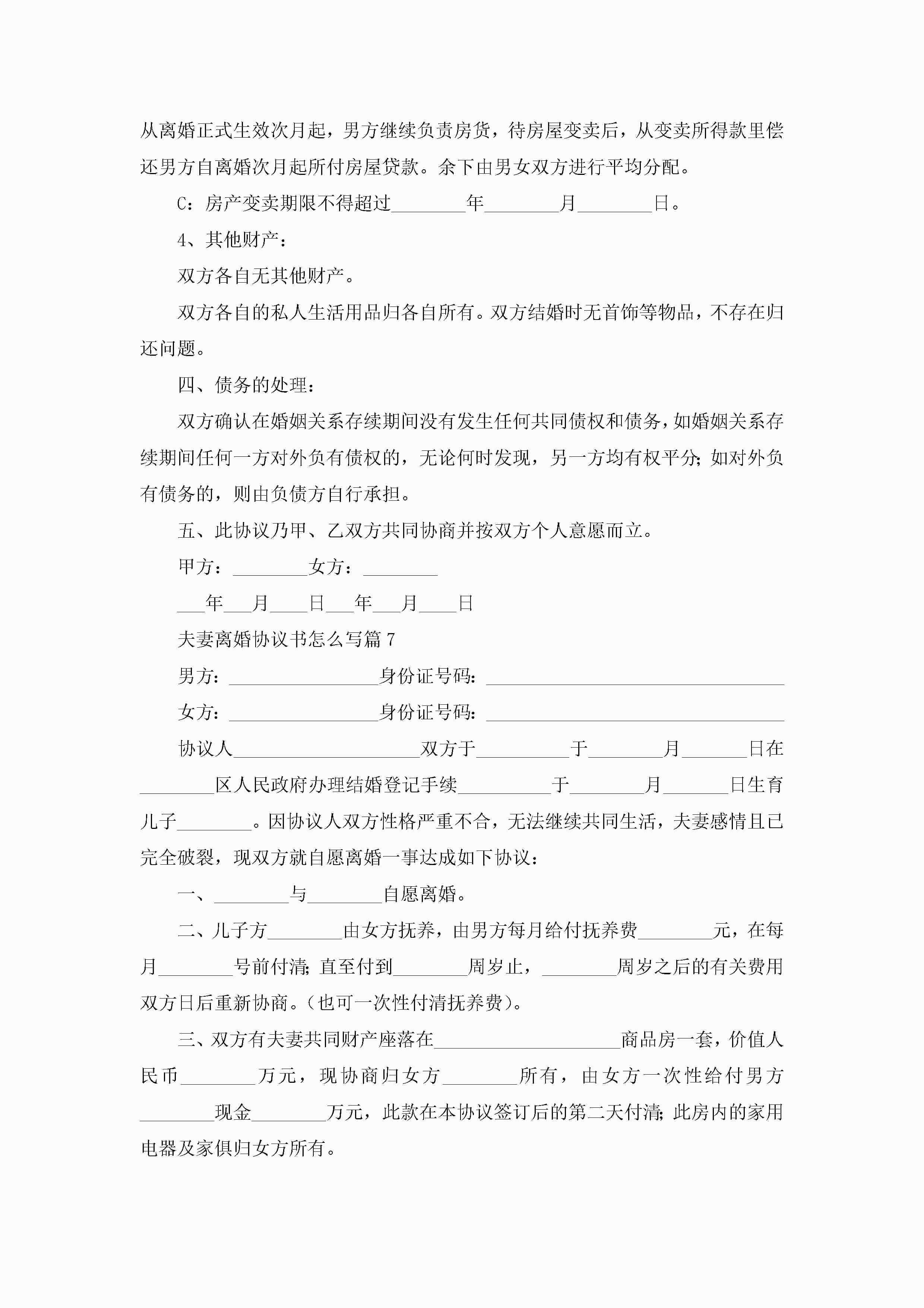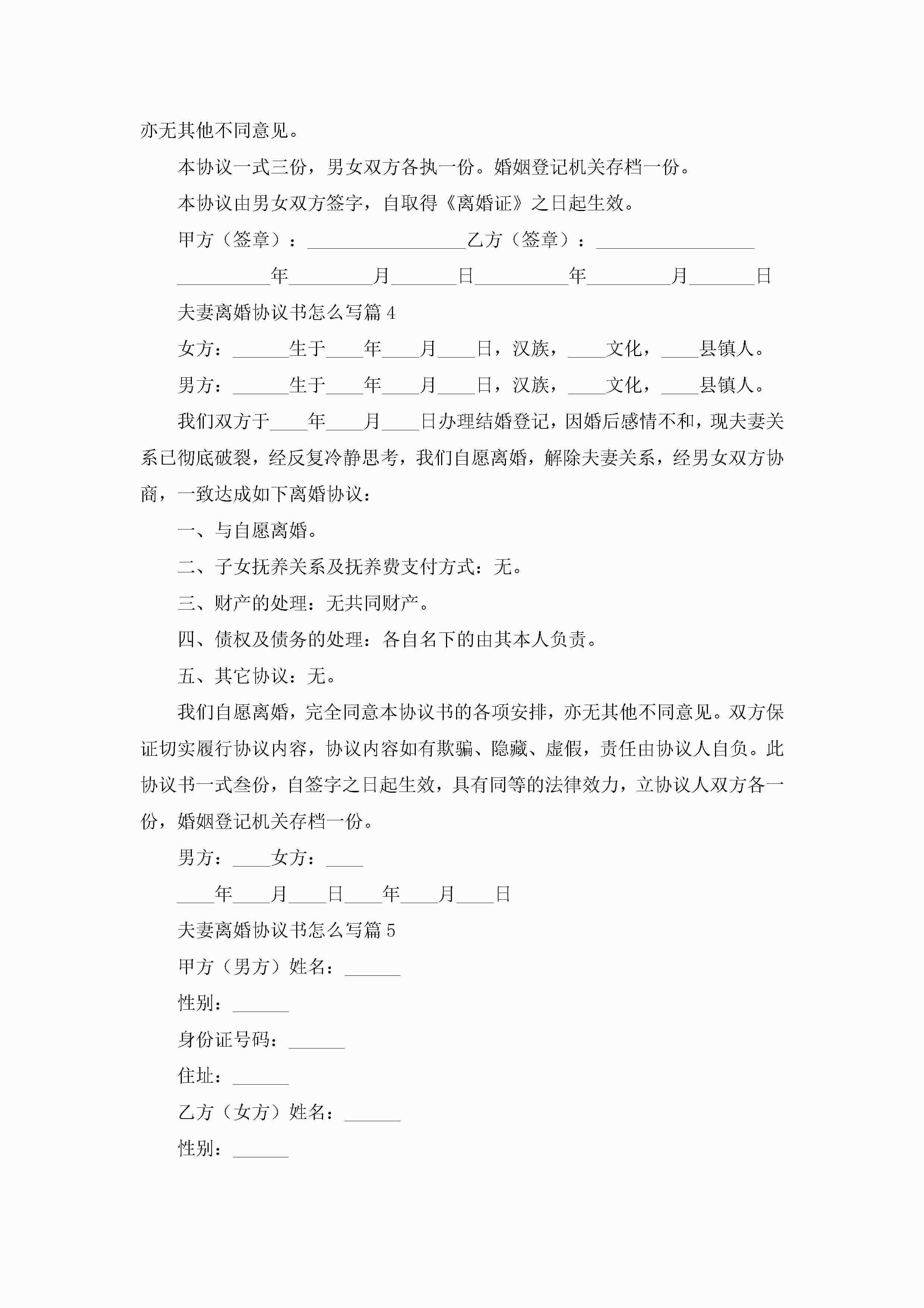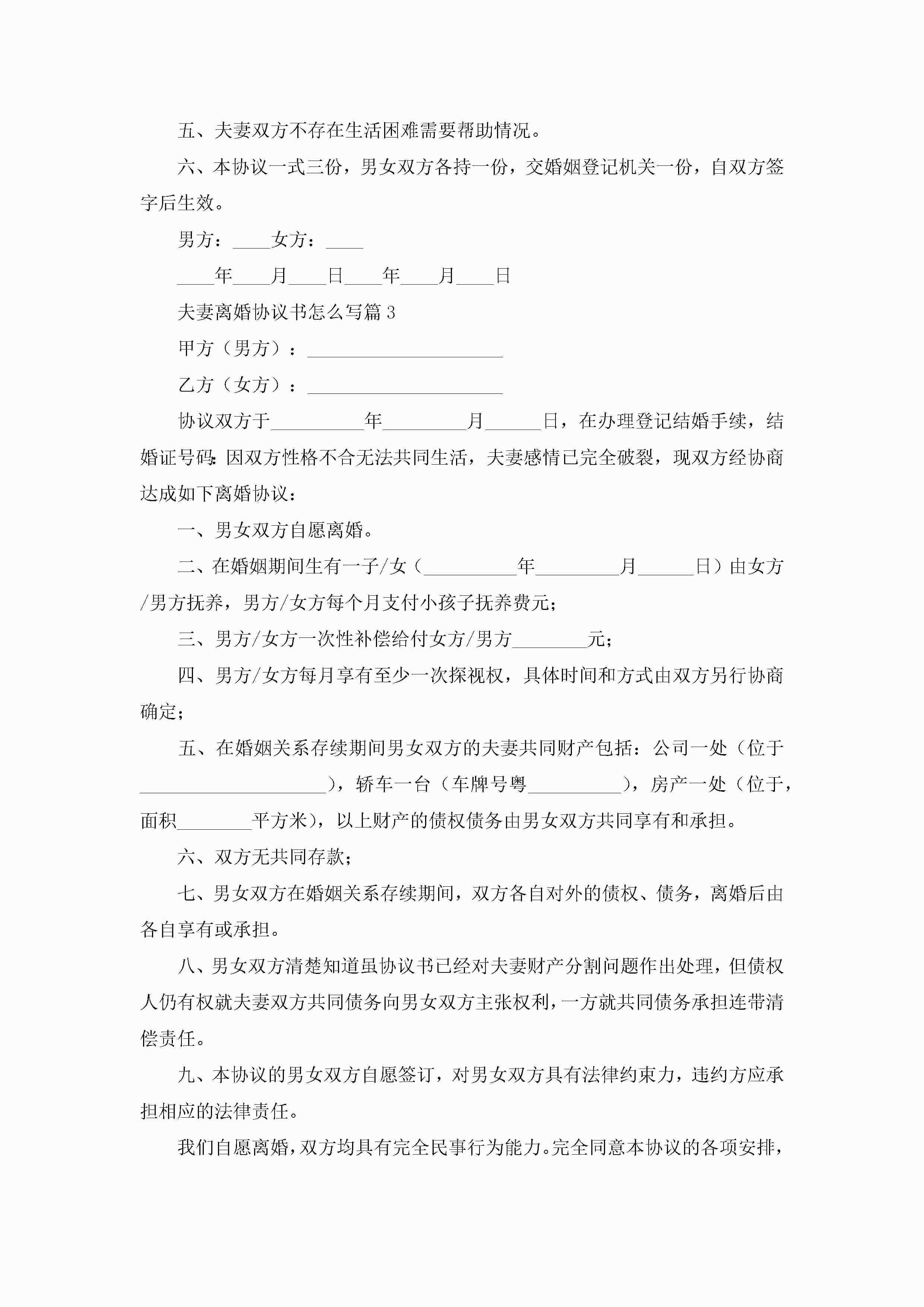 夫妻离婚协议书怎么写7篇jugei3月22日 12:42更新关注202 夫妻离婚协议书怎么写7篇此内容为付费资源,请付费后查看¥10.9 单篇文档限时特惠¥15个人会员开通企业会员开通立即下载无需登陆!可直接快捷下载单个模板付费资源© 版权声明THE ENDWord模板# 实用文档# 实用模板# 信函模板# 协议书 如有问题,可点击最底部“联系我们”联系客服 分享QQ空间微博QQ好友海报分享复制链接收藏