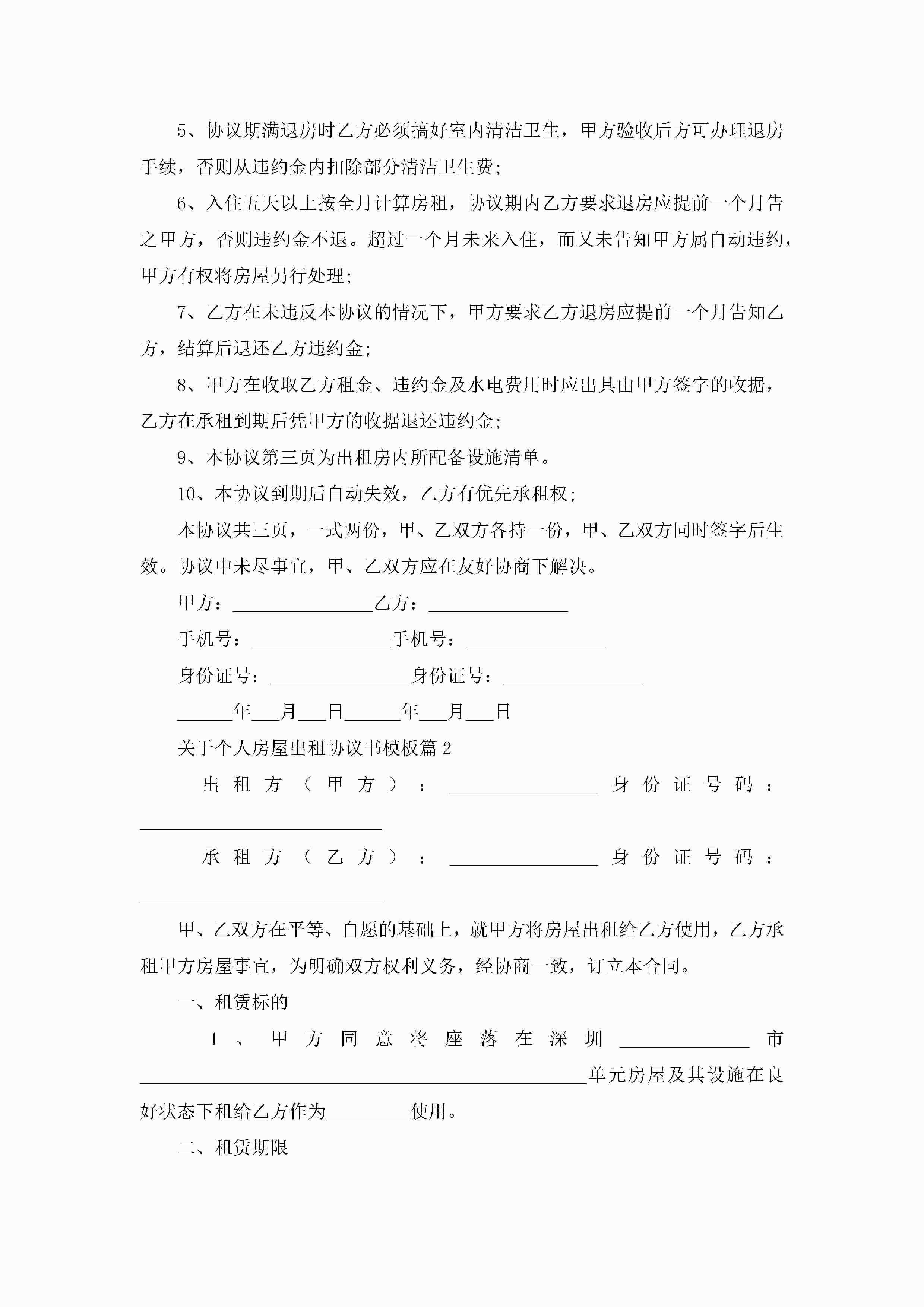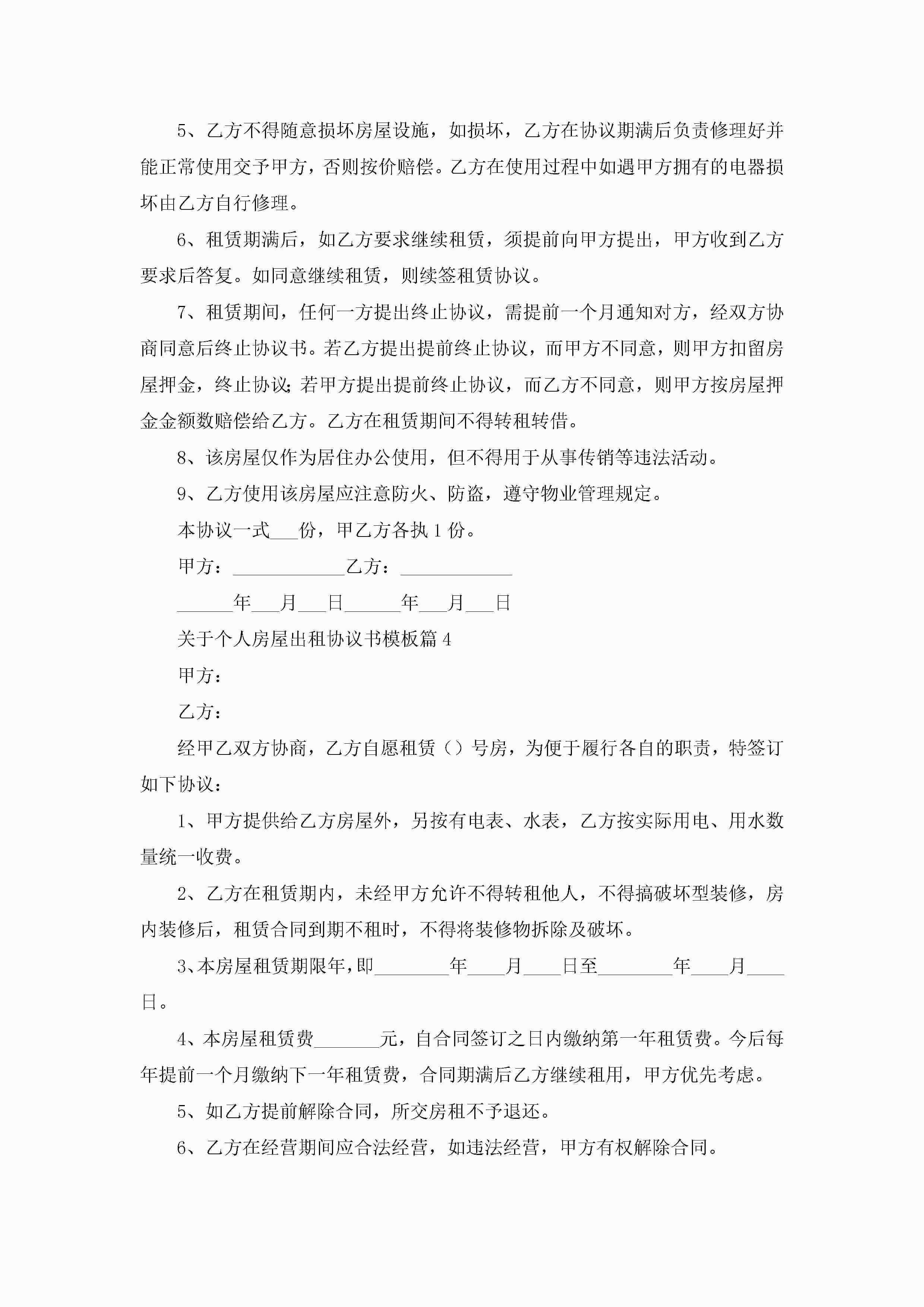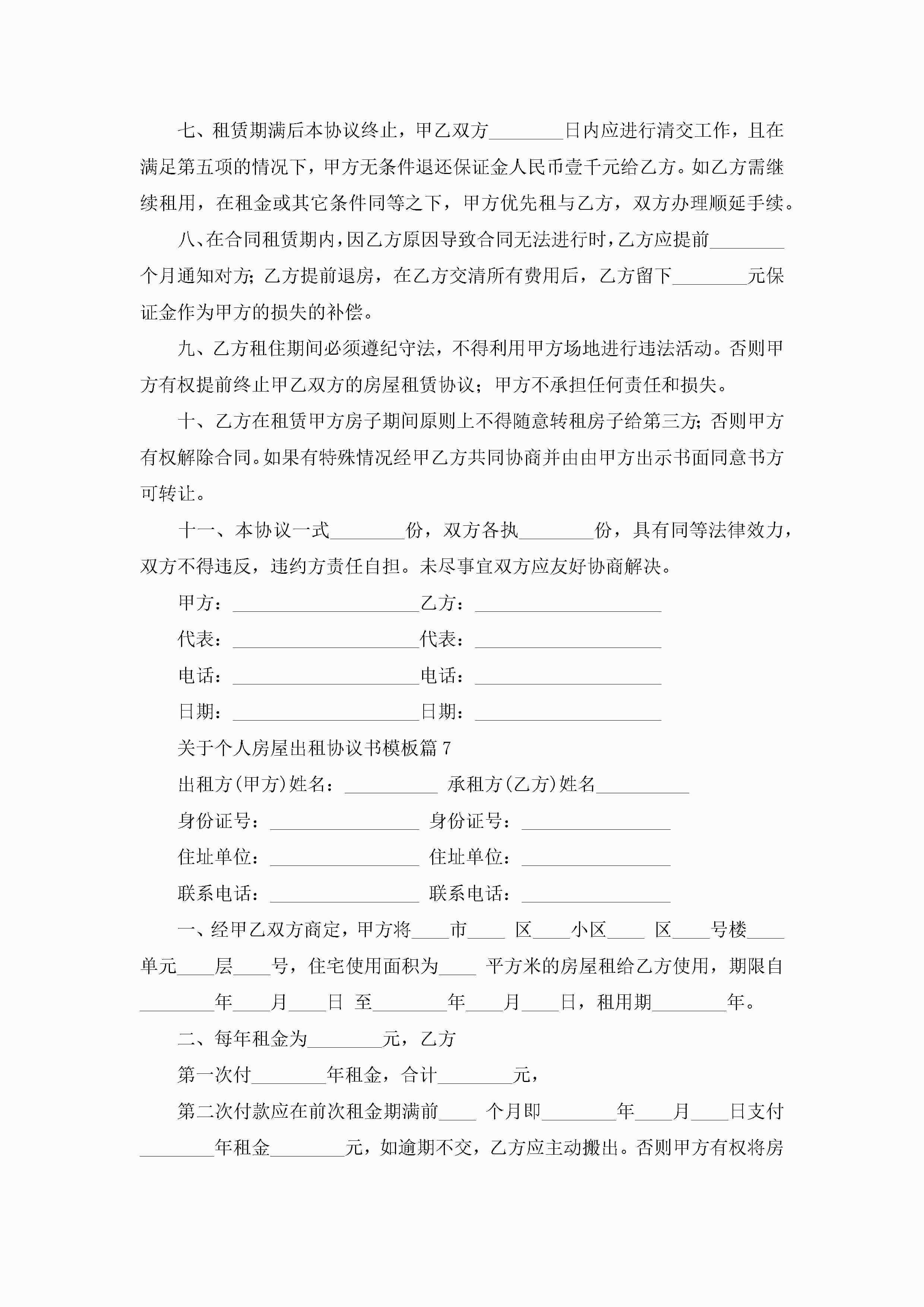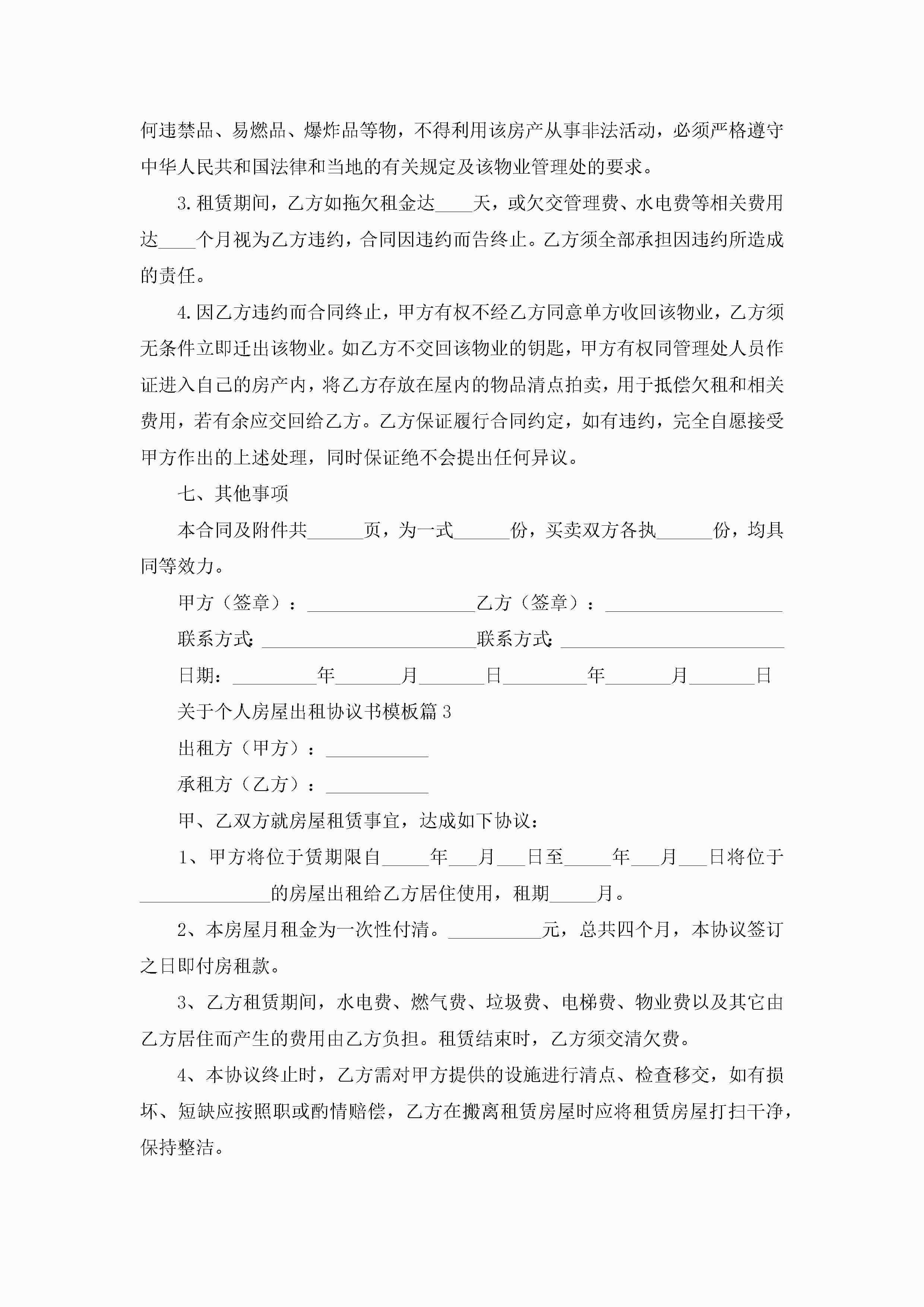 关于个人房屋出租协议书模板(精选10篇)jugei3月22日 12:42更新关注193 关于个人房屋出租协议书模板(精选10篇)此内容为付费资源,请付费后查看¥10.9 单篇文档限时特惠¥15个人会员开通企业会员开通立即下载无需登陆!可直接快捷下载单个模板付费资源© 版权声明THE ENDWord模板# 实用文档# 实用模板# 信函模板# 协议书 如有问题,可点击最底部“联系我们”联系客服 分享QQ空间微博QQ好友海报分享复制链接收藏