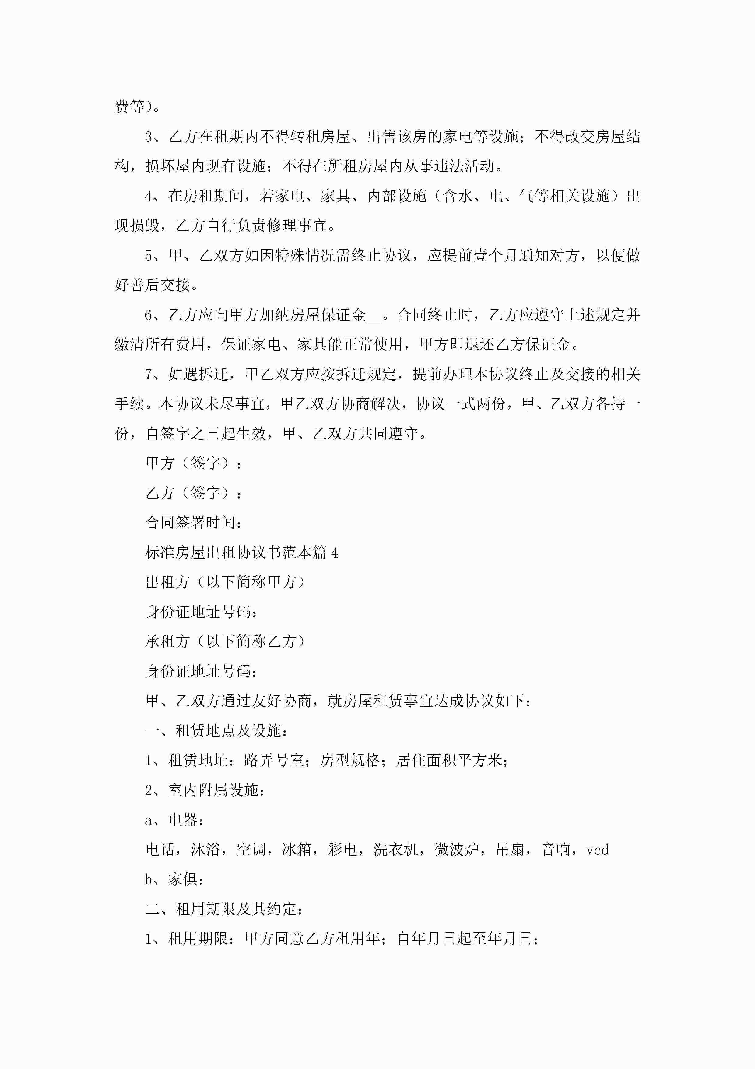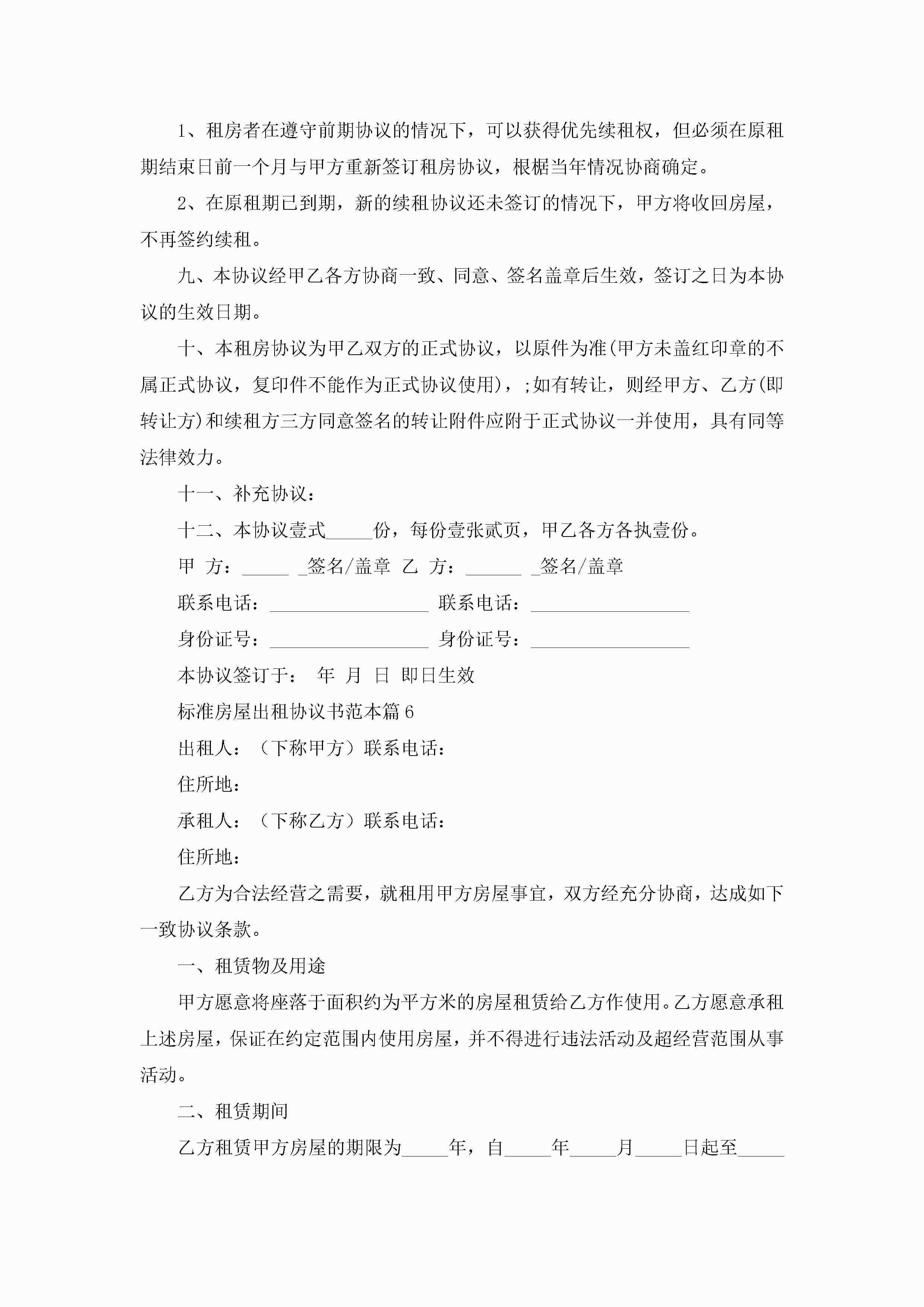 标准房屋出租协议书范本(精选10篇)jugei3月22日 12:42更新关注225 标准房屋出租协议书范本(精选10篇)此内容为付费资源,请付费后查看¥10.9 单篇文档限时特惠¥15个人会员开通企业会员开通立即下载无需登陆!可直接快捷下载单个模板付费资源© 版权声明THE ENDWord模板# 实用文档# 实用模板# 信函模板# 协议书 如有问题,可点击最底部“联系我们”联系客服 分享QQ空间微博QQ好友海报分享复制链接收藏