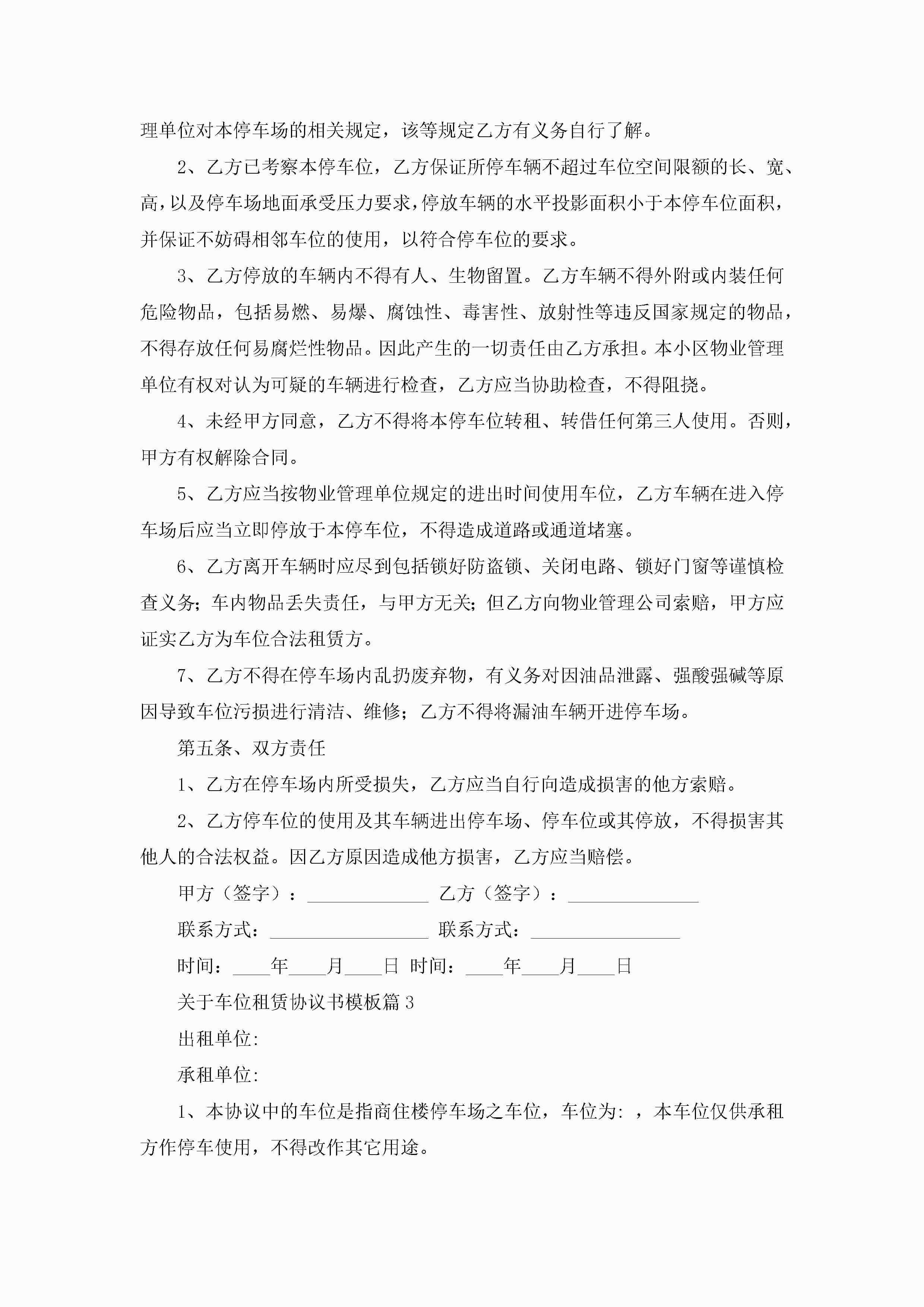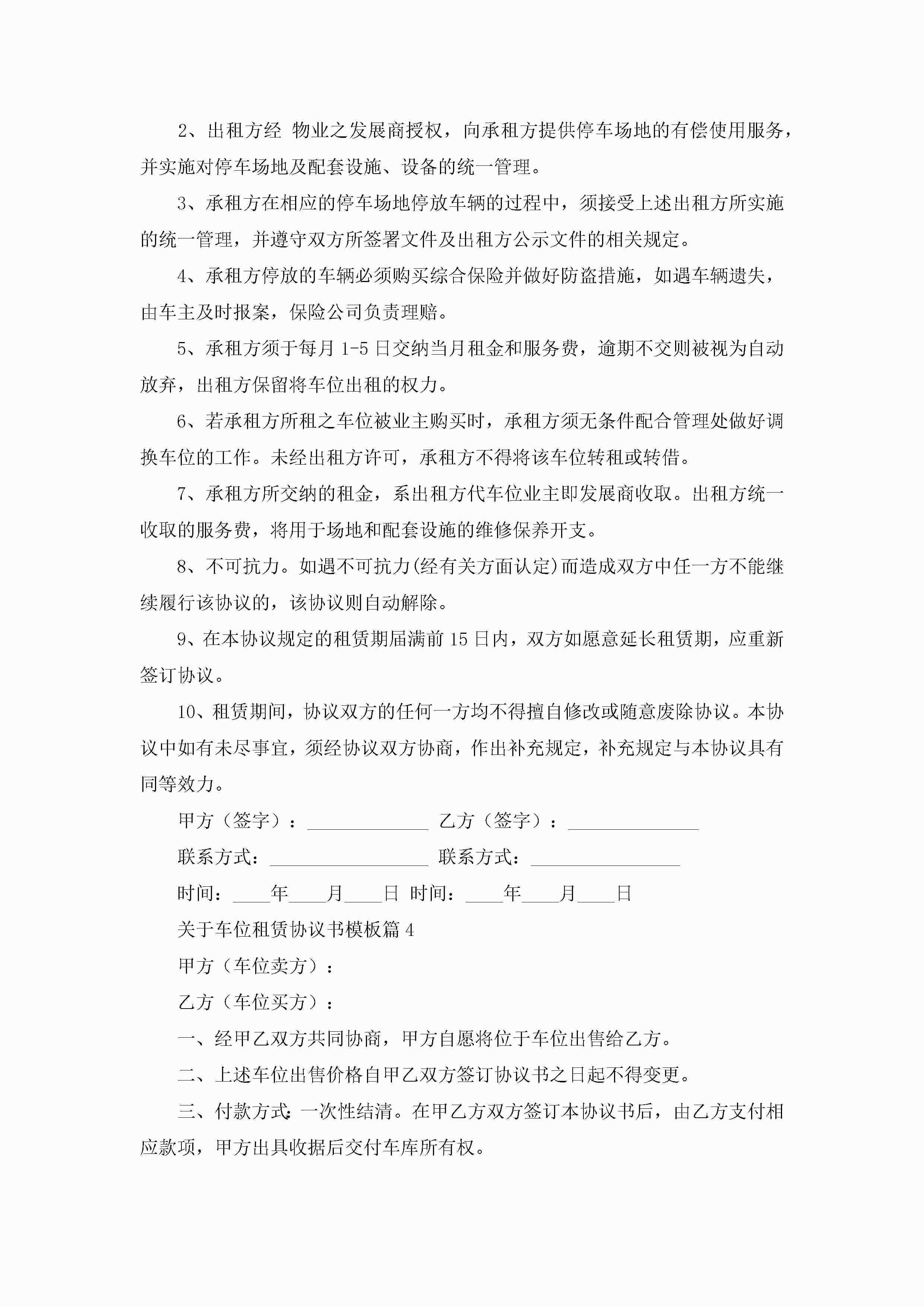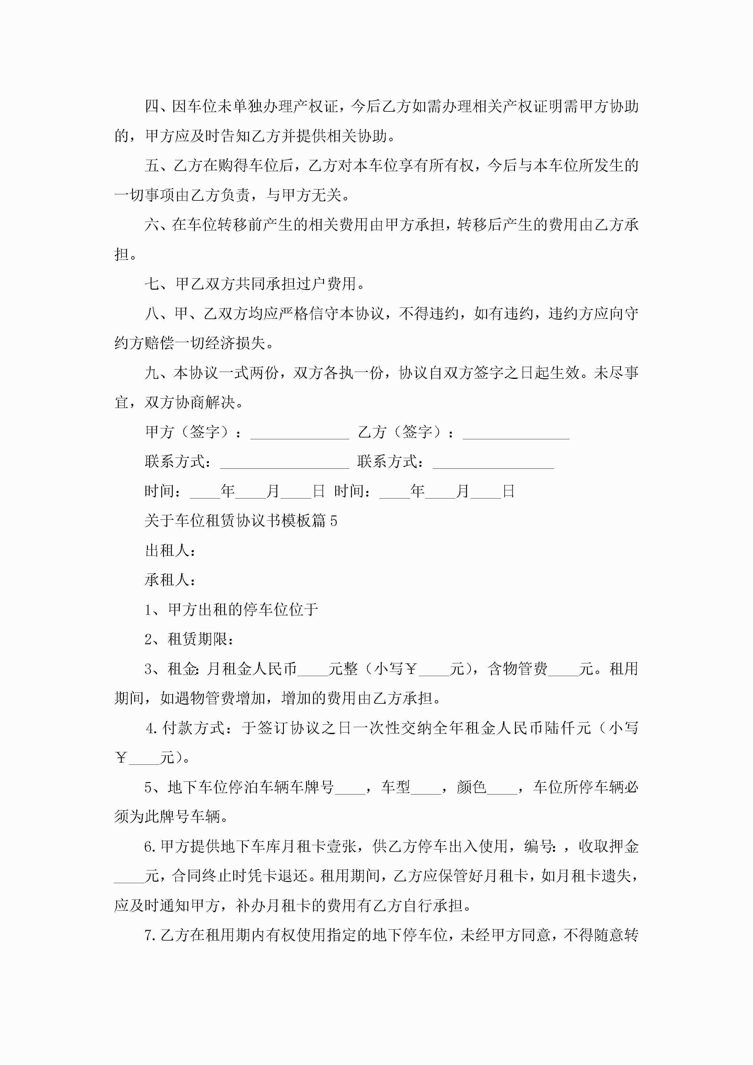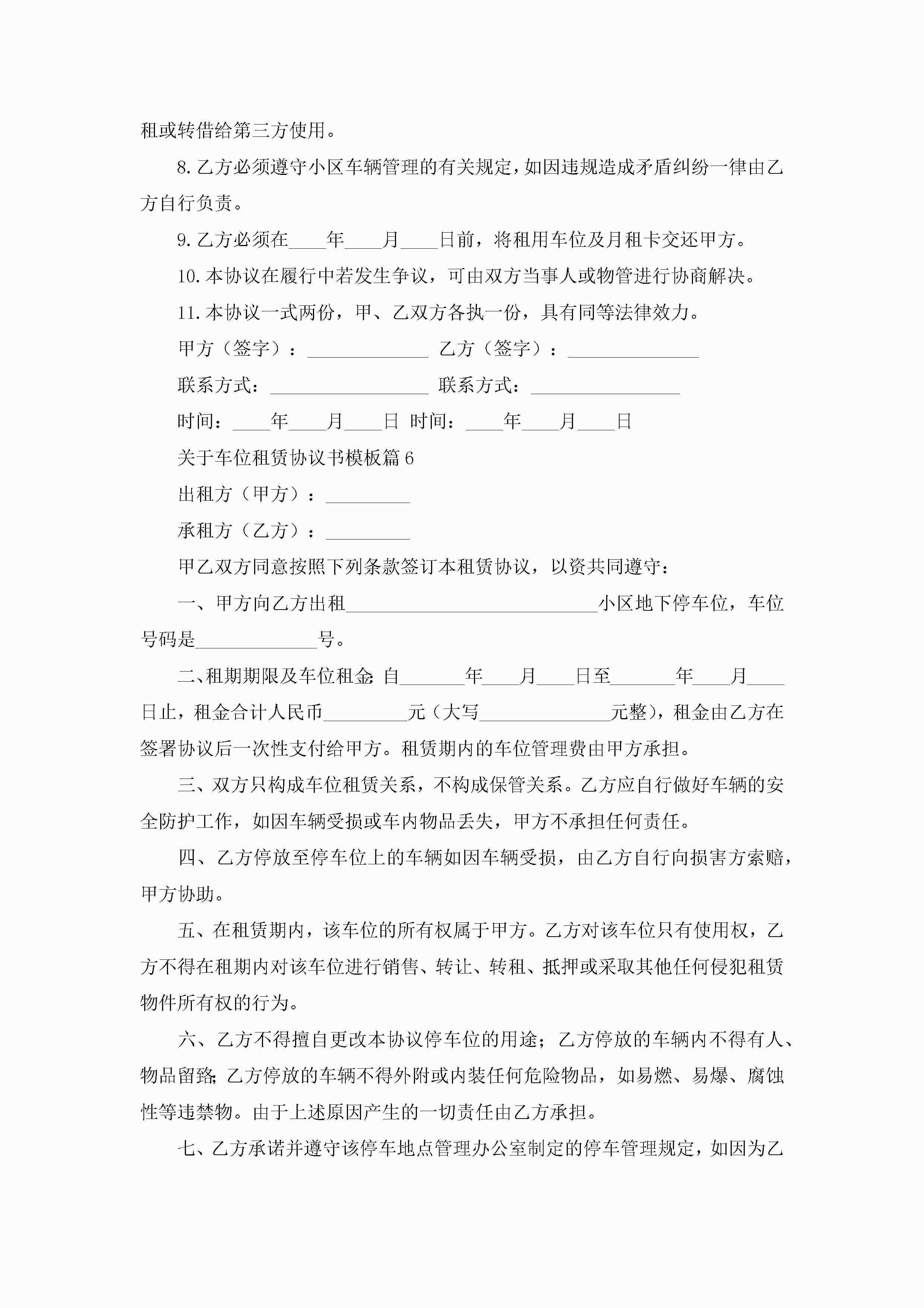 关于车位租赁协议书模板(精选10篇)jugei3月22日 12:42更新关注210 关于车位租赁协议书模板(精选10篇)此内容为付费资源,请付费后查看¥10.9 单篇文档限时特惠¥15个人会员开通企业会员开通立即下载无需登陆!可直接快捷下载单个模板付费资源© 版权声明THE ENDWord模板# 实用文档# 实用模板# 信函模板# 协议书 如有问题,可点击最底部“联系我们”联系客服 分享QQ空间微博QQ好友海报分享复制链接收藏
