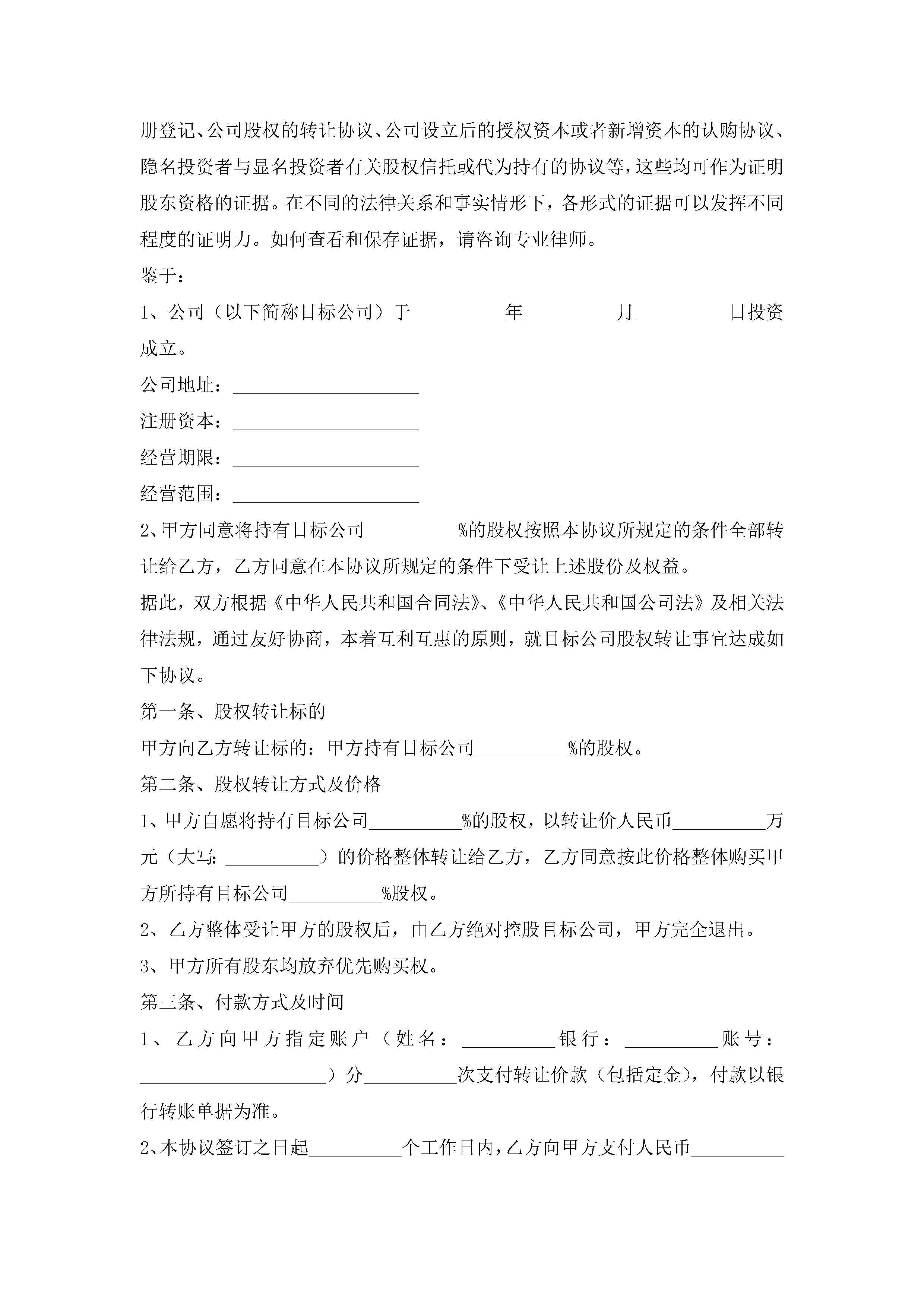 股权转让协议范文模板(精选10篇)jugei3月22日 12:42更新关注228 股权转让协议范文模板(精选10篇)此内容为付费资源,请付费后查看¥10.9 单篇文档限时特惠¥15个人会员开通企业会员开通立即下载无需登陆!可直接快捷下载单个模板付费资源© 版权声明THE ENDWord模板# 实用文档# 实用模板# 信函模板# 协议书 如有问题,可点击最底部“联系我们”联系客服 分享QQ空间微博QQ好友海报分享复制链接收藏