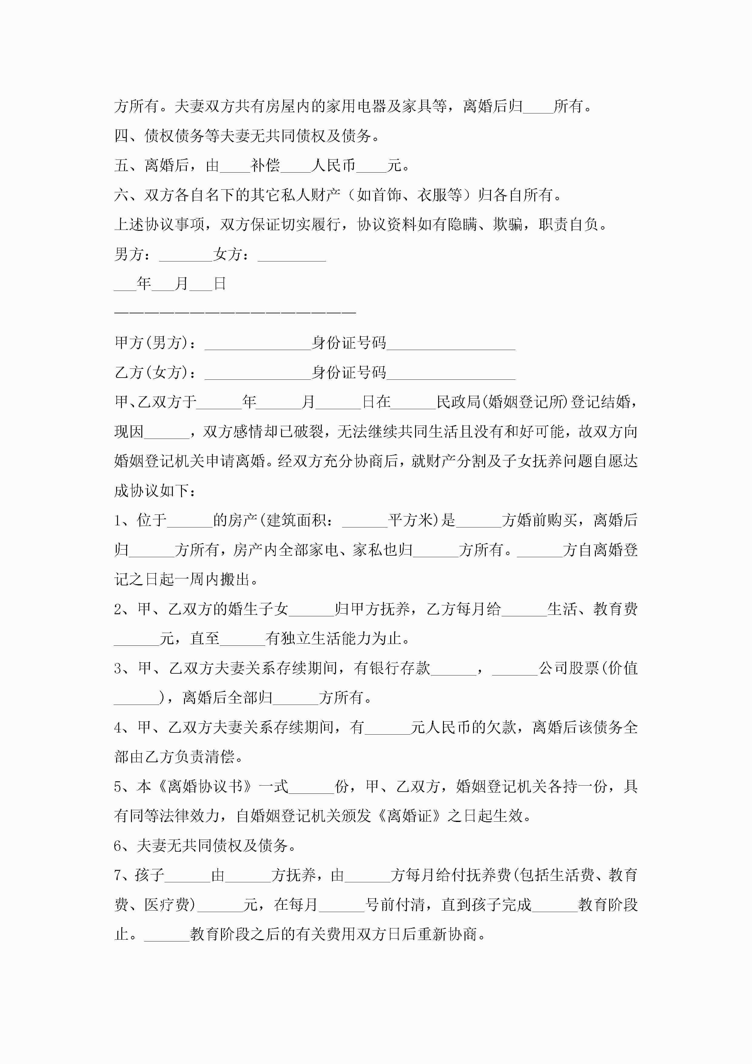 男女离婚协议范本(7篇)jugei3月22日 12:42更新关注356 男女离婚协议范本(7篇)此内容为付费资源,请付费后查看¥10.9 单篇文档限时特惠¥15个人会员开通企业会员开通立即下载无需登陆!可直接快捷下载单个模板付费资源© 版权声明THE ENDWord模板# 实用文档# 实用模板# 信函模板# 协议书 如有问题,可点击最底部“联系我们”联系客服 分享QQ空间微博QQ好友海报分享复制链接收藏