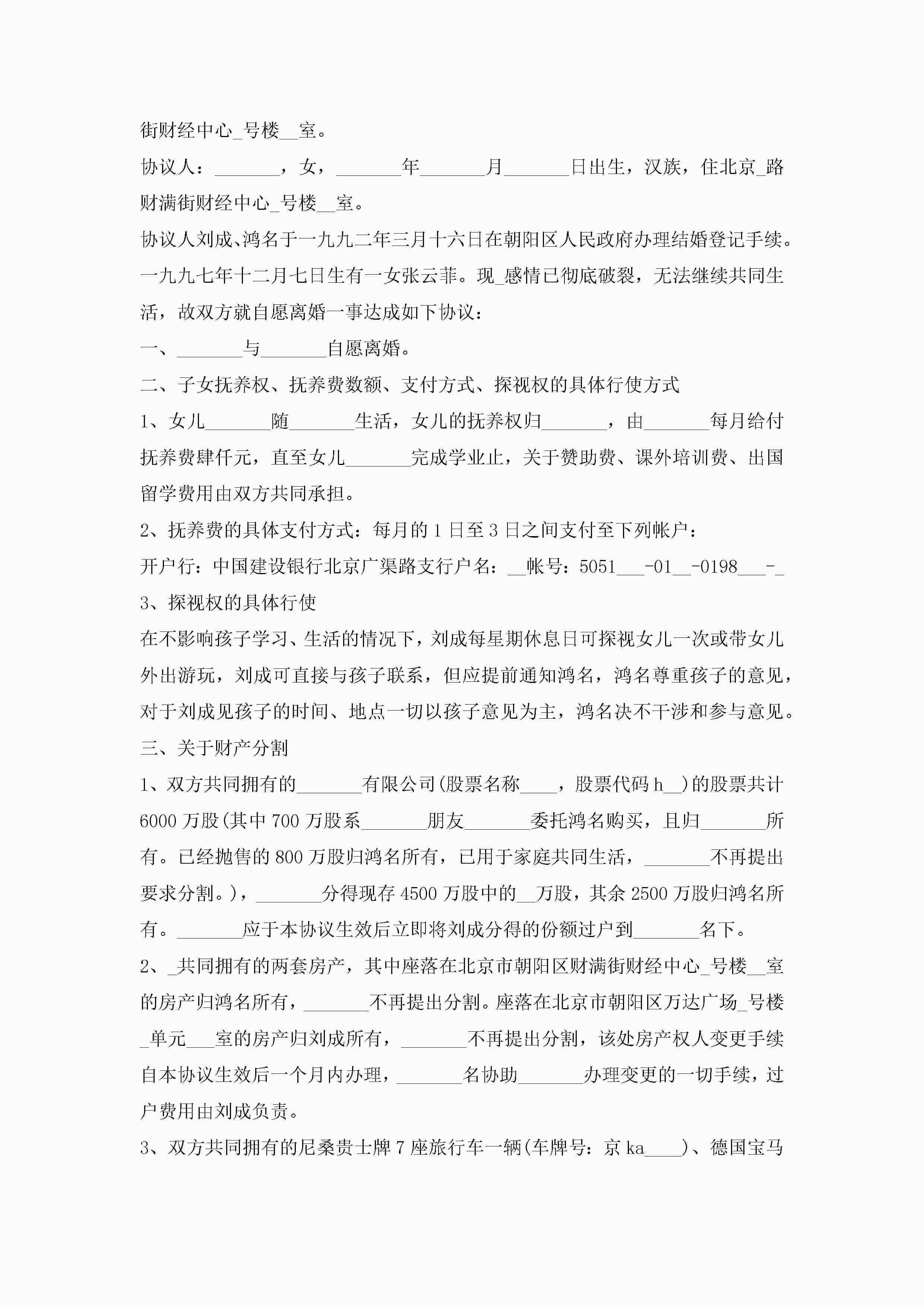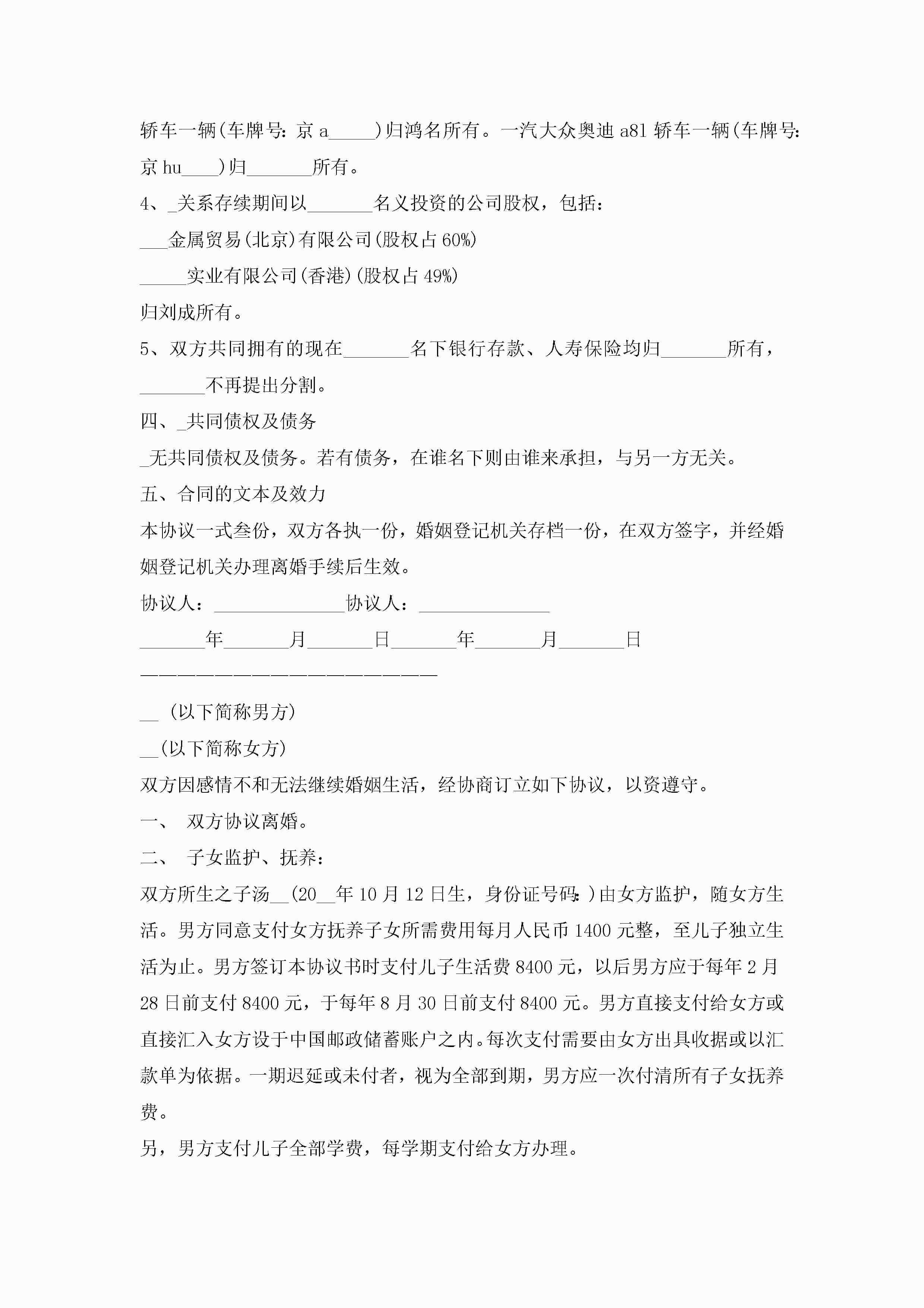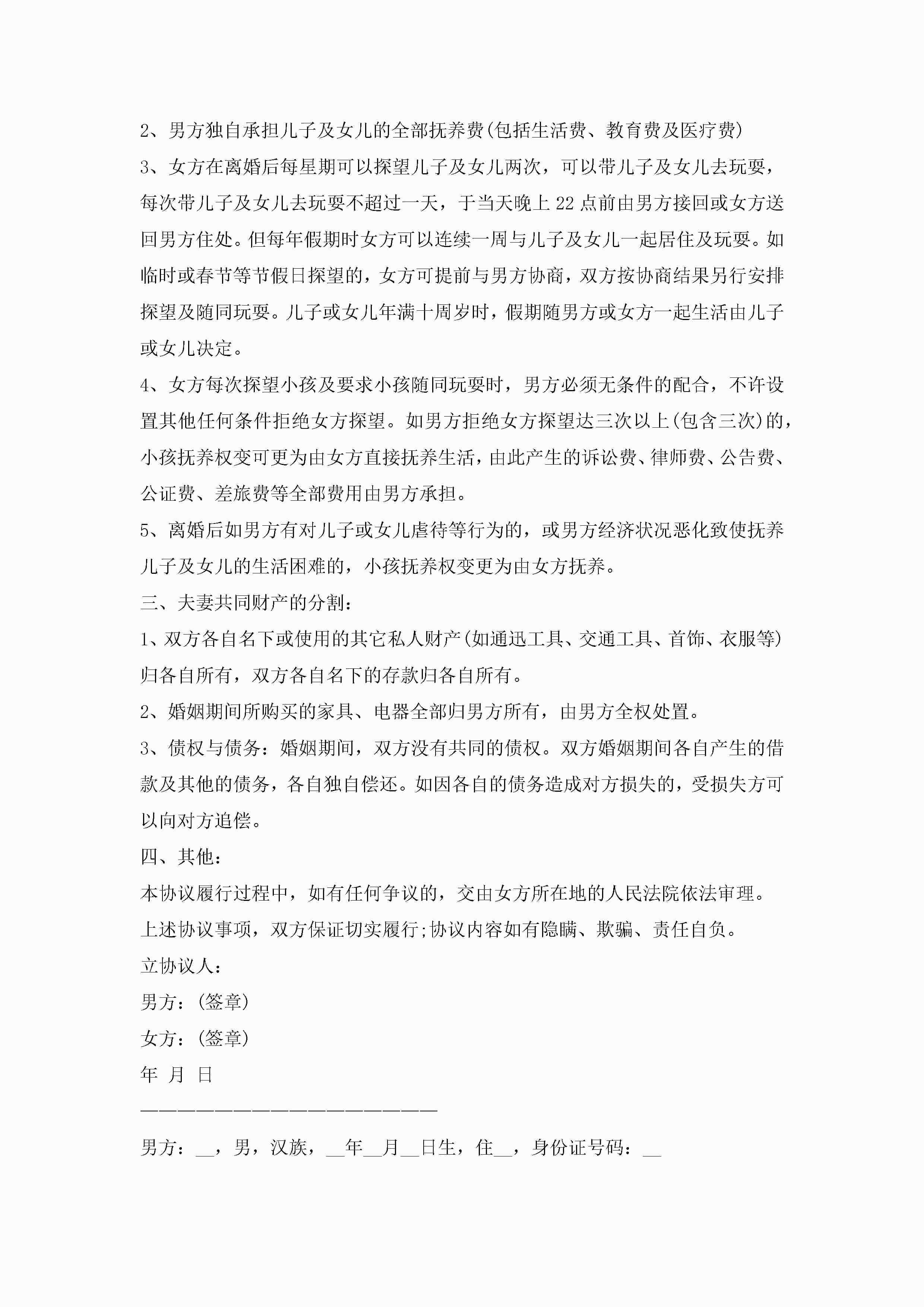 男女离婚协议书(7篇)jugei3月22日 12:42更新关注212 男女离婚协议书(7篇)此内容为付费资源,请付费后查看¥10.9 单篇文档限时特惠¥15个人会员开通企业会员开通立即下载无需登陆!可直接快捷下载单个模板付费资源© 版权声明THE ENDWord模板# 实用文档# 实用模板# 信函模板# 协议书 如有问题,可点击最底部“联系我们”联系客服 分享QQ空间微博QQ好友海报分享复制链接收藏