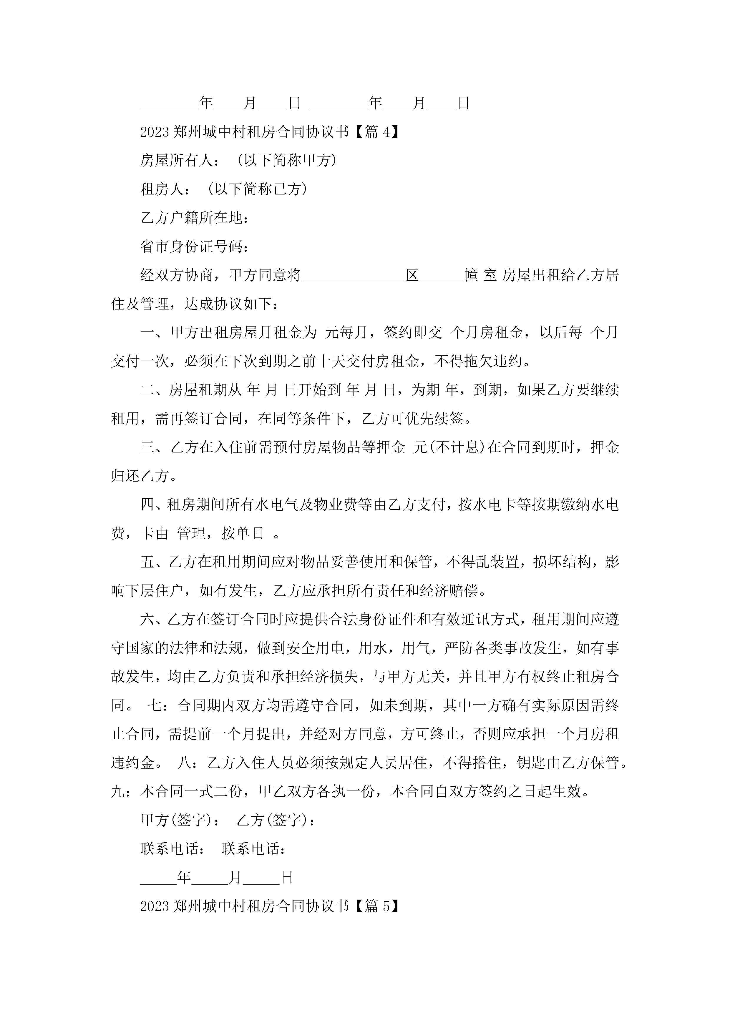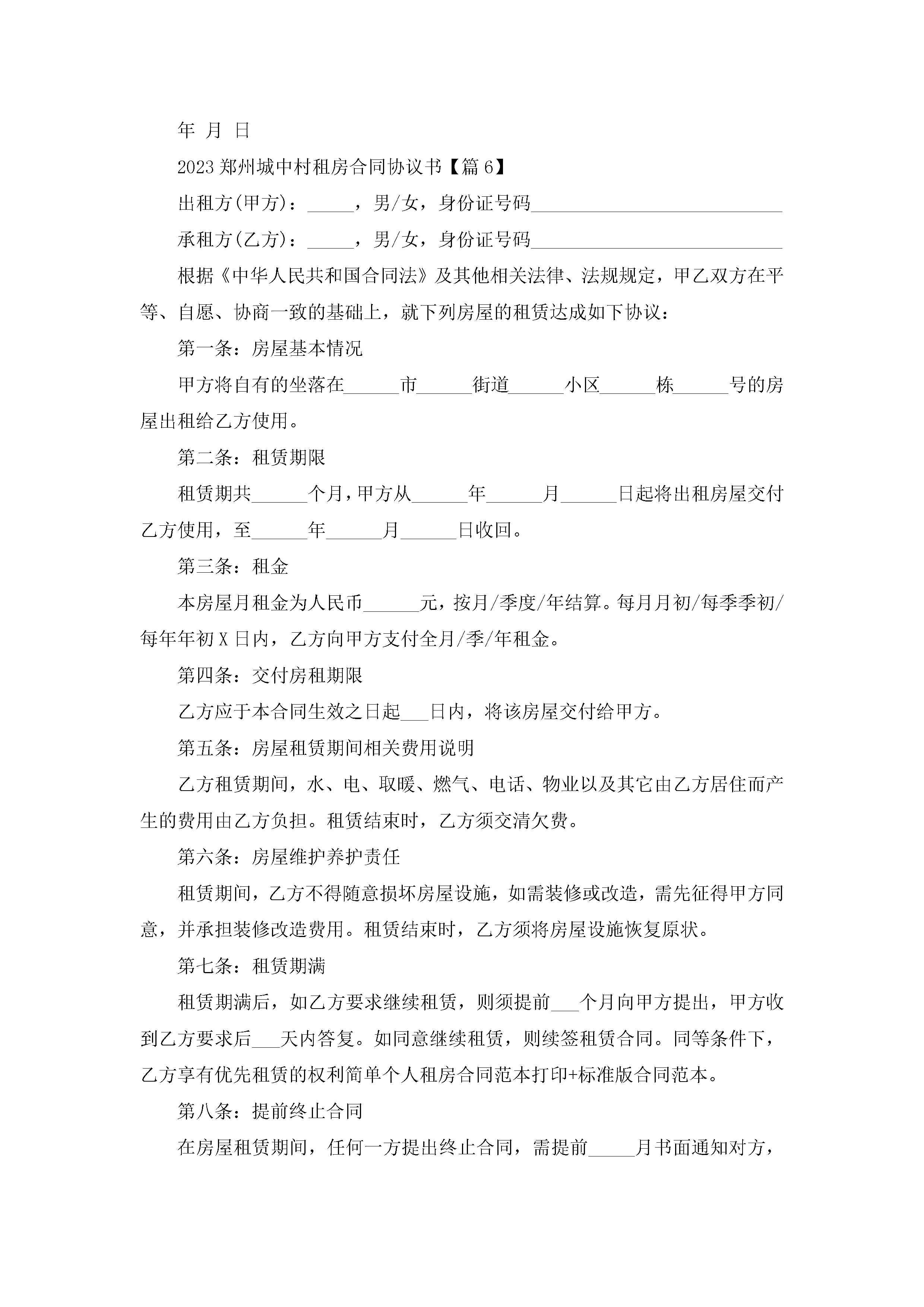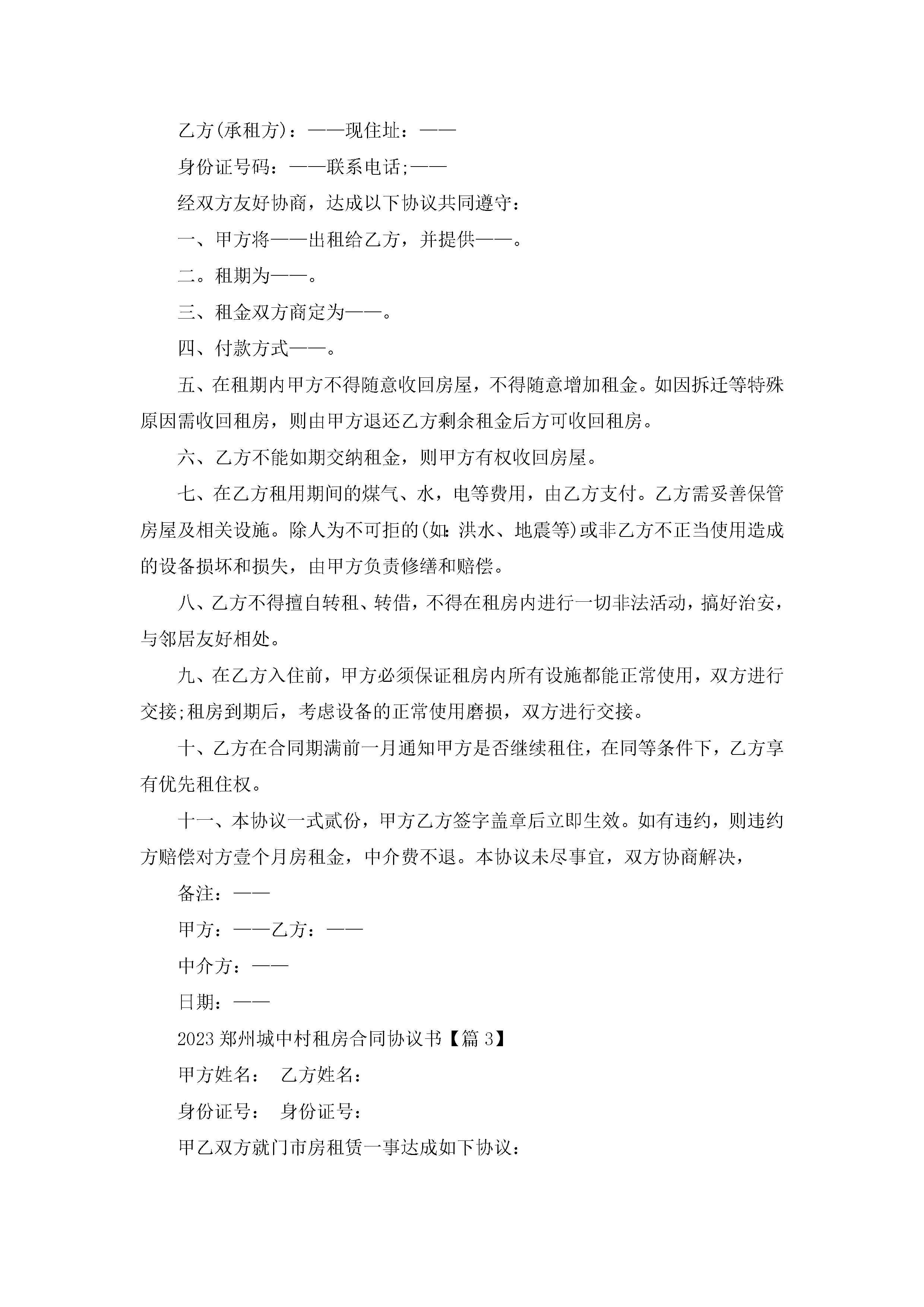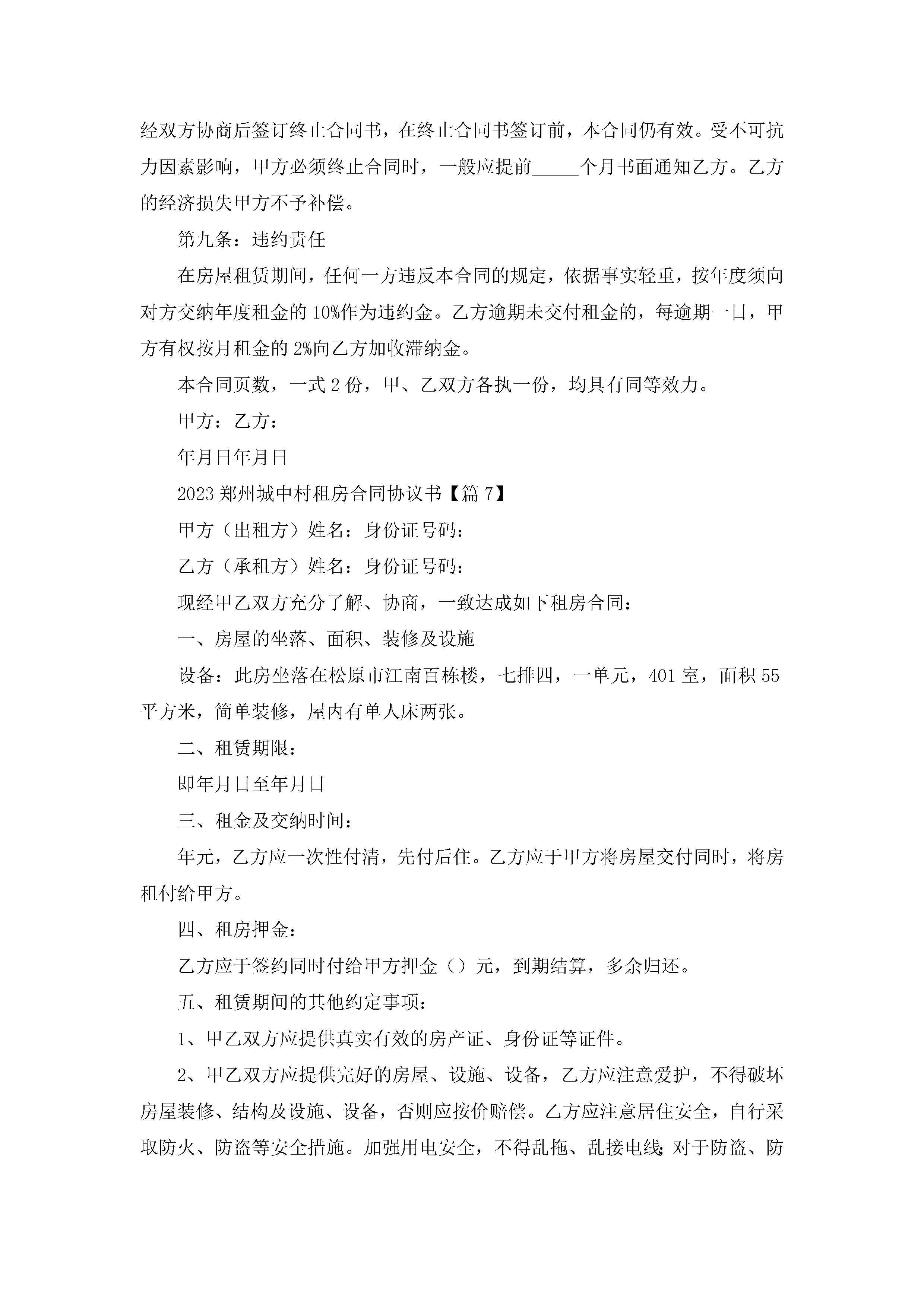 2023郑州城中村租房合同协议书(通用7篇)jugei3月22日 01:32发布关注249 2023郑州城中村租房合同协议书(通用7篇)此内容为付费资源,请付费后查看¥10.9 单篇文档限时特惠¥15个人会员开通企业会员开通立即下载无需登陆!可直接快捷下载单个模板付费资源© 版权声明THE ENDWord模板# 实用文档# 实用模板# 信函模板# 协议书 如有问题,可点击最底部“联系我们”联系客服 分享QQ空间微博QQ好友海报分享复制链接收藏