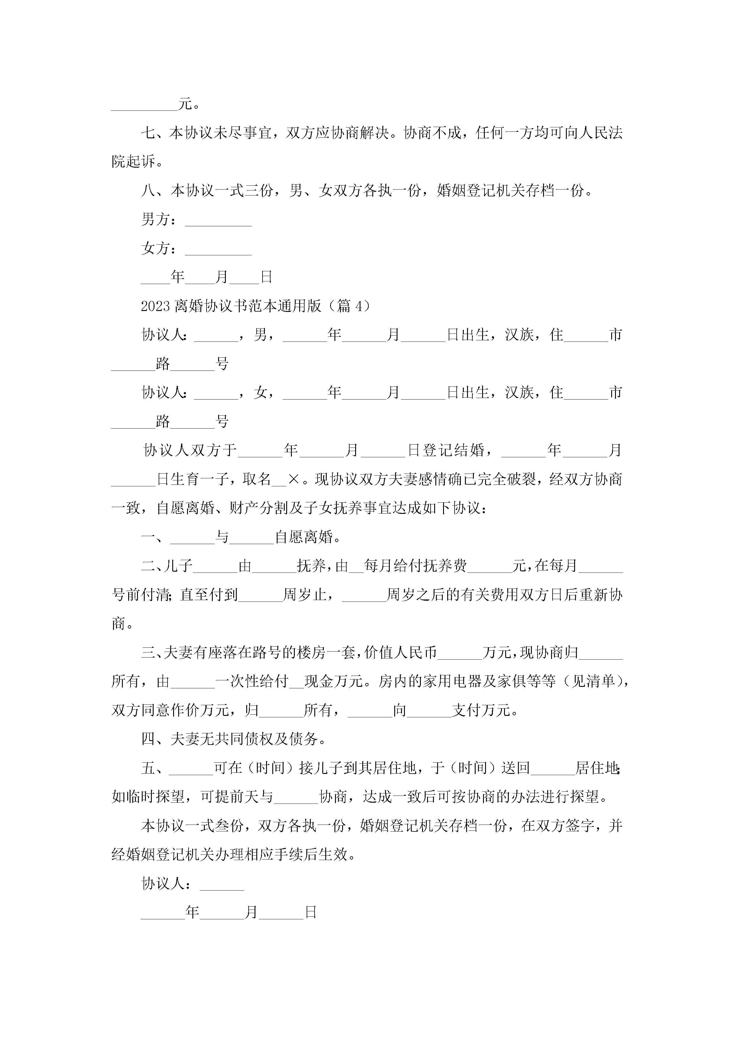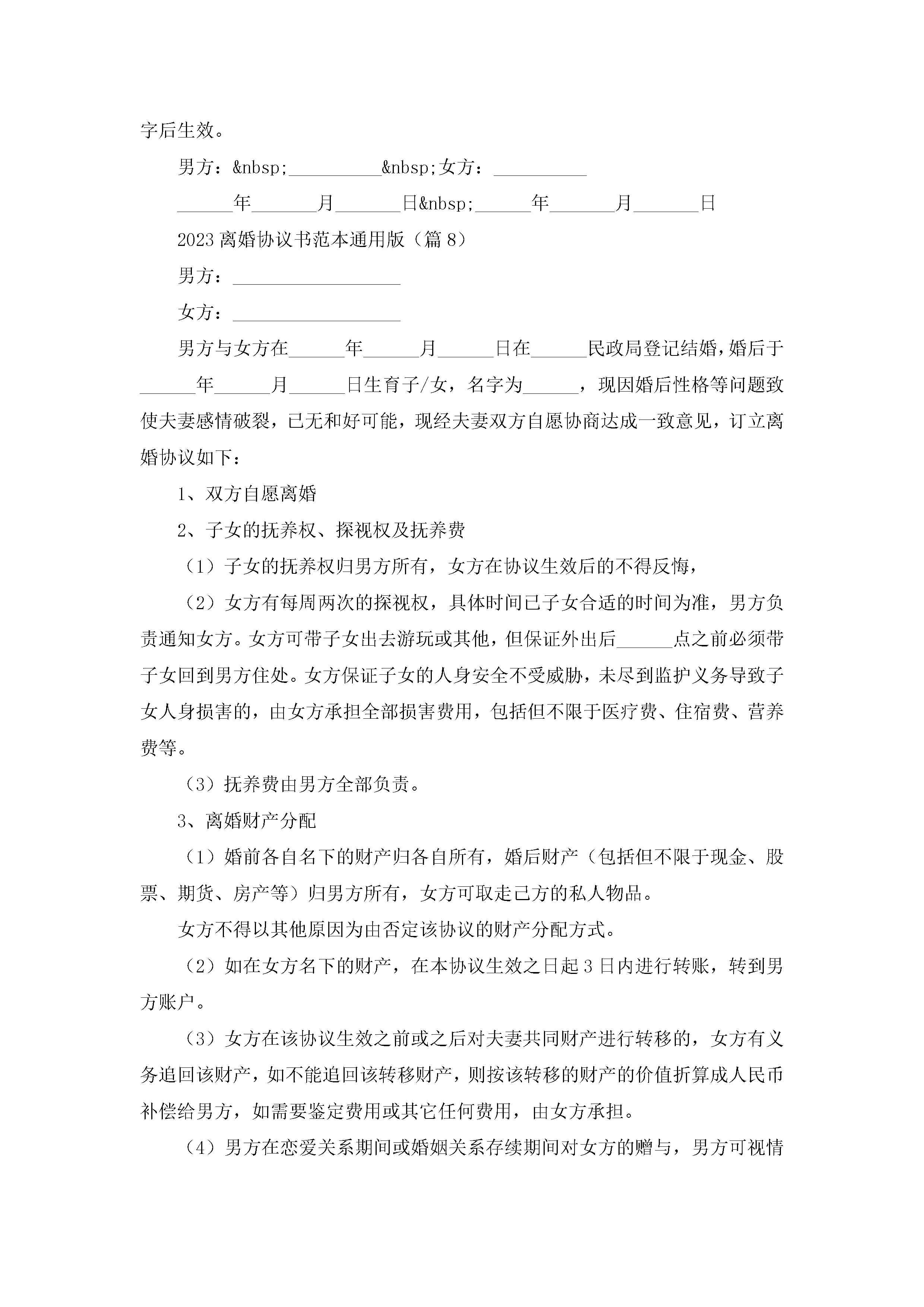 2023离婚协议书范本(通用版10篇)jugei3月22日 01:32发布关注221 2023离婚协议书范本(通用版10篇)此内容为付费资源,请付费后查看¥10.9 单篇文档限时特惠¥15个人会员开通企业会员开通立即下载无需登陆!可直接快捷下载单个模板付费资源© 版权声明THE ENDWord模板# 实用文档# 实用模板# 信函模板# 协议书 如有问题,可点击最底部“联系我们”联系客服 分享QQ空间微博QQ好友海报分享复制链接收藏