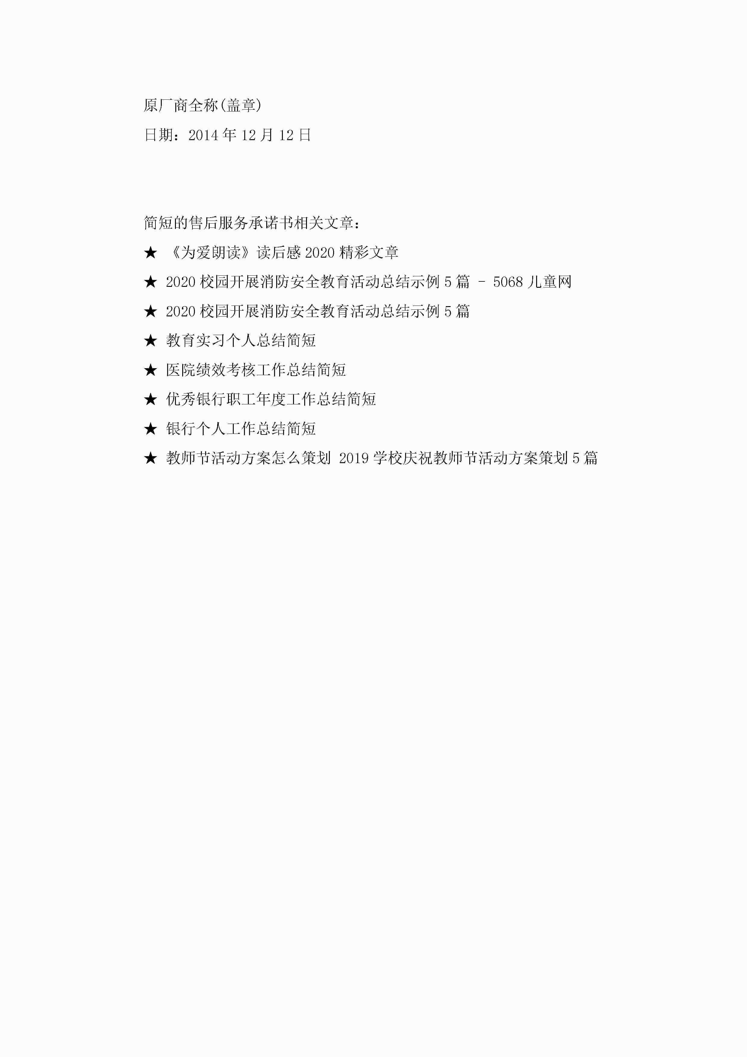 简短的售后服务承诺书7篇jugei3月22日 16:21发布关注309 简短的售后服务承诺书7篇此内容为付费资源,请付费后查看¥10.9 单篇文档限时特惠¥15个人会员开通企业会员开通立即下载无需登陆!可直接快捷下载单个模板付费资源© 版权声明THE ENDWord模板# 实用文档# 实用模板# 信函模板# 承诺书 如有问题,可点击最底部“联系我们”联系客服 分享QQ空间微博QQ好友海报分享复制链接收藏