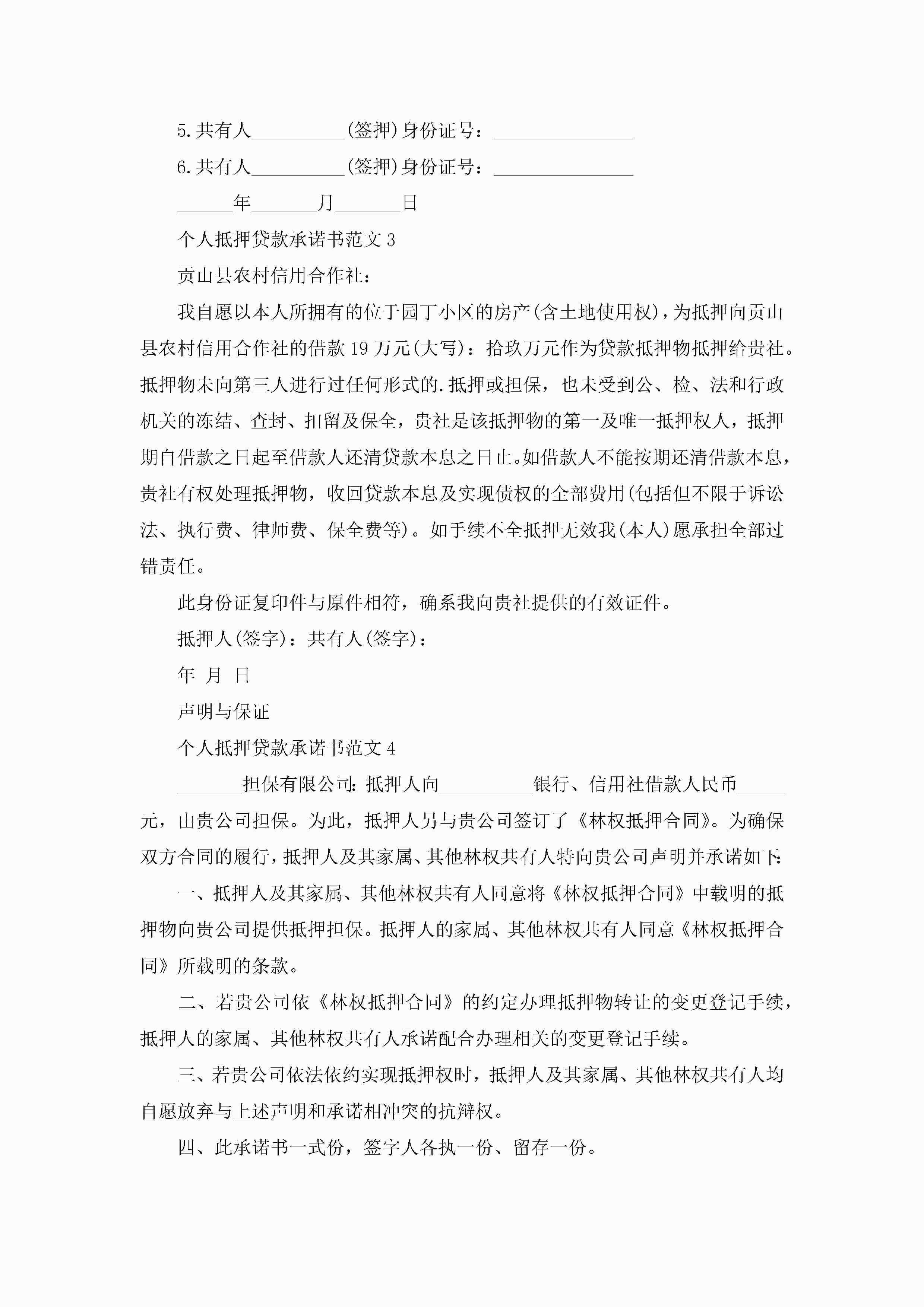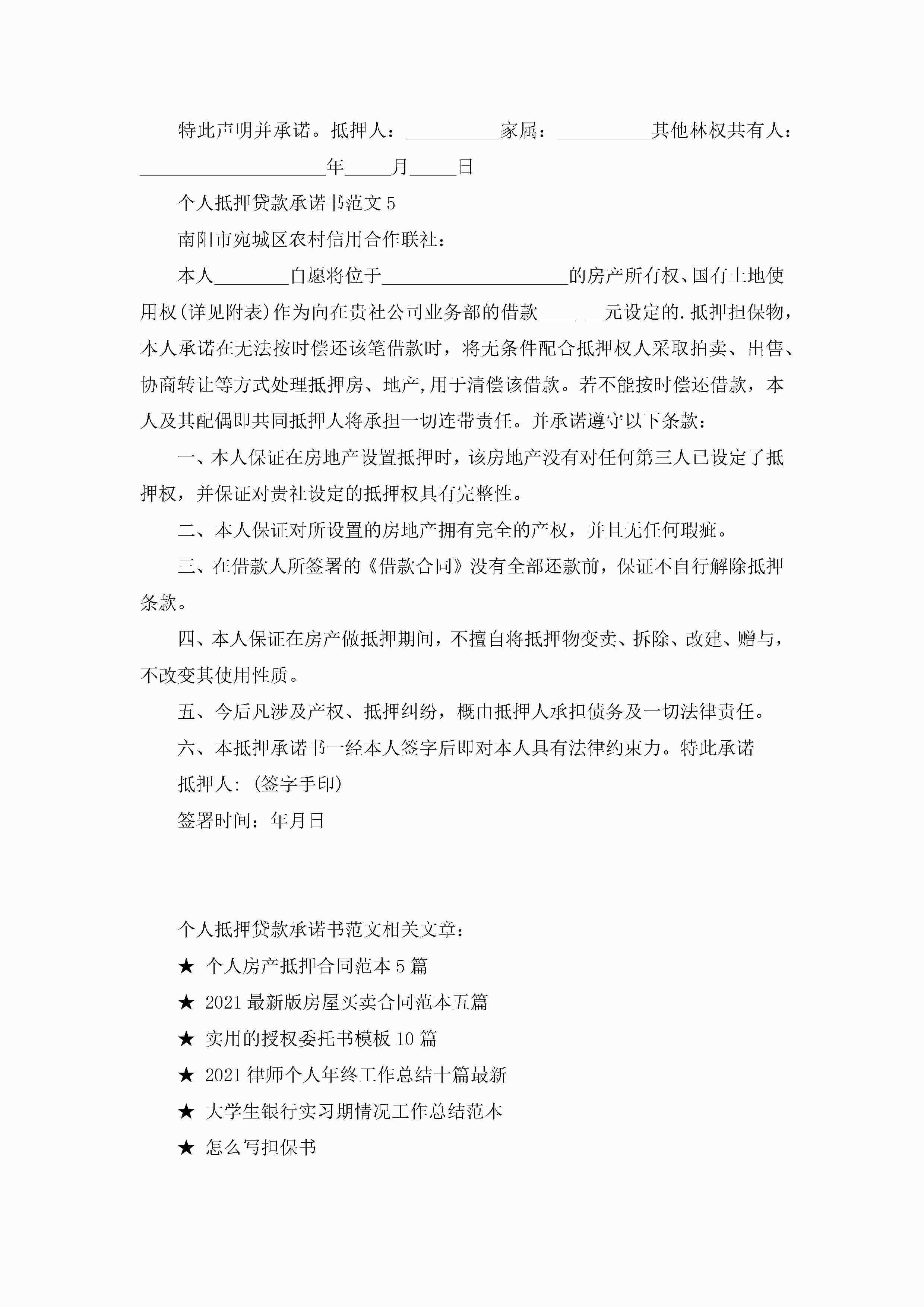 个人抵押贷款承诺书范文5篇jugei3月22日 16:21发布关注194 个人抵押贷款承诺书范文5篇此内容为付费资源,请付费后查看¥10.9 单篇文档限时特惠¥15个人会员开通企业会员开通立即下载无需登陆!可直接快捷下载单个模板付费资源© 版权声明THE ENDWord模板# 实用文档# 实用模板# 信函模板# 承诺书 如有问题,可点击最底部“联系我们”联系客服 分享QQ空间微博QQ好友海报分享复制链接收藏