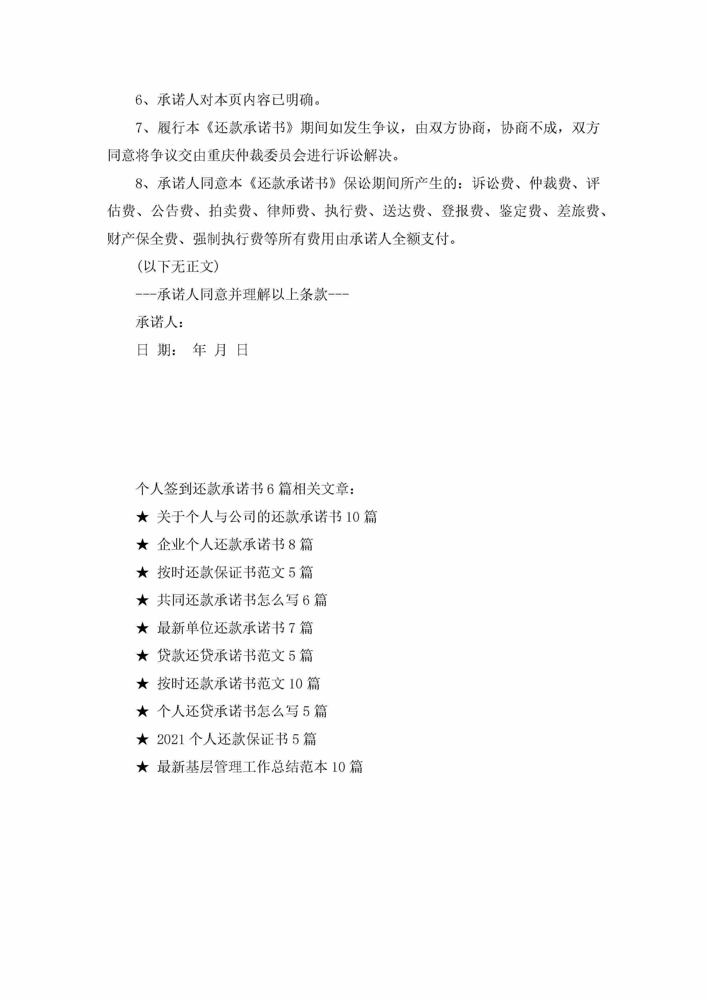 个人签到还款承诺书6篇范文jugei3月22日 16:22发布关注217 个人签到还款承诺书6篇范文此内容为付费资源,请付费后查看¥10.9 单篇文档限时特惠¥15个人会员开通企业会员开通立即下载无需登陆!可直接快捷下载单个模板付费资源© 版权声明THE ENDWord模板# 实用文档# 实用模板# 信函模板# 承诺书 如有问题,可点击最底部“联系我们”联系客服 分享QQ空间微博QQ好友海报分享复制链接收藏