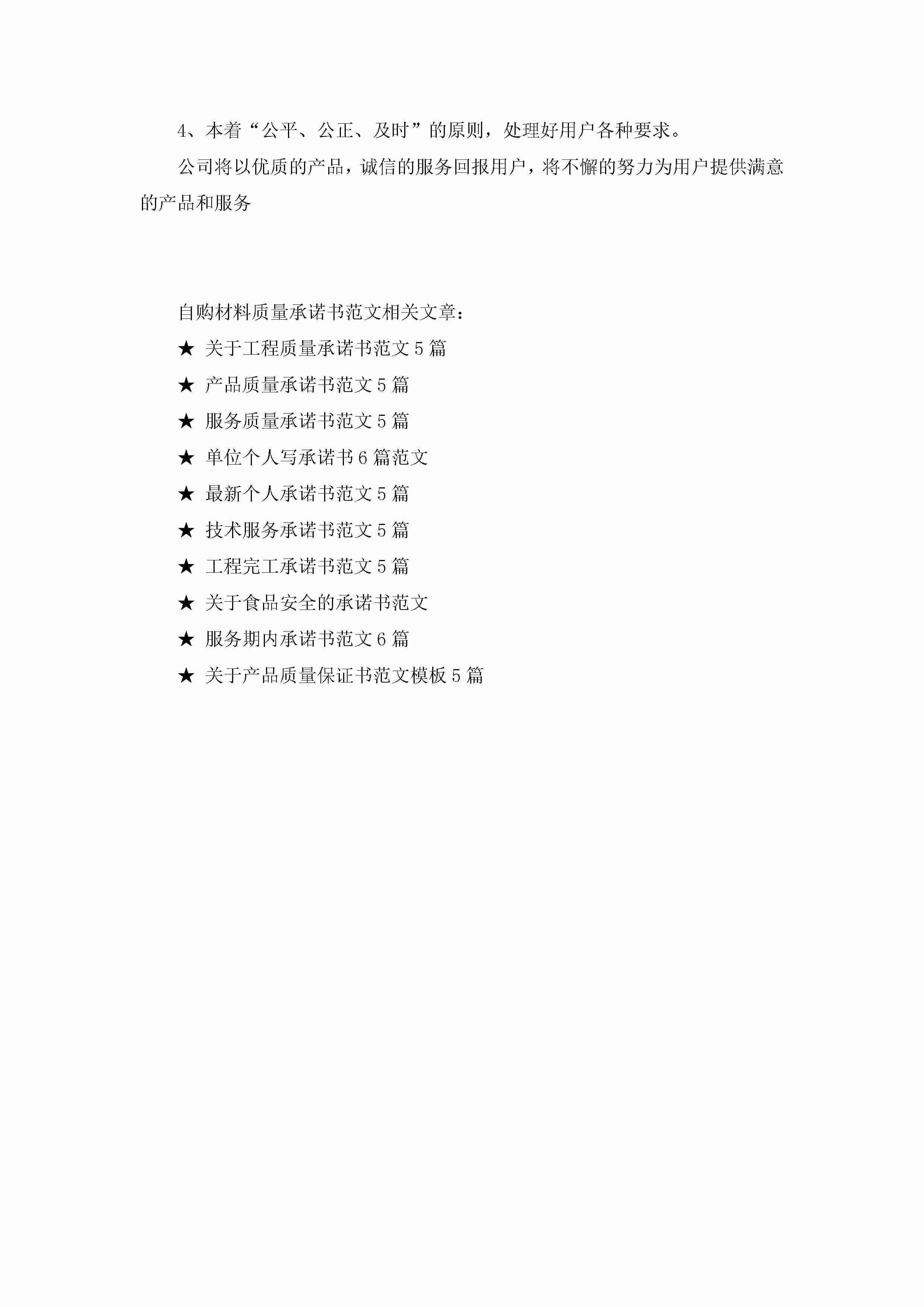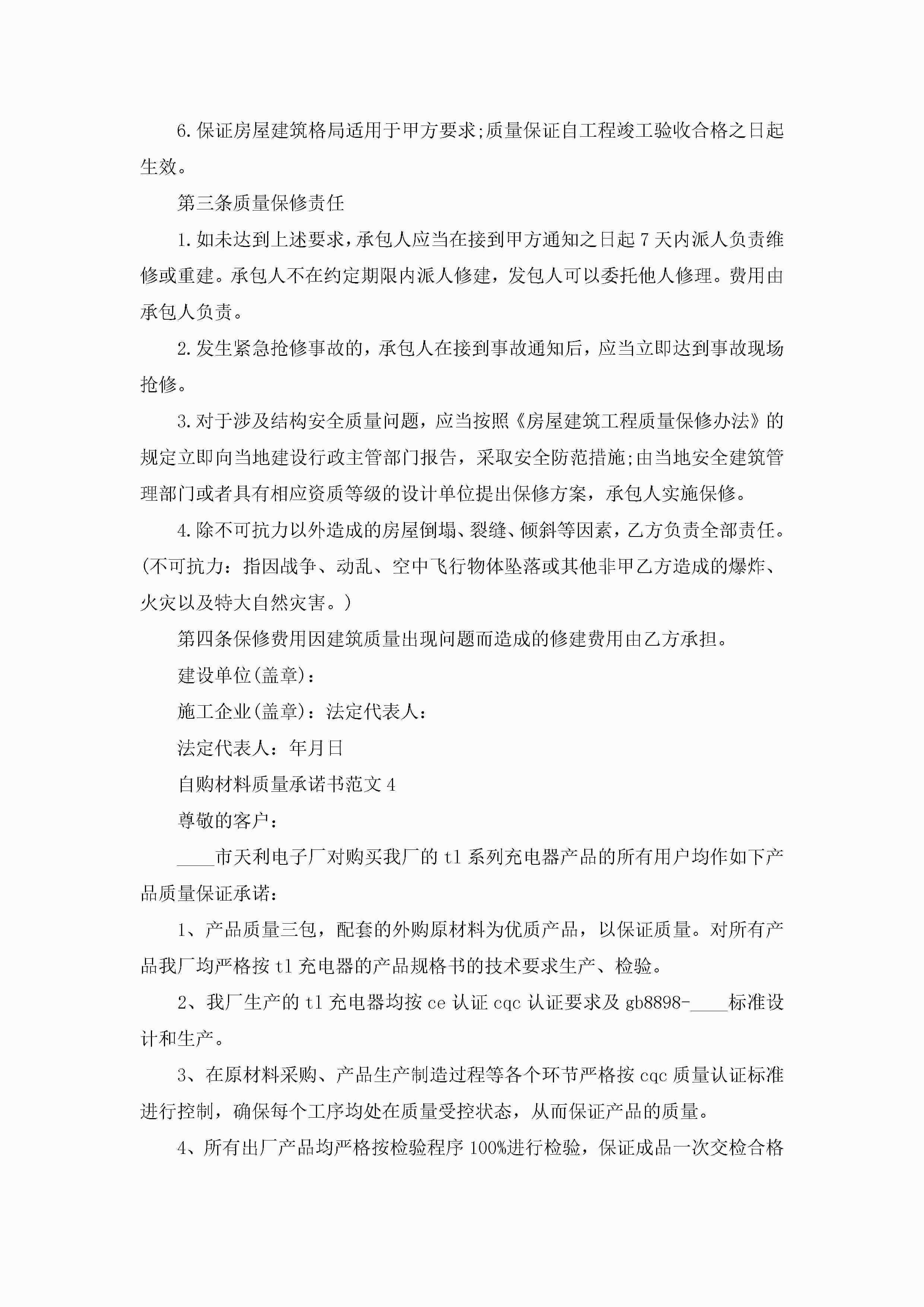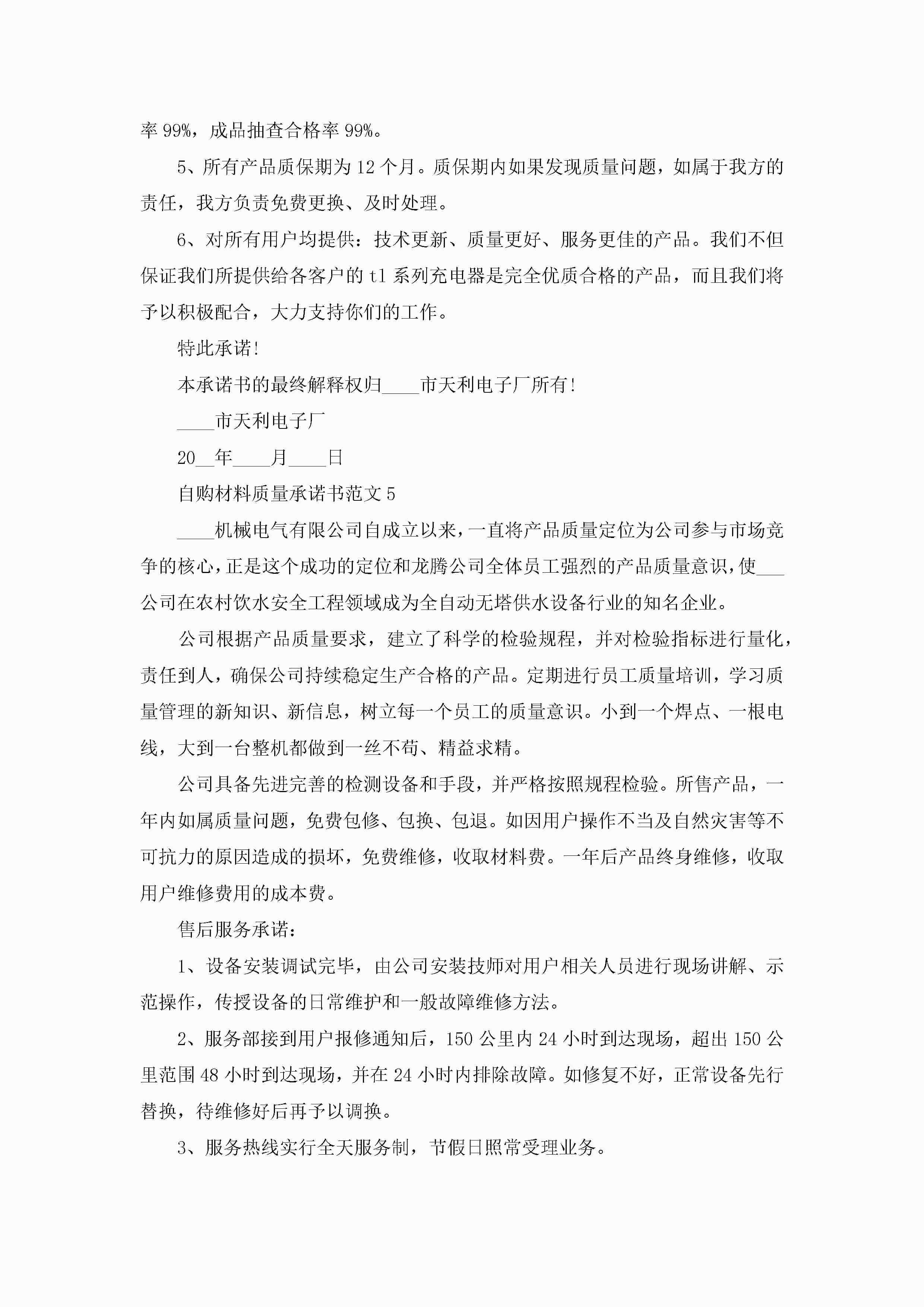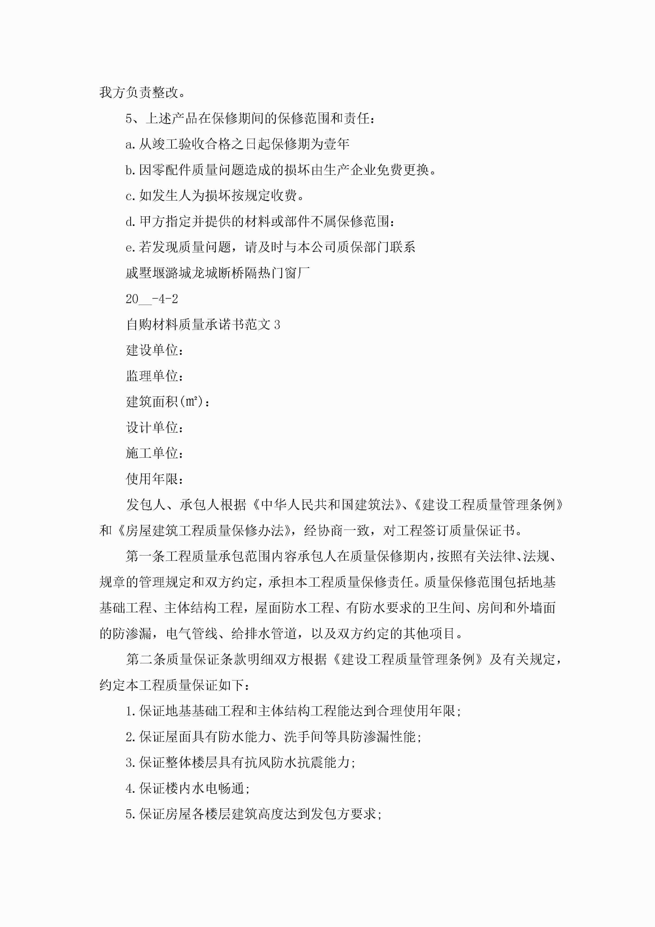 自购材料质量承诺书范文5篇jugei3月22日 16:22发布关注193 自购材料质量承诺书范文5篇此内容为付费资源,请付费后查看¥10.9 单篇文档限时特惠¥15个人会员开通企业会员开通立即下载无需登陆!可直接快捷下载单个模板付费资源© 版权声明THE ENDWord模板# 实用文档# 实用模板# 信函模板# 承诺书 如有问题,可点击最底部“联系我们”联系客服 分享QQ空间微博QQ好友海报分享复制链接收藏