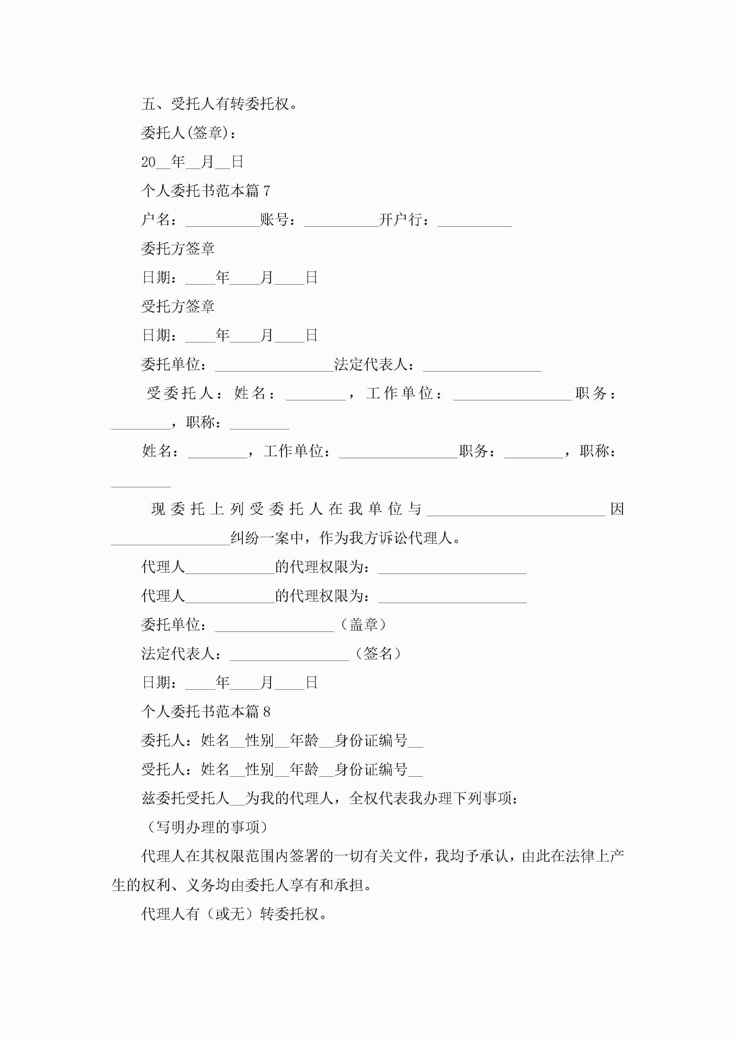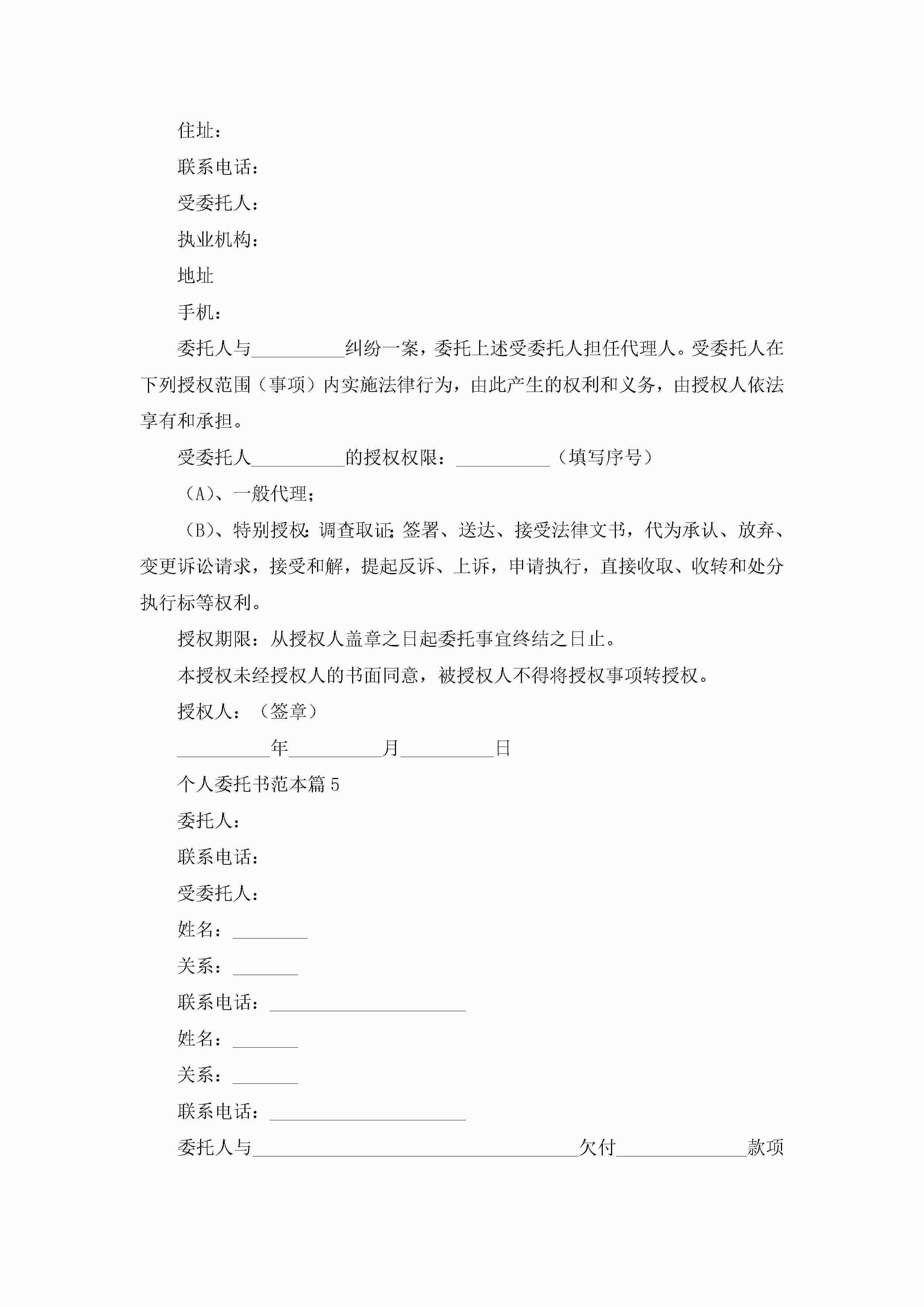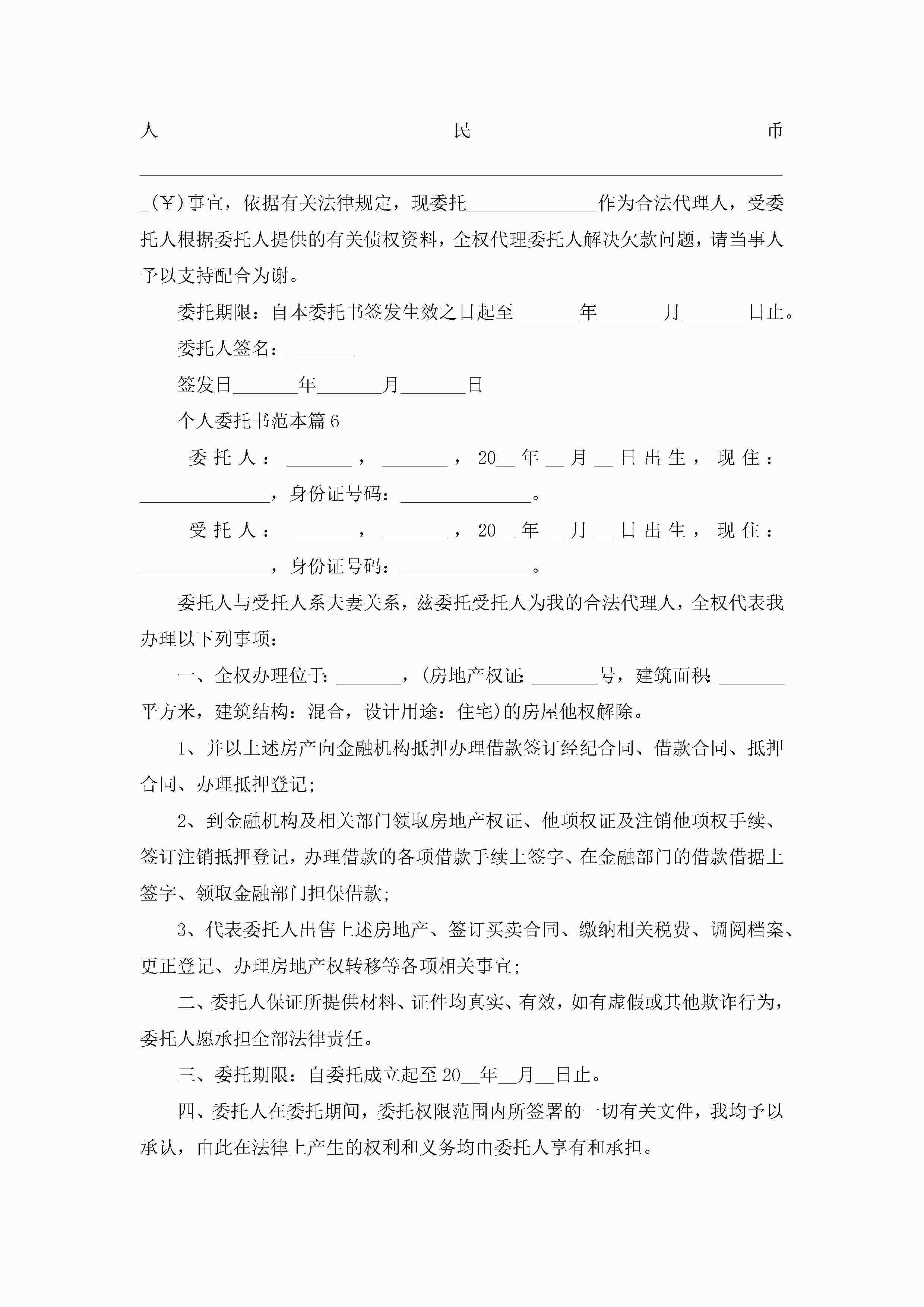 个人委托书范本(精选10篇)jugei3月22日 16:22发布关注230 个人委托书范本(精选10篇)此内容为付费资源,请付费后查看¥10.9 单篇文档限时特惠¥15个人会员开通企业会员开通立即下载无需登陆!可直接快捷下载单个模板付费资源© 版权声明THE ENDWord模板# 实用文档# 实用模板# 信函模板# 委托书 如有问题,可点击最底部“联系我们”联系客服 分享QQ空间微博QQ好友海报分享复制链接收藏