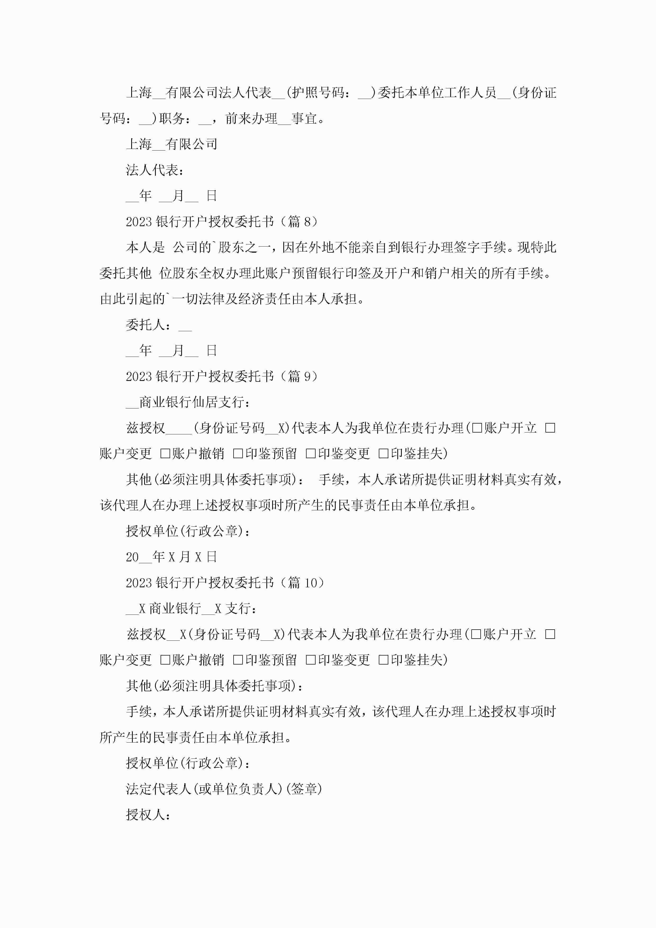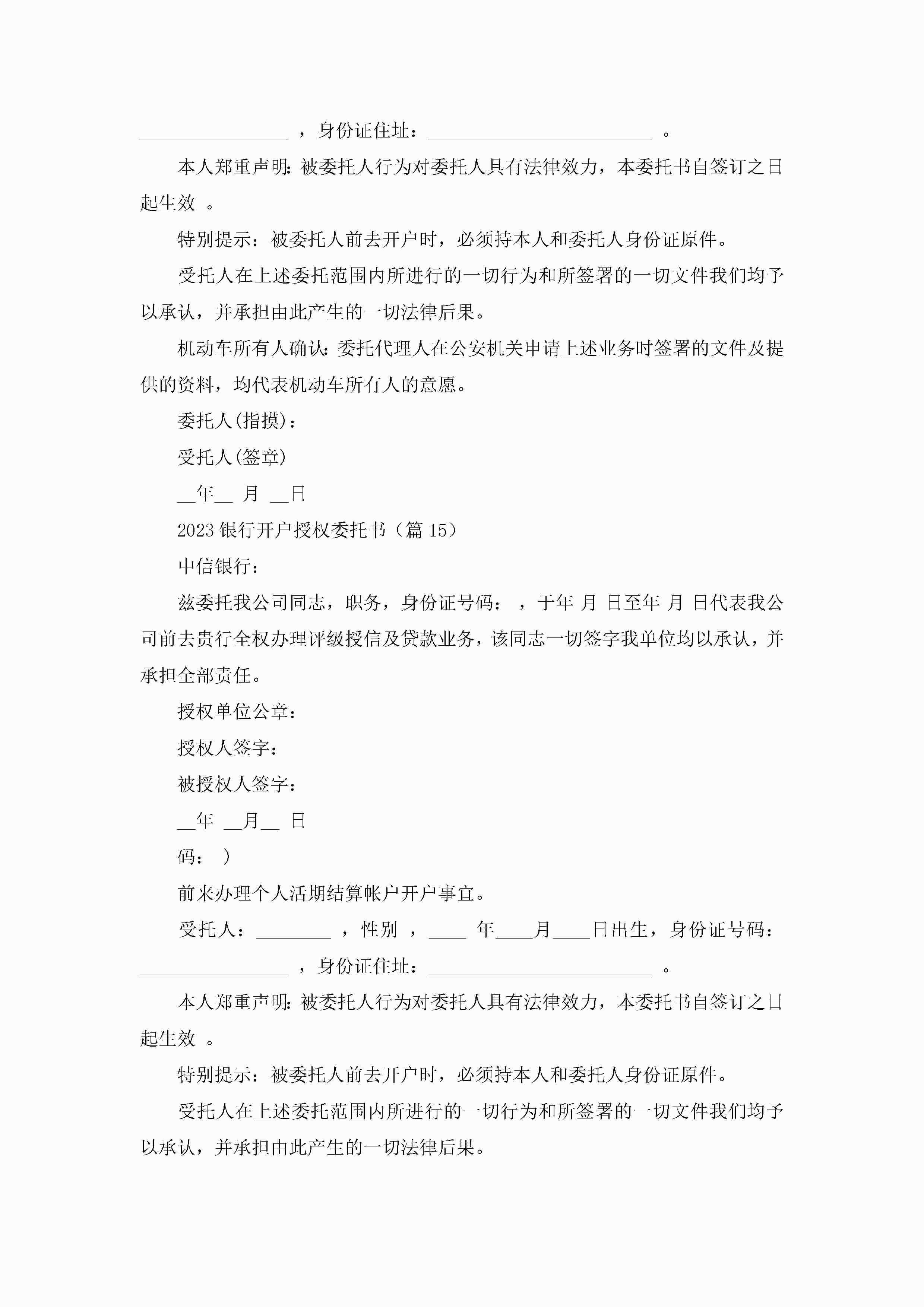 2023银行开户授权委托书(通用16篇)jugei3月22日 16:22发布关注281 2023银行开户授权委托书(通用16篇)此内容为付费资源,请付费后查看¥10.9 单篇文档限时特惠¥15个人会员开通企业会员开通立即下载无需登陆!可直接快捷下载单个模板付费资源© 版权声明THE ENDWord模板# 实用文档# 实用模板# 信函模板# 委托书 如有问题,可点击最底部“联系我们”联系客服 分享QQ空间微博QQ好友海报分享复制链接收藏