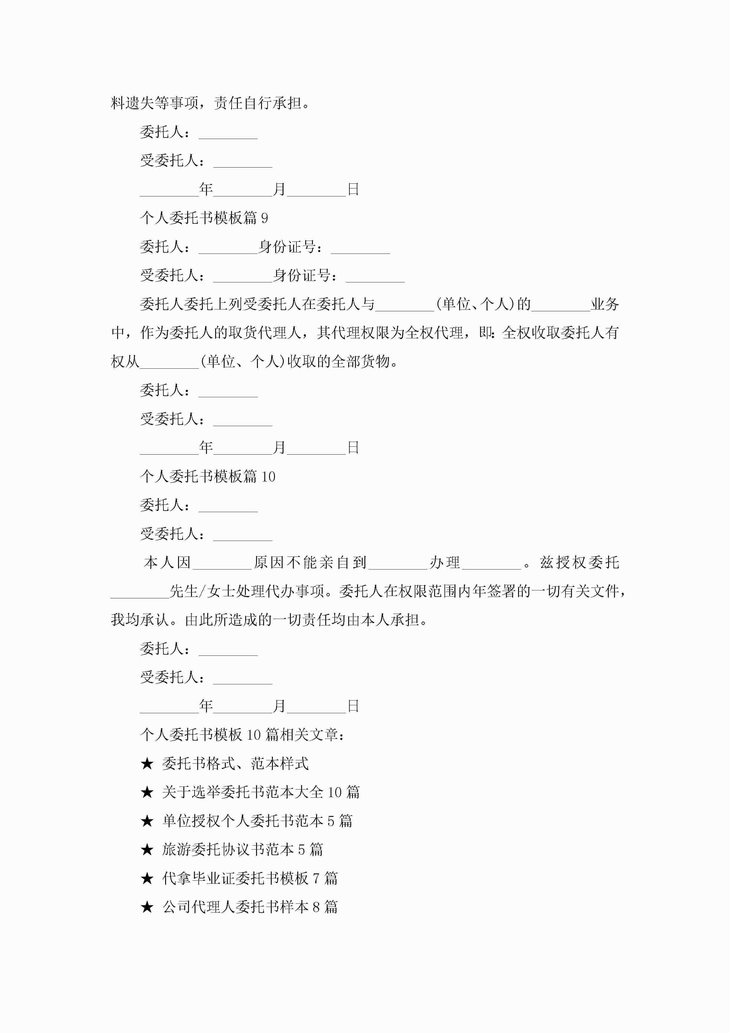 个人委托书模板10篇精选jugei3月22日 16:23发布关注281 个人委托书模板10篇精选此内容为付费资源,请付费后查看¥10.9 单篇文档限时特惠¥15个人会员开通企业会员开通立即下载无需登陆!可直接快捷下载单个模板付费资源© 版权声明THE ENDWord模板# 实用文档# 实用模板# 信函模板# 委托书 如有问题,可点击最底部“联系我们”联系客服 分享QQ空间微博QQ好友海报分享复制链接收藏