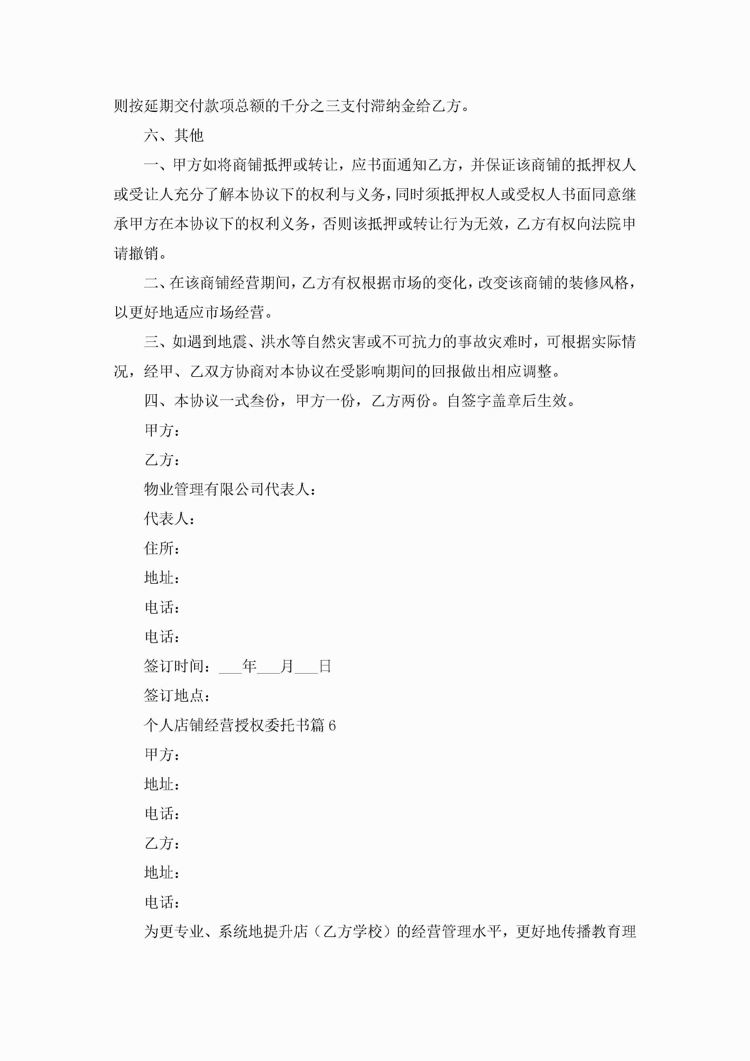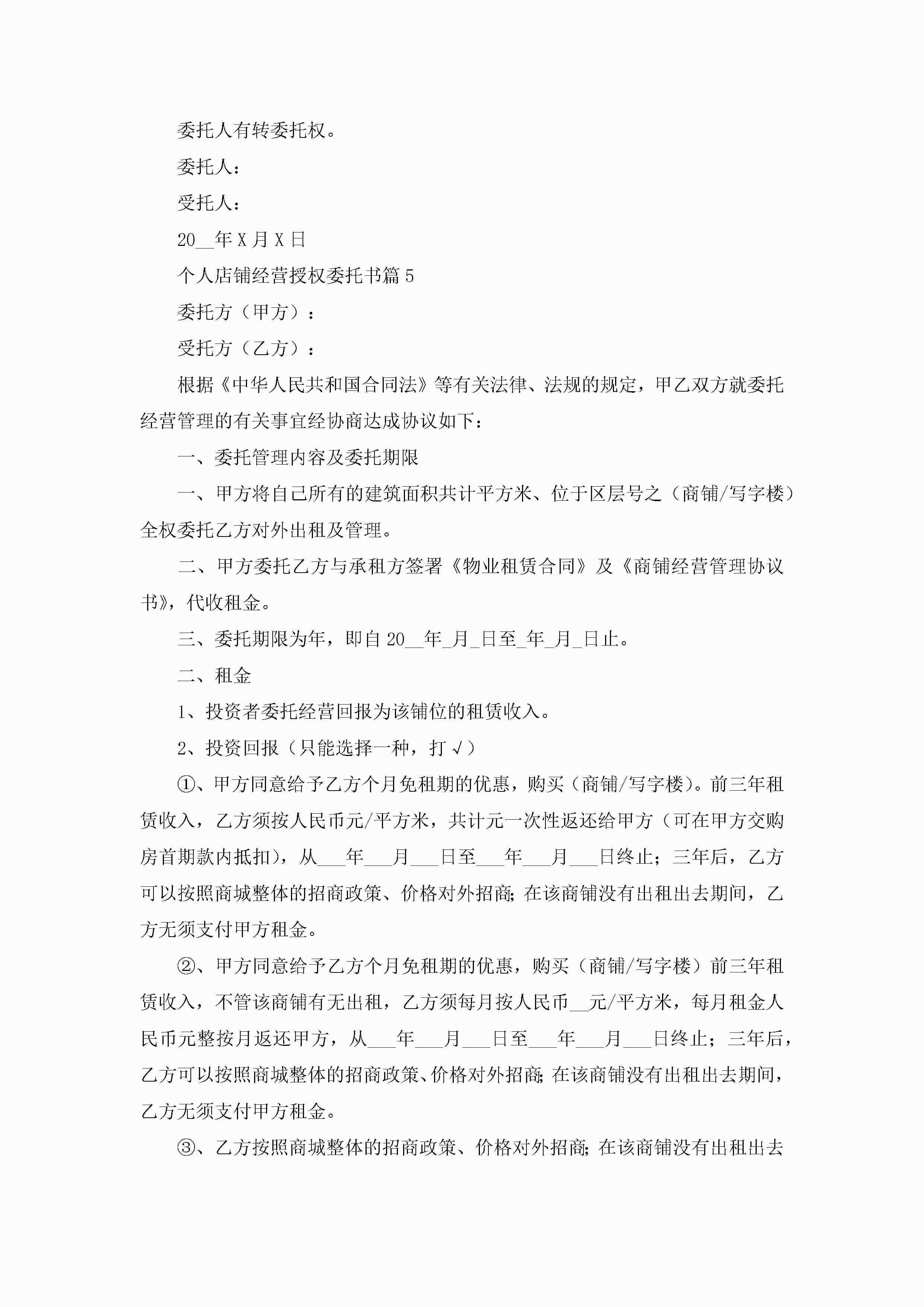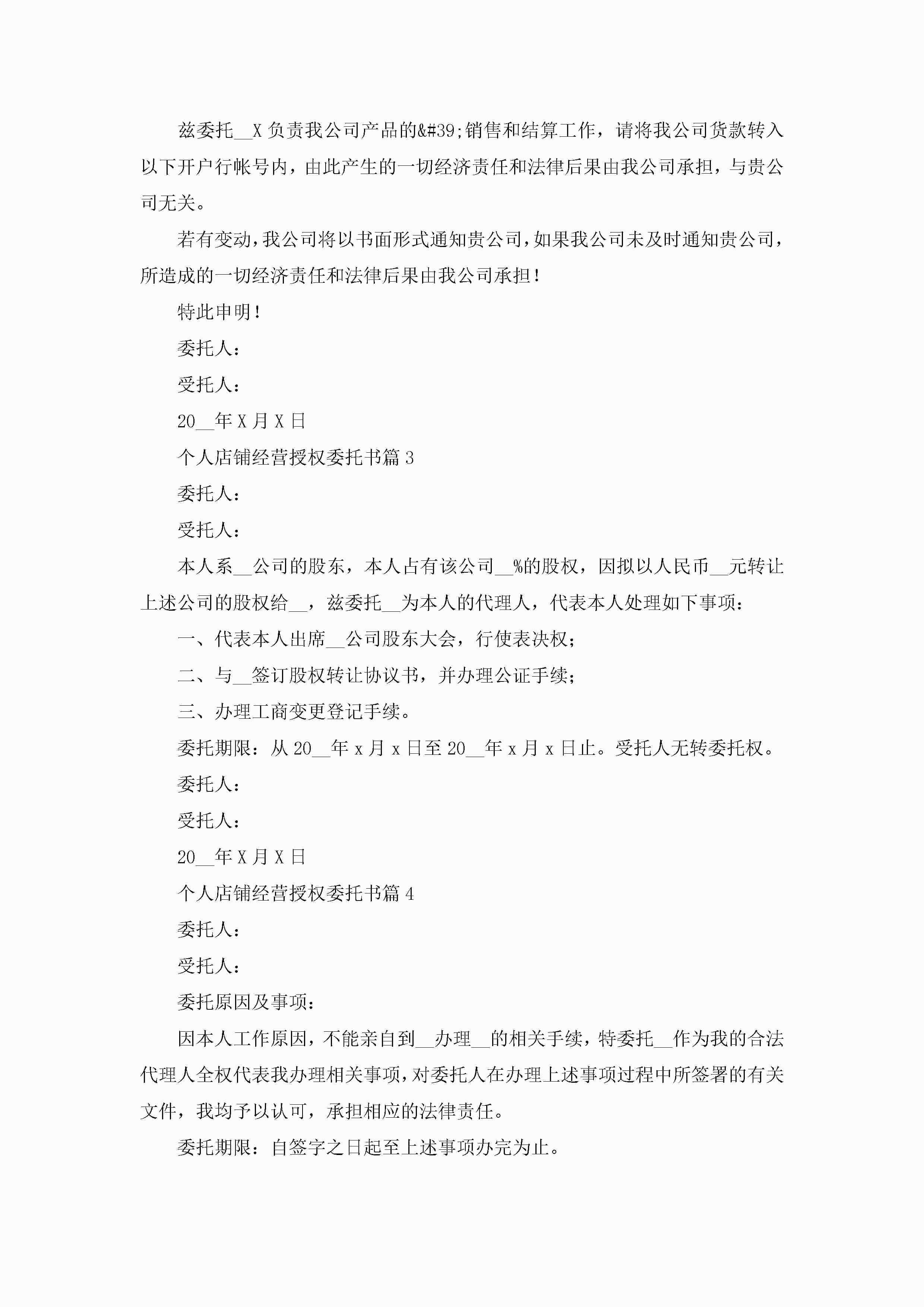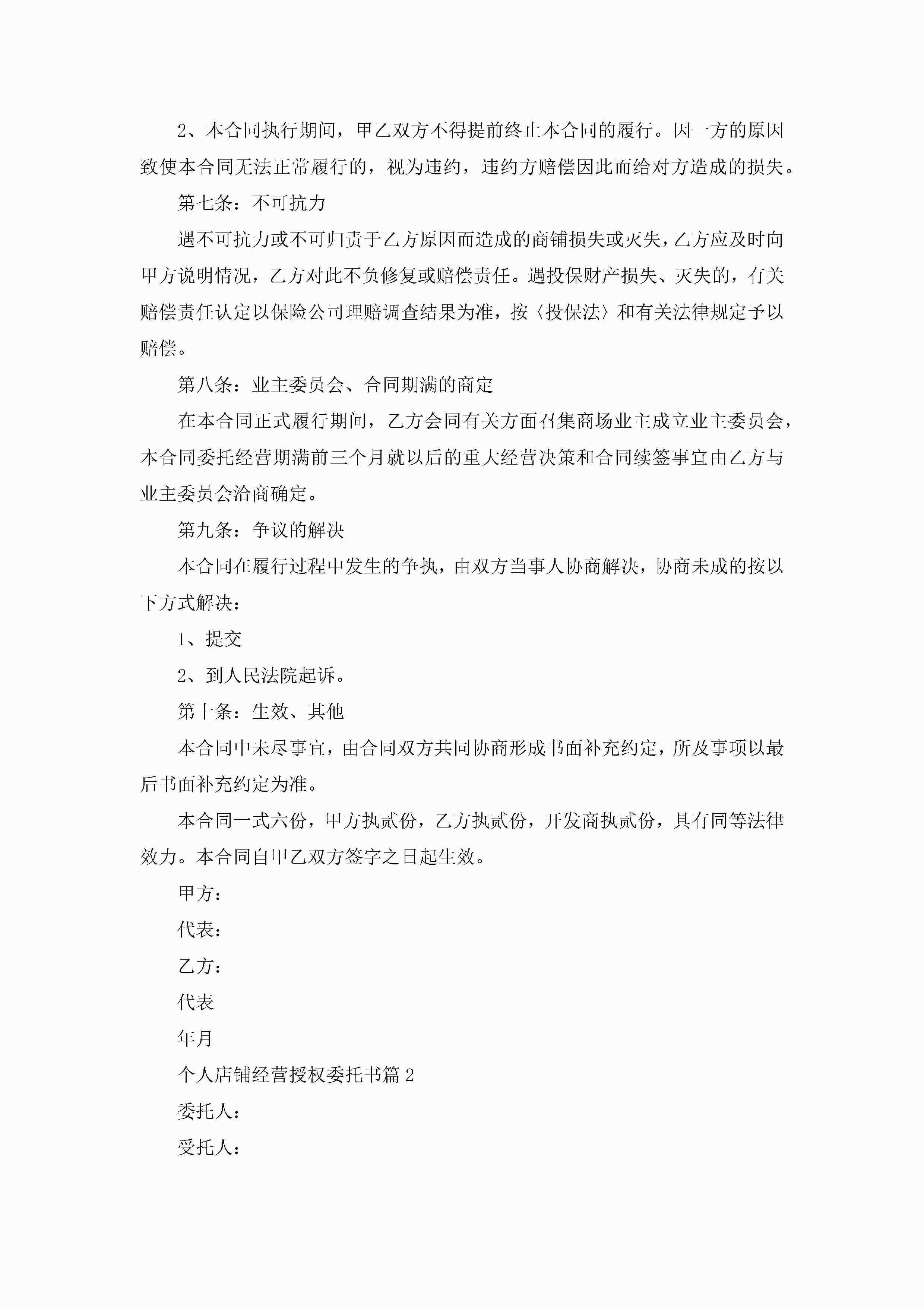个人店铺经营授权委托书(精选7篇)jugei3月22日 16:23发布关注269 个人店铺经营授权委托书(精选7篇)此内容为付费资源,请付费后查看¥10.9 单篇文档限时特惠¥15个人会员开通企业会员开通立即下载无需登陆!可直接快捷下载单个模板付费资源© 版权声明THE ENDWord模板# 实用文档# 实用模板# 信函模板# 委托书 如有问题,可点击最底部“联系我们”联系客服 分享QQ空间微博QQ好友海报分享复制链接收藏