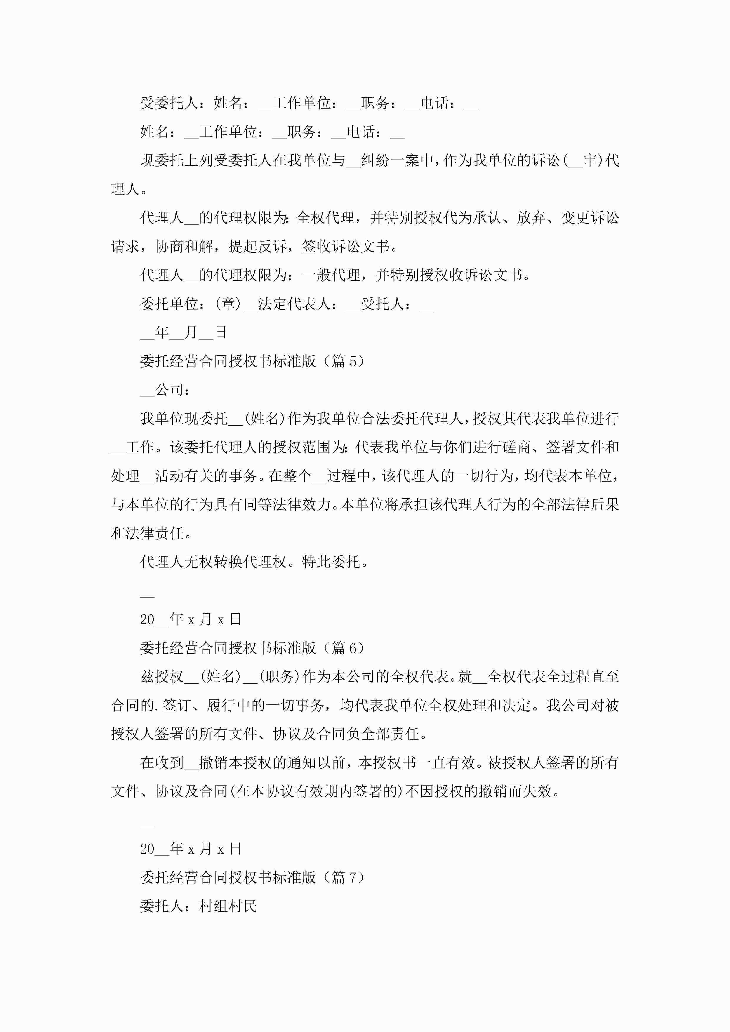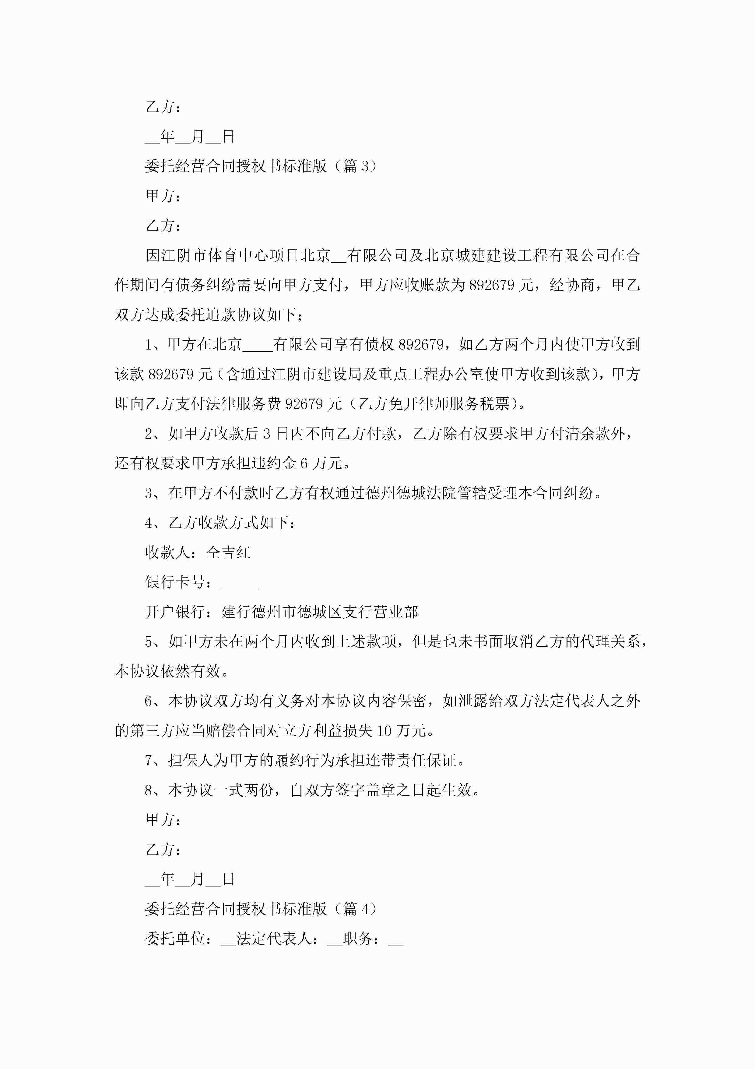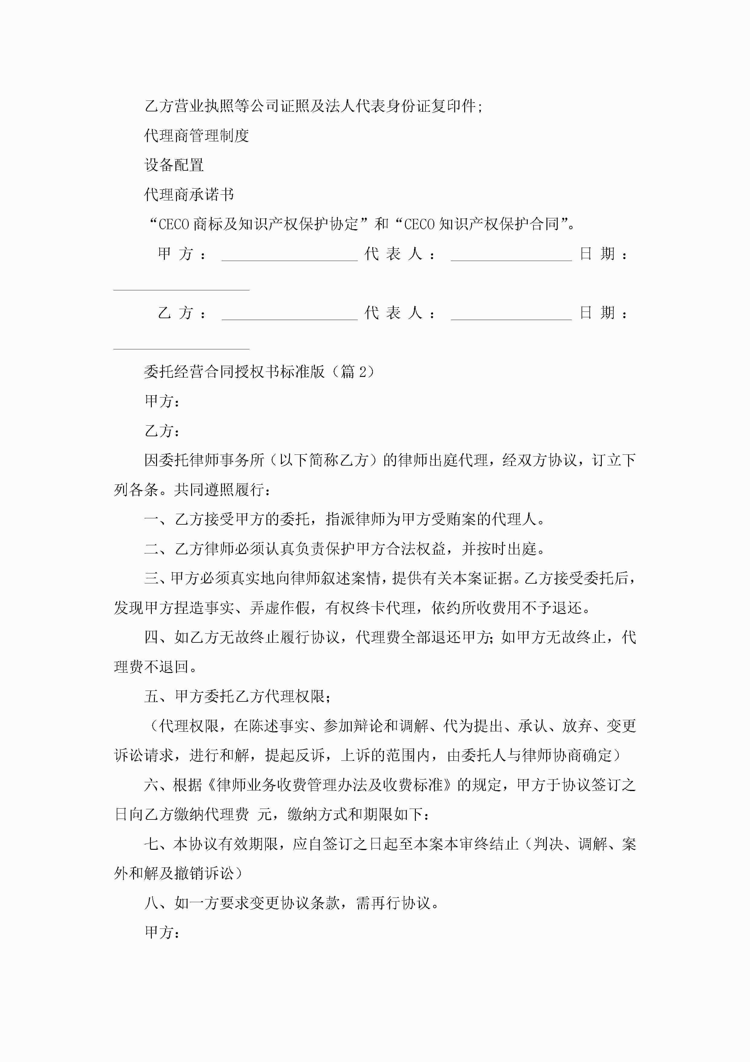 委托经营合同授权书标准版(精选7篇)jugei3月22日 16:23发布关注282 委托经营合同授权书标准版(精选7篇)此内容为付费资源,请付费后查看¥10.9 单篇文档限时特惠¥15个人会员开通企业会员开通立即下载无需登陆!可直接快捷下载单个模板付费资源© 版权声明THE ENDWord模板# 实用文档# 实用模板# 信函模板# 委托书 如有问题,可点击最底部“联系我们”联系客服 分享QQ空间微博QQ好友海报分享复制链接收藏