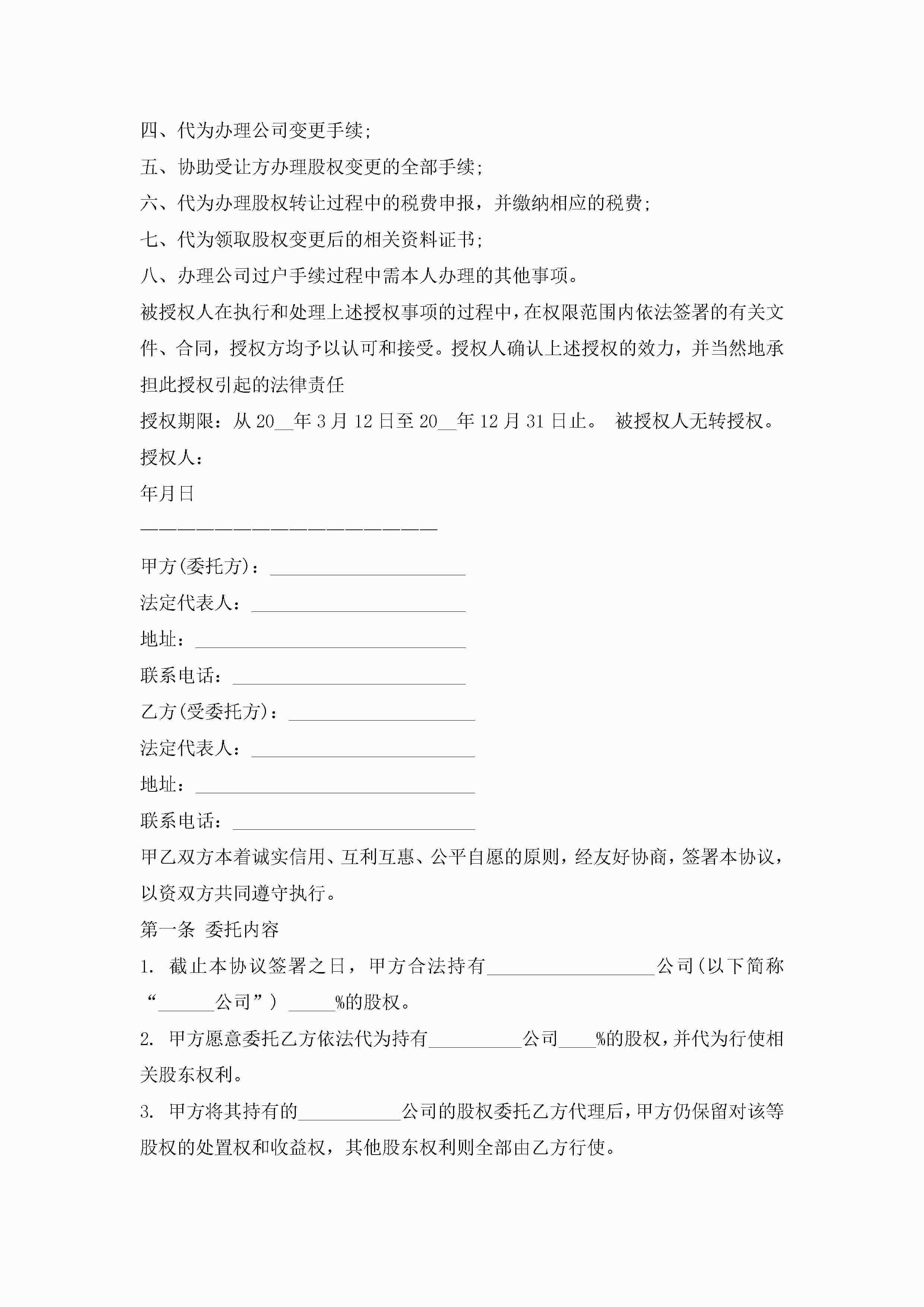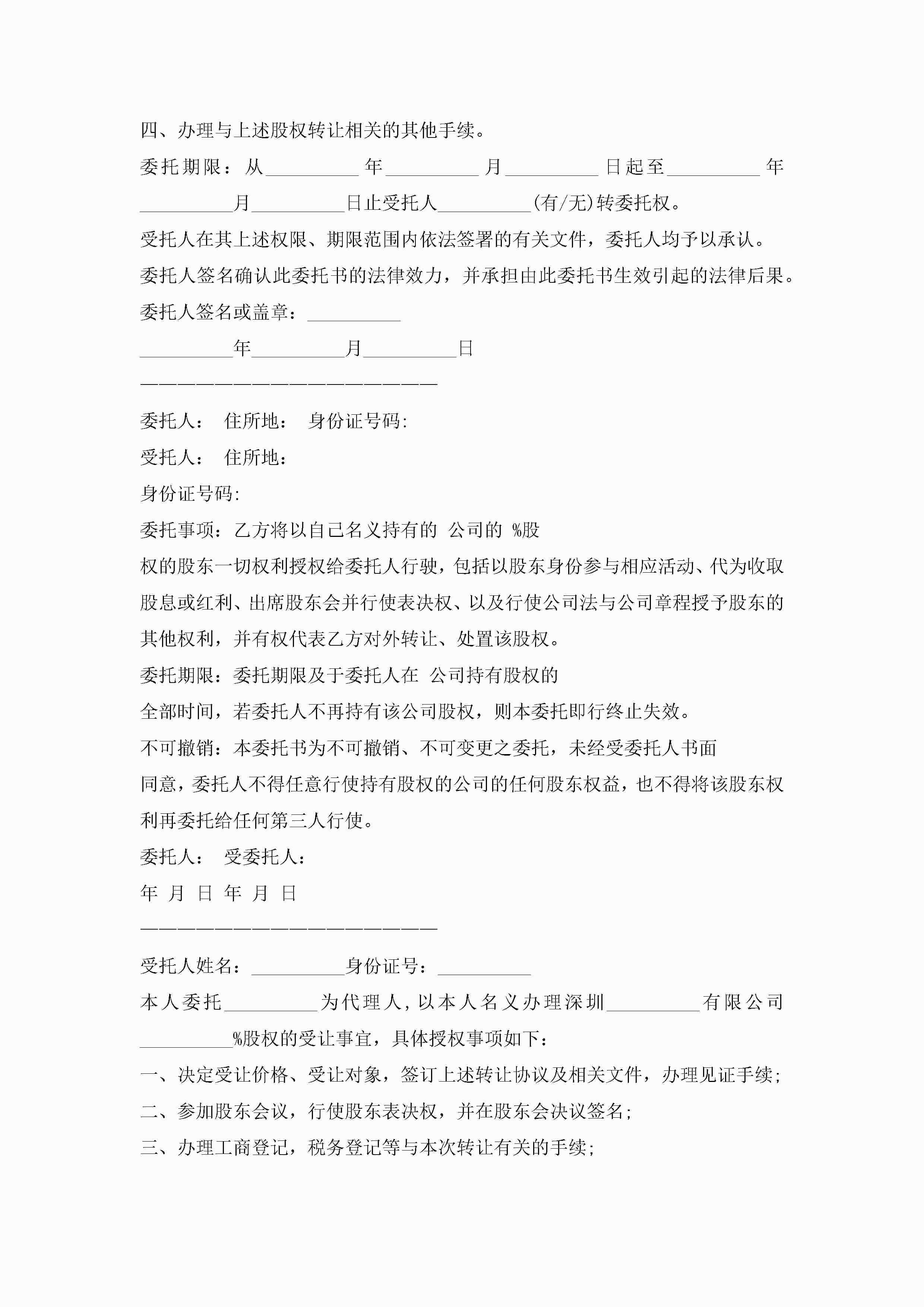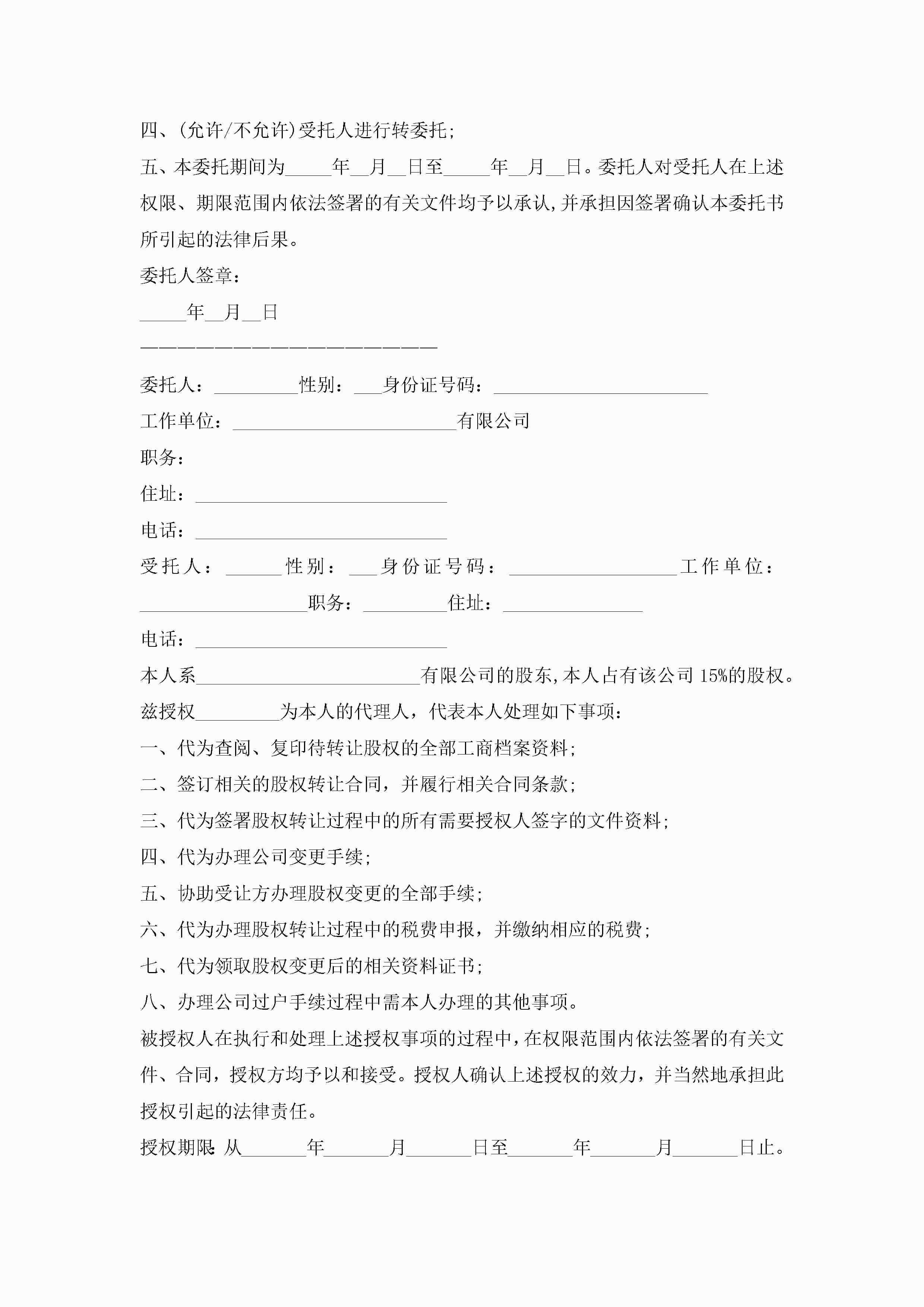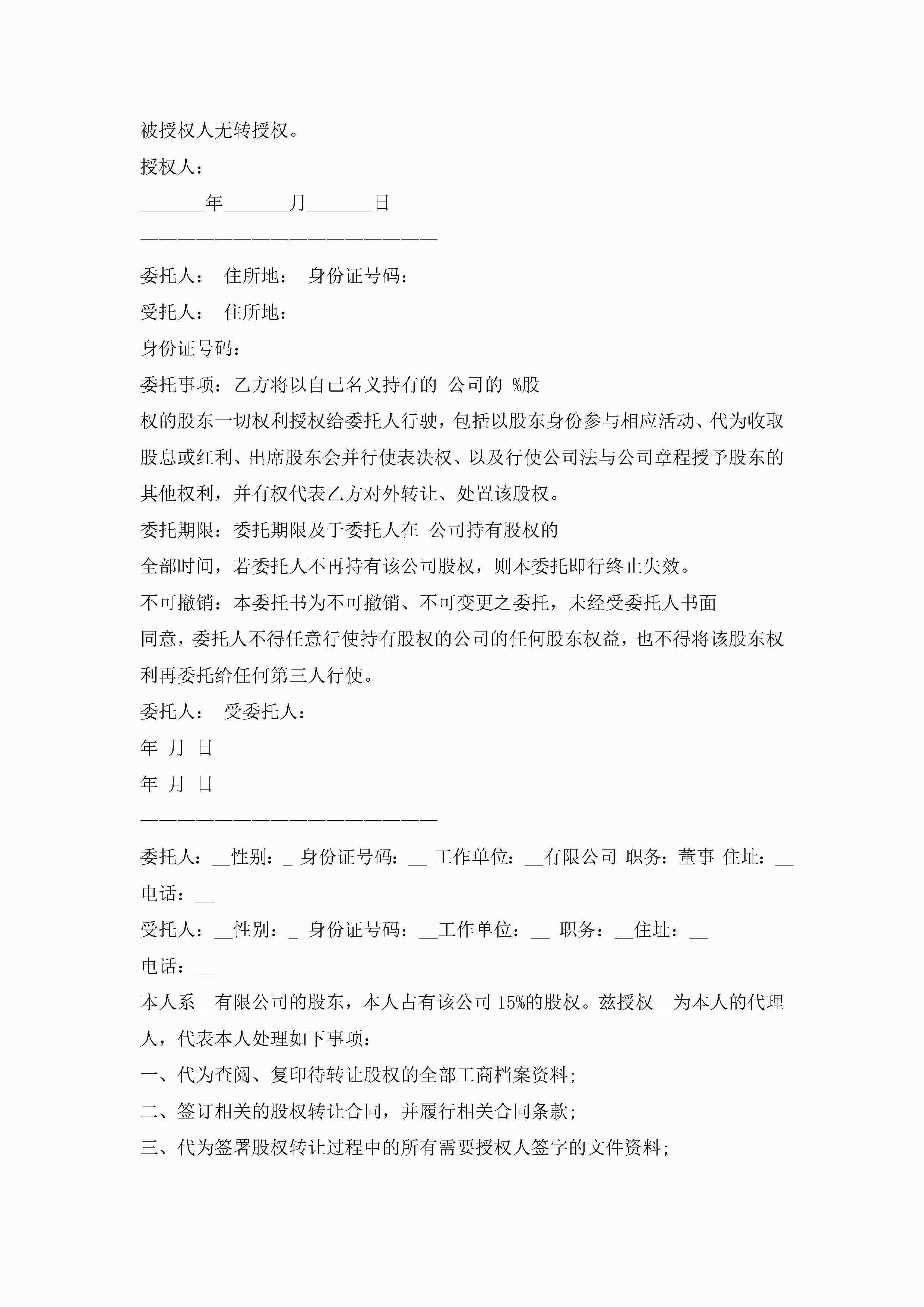 股权授权委托书10篇精选jugei3月22日 16:23发布关注233 股权授权委托书10篇精选此内容为付费资源,请付费后查看¥10.9 单篇文档限时特惠¥15个人会员开通企业会员开通立即下载无需登陆!可直接快捷下载单个模板付费资源© 版权声明THE ENDWord模板# 实用文档# 实用模板# 信函模板# 委托书 如有问题,可点击最底部“联系我们”联系客服 分享QQ空间微博QQ好友海报分享复制链接收藏