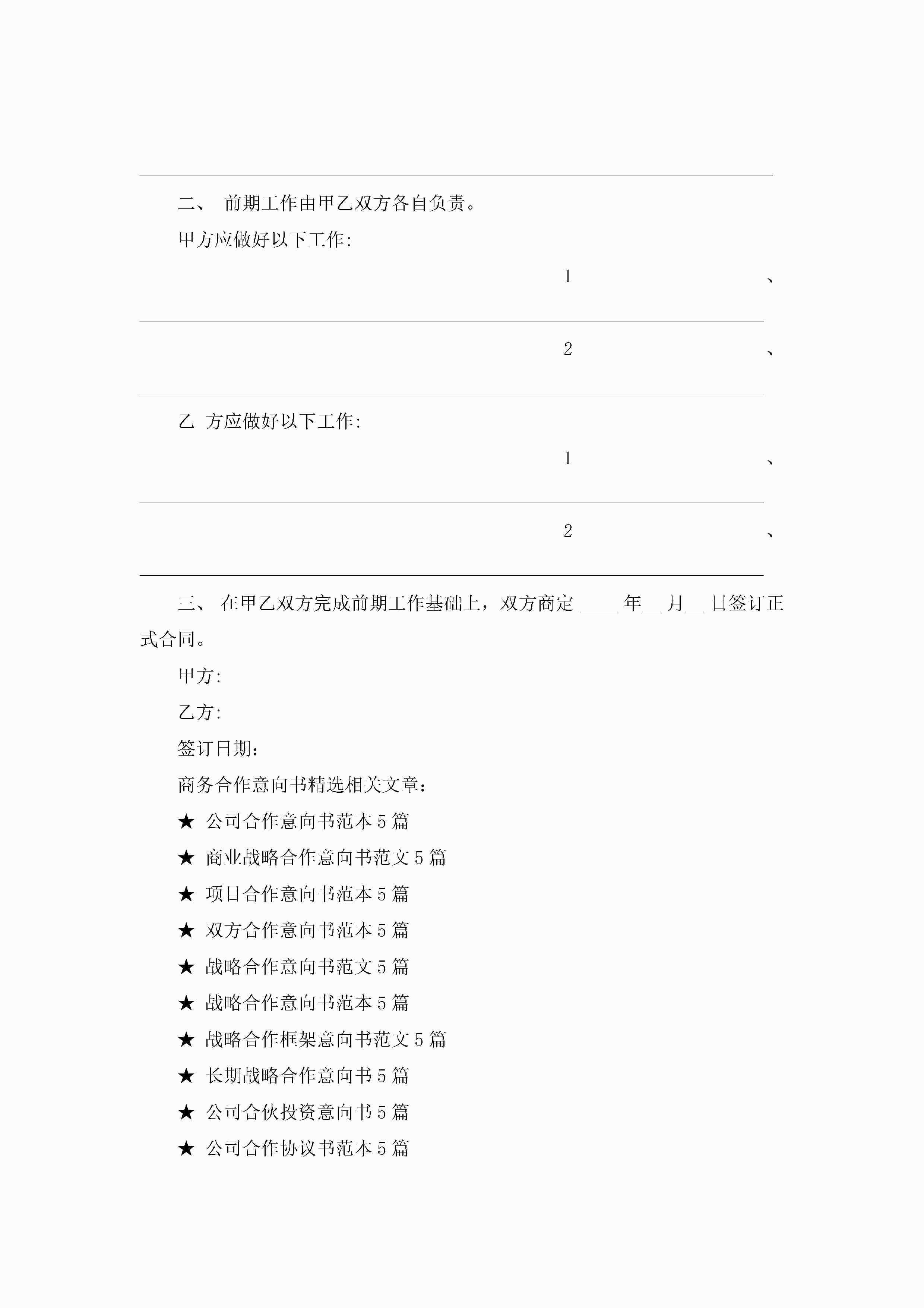 商务合作意向书精选5篇jugei3月22日 16:23发布关注229 商务合作意向书精选5篇此内容为付费资源,请付费后查看¥10.9 单篇文档限时特惠¥15个人会员开通企业会员开通立即下载无需登陆!可直接快捷下载单个模板付费资源© 版权声明THE ENDWord模板# 实用文档# 实用模板# 信函模板# 意向书 如有问题,可点击最底部“联系我们”联系客服 分享QQ空间微博QQ好友海报分享复制链接收藏