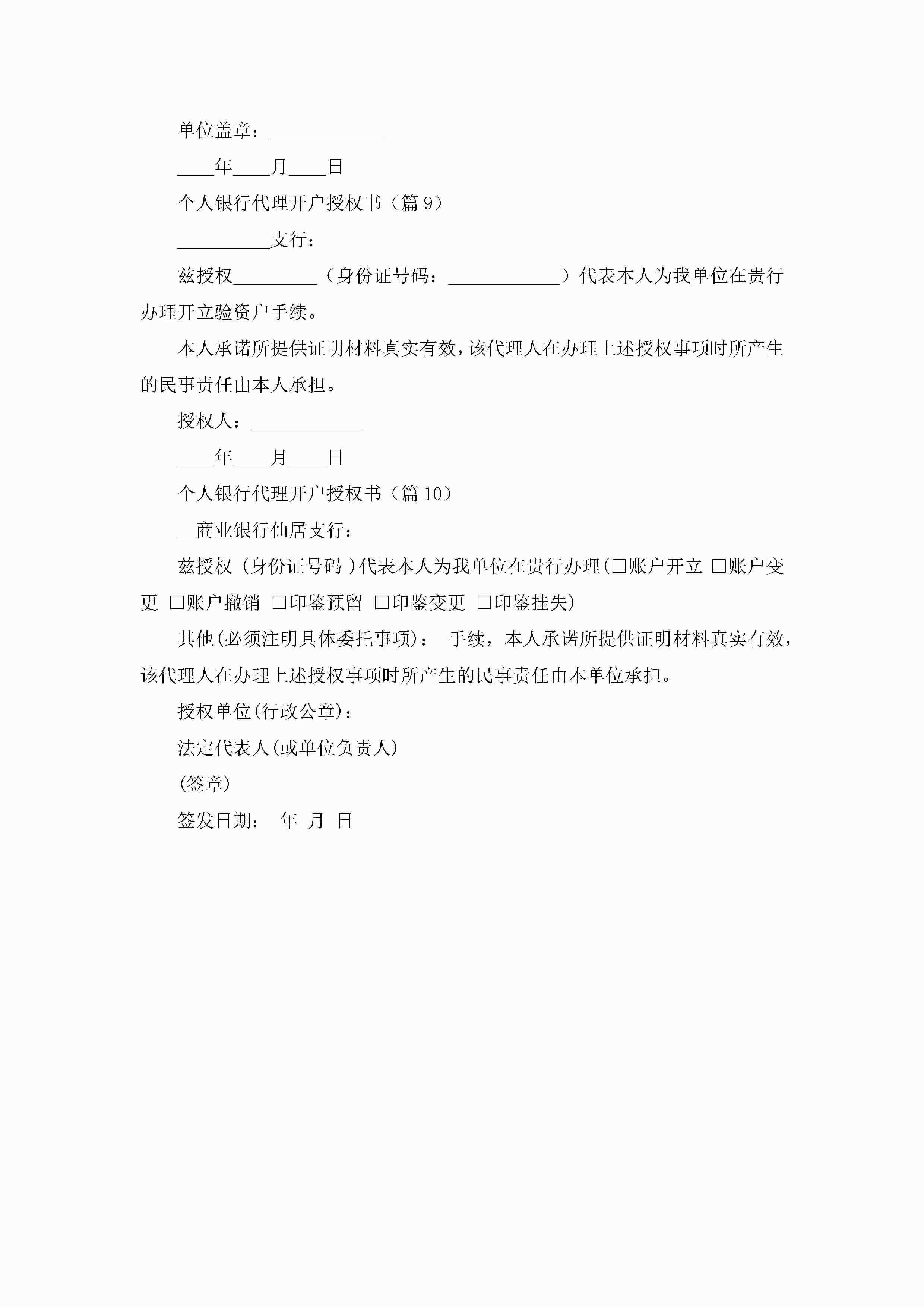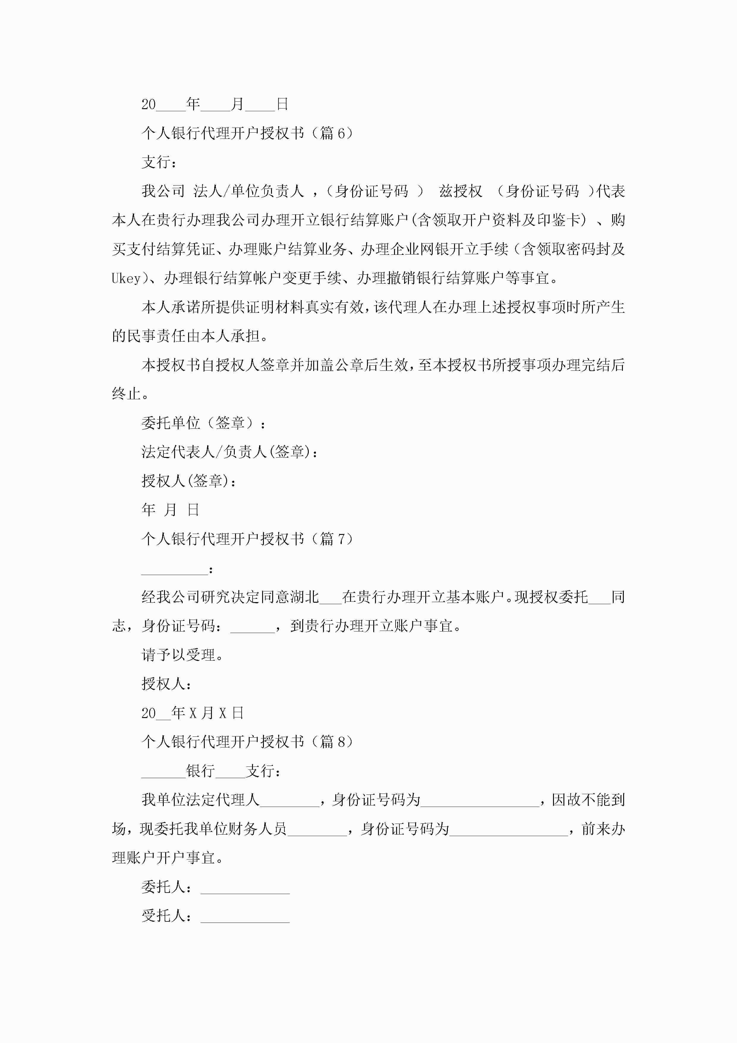 个人银行代理开户授权书(10篇)jugei3月22日 16:23发布关注213 个人银行代理开户授权书(10篇)此内容为付费资源,请付费后查看¥10.9 单篇文档限时特惠¥15个人会员开通企业会员开通立即下载无需登陆!可直接快捷下载单个模板付费资源© 版权声明THE ENDWord模板# 实用文档# 实用模板# 信函模板# 委托书 如有问题,可点击最底部“联系我们”联系客服 分享QQ空间微博QQ好友海报分享复制链接收藏
