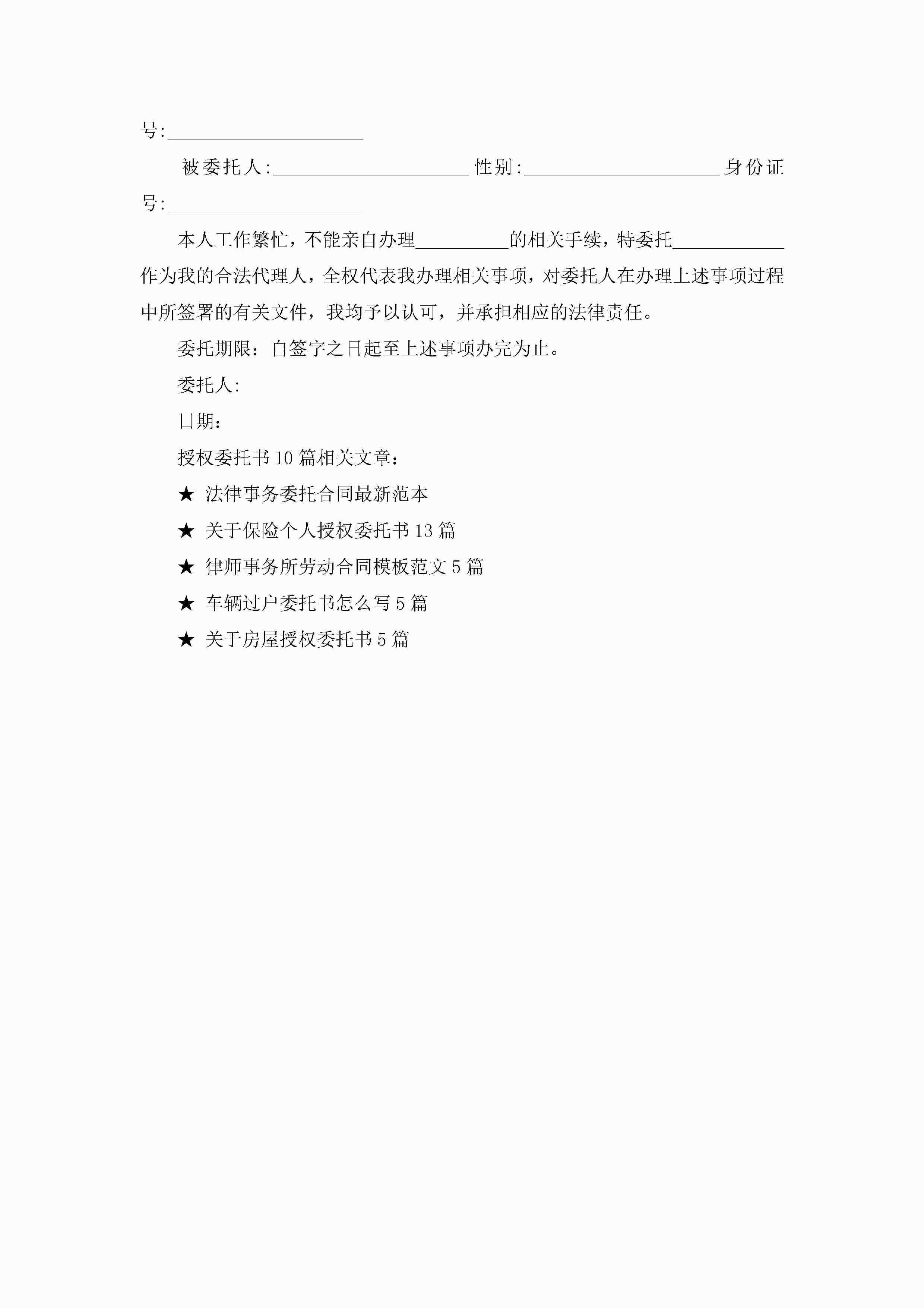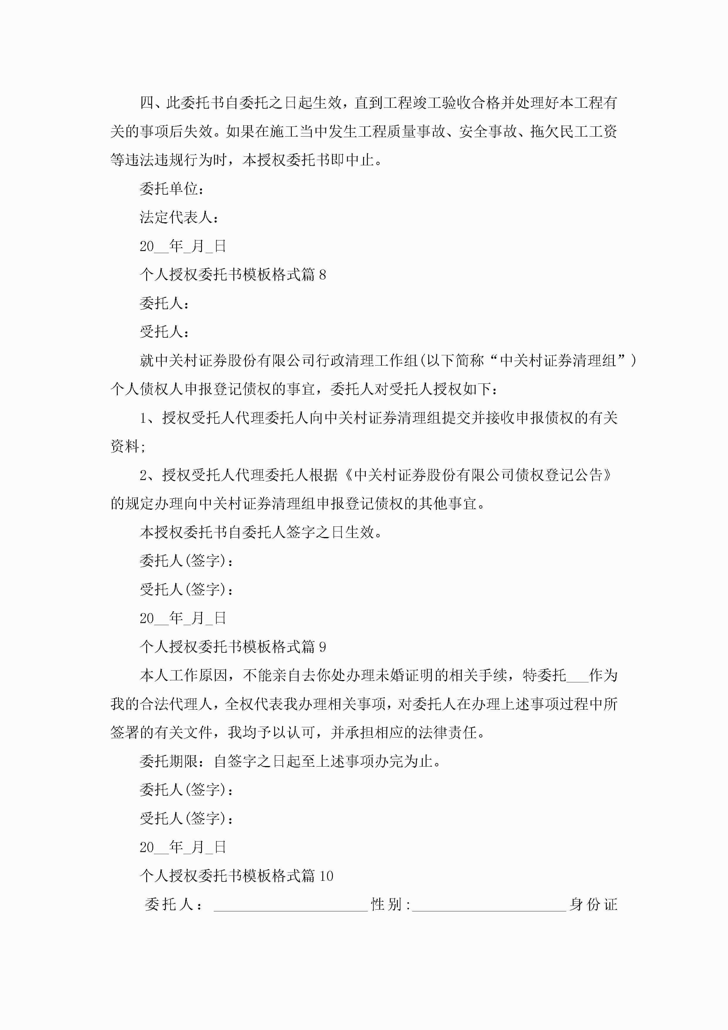 个人授权委托书模板格式10篇精选jugei3月22日 16:23发布关注282 个人授权委托书模板格式10篇精选此内容为付费资源,请付费后查看¥10.9 单篇文档限时特惠¥15个人会员开通企业会员开通立即下载无需登陆!可直接快捷下载单个模板付费资源© 版权声明THE ENDWord模板# 实用文档# 实用模板# 信函模板# 委托书 如有问题,可点击最底部“联系我们”联系客服 分享QQ空间微博QQ好友海报分享复制链接收藏